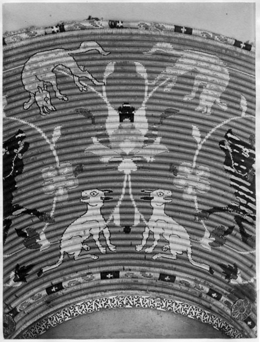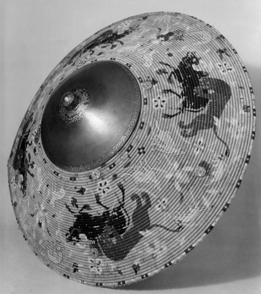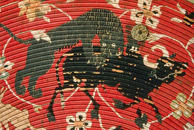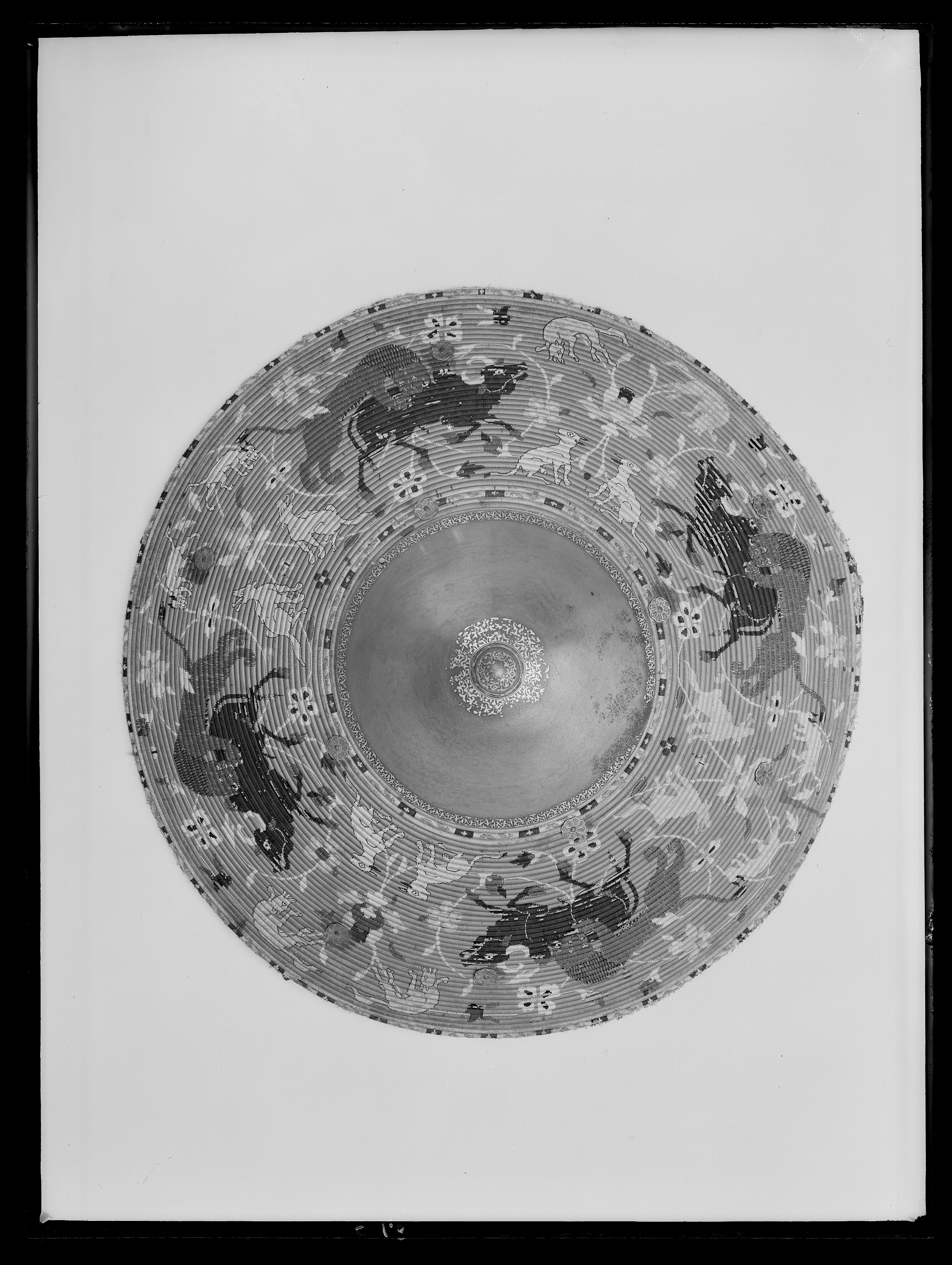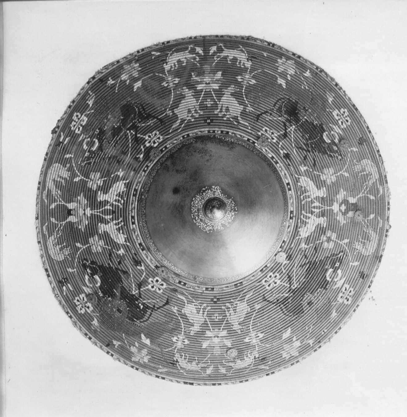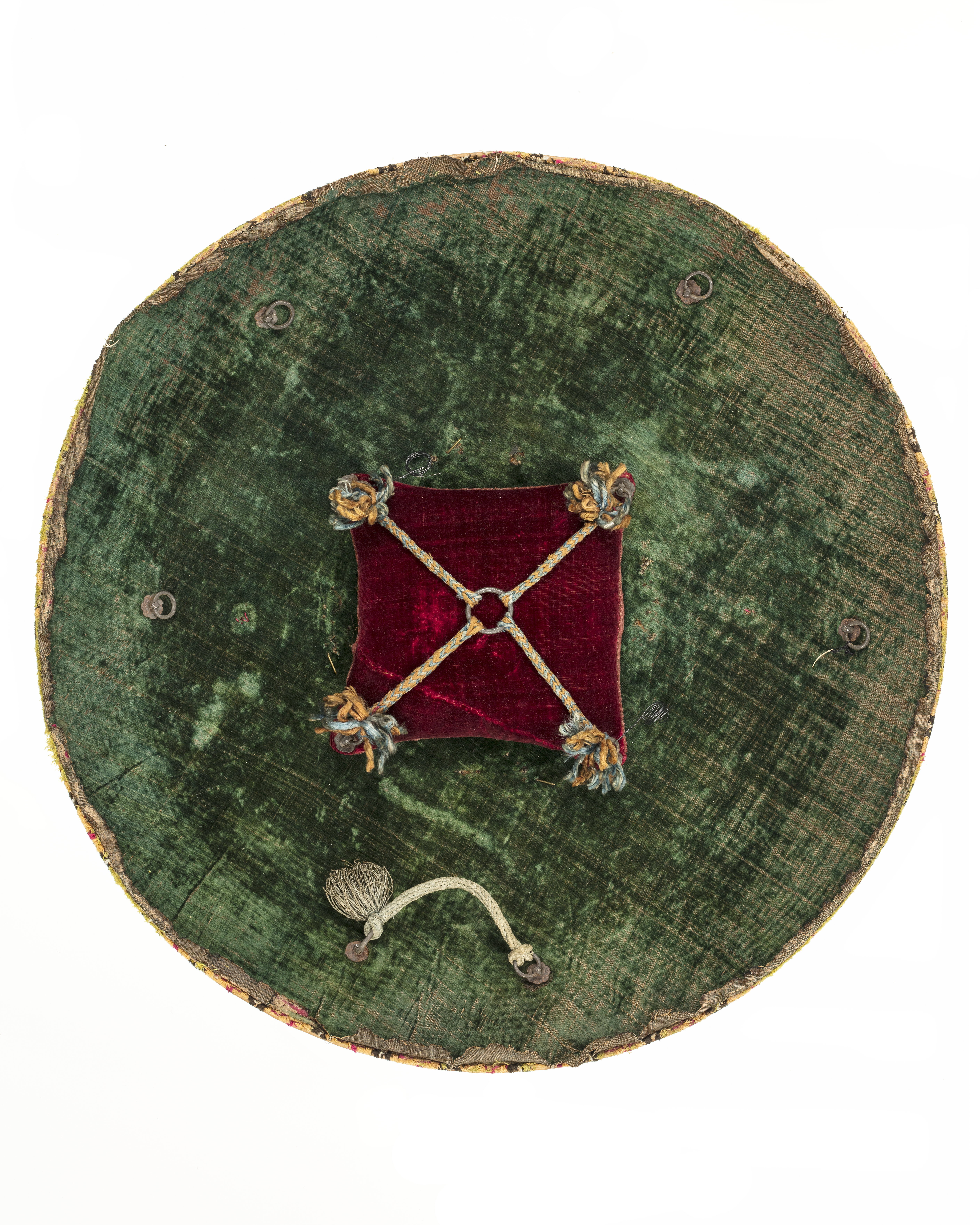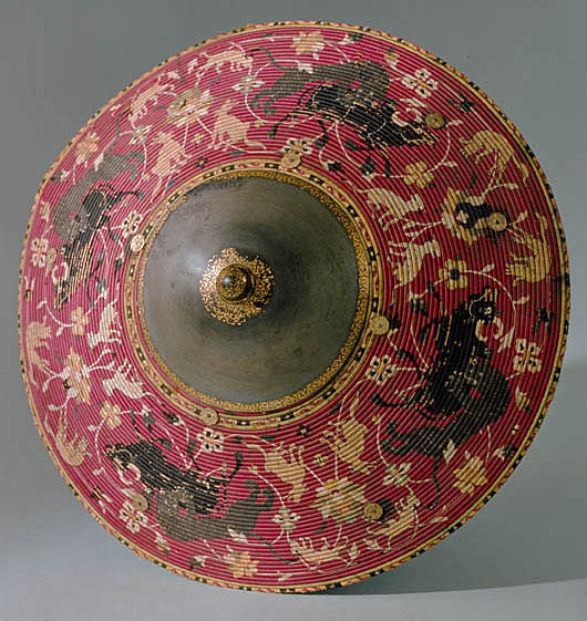 Rund sköld uppbyggd av 42 stycken synliga ringformade vidjor av fikonträ, lindade och broderade med silkestråd i rött, grönt, gult, svart, grått och vitt. All kanttråd fäst i längs fiberriktningen rakt dragna skåror i träet. Kanttråden till alla figurer och ornament fästad på detta sätt, möjligen även den röda bottentråden. Yttersta ringen med dekor av parvis oregelbundna ornament i rött, mellan dessa rektangel i svart med i mitten likarmat kors i vitt. Detta mot botten i gult. Nästa ring helt i grönt. Därefter större fält med djur över slingrande växter. Fyra större grupper av oxe i svart med vita horn och ögon, bakifrån attackerad av panter i grått med vita ögon och klor. Mellan dessa två olika grupper av i mitten stiliserad växt med i de fyra hörnen ett hunddjur, vid sköldens inre kant sittande och mot yttre kanten i rörelse. Hundarna i gult med svart kant, vita ögon och i vissa fall svarta öron. Grupperna skiljer sig åt genom djurens utseende och detaljer. Av totalt 16 djur saknar tre helt ifyllda detaljer i svart. De tre översta ringarna närmast sköldbucklan är heltäckande grön, gul med dekor som nertill och heltäckande grön. Då sköldbucklan sitter snett kan även en ytterligare heltäckande röd ring ses från ett håll. Undersida av grön sammet. I kanterna fyra rostbruna metallöglor på konturerad stålplatta. Mot ena sidan två liknande och tätare placerade öglor, mellan dem ett flätat snöre av grön silkestråd med i ena änden tofs . I mitten fyrkantig stoppad kudde "puta" av röd sammet, 185 x 195 mm. Undersidan klädd med ett ljusare rött tyg än ovansidan. I varje hörn, genom putan, en fästad ögla med snöre i orange och blått. Snörena möts och är fäsade i en lös ring över kuddens mitt. Sköldbuckla, rund och välvd i stål, diam ca 140 mm, h ca 90 mm. I yttre kant dekorativt band av förvanskade arabiska skrivtecken, b 11 mm. Upptill avslutad med rund knopp, diam nertill 34 mm, h 38 mm. Svagt avsmalnande uppåt med konisk topp. Runt knoppen 19 mm brett band av arabesk. Sidorna med dekor av samma förvanskade skrivtecken som tidigare. Den koniska toppen täckt med arabesk. All dekor av påslaget guld mot mörk botten. Fäst i nederkantkant med fyra mässingsstift. Förgyllda och dekorativa ornament, sammanlagt tio stycken, sex längs nedre kant och fyra runt bucklan. Konturerade kanter med i mitten åttbladig blomma mot prickpunsad botten, diam 19 mm. Ornamenten utgör fästen för öglorna på sköldens baksida