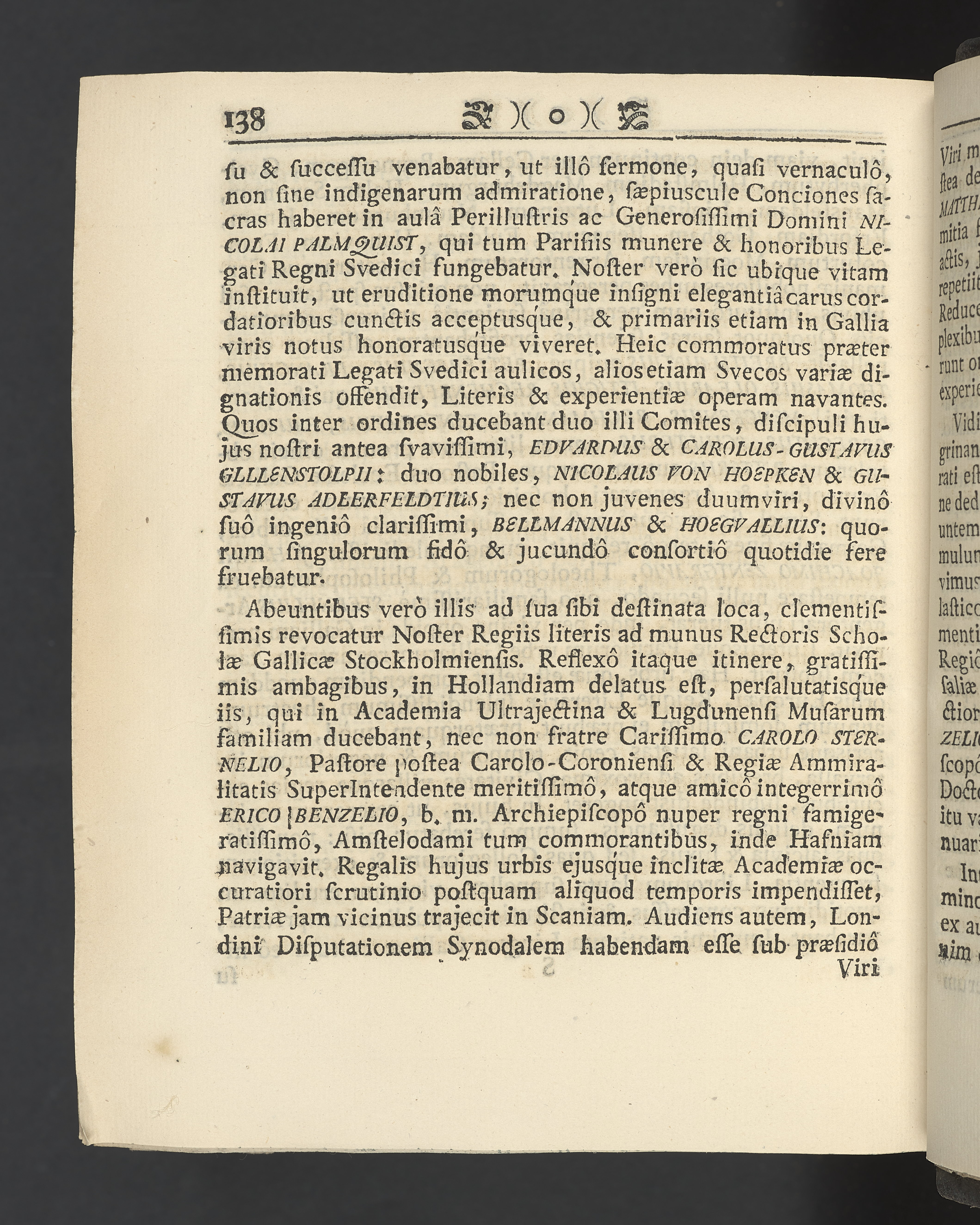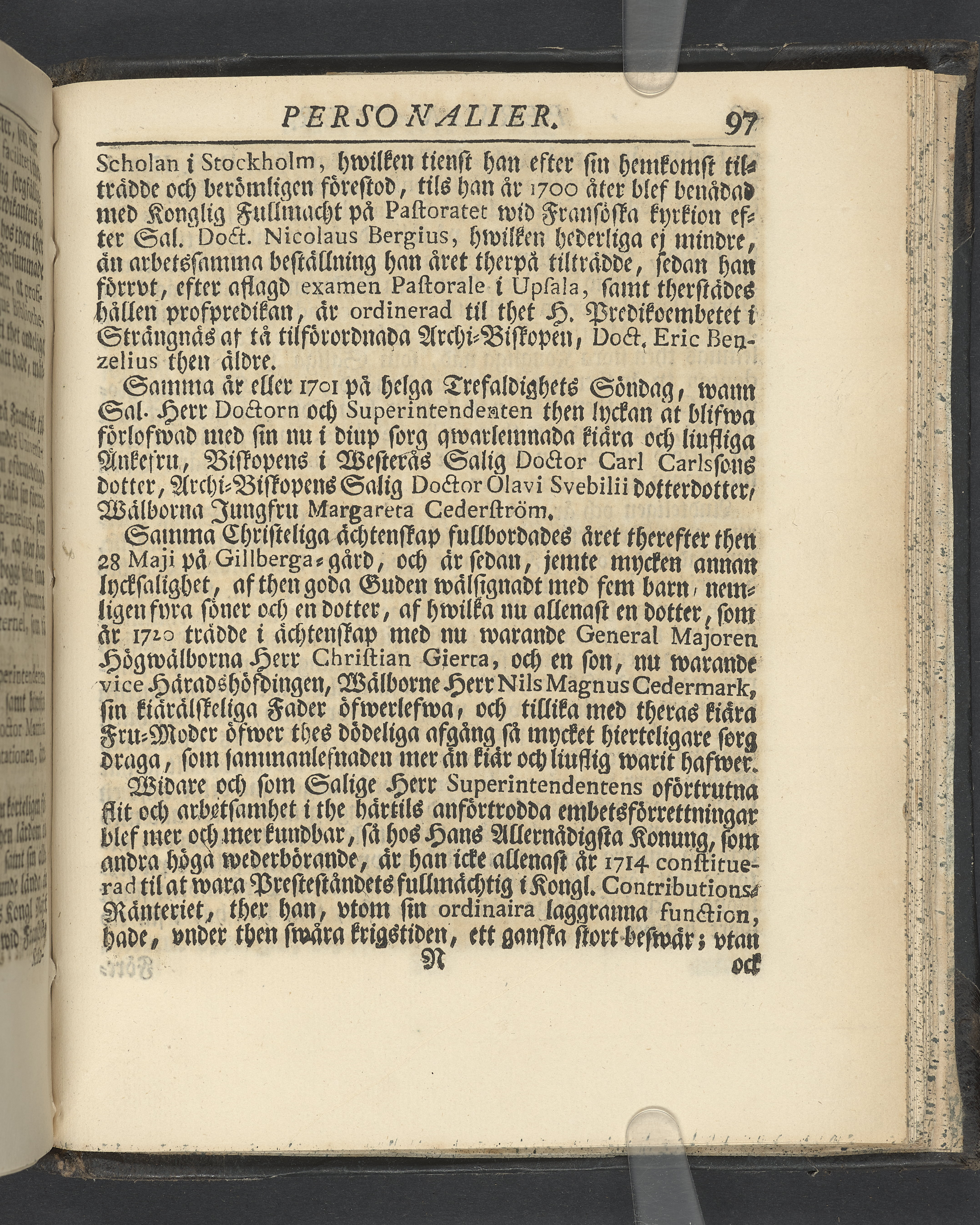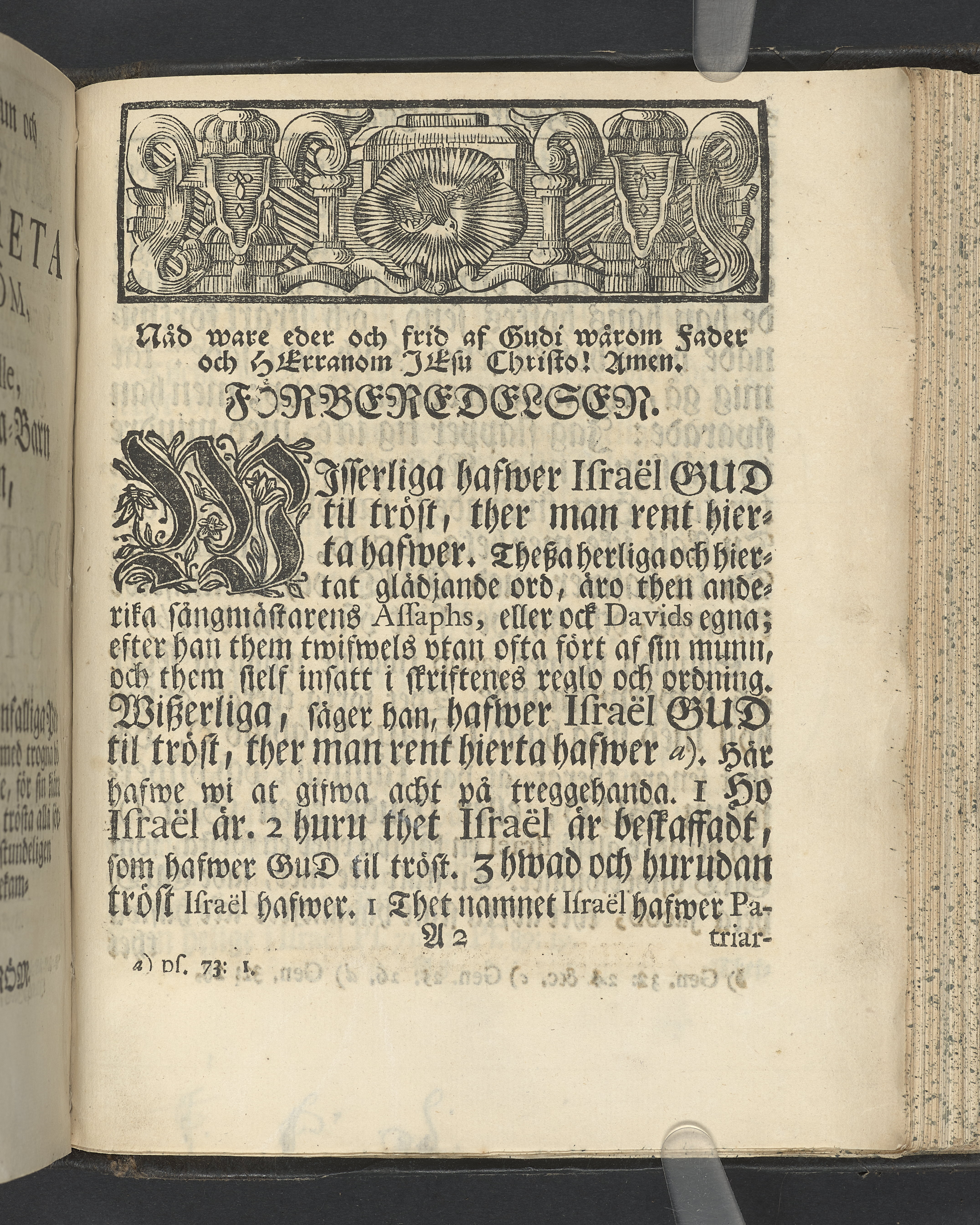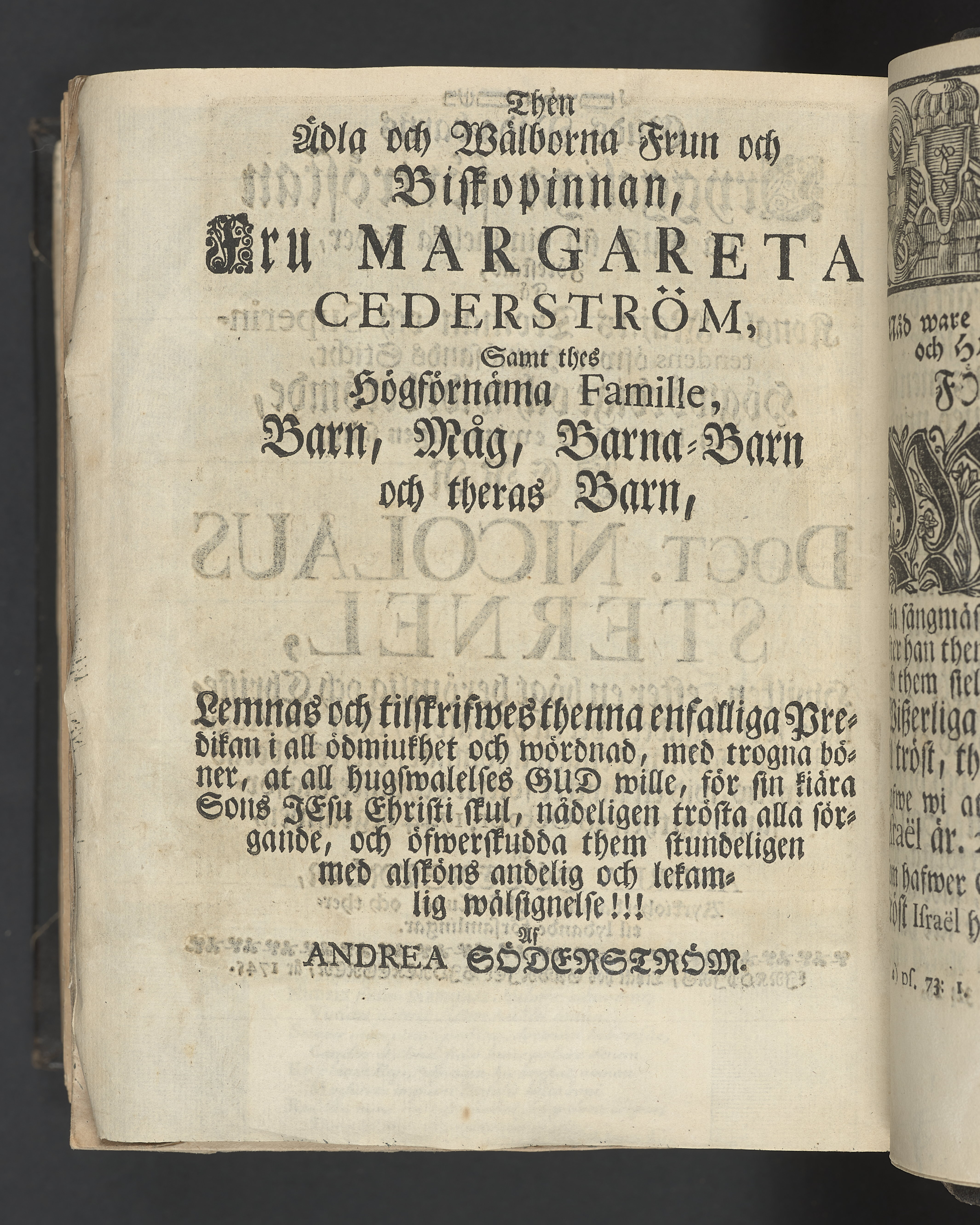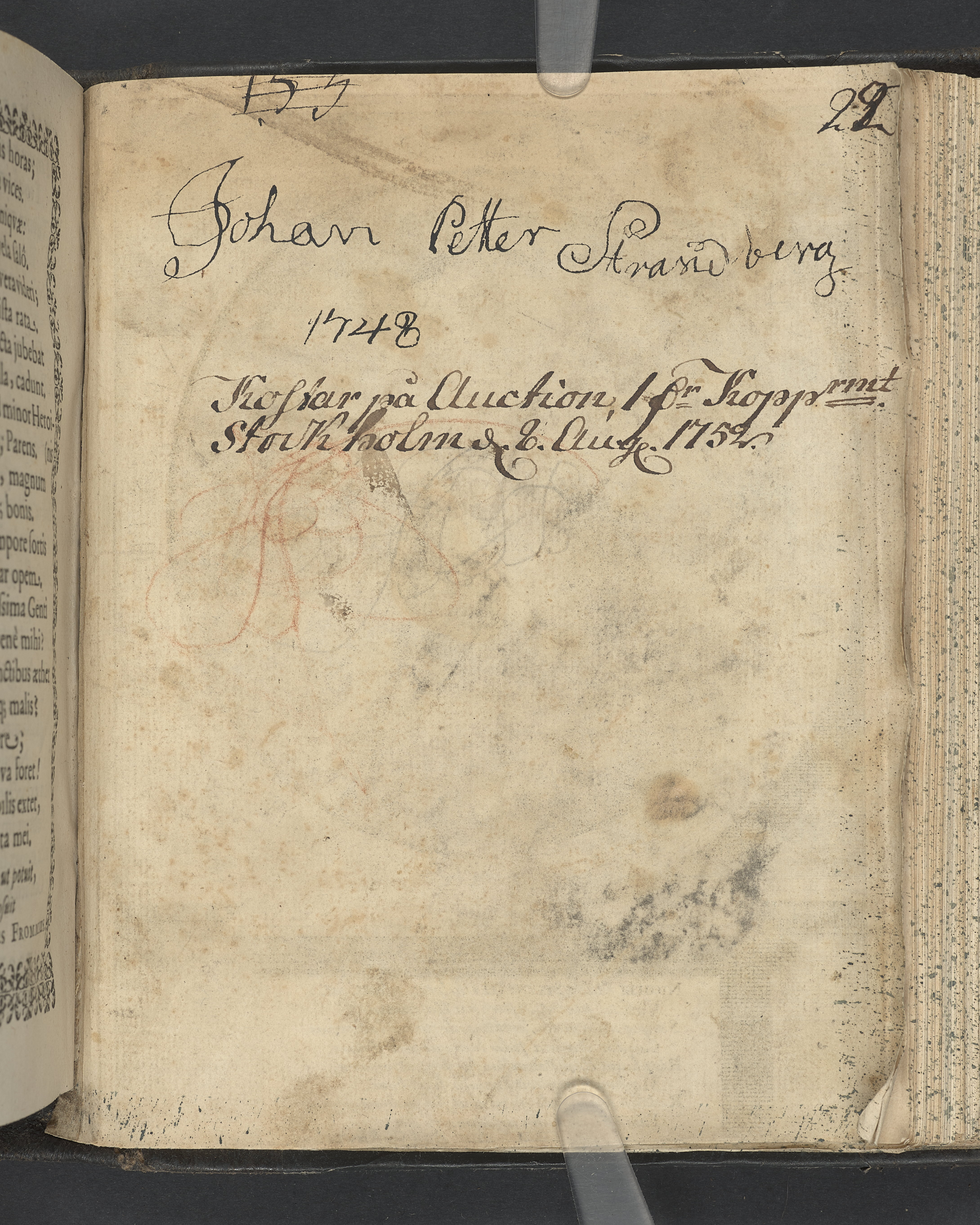 Graverat porträtt innan titelbladet, med bilden på verso. På recto ägaranteckning i svart bläck "Johan Petter Strandberg 1748", i överkant till vänster (delvis avskuret) "155", samt i högra hörnet "22". Nedanför ägaranteckningen en anteckning av Carl Gustaf Bielke med uppgift om inköp på auktion. Snitt stänkta i rött och blått.
