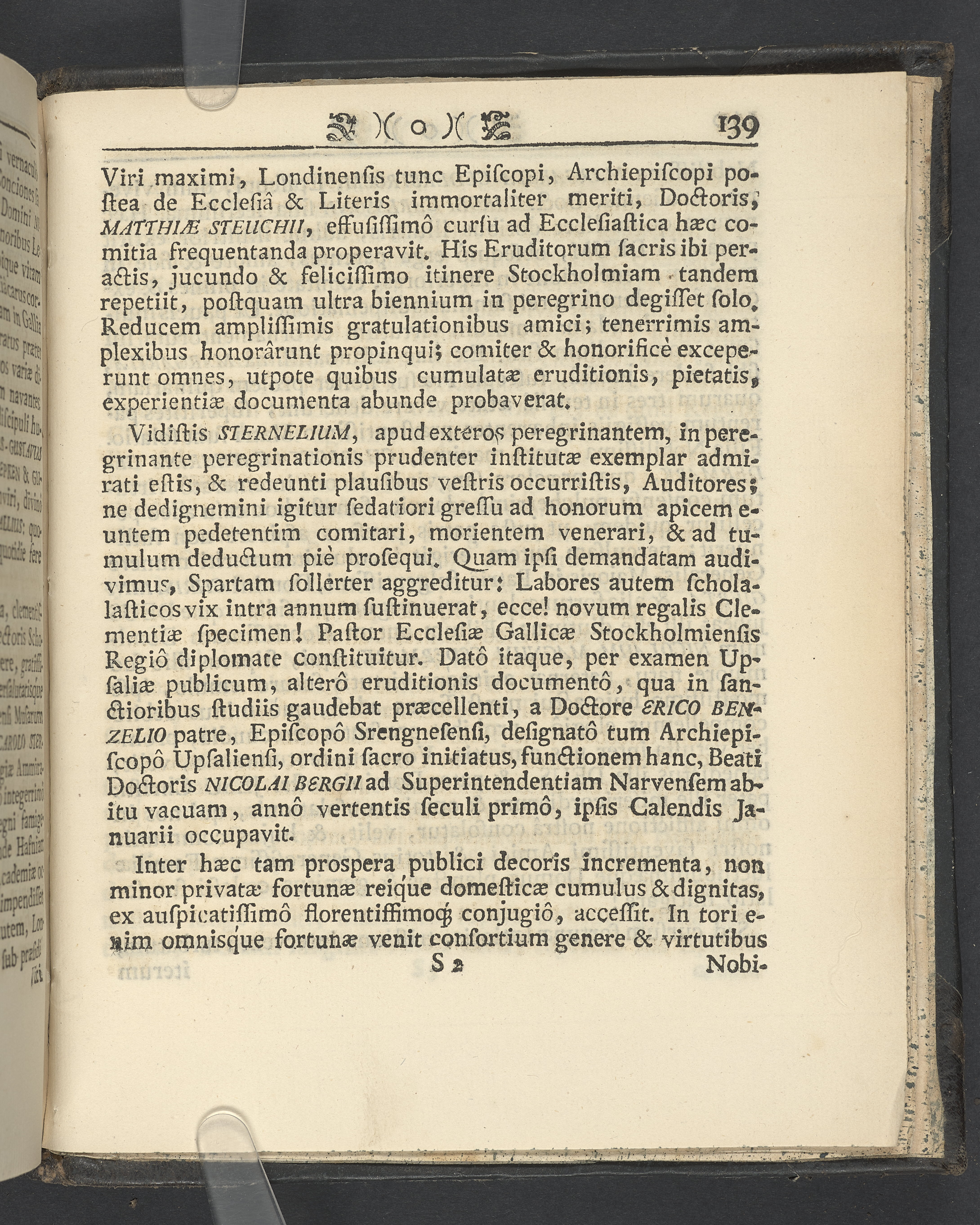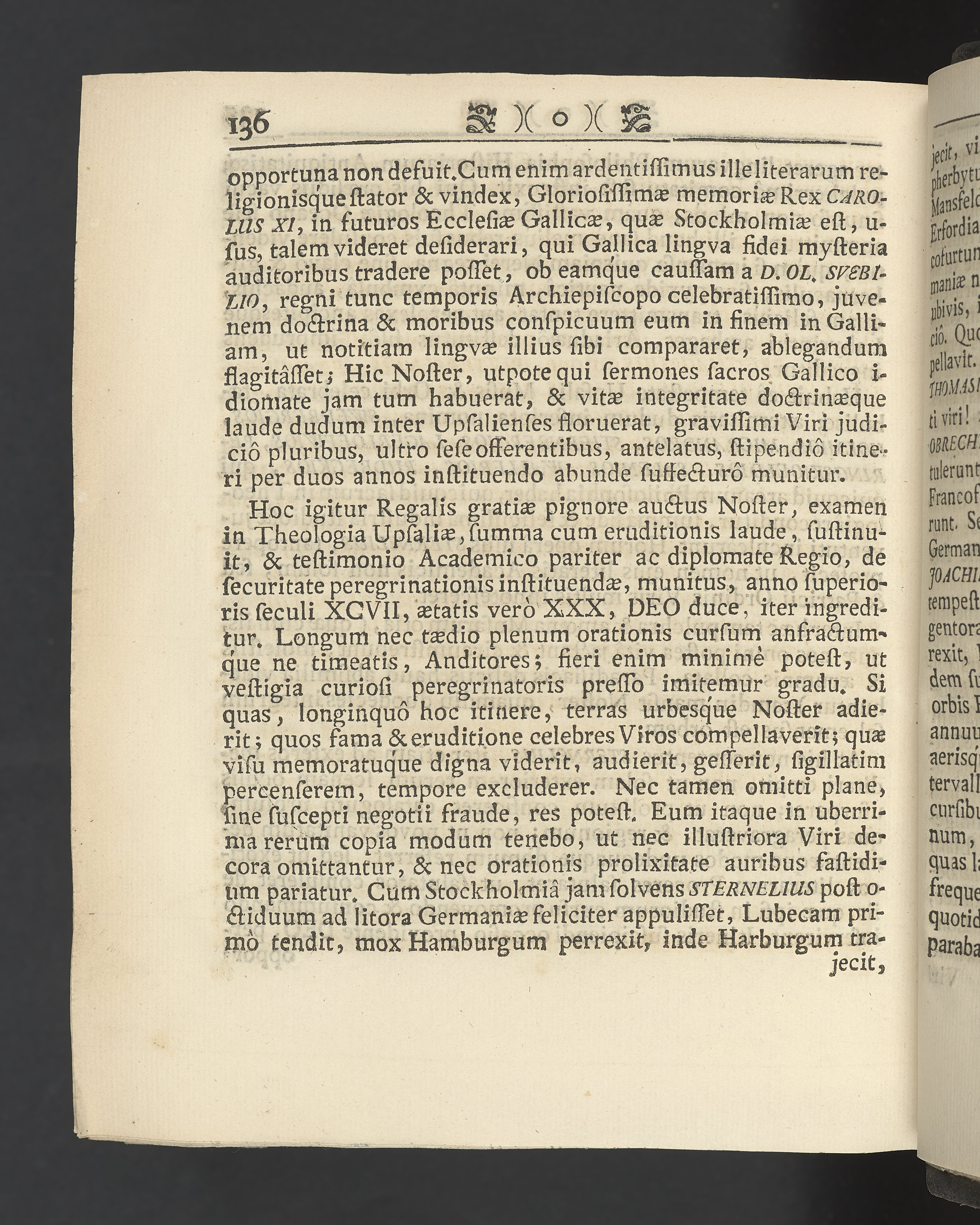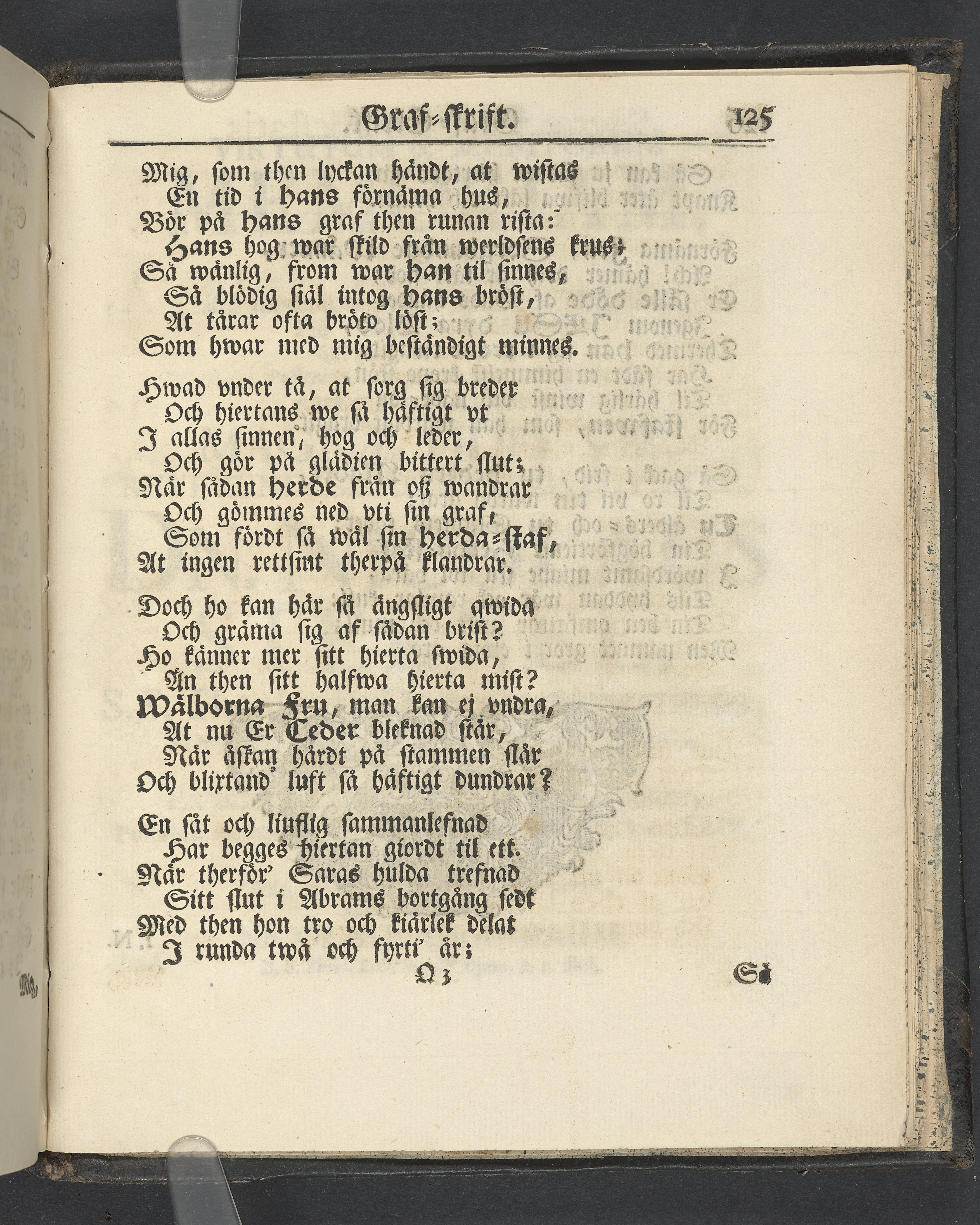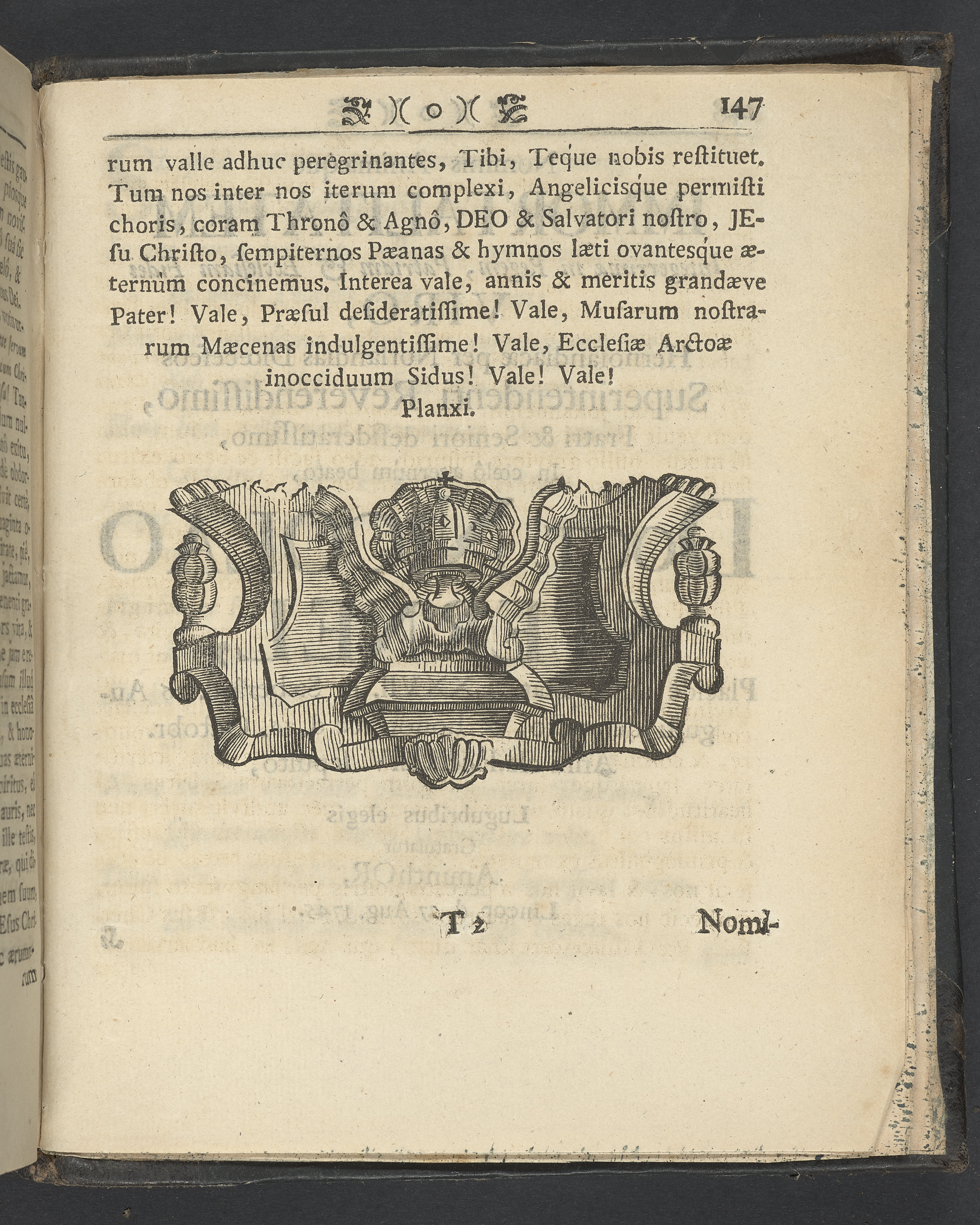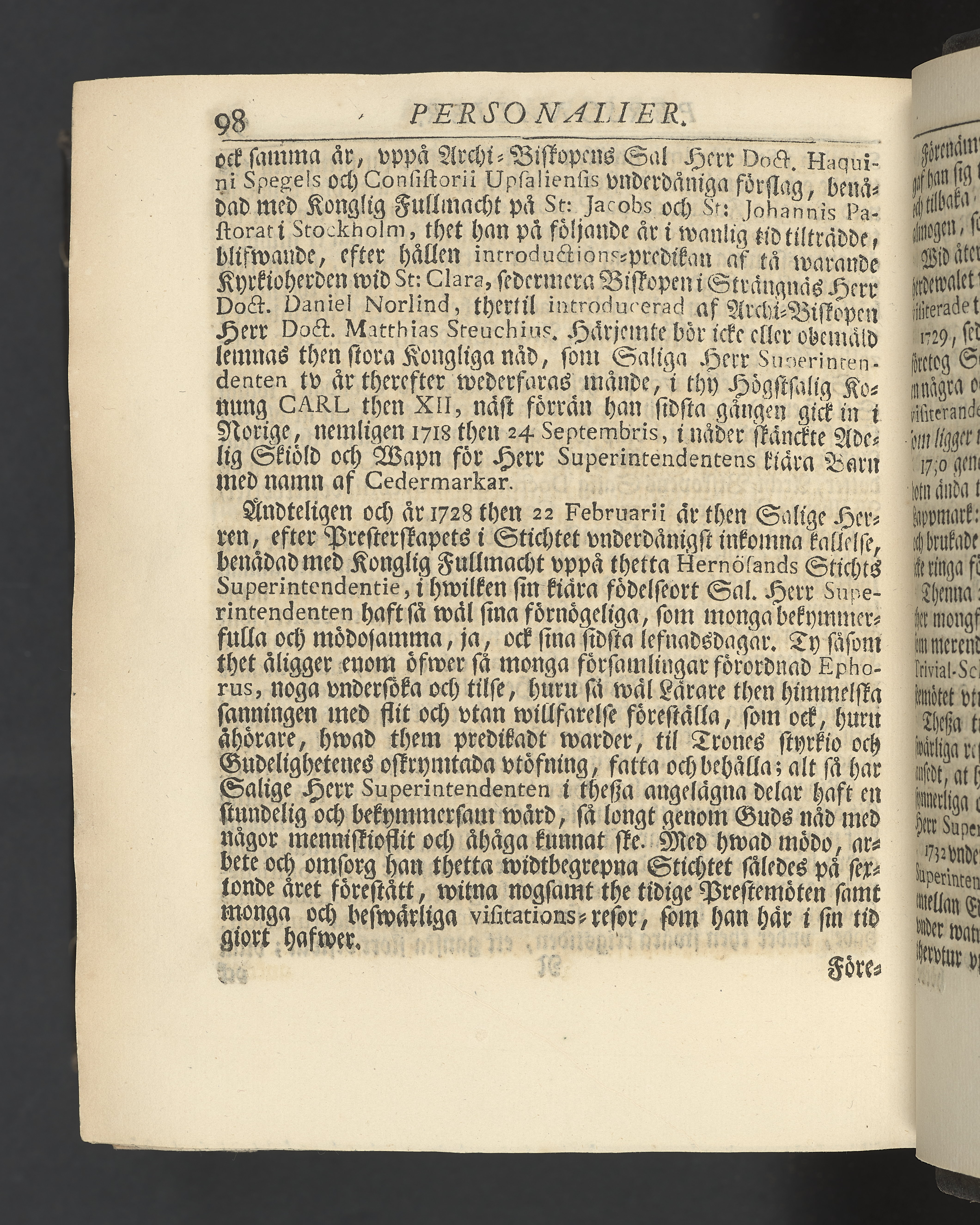 Graverat porträtt innan titelbladet, med bilden på verso. På recto ägaranteckning i svart bläck "Johan Petter Strandberg 1748", i överkant till vänster (delvis avskuret) "155", samt i högra hörnet "22". Nedanför ägaranteckningen en anteckning av Carl Gustaf Bielke med uppgift om inköp på auktion. Snitt stänkta i rött och blått.