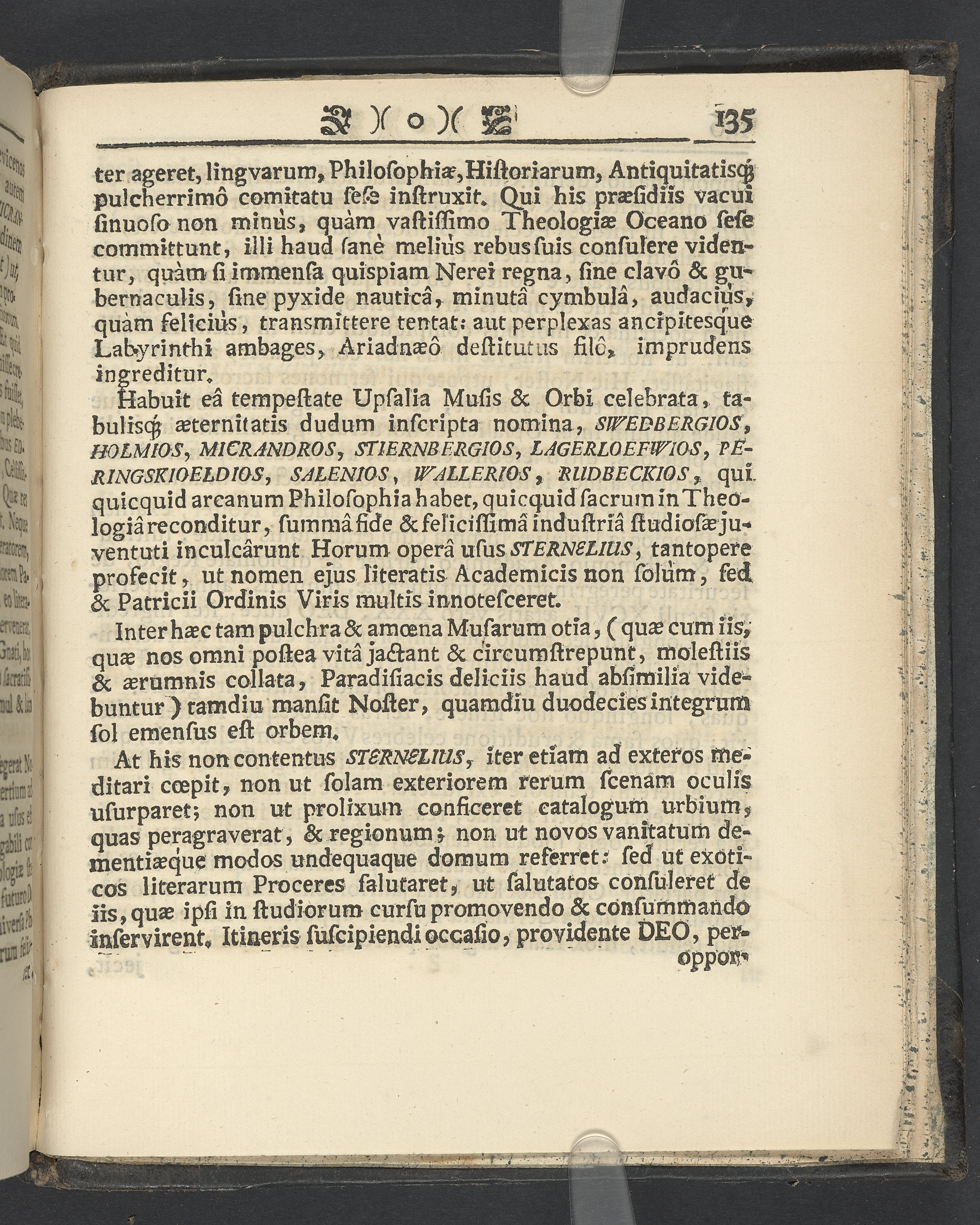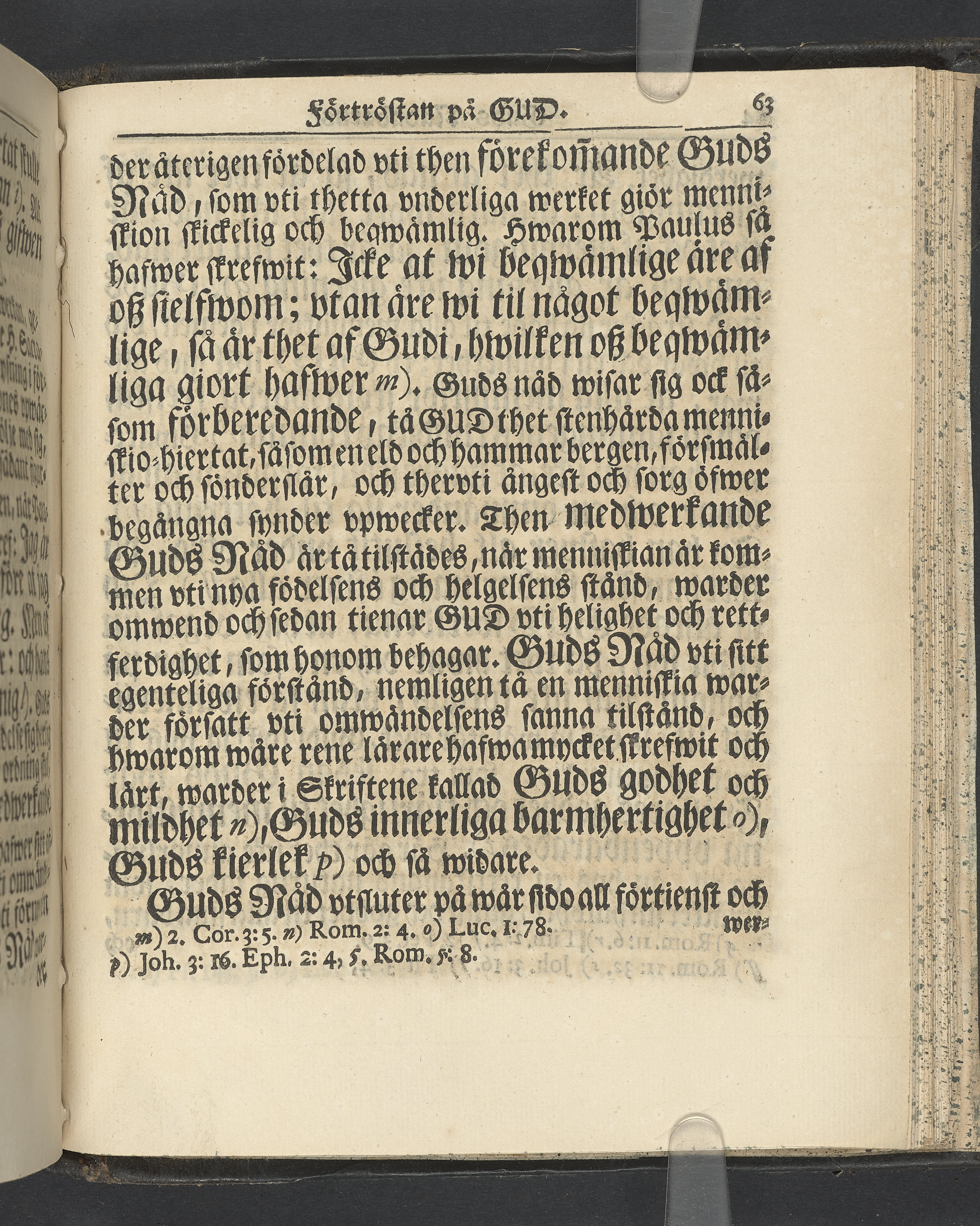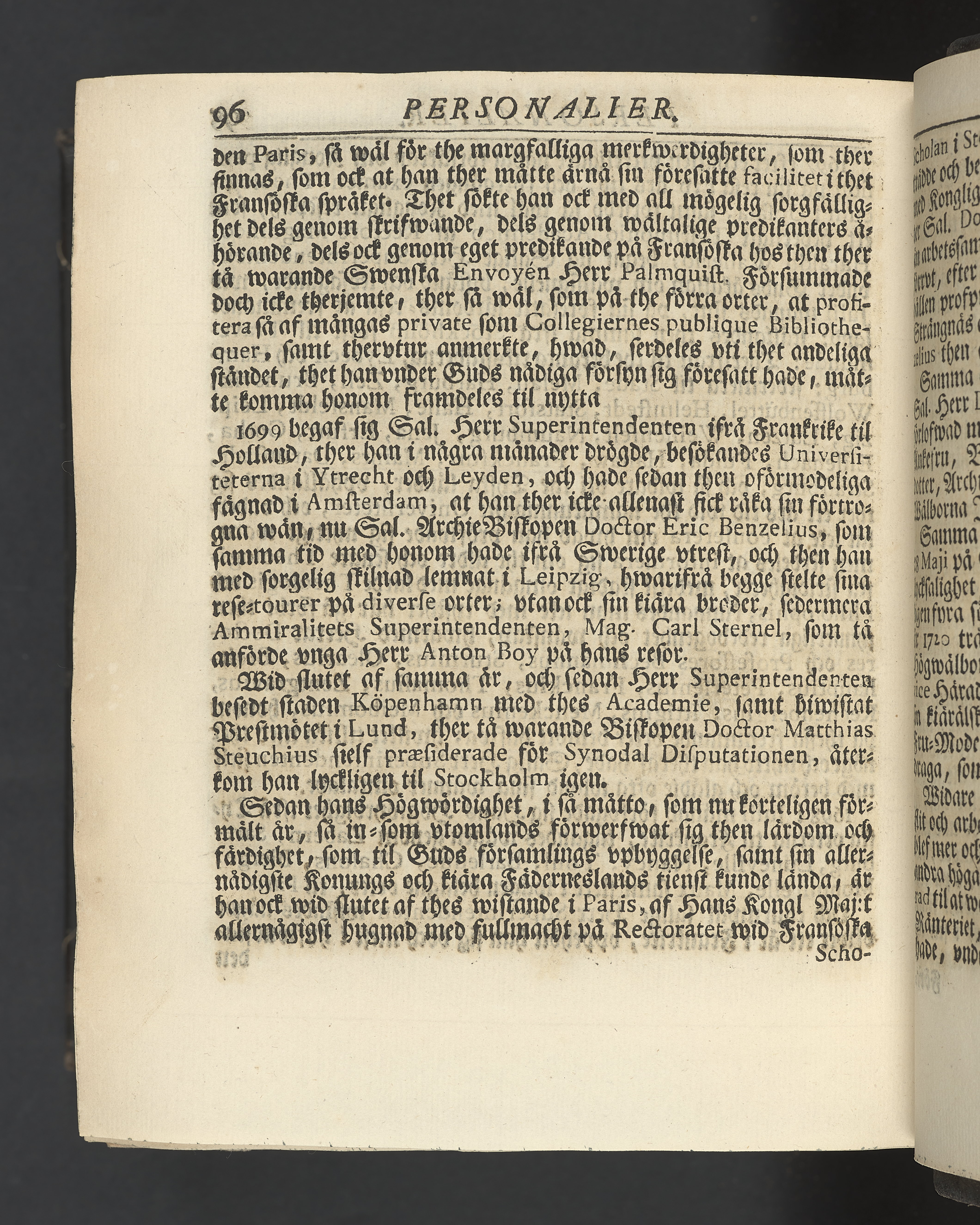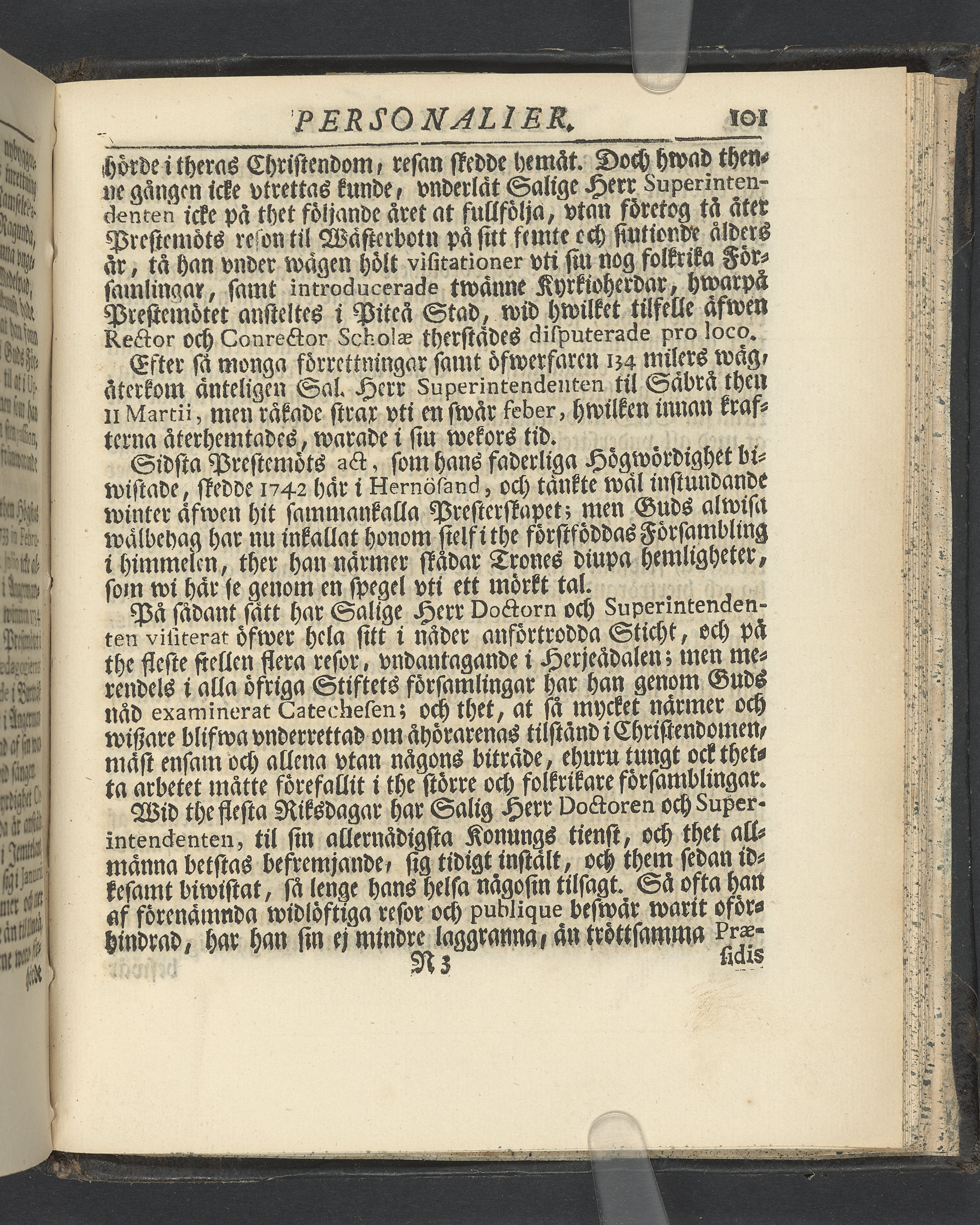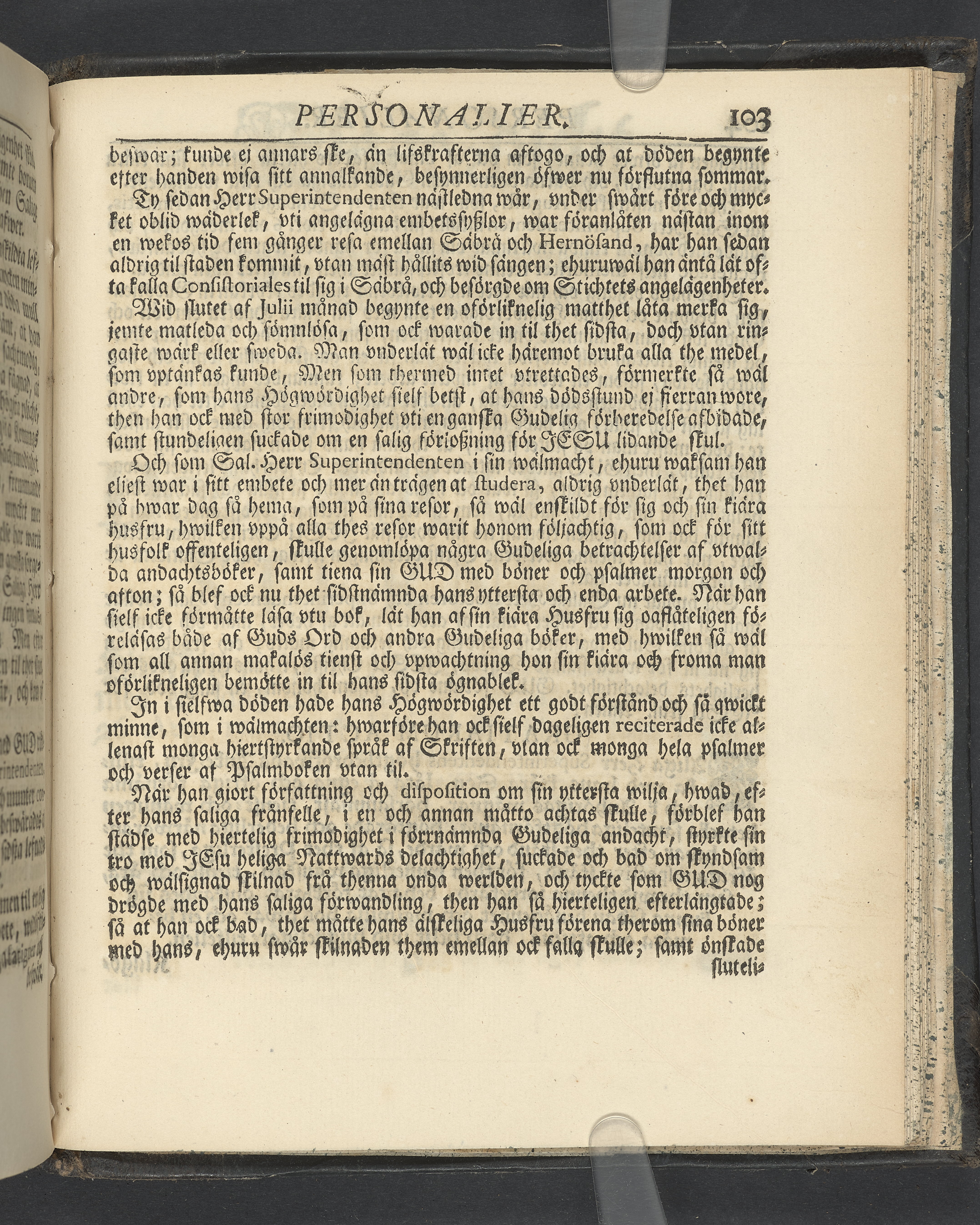 Graverat porträtt innan titelbladet, med bilden på verso. På recto ägaranteckning i svart bläck "Johan Petter Strandberg 1748", i överkant till vänster (delvis avskuret) "155", samt i högra hörnet "22". Nedanför ägaranteckningen en anteckning av Carl Gustaf Bielke med uppgift om inköp på auktion. Snitt stänkta i rött och blått.