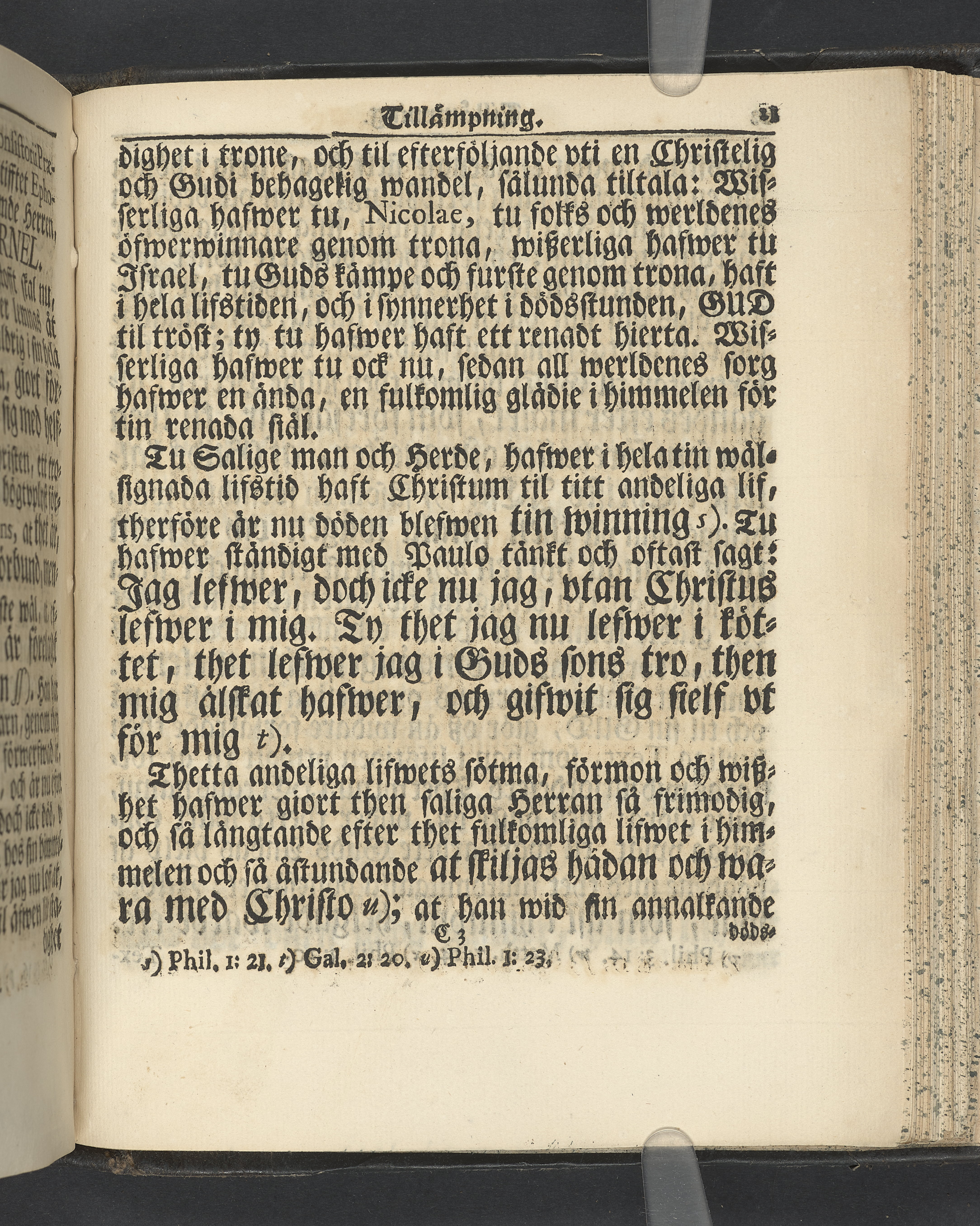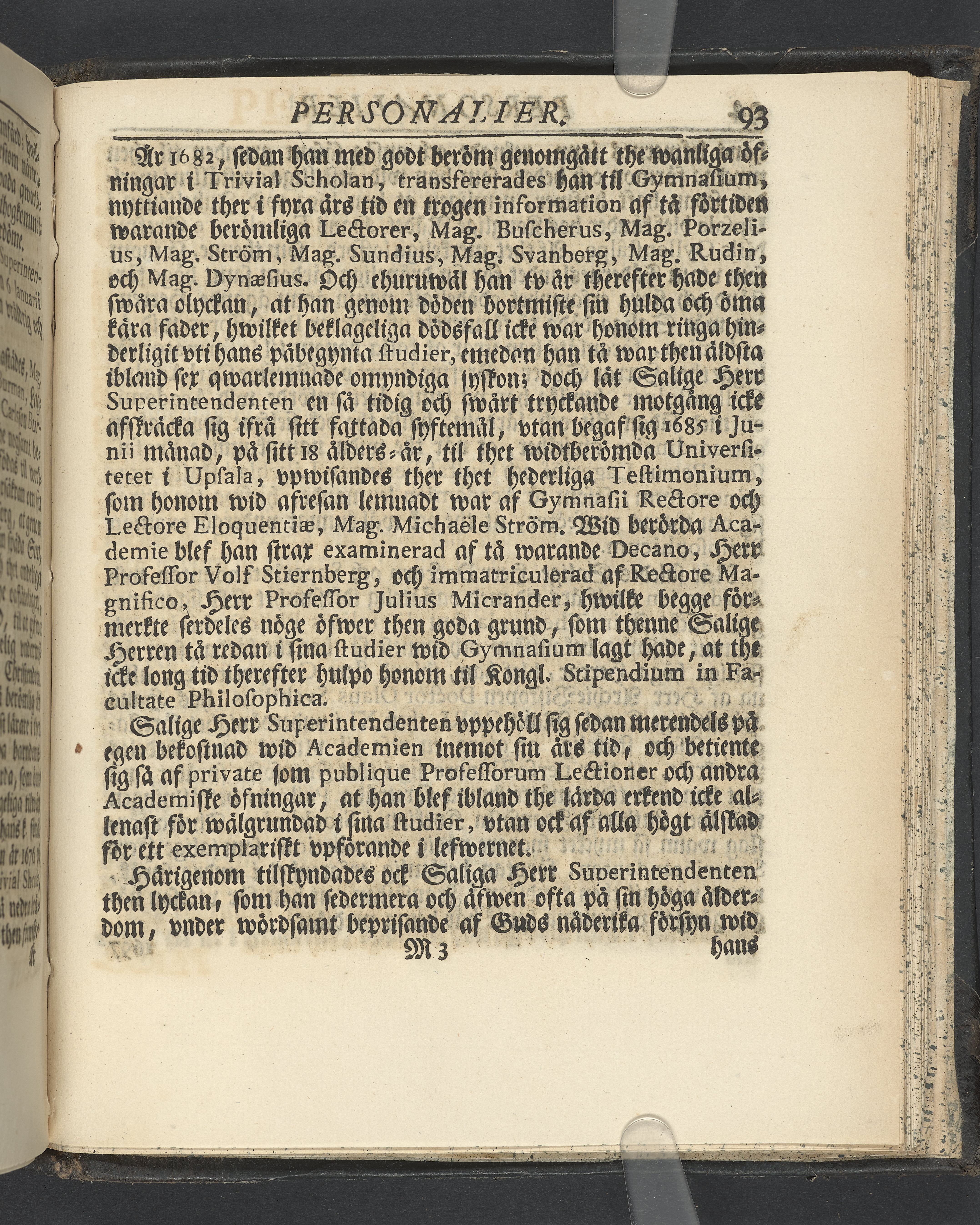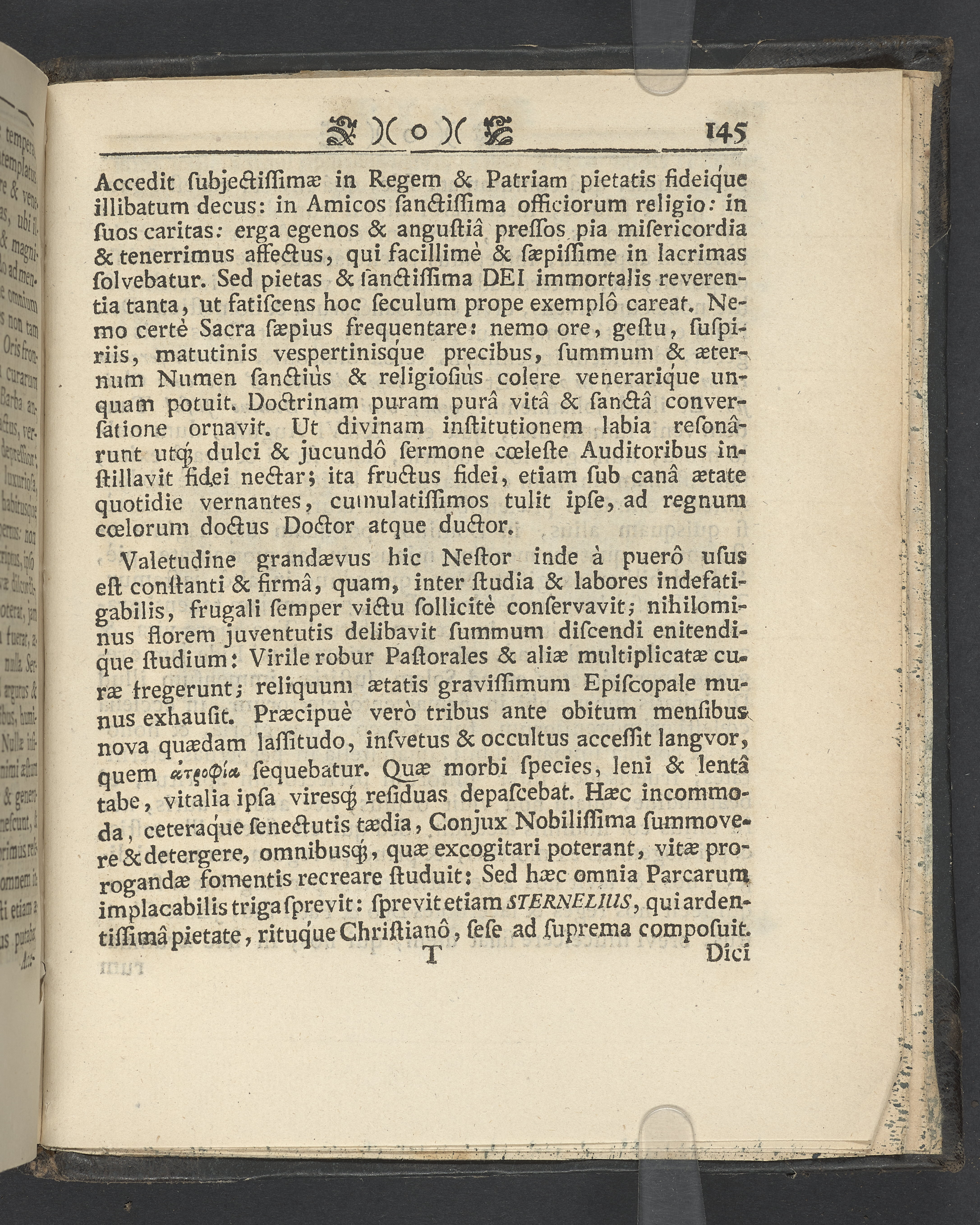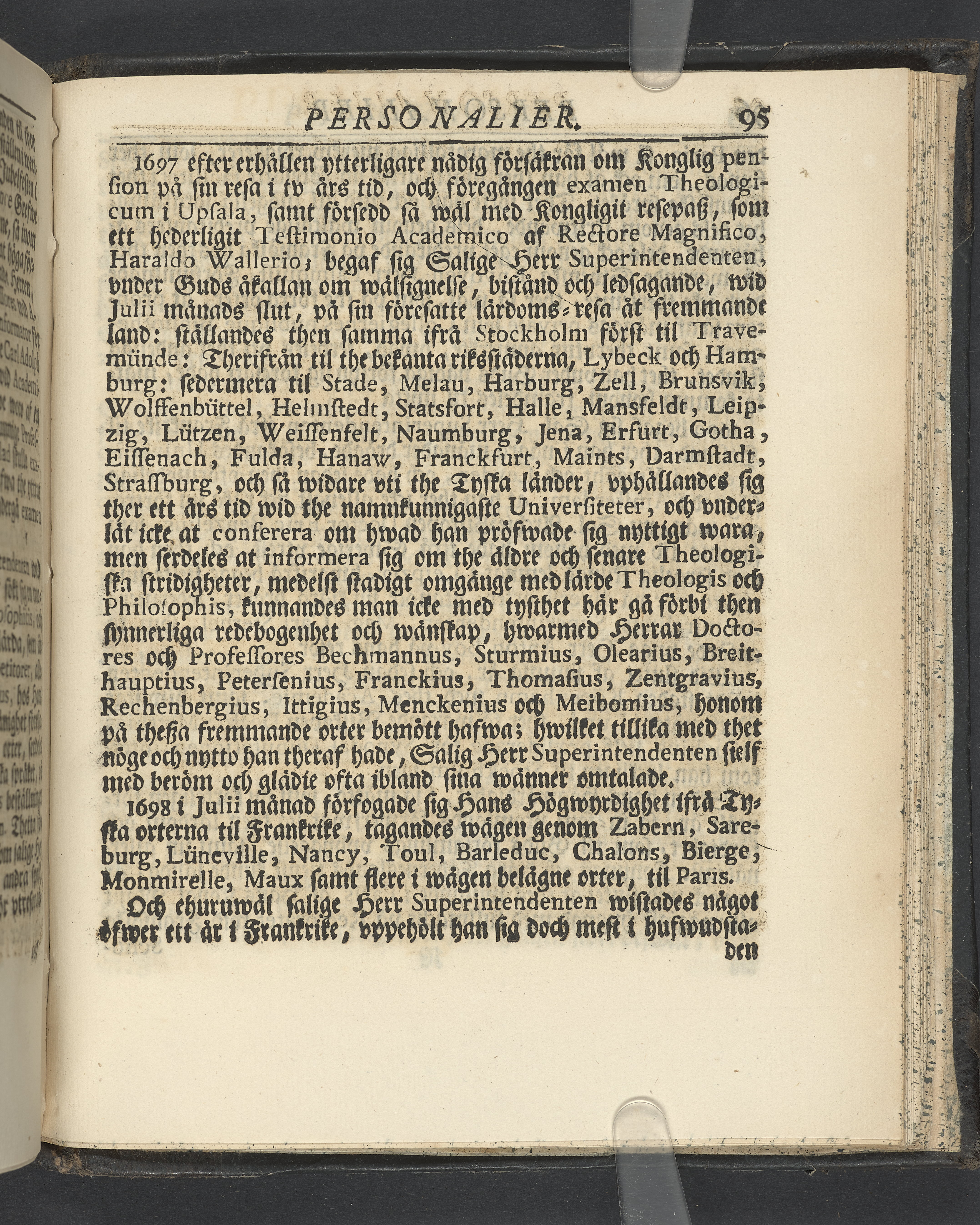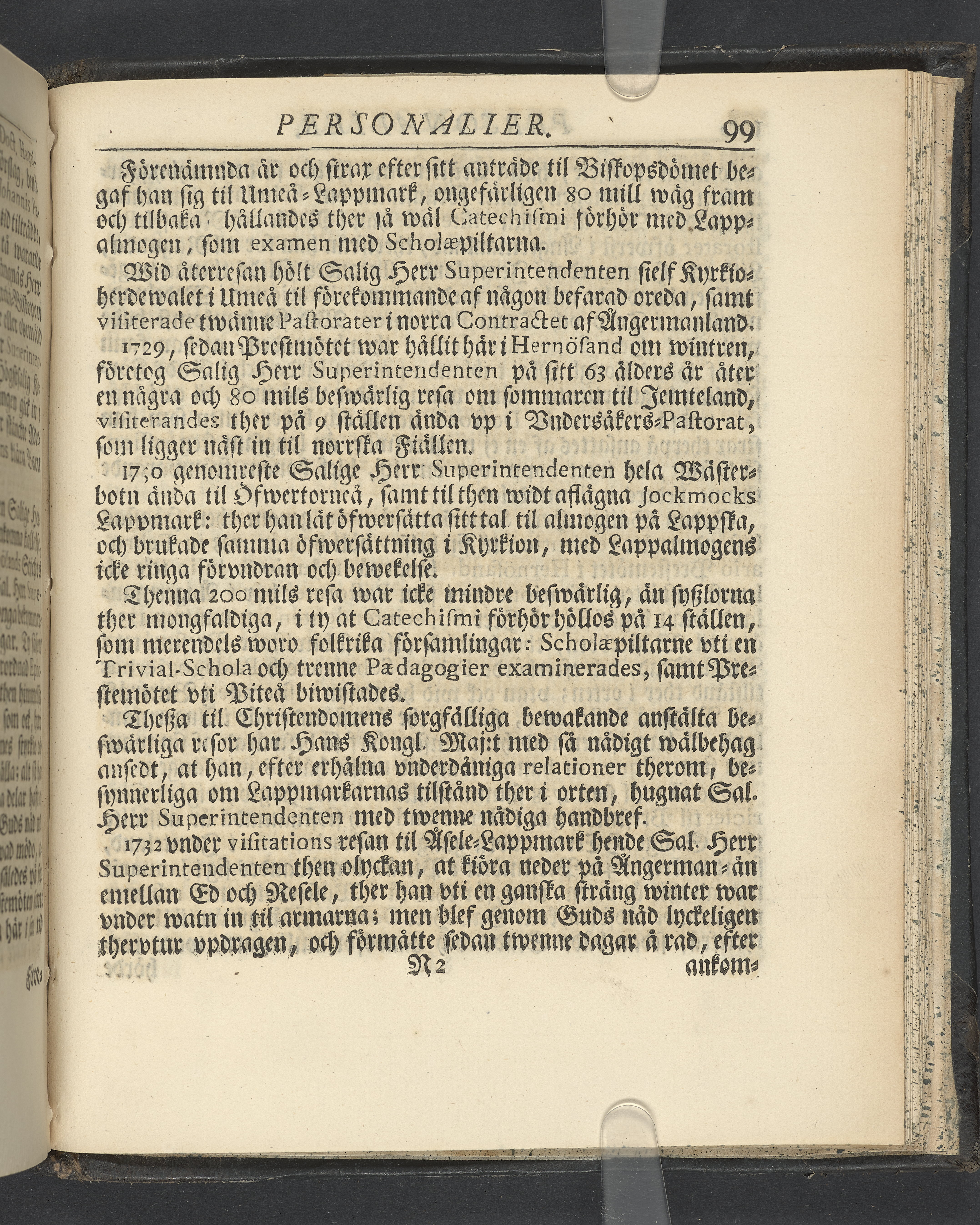 Graverat porträtt innan titelbladet, med bilden på verso. På recto ägaranteckning i svart bläck "Johan Petter Strandberg 1748", i överkant till vänster (delvis avskuret) "155", samt i högra hörnet "22". Nedanför ägaranteckningen en anteckning av Carl Gustaf Bielke med uppgift om inköp på auktion. Snitt stänkta i rött och blått.