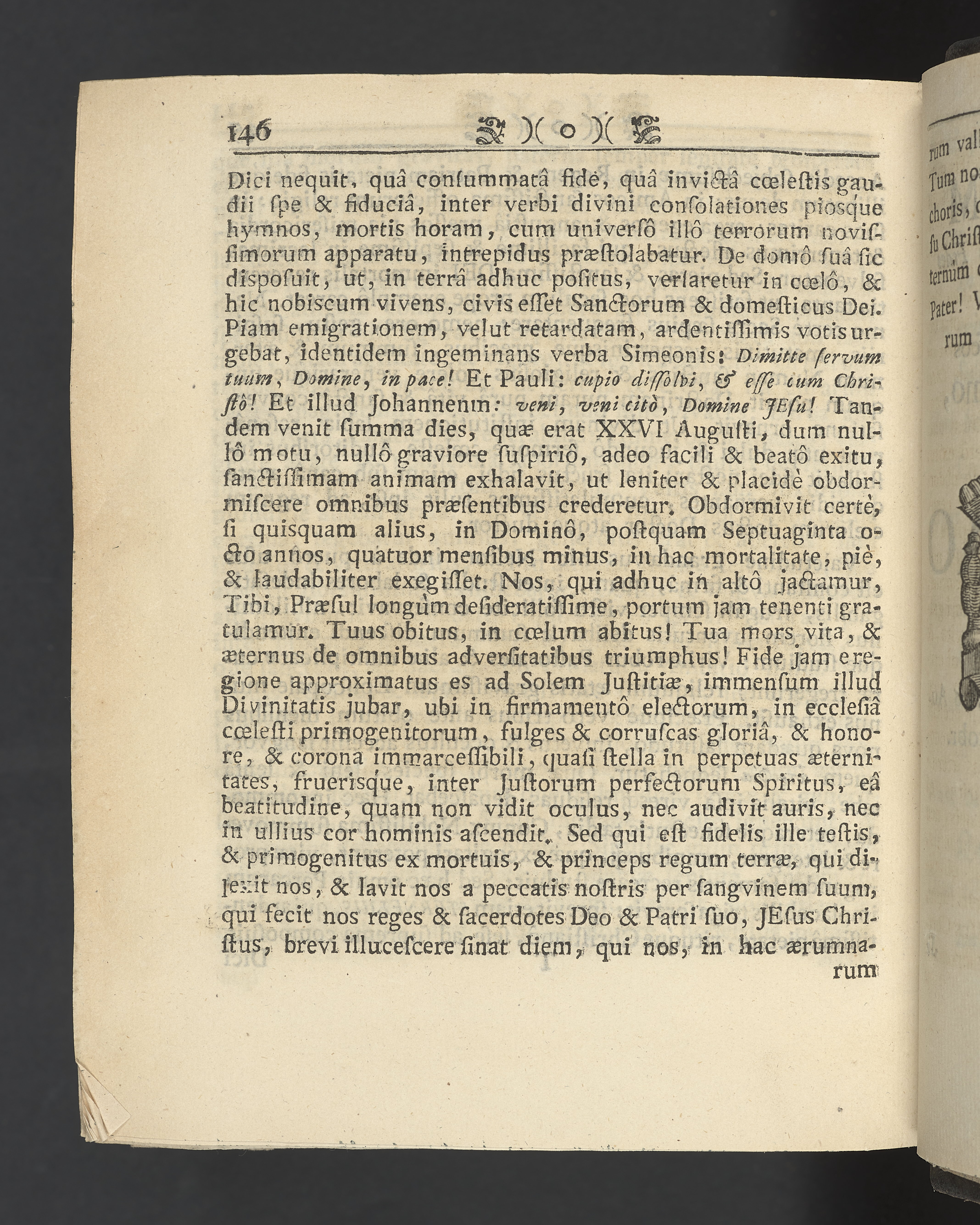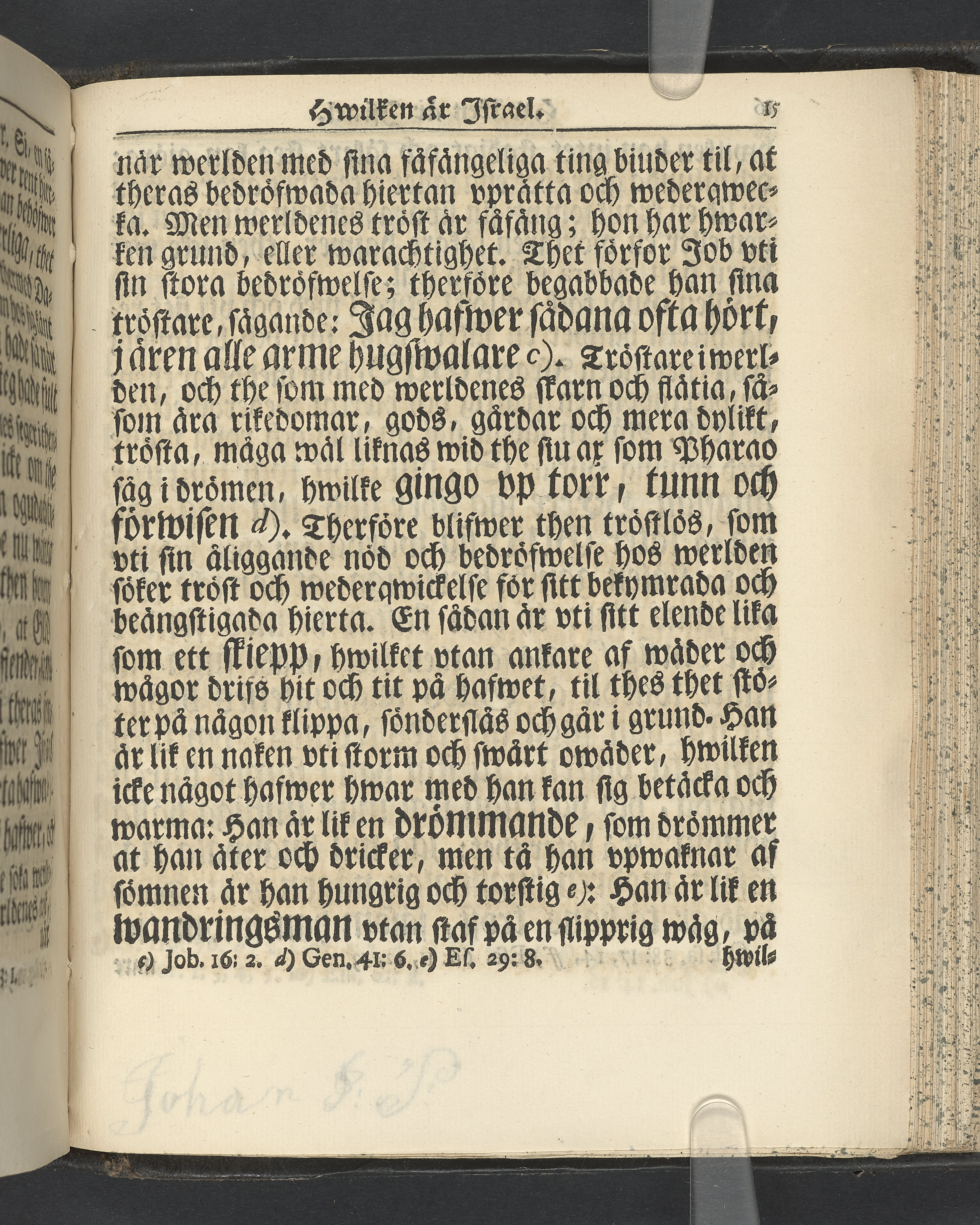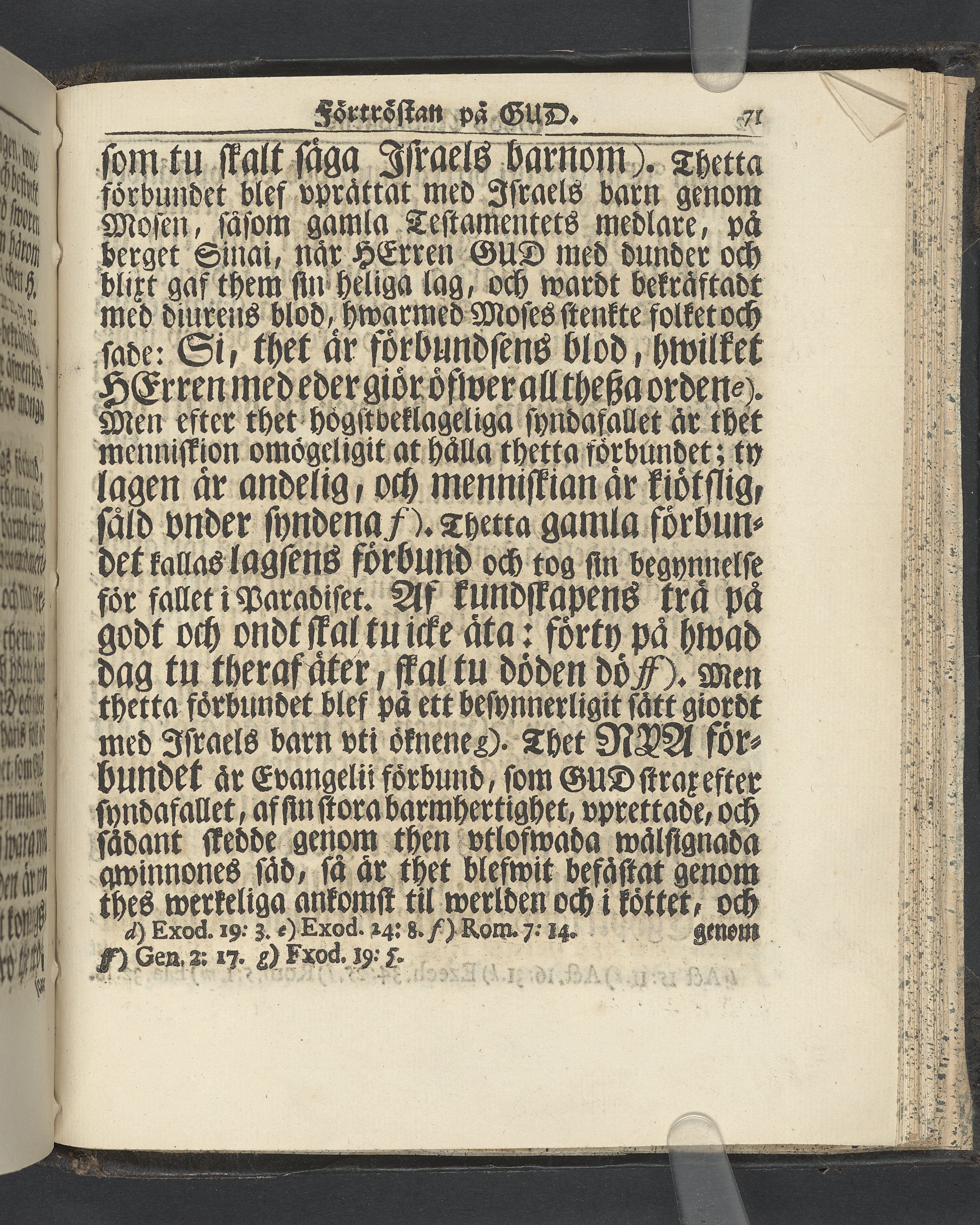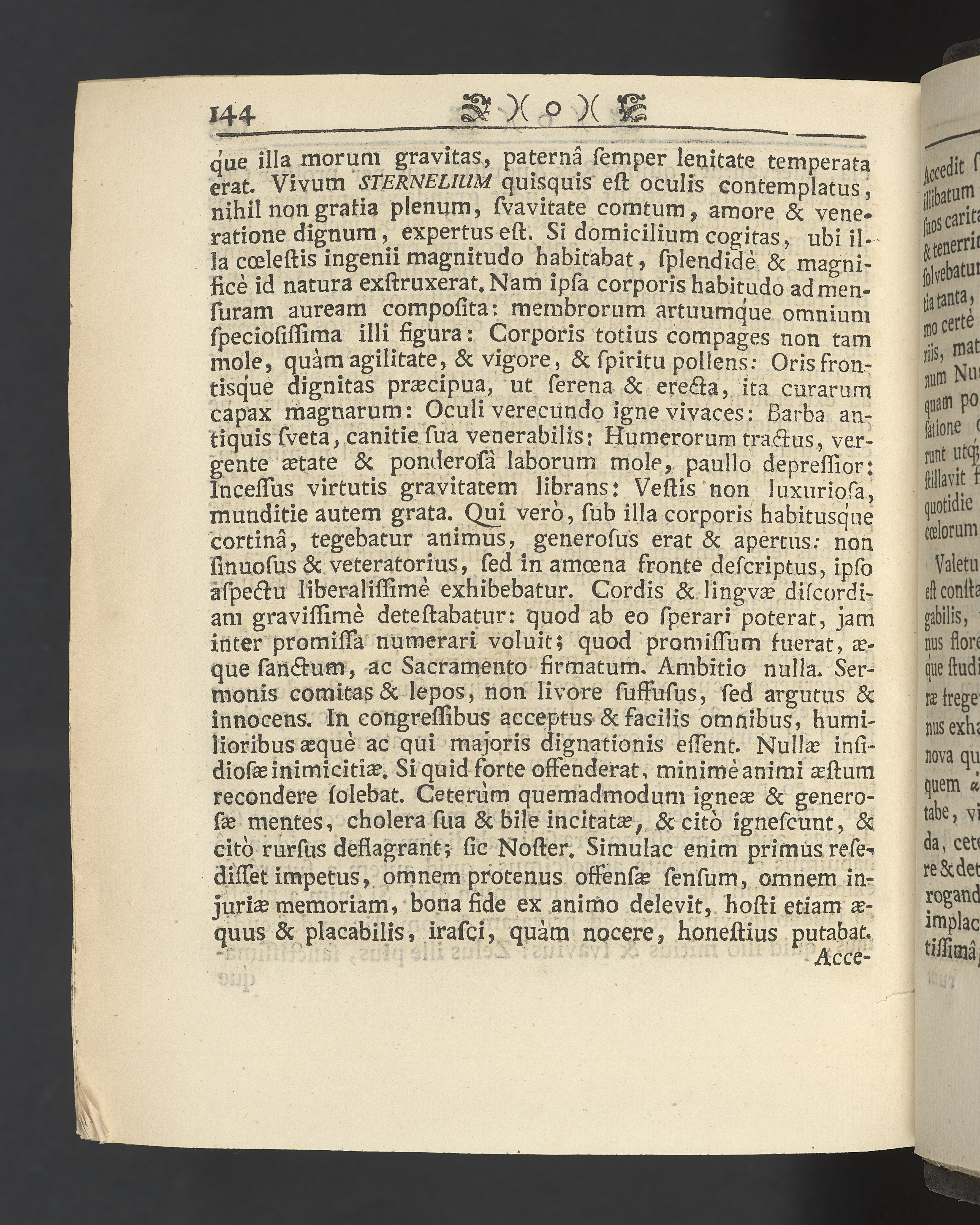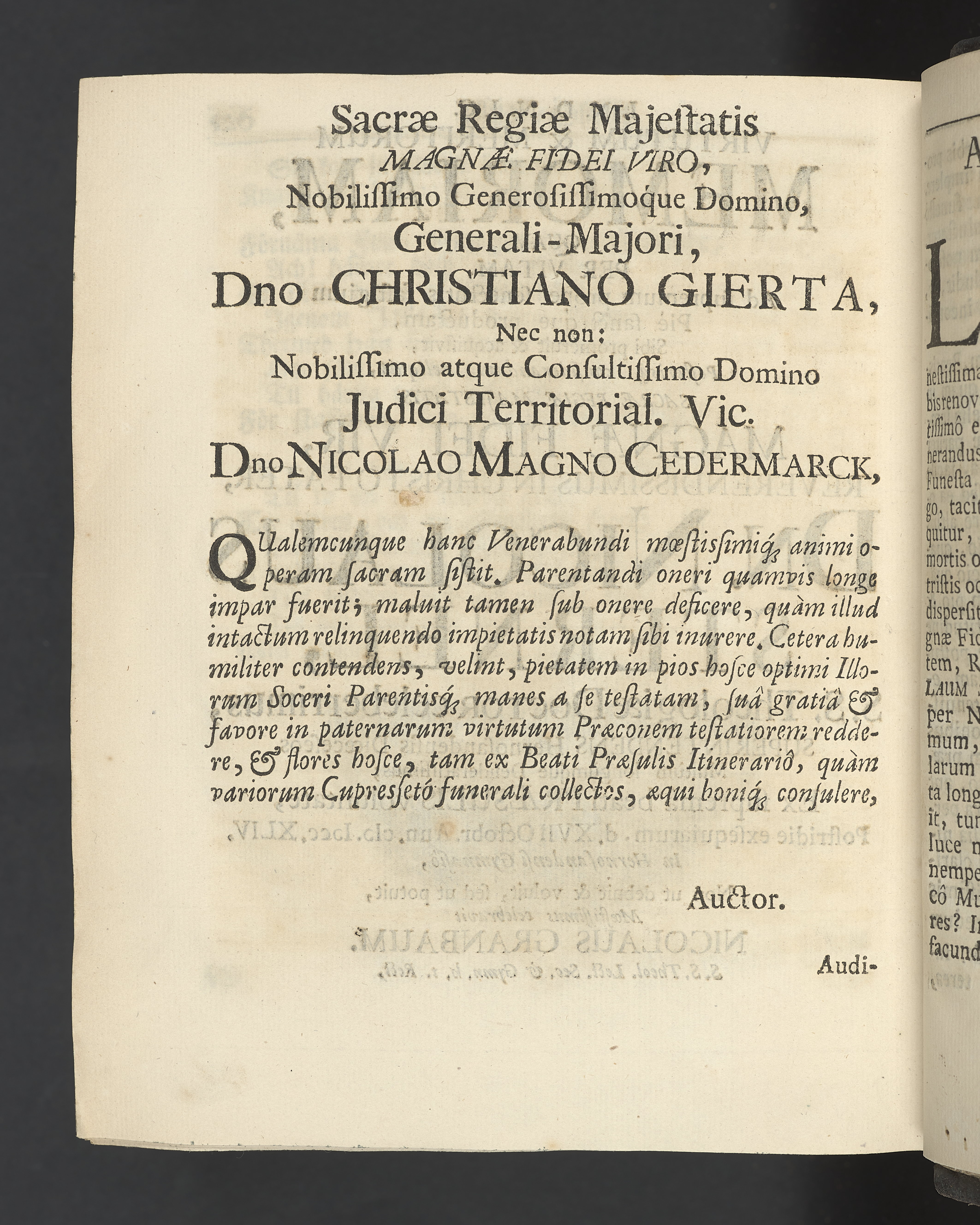 Graverat porträtt innan titelbladet, med bilden på verso. På recto ägaranteckning i svart bläck "Johan Petter Strandberg 1748", i överkant till vänster (delvis avskuret) "155", samt i högra hörnet "22". Nedanför ägaranteckningen en anteckning av Carl Gustaf Bielke med uppgift om inköp på auktion. Snitt stänkta i rött och blått.