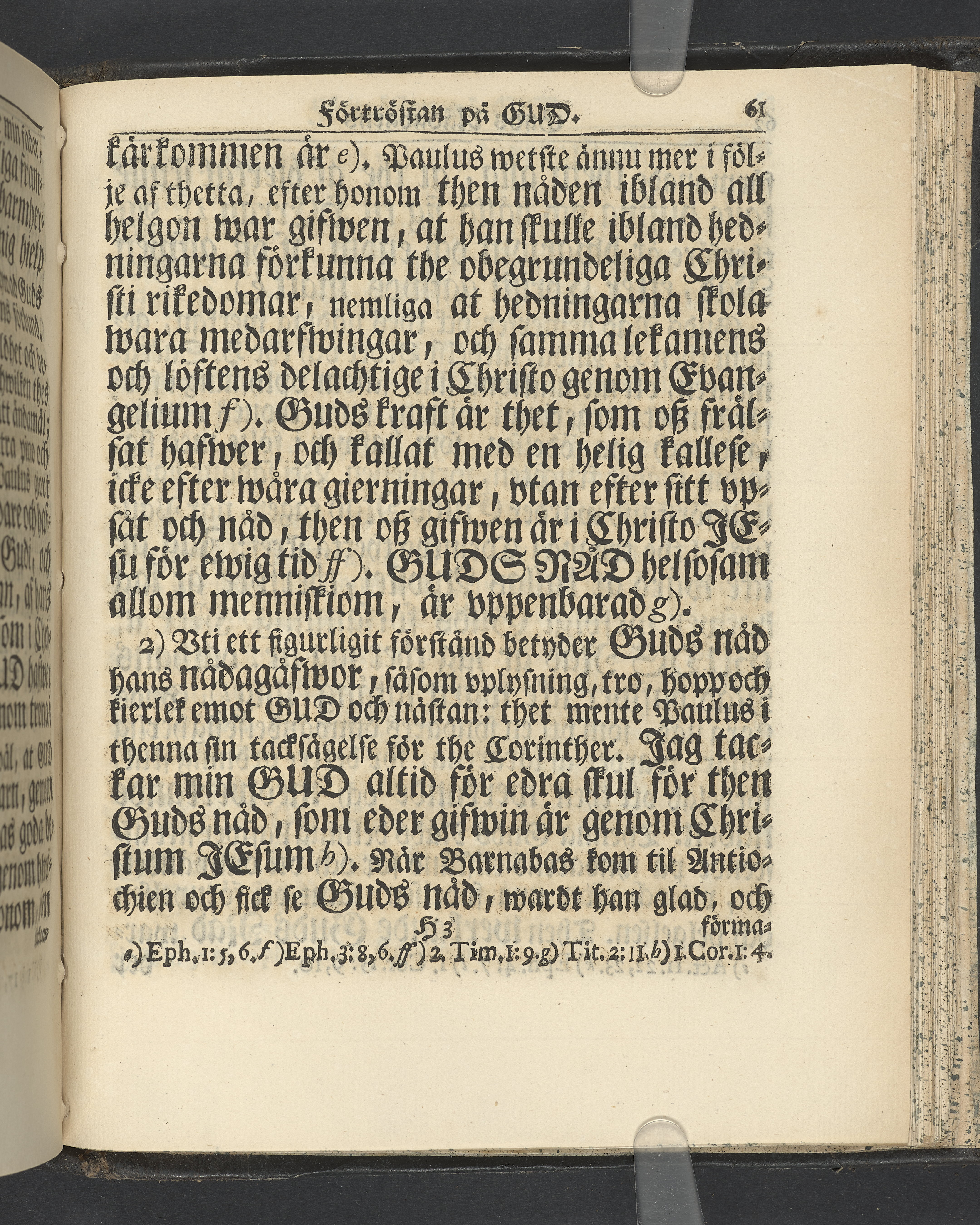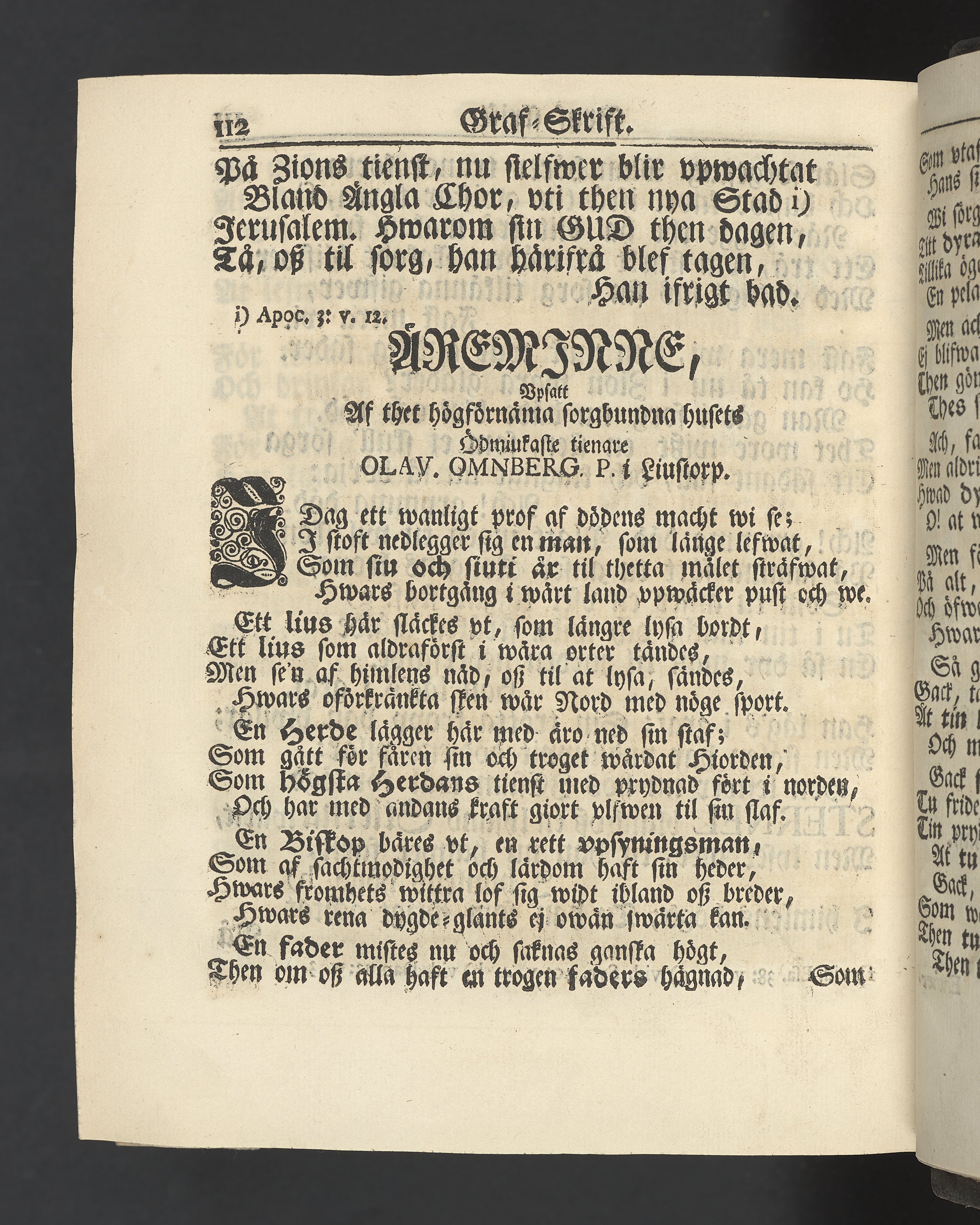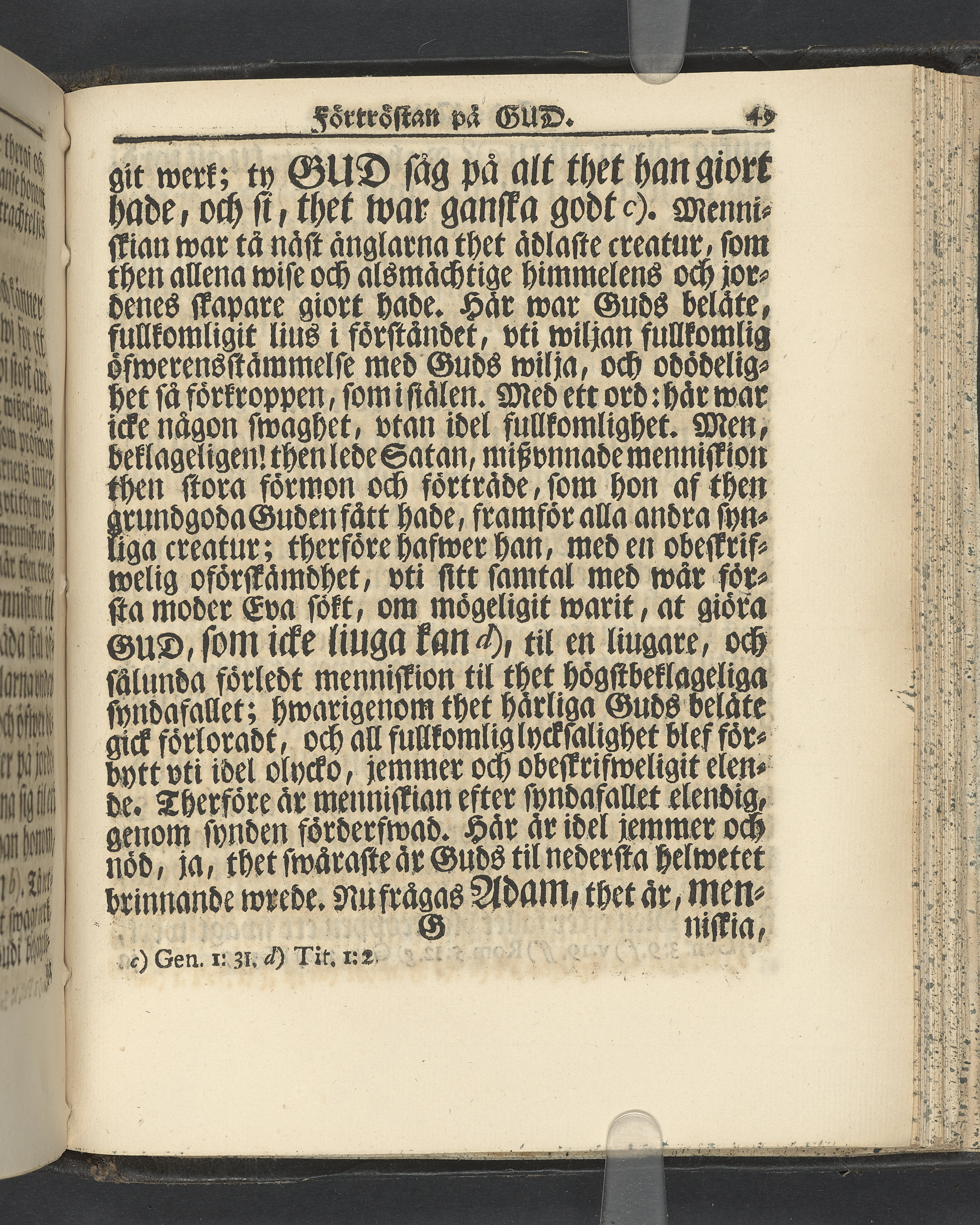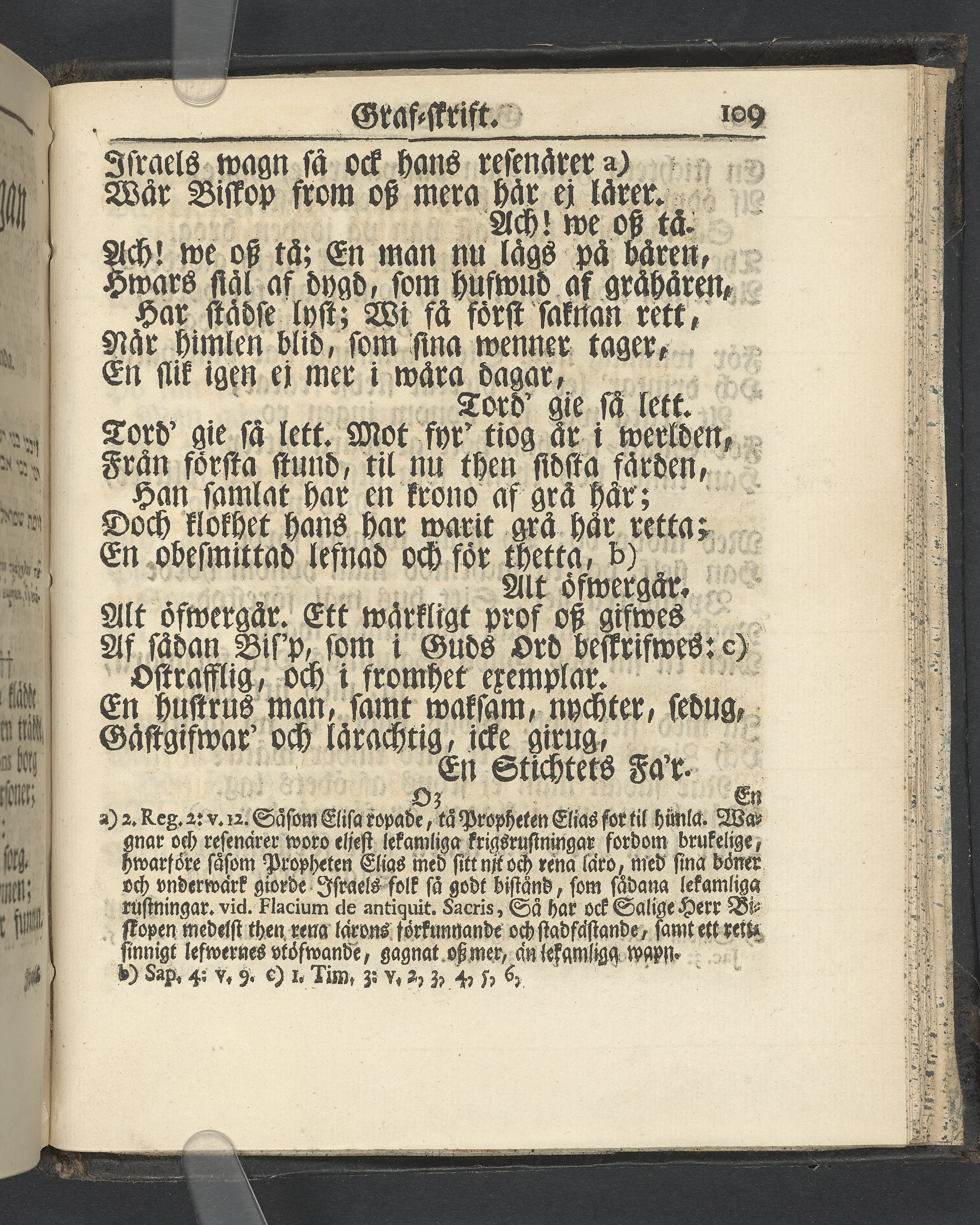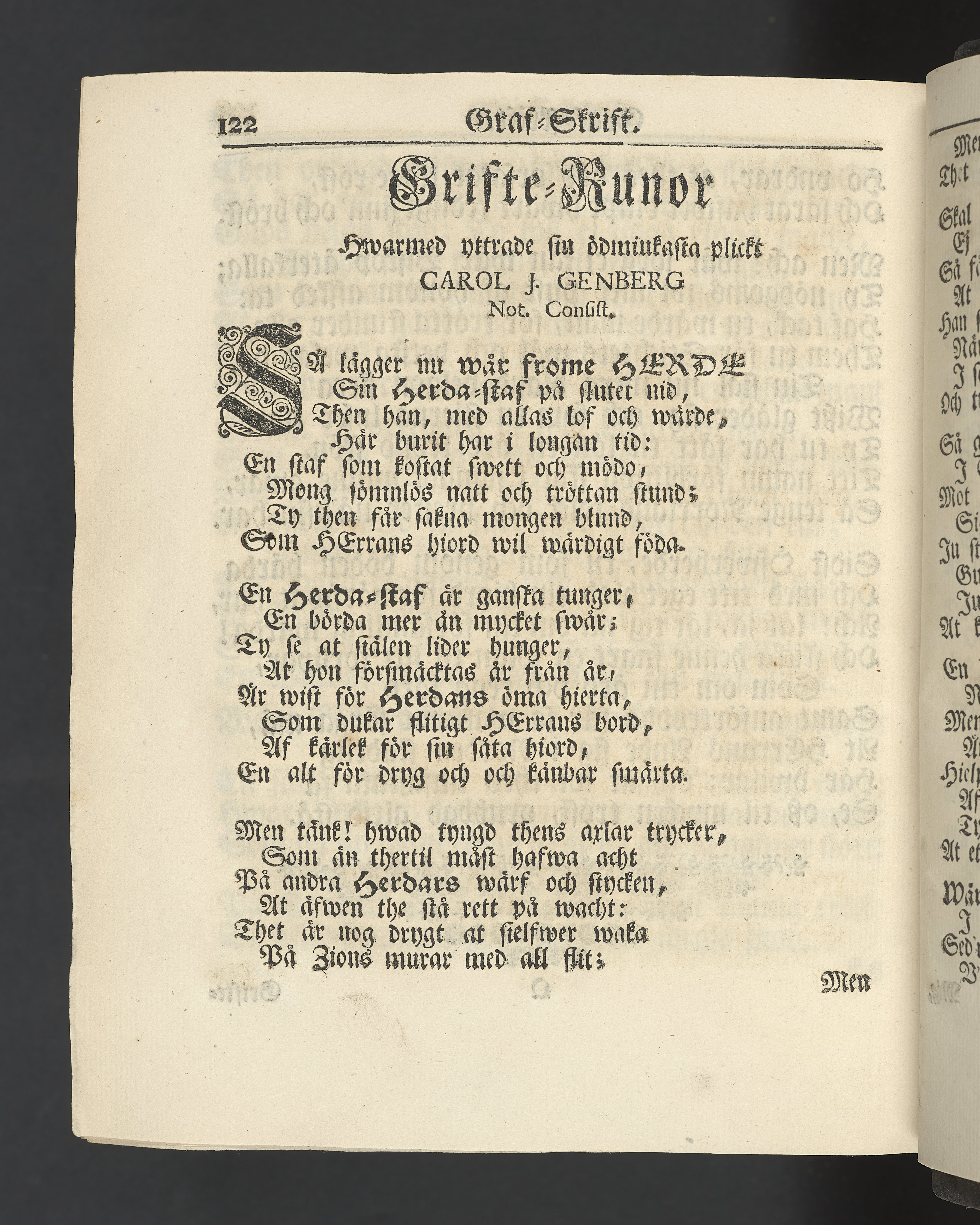 Graverat porträtt innan titelbladet, med bilden på verso. På recto ägaranteckning i svart bläck "Johan Petter Strandberg 1748", i överkant till vänster (delvis avskuret) "155", samt i högra hörnet "22". Nedanför ägaranteckningen en anteckning av Carl Gustaf Bielke med uppgift om inköp på auktion. Snitt stänkta i rött och blått.