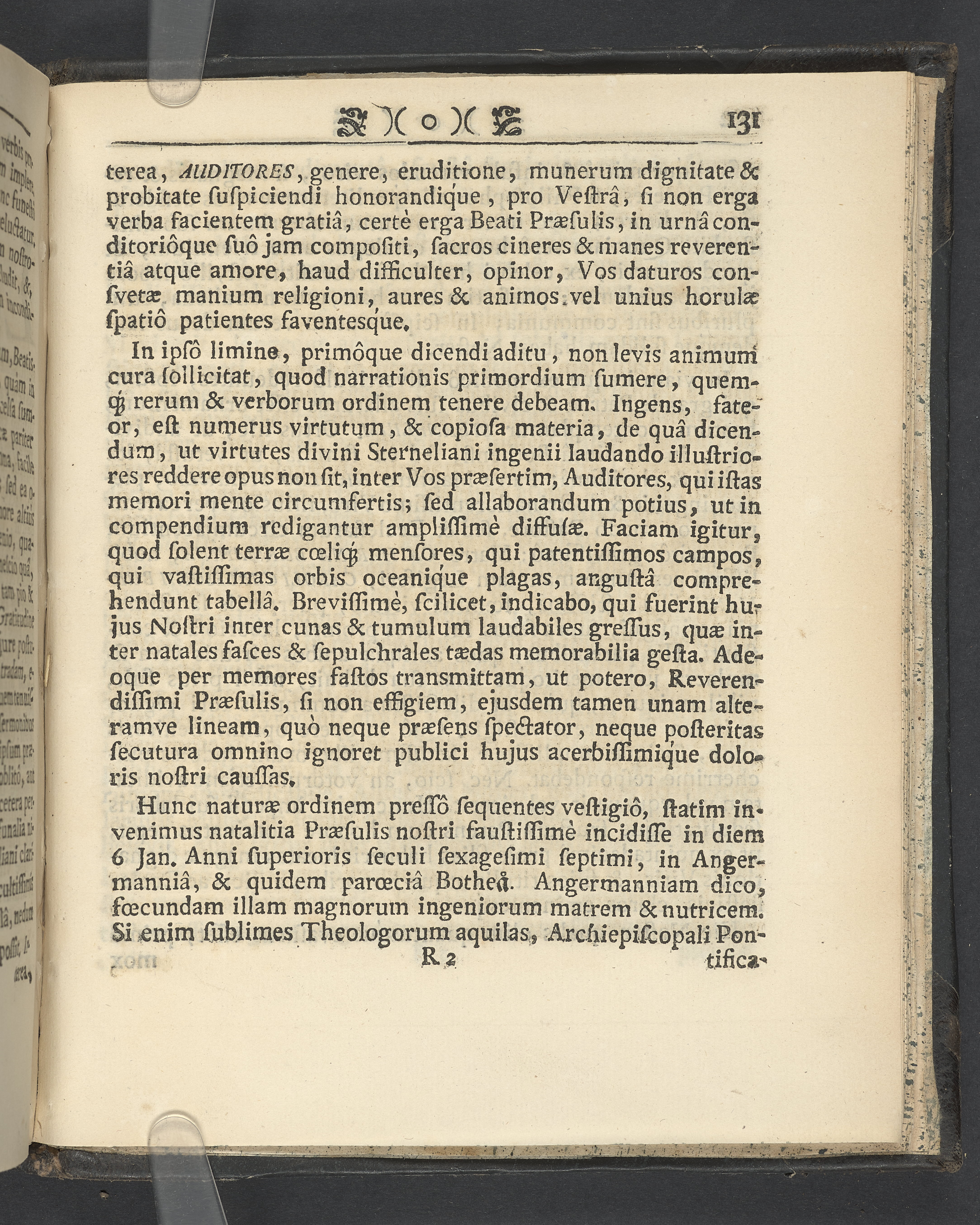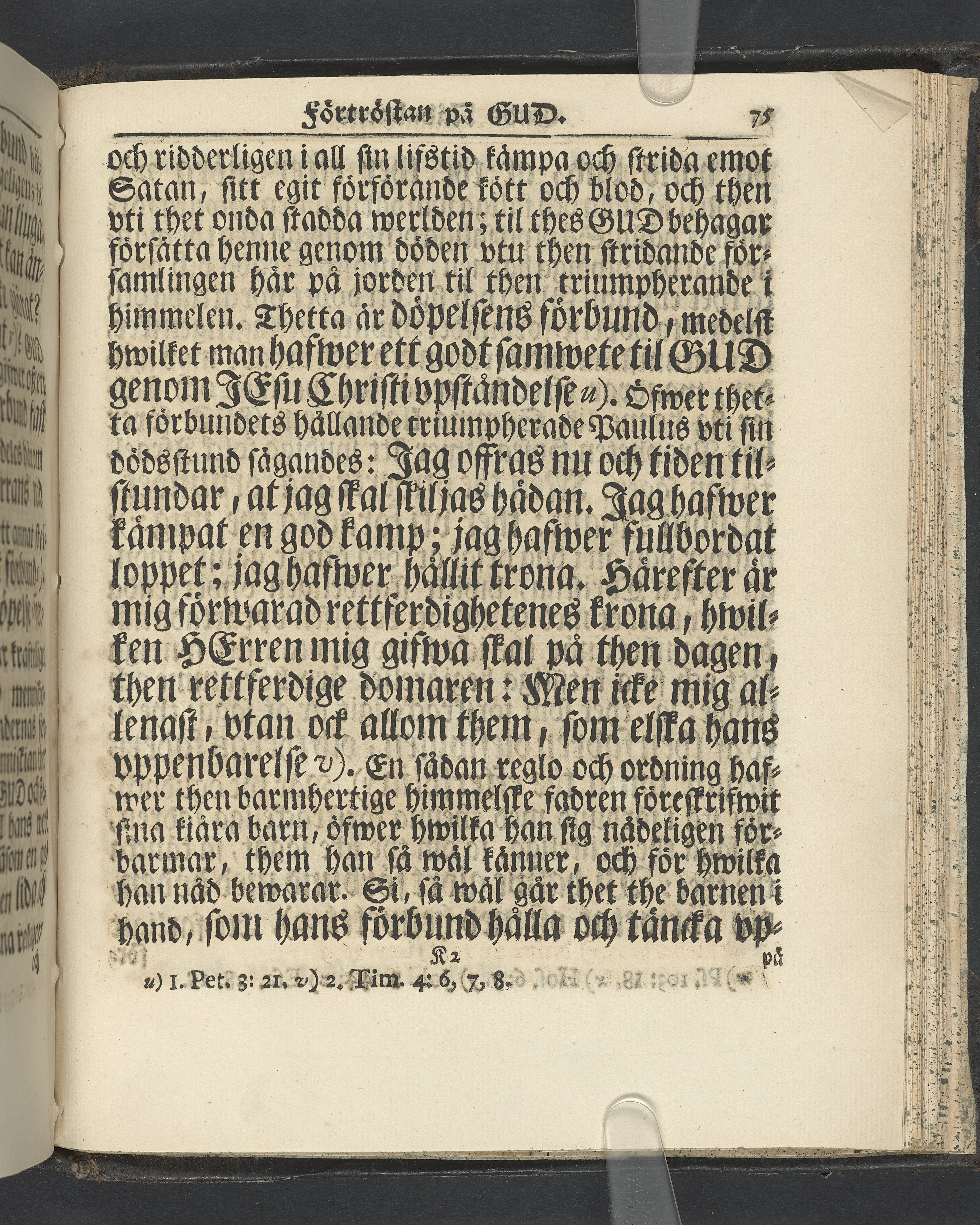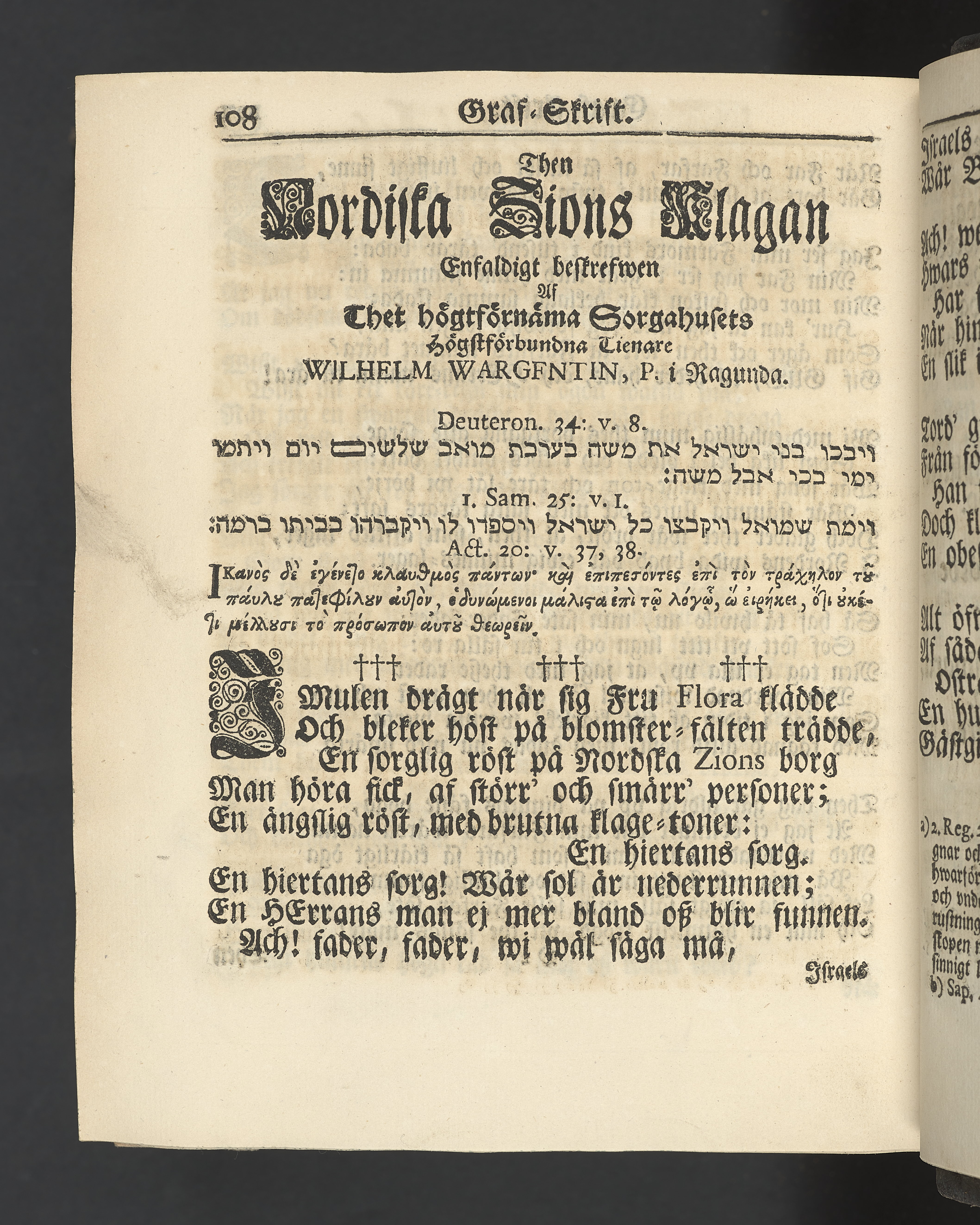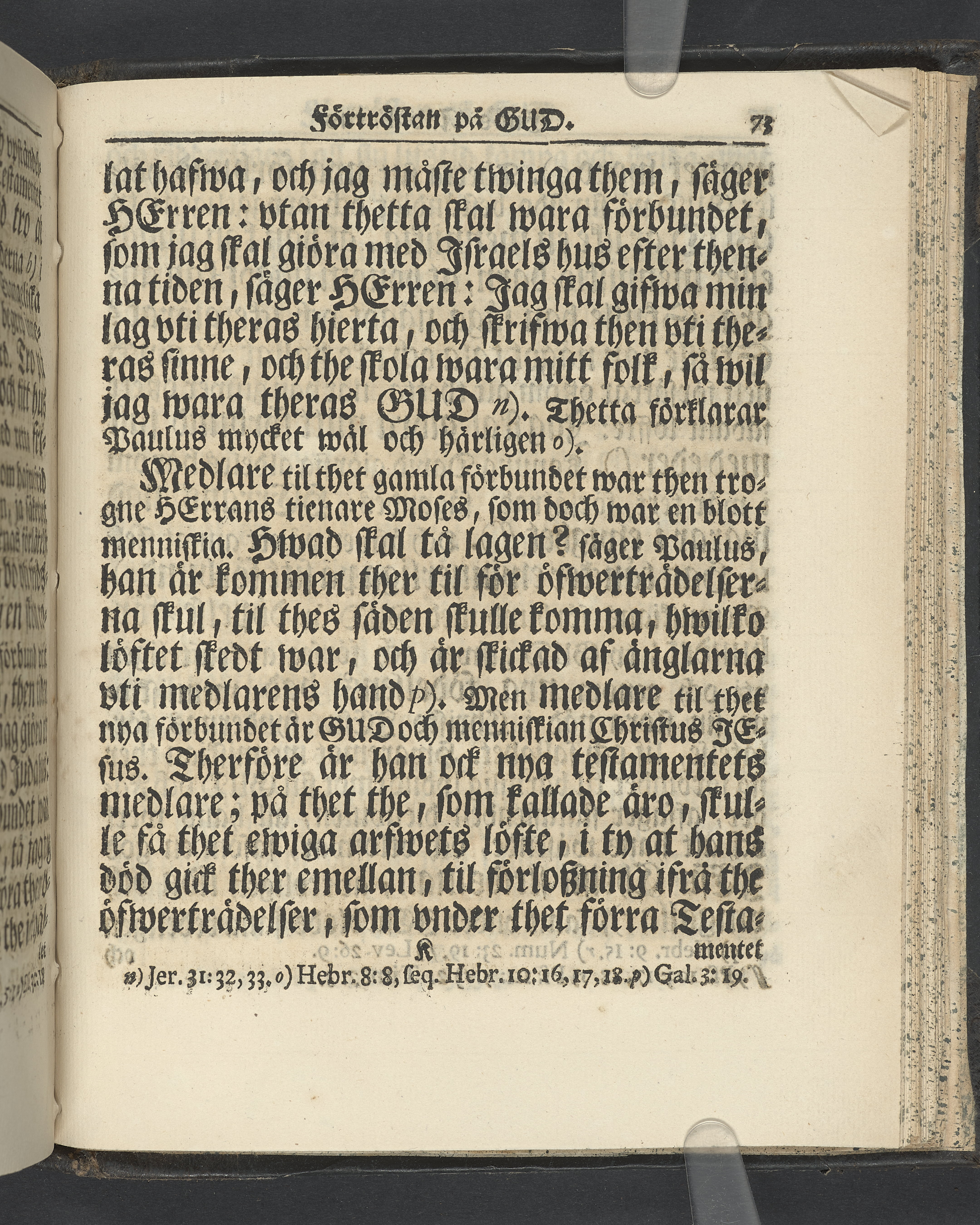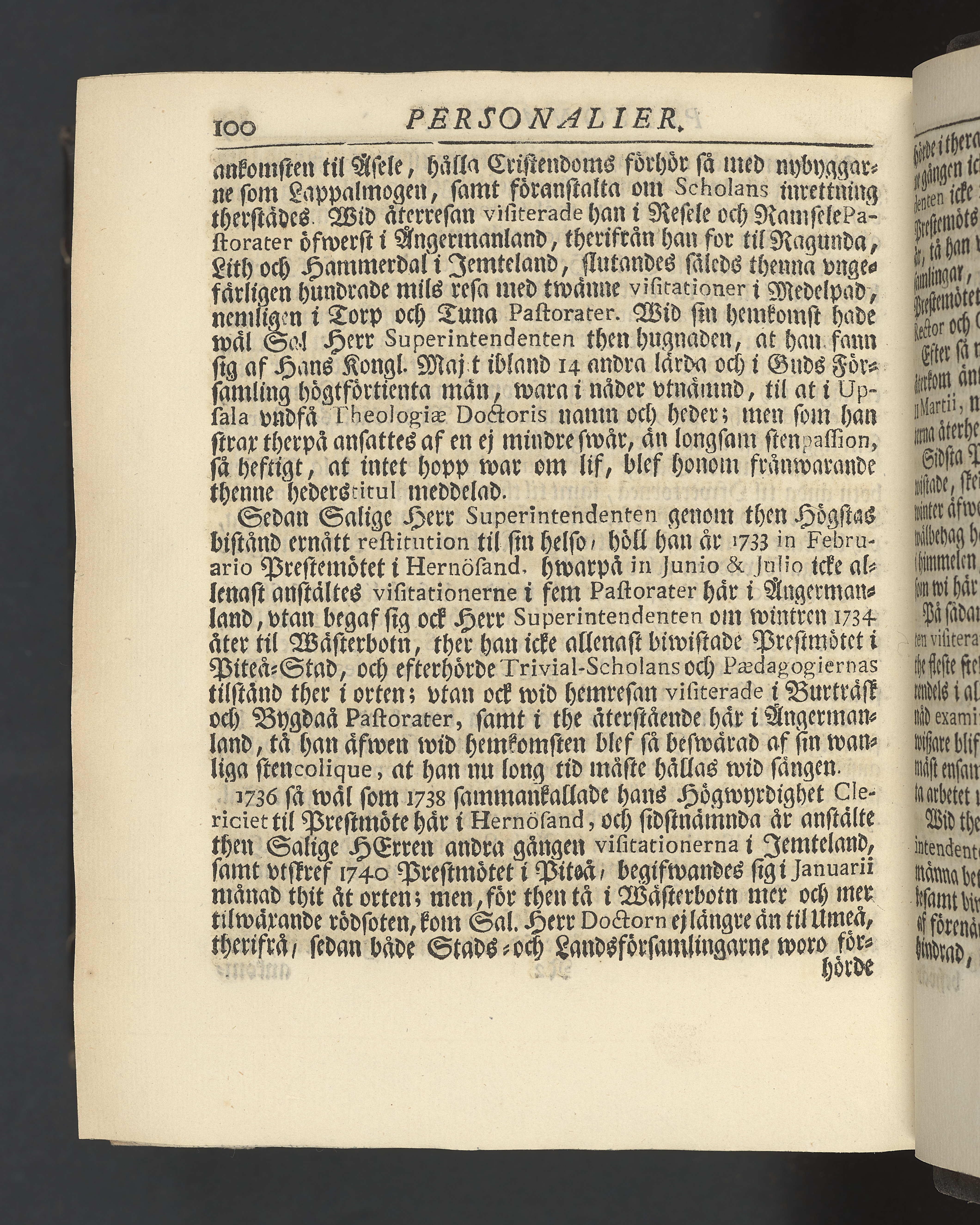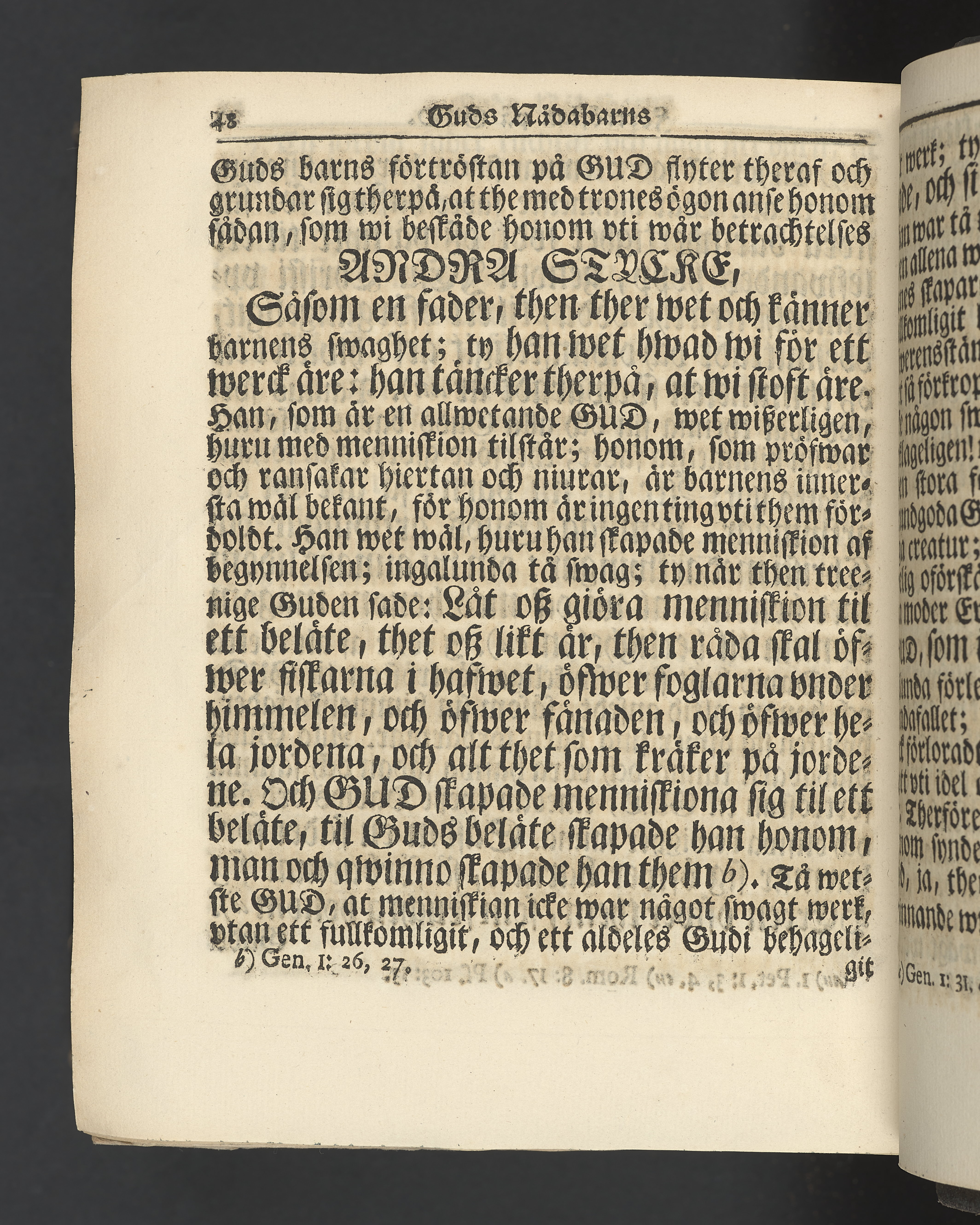 Graverat porträtt innan titelbladet, med bilden på verso. På recto ägaranteckning i svart bläck "Johan Petter Strandberg 1748", i överkant till vänster (delvis avskuret) "155", samt i högra hörnet "22". Nedanför ägaranteckningen en anteckning av Carl Gustaf Bielke med uppgift om inköp på auktion. Snitt stänkta i rött och blått.
