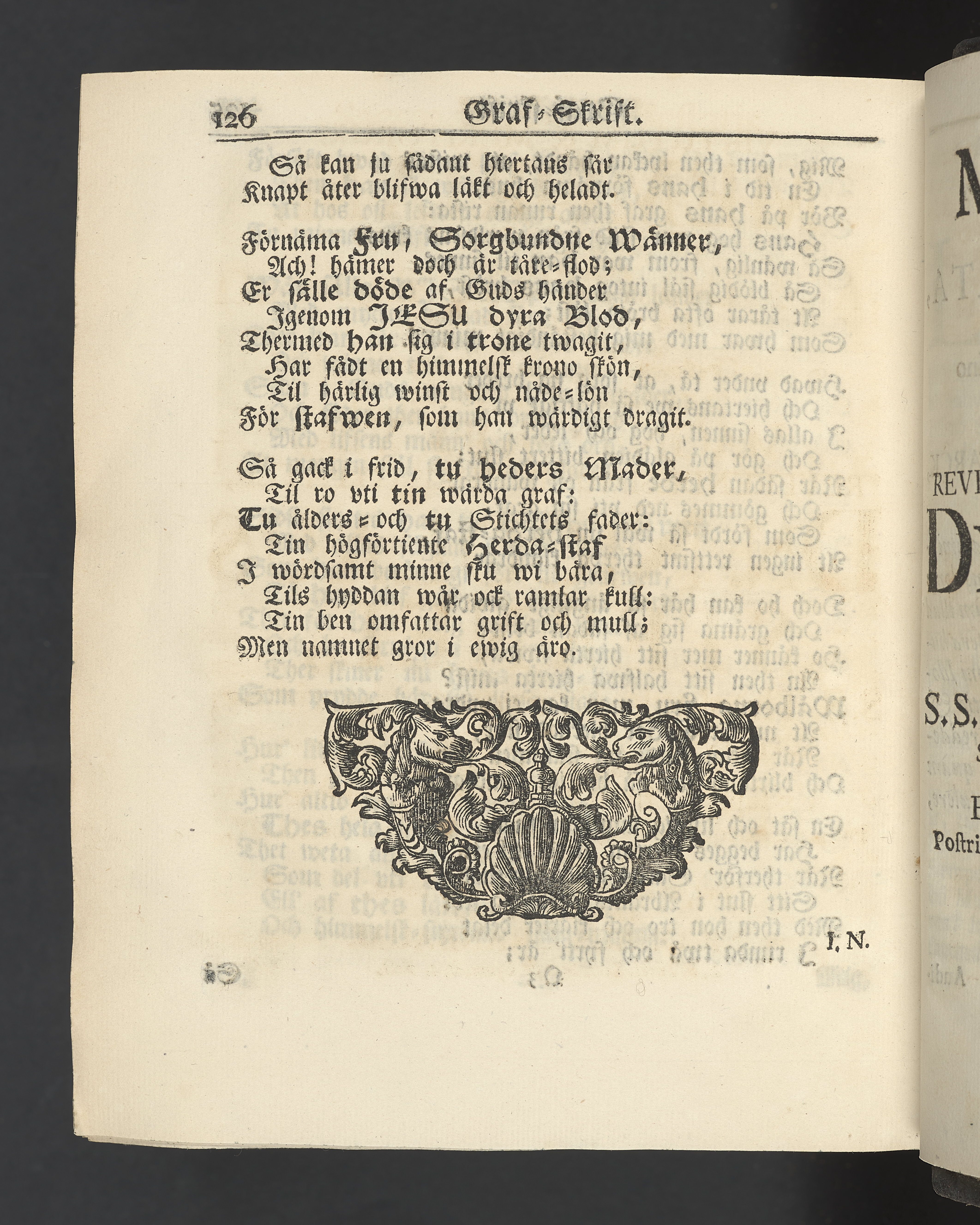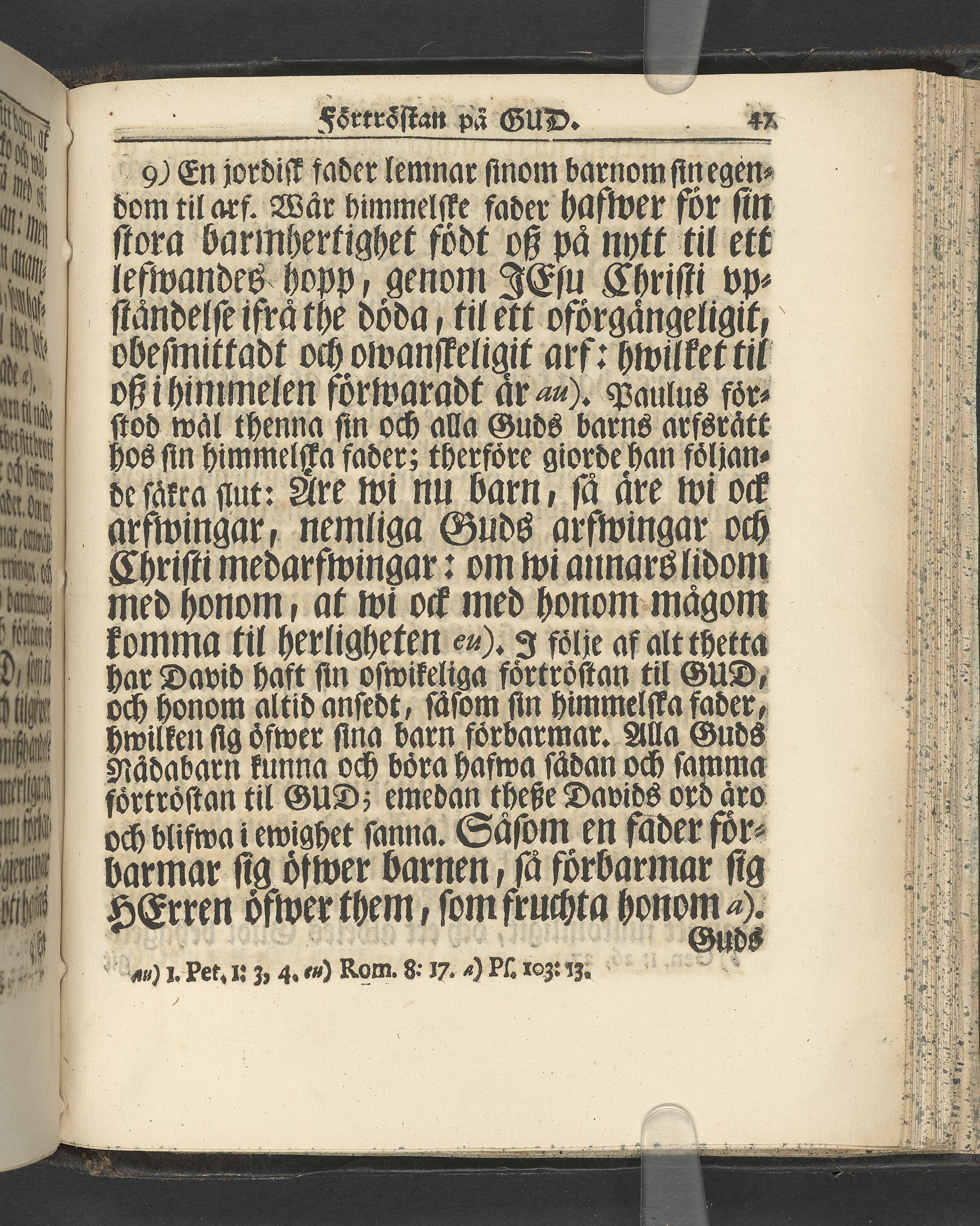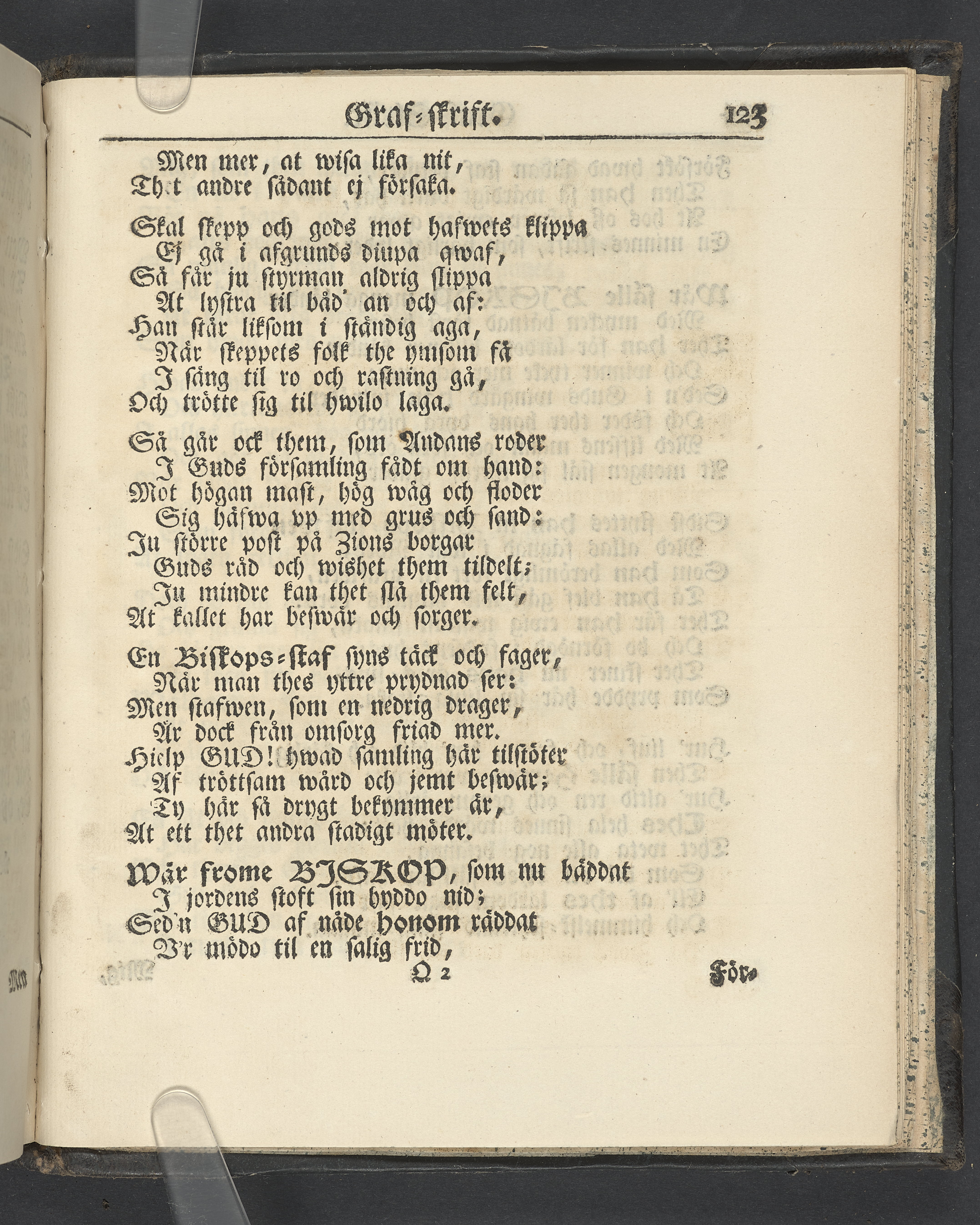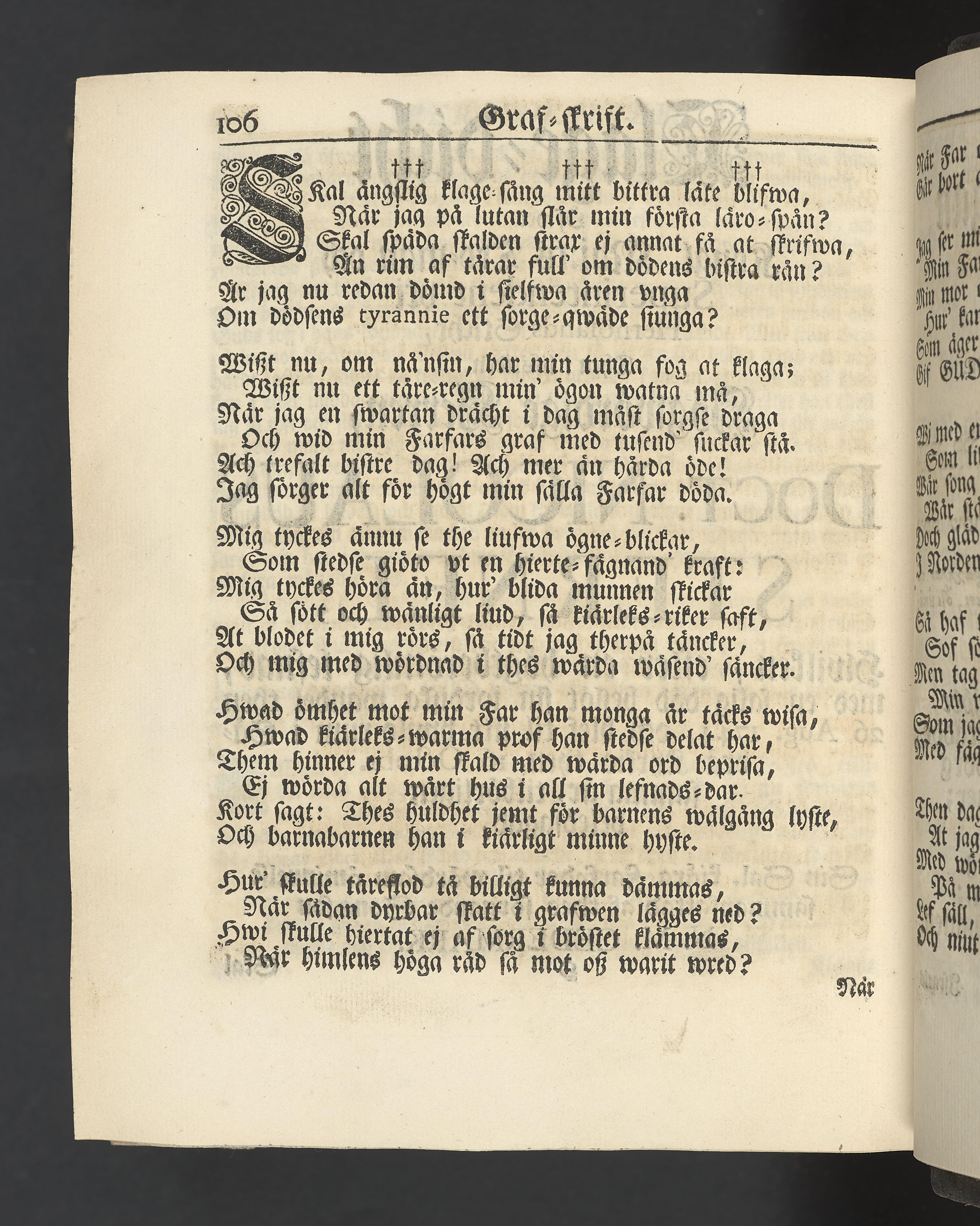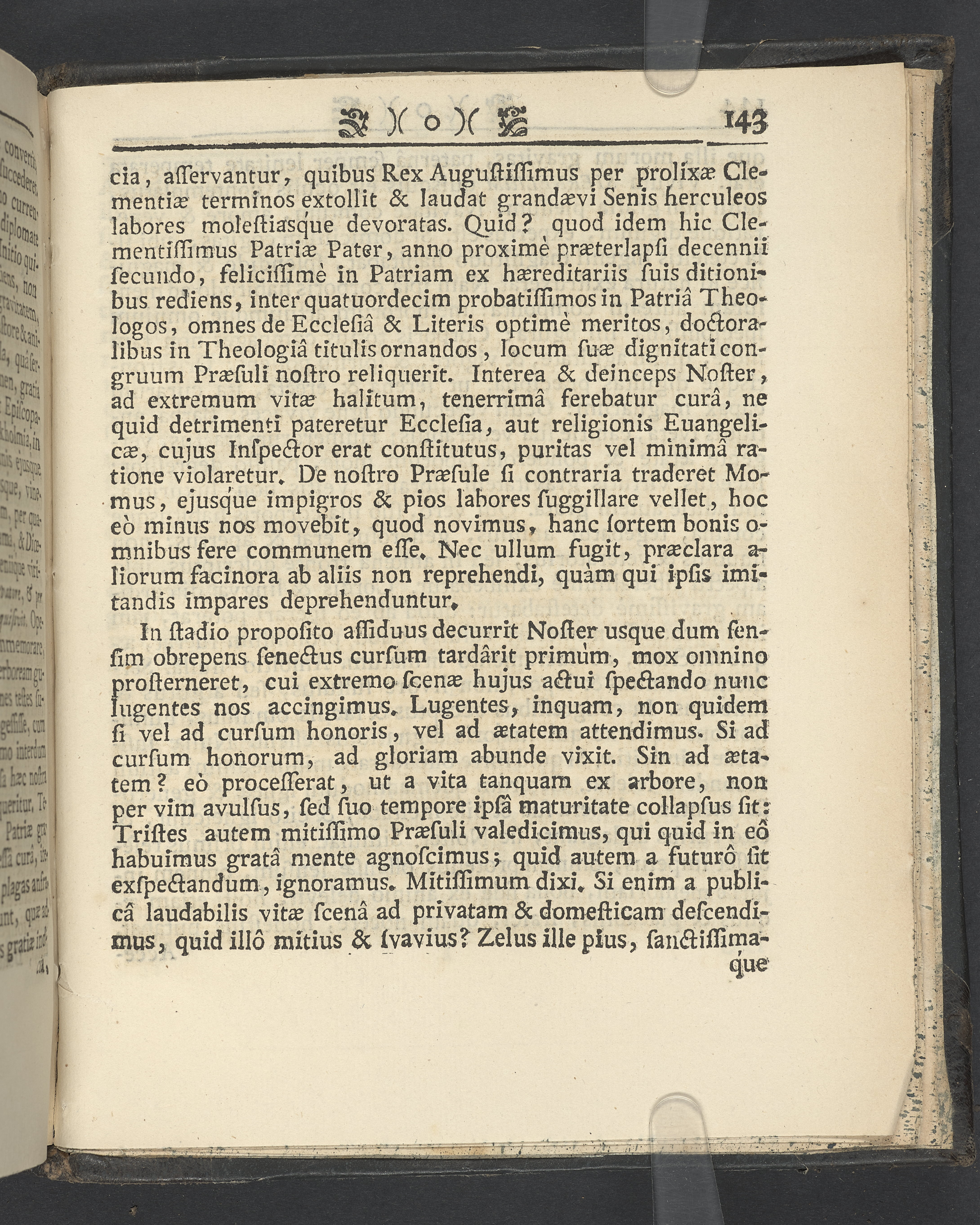 Graverat porträtt innan titelbladet, med bilden på verso. På recto ägaranteckning i svart bläck "Johan Petter Strandberg 1748", i överkant till vänster (delvis avskuret) "155", samt i högra hörnet "22". Nedanför ägaranteckningen en anteckning av Carl Gustaf Bielke med uppgift om inköp på auktion. Snitt stänkta i rött och blått.