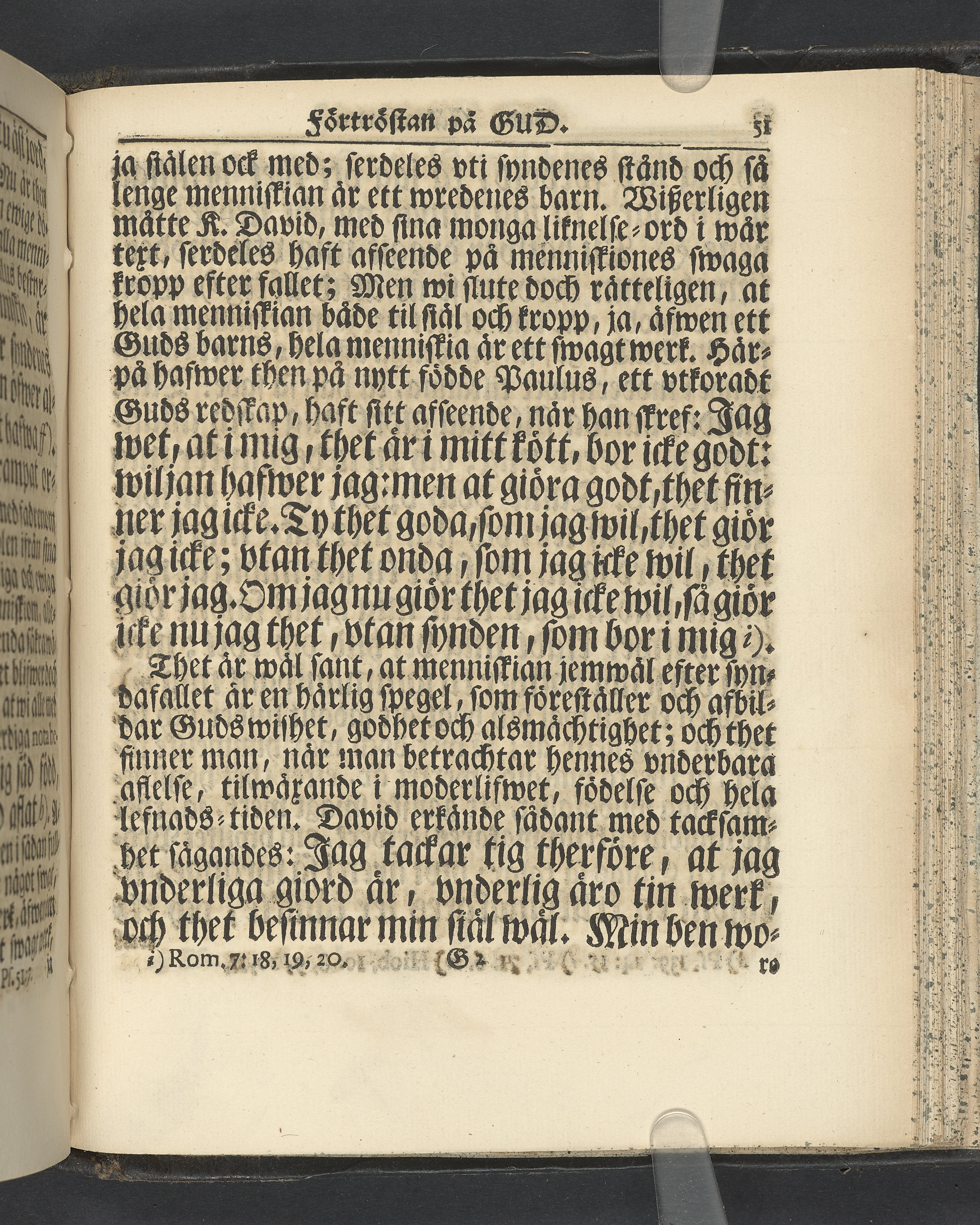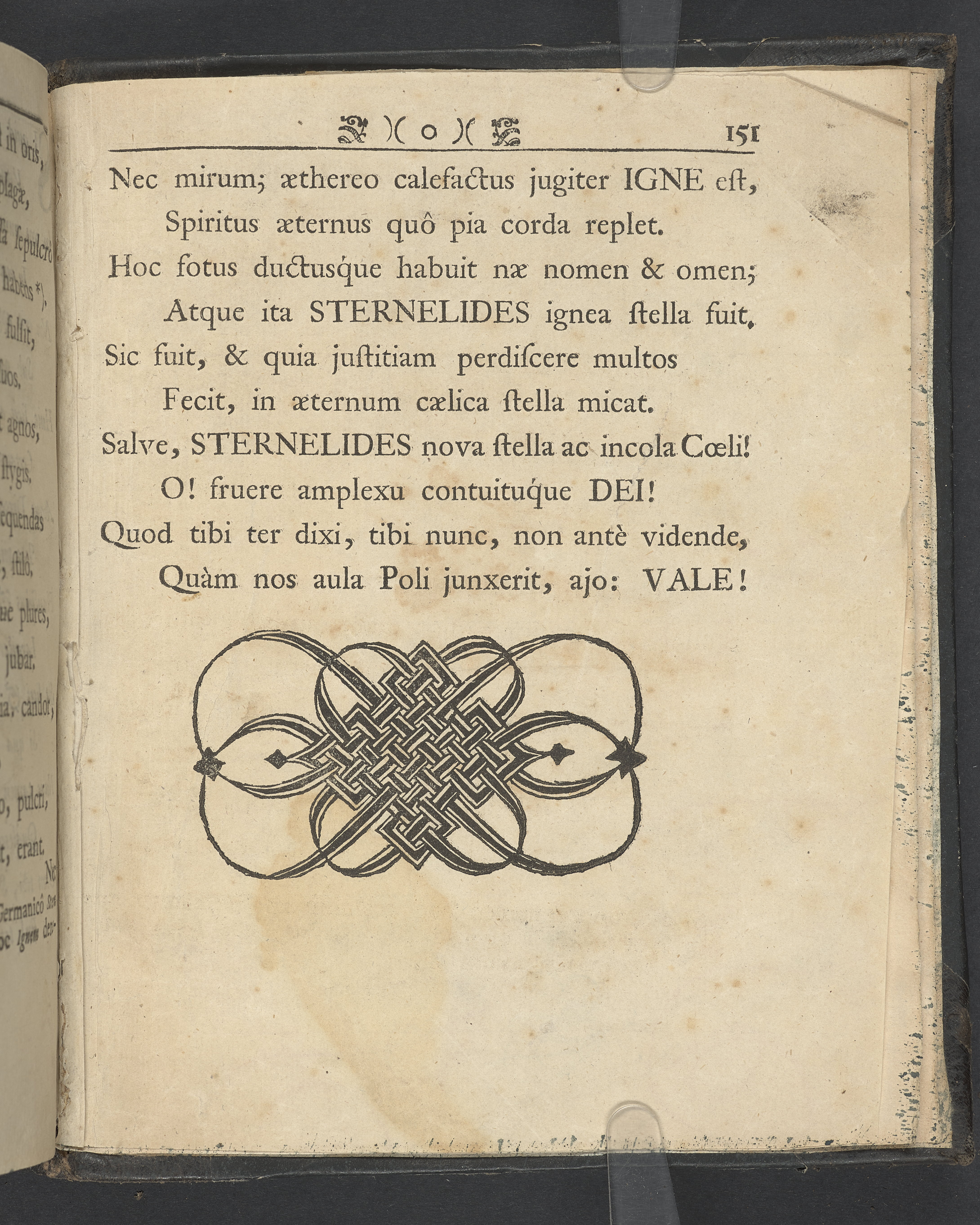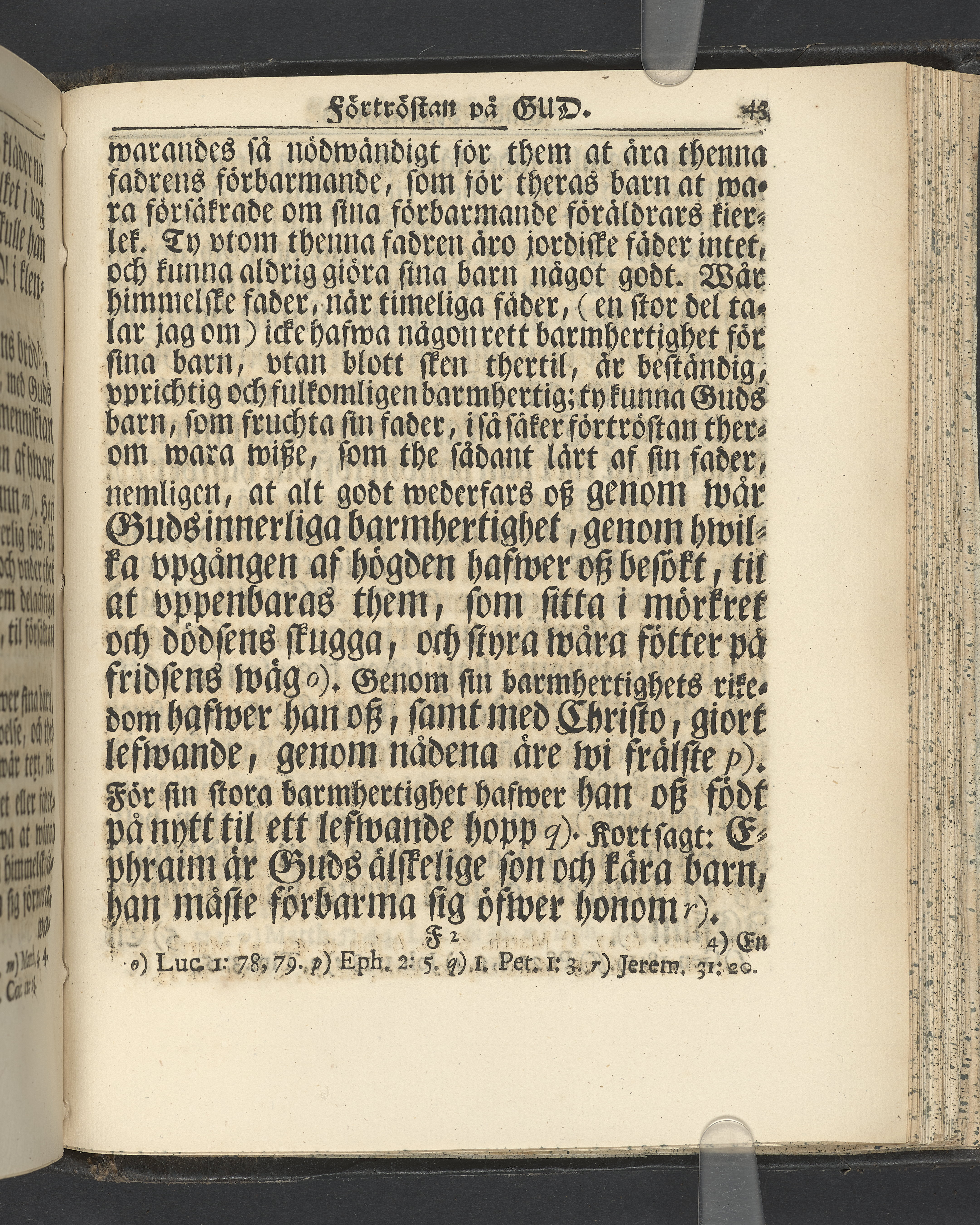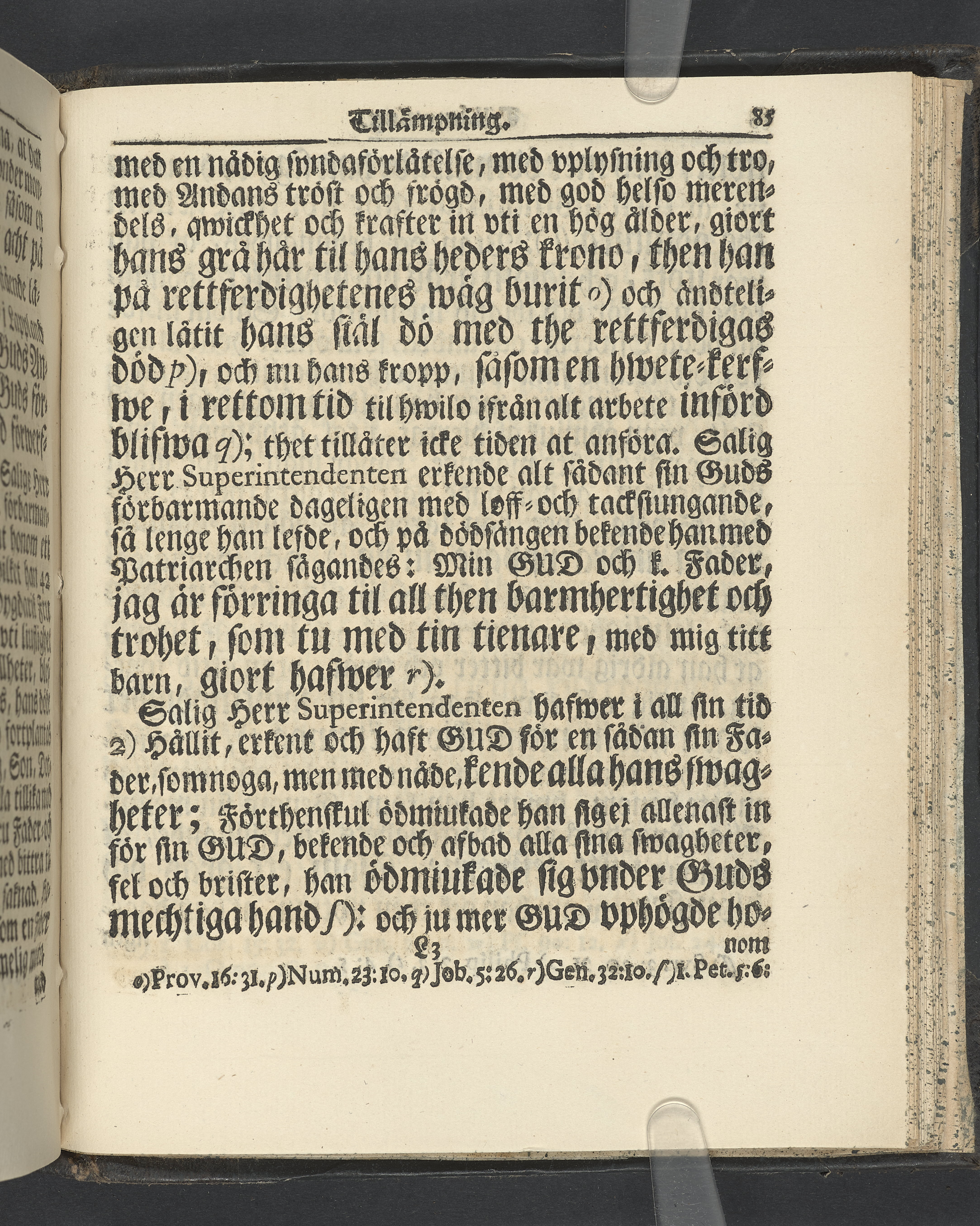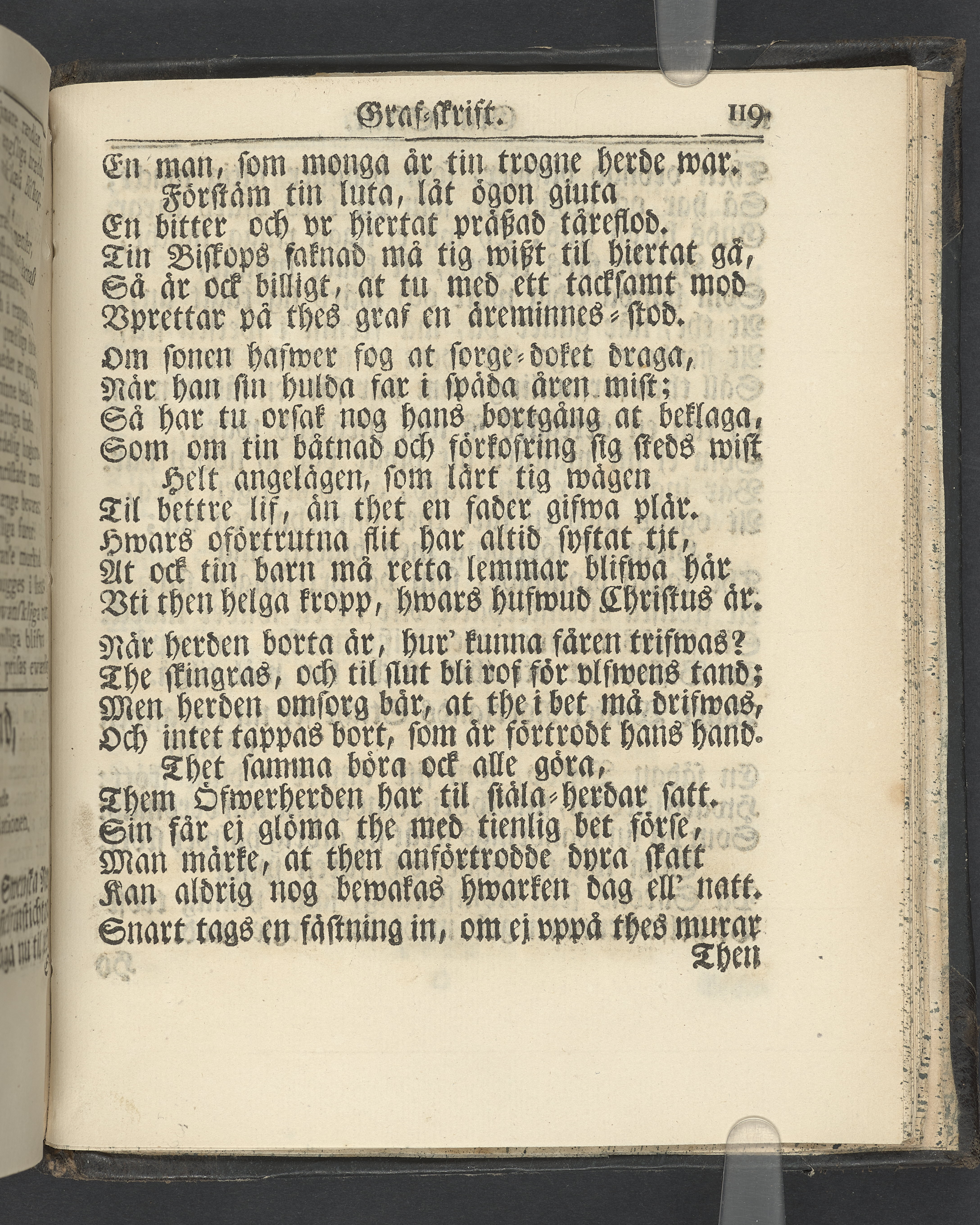 Graverat porträtt innan titelbladet, med bilden på verso. På recto ägaranteckning i svart bläck "Johan Petter Strandberg 1748", i överkant till vänster (delvis avskuret) "155", samt i högra hörnet "22". Nedanför ägaranteckningen en anteckning av Carl Gustaf Bielke med uppgift om inköp på auktion. Snitt stänkta i rött och blått.