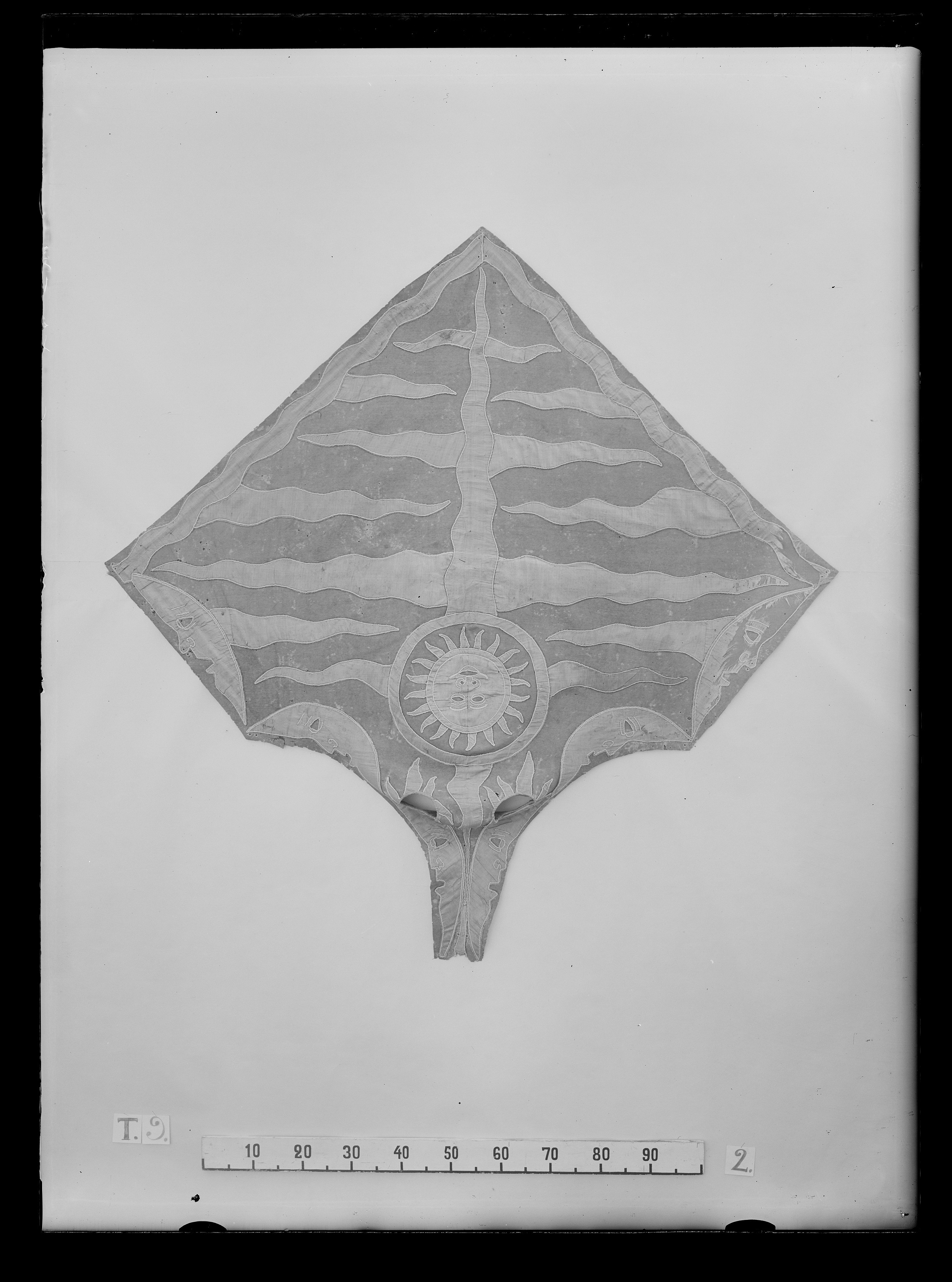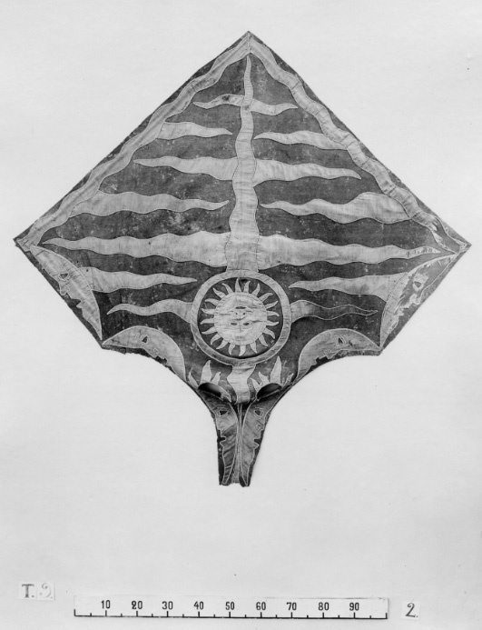 Bottentyget är rombiskt med 1000 mm långa sidor och de två övre har upptill konkavaurklipp i 550 mm och med ett största djup på 150 mm. Rött kläde med applikationer avljusblå taft med ljus 2 mm breda silkessnoddar i kanterna, och som konturer avansiktsdetaljer. En bildad sol, med diameter på ca 300 mm, 750 mm från nedre hörnet, alldeles ovanförde två bredaste strålarnas korsmitt. Längs nedre sidorna ett 50 mm brett vågformatband. Längs övre sidorna sex bildade månar, tre på var sida med ansiktena vända utåt.Strålar utgående varannan från vågbandet och de nedersta månarna, varannan från pånedre halvan den lodräta strålen och på övre halvan från solen. Mindre strålarutgående från öronöppningarna, som är kantade med taft. I ytterkanterna längs de nedersta månarna genom bottentyget och fodret, sex parvisstigande hål ca 4 mm i diameter. Fyra likadana hål i övre och nedre hörnet. Foder av blått linne i tuskaft, skarvat längs mitten.