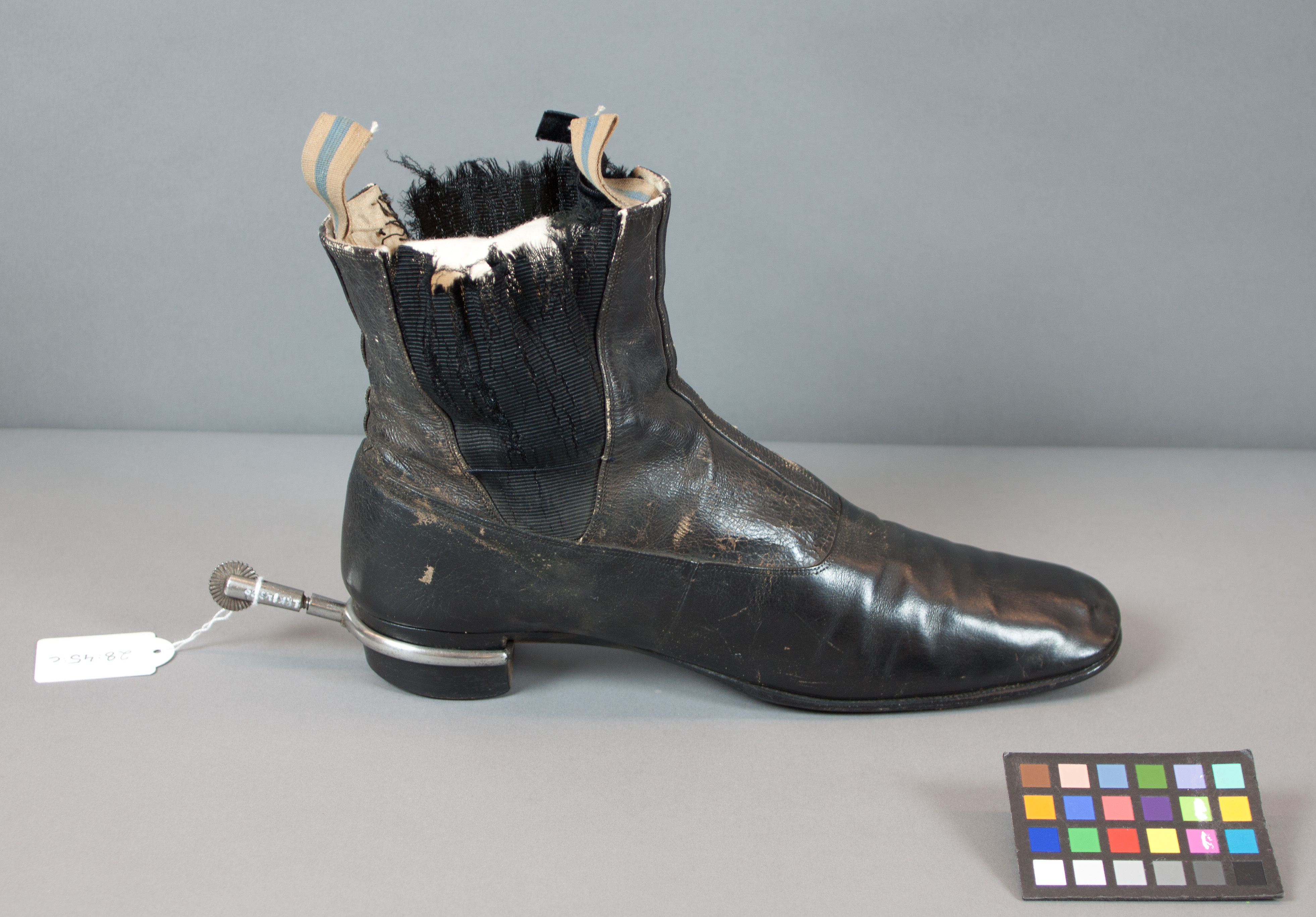 Smal resårkänga för högerfot, av svart lackskinn. Svart, helt förtorkad resår i sidorna med upptill på insidan längsgående sammetsband. I klacken ett hål för sporren. På sulan påmålat inventarienummer: "1358", ev. tillverkarnamn dold av långbyxornas hälla. Invändigt fodrad med vitt linnetyg och med fastsydd, ljusbrun innersula. I hälen ett sämskskinnsband. Upptill på skon är två blå-gula bandformiga tyghällor fastsydda med vilka skon är fastsydd vid dockan.