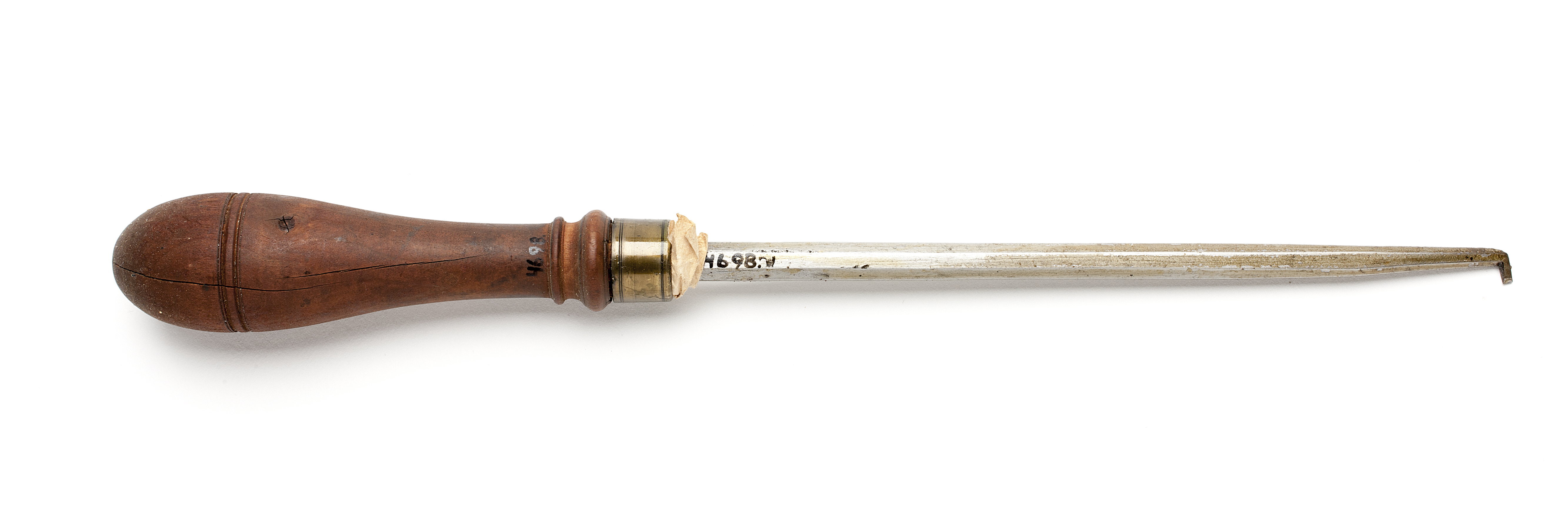 Klinga med åttsidig genomskärning. Änden böjd i rät vinkel mot klingan. Rak egg. Svarvat skaft av päronträ med två vulster nedtill ("skoklostertyp"). Mässingsring. Stämpel på skaftets ände vid fästet: "46"? med sifferstansar nr 5375.