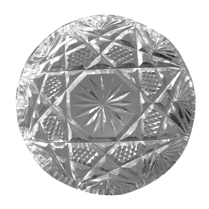 SMÖRASSIETTER, tolv stycken ( 1 dussin ). Tolv runda smörassietter med runduddad kant, av färglöst glas. Runda, med plan botten och uppvikt runduddad kant, uddarna med småuddad överkant. Dekor slipad. På utsidan på varje udd ett palmettliknande ornament av strålformigt ställda skär, på bottnen korsade skär, två och två med ändarna sammandragna till en spets mellan uddarna, skären bildande ett åttasidigt mittfält, vari en stjärnliknande rosett av strålformigt ställda skär, kring mittfältet små femsidiga fält i pyramidmönster, fälten bildade av de korsade skären. Mått: H: 1,3; D: 10 cm.