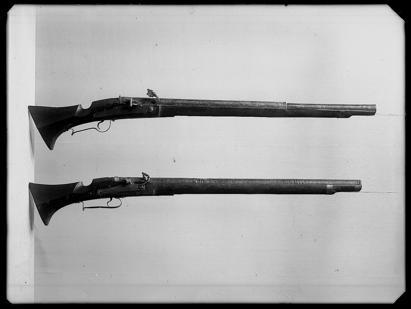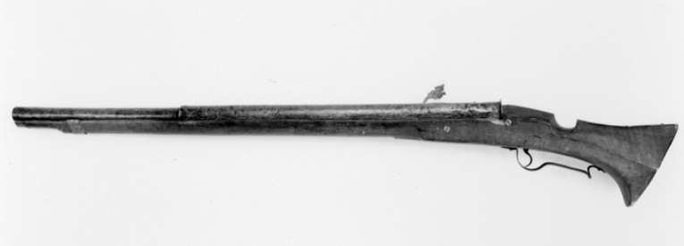 Rund, slätborrad pipa av koppar med svansskruv med tunn platta av något större diameter än pipans diameter, svansskruvbladet saknas. 693 mm av pipan är lindad med ståltråd,däröver ett tunnt hölja av kopparplåt, hela pipan är förtent. Fästning: Två häften, urspr. fyra. Pipan är fäst med två pipstift av trä. Luntlås med hävstångsmekanism, plant låsbleck, l: 267 mm, med rundad ändar. Kantig fängpanna, vid en skruv i ena hörnet en krutskärm med konturerad överkant och ett vridbart fängpannelock med graverade, parallella linjer, svagt nedåtböjd, kägelformigt fingergrepp. Låsbleckets bredare överkant graverad med linjer. Böjd hane med rund kropp, tre filade hack. Drakformig luntklämma, punsad dekor, klämskruv med c-formigt huvud. Fästning: Två låsskruvar. C-formig avtryckare. Rektangulärt avtryckarbleck. Brun helstock, muskötkolv med nedskuret tumläge, öppen laddstocksränna med nötta kanter. Beslag av stål. Bakplåt med smal tunga, rörka i form av stålband runt framstocken, näsband av stål. Utdragen och framtill nedsvängd varbygel med korta, spetsiga armar, omvänt c-formig, bakre stolpe.
