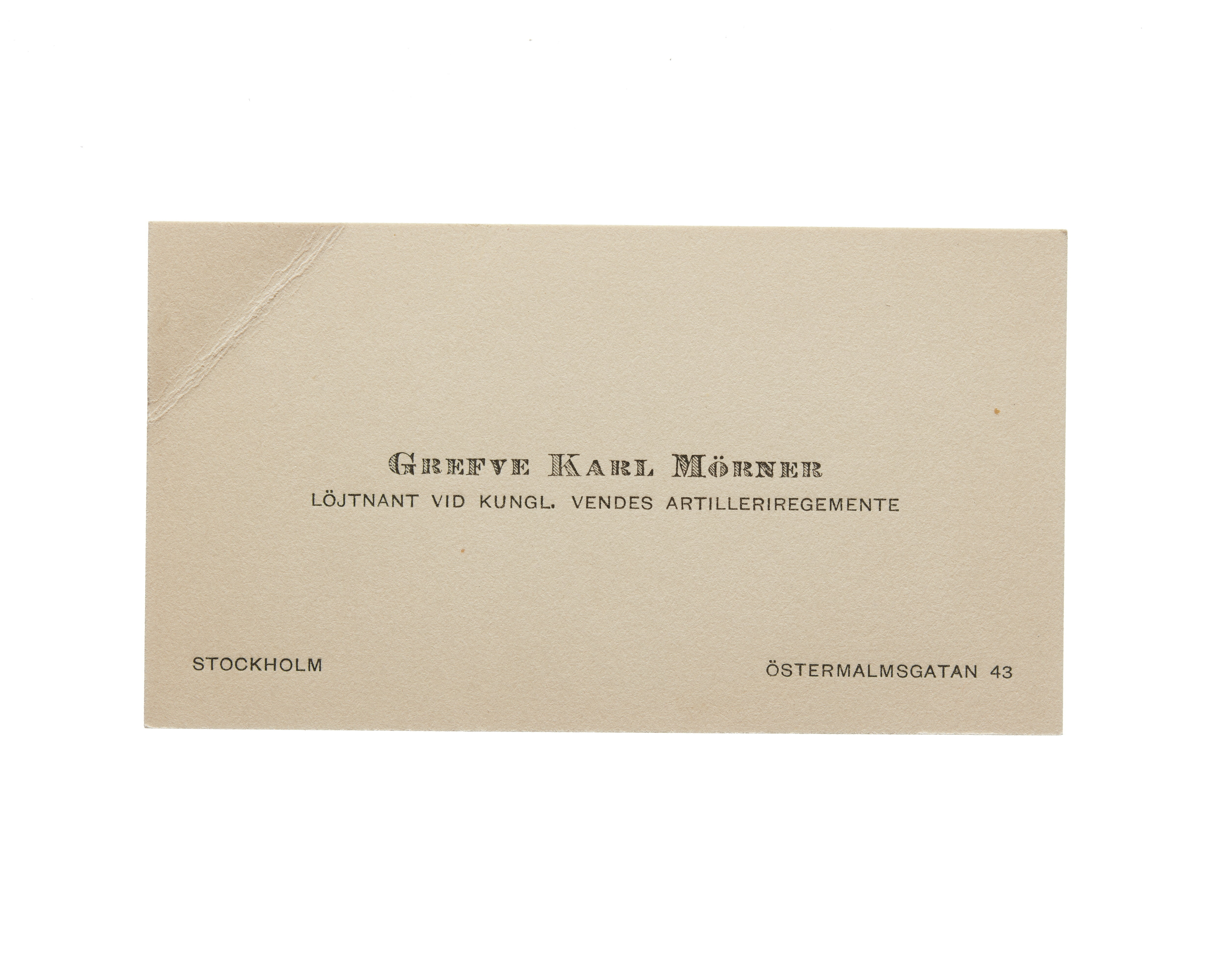 Två visitkort från greve Karl Mörner, Löjtnant vid Kungl. Wendes artilleriregemente. Första kortet daterat 1917, vikt i övre vänstra hörnet. Adress (nedre vänstra hörnet) Stockholm, (nedre högra hörnet) Östermalmsgatan 43. Andra kortet daterat 1918, vikt i övre vänstra hörnet.