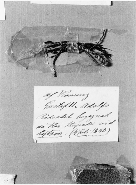 Trådar av vinrött silke, tvinnad metalltråd (guld och silver) samt ylle. Klistrade på tavlan, ursprungligen bakom cellofan. Därnedanför pappersetikett med bläckpåskrift: "af Konung // Gustaf II Adolfs // Ridsadel begagnad // då Han stupade vid // Lytzen. (4 juli 1840)".