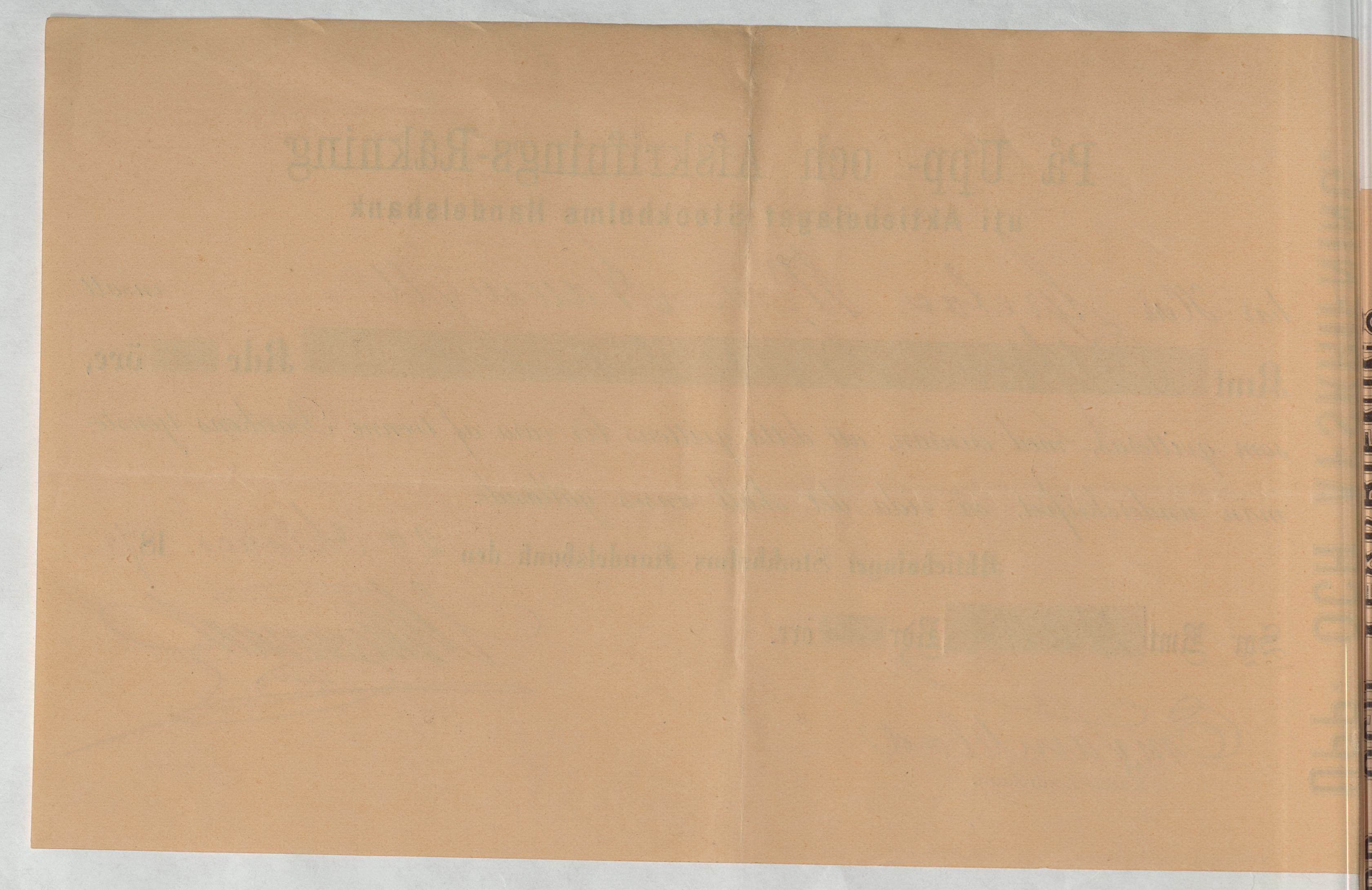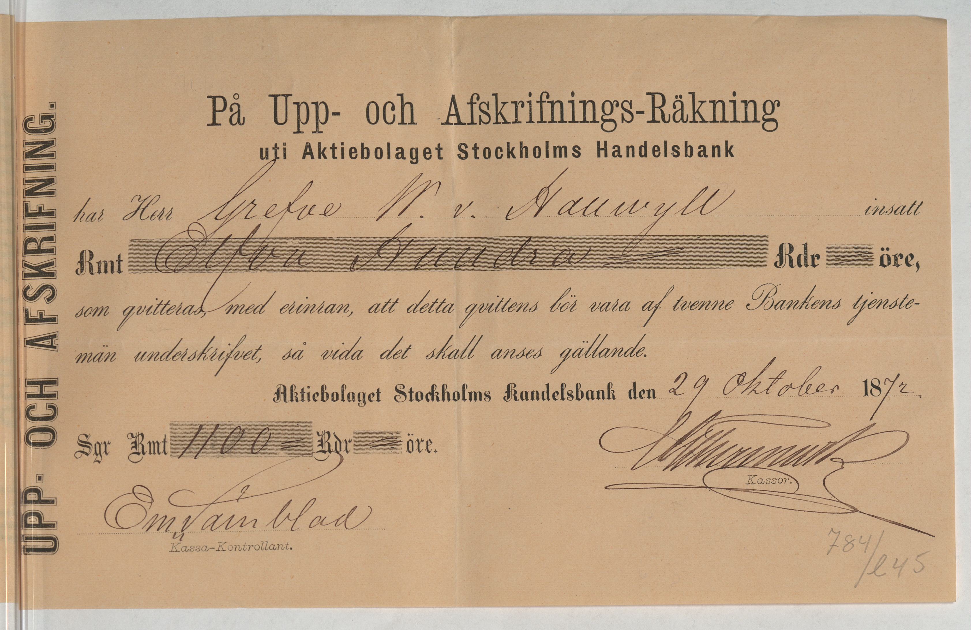 Kvitto från Aktiebolaget Stockholms Handelsbank rörande Upp- och Afskrifnings-Räkning