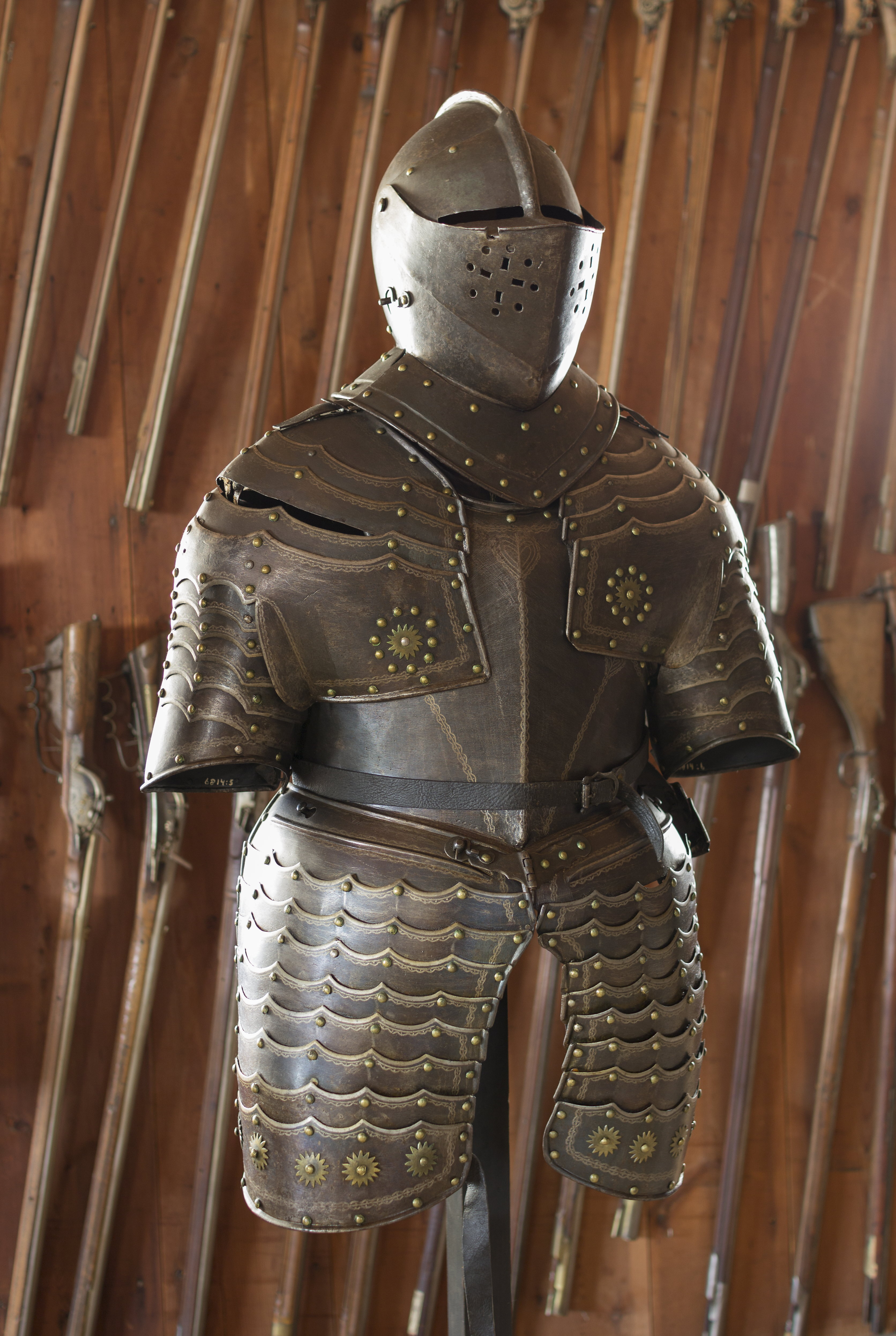 Samtliga delar är märkta med inslaget: VII. Rustningen är av blånerat stål med nitar av mässing. Monterad på stativ inventarienummer 6782. Jämför med inventarienummer: 6809-6816 samt 14892-14893 och 14847:3 (Brahe-Bielke). Lamellernas överkanter är vågprofilerade och blankpolerade, samt har bårder av graverade uddar och flätband - framträder blanka. Bestående av: Bröstharnesk 6814:1 Ryggharnesk 6814:2 Ringkrage 6814:3 Ländskört 6814:4 H. axelstycke 6814:5 V. axelstycke 6814:6 H. tassett 6814:7 V. tassett 6814:8 Hjälm 6815 6814:1 Bröstharnesk. Rundad halskant, lika kring armhålen. Bården kring armhål, hals och utmed den markerade mittåsen, vilken senare mot harneskets nederdel avslutas i liten utbuktning. Bårder även på vardera sidan om mittåsen - snett över sidorna. Mittlinjens överdel avslutas med hjärta. På bröstets vardera sida knopp av stål för fästande av ryggharneskets axelremmar. I nederkanten två knappar för påhakande av tassetterna. Helt, rött läderfoder. Höjd: 340 mm, bröstvidd: 530 mm. 6814:2 Ryggharnesk. Låg, rundad halskant, lika kring armhål. Graverad flätbandsdekor kring hals, vid mittlinje samt snett över sidorna. I vardera axeln fastnitad läderrem med stålbeslagen framände med två knapphål. I vardera sidan fastnitad läderrem - den vänstra med spänne - att spänna kring bröstharneskets midja. Höjd: 386 mm, ryggvidd: 520 mm. 6814:3 Ringkrage. Graverade flätband vid mittlinjen fram och bak. I vardera sidan läderrem att spänna fast i axelstyckenas spännen. Rött läderfoder. Höjd: 150 mm. 6814:4 Ländskört. Bestående av tre lameller. Den undre med fem mässingsstjärnor. Höjd: 140 mm, bredd: 580 mm. 6814:5 Höger axelstycke med överarmsskydd. Axelstycket består av fem lameller. Bröst- och skulderdel med mässingstjärna. Längd: 440 mm, diameter: 440 mm. 6814:6 Vänster axelstycke med överarmsskydd. Axelstycket består av fem lameller. Bröst- och skulderdel med mässingstjärna. Längd: 460 mm, diameter: 480 mm. 6814:7 Höger tassett. Bestående av 9 lameller. Den övre med stålögla för vänster tassetts spänne. Den undre lamellen med fem mässingstjärnor. På insidan av undre lamellen rem och spänne. Höjd: 380 mm, bredd: 350 mm. 6814:8 Vänster tassett. 9 lameller. Den övre med gångjärnsförsett spänne. Den undre med fem mässingstjärnor. På insidan av den undre lamellen finns det ett spänne. Höjd: 380 mm, bredd: 350 mm.