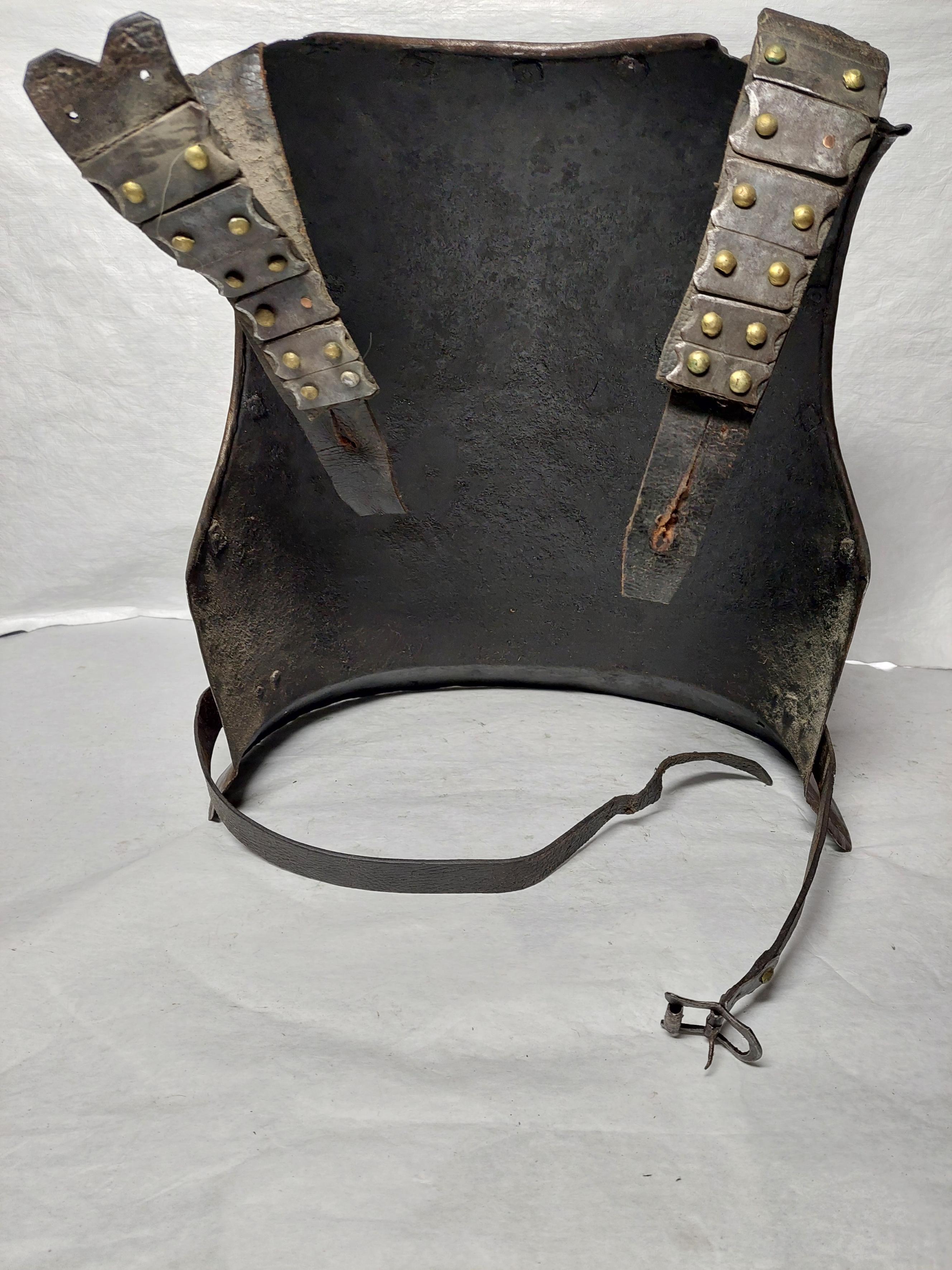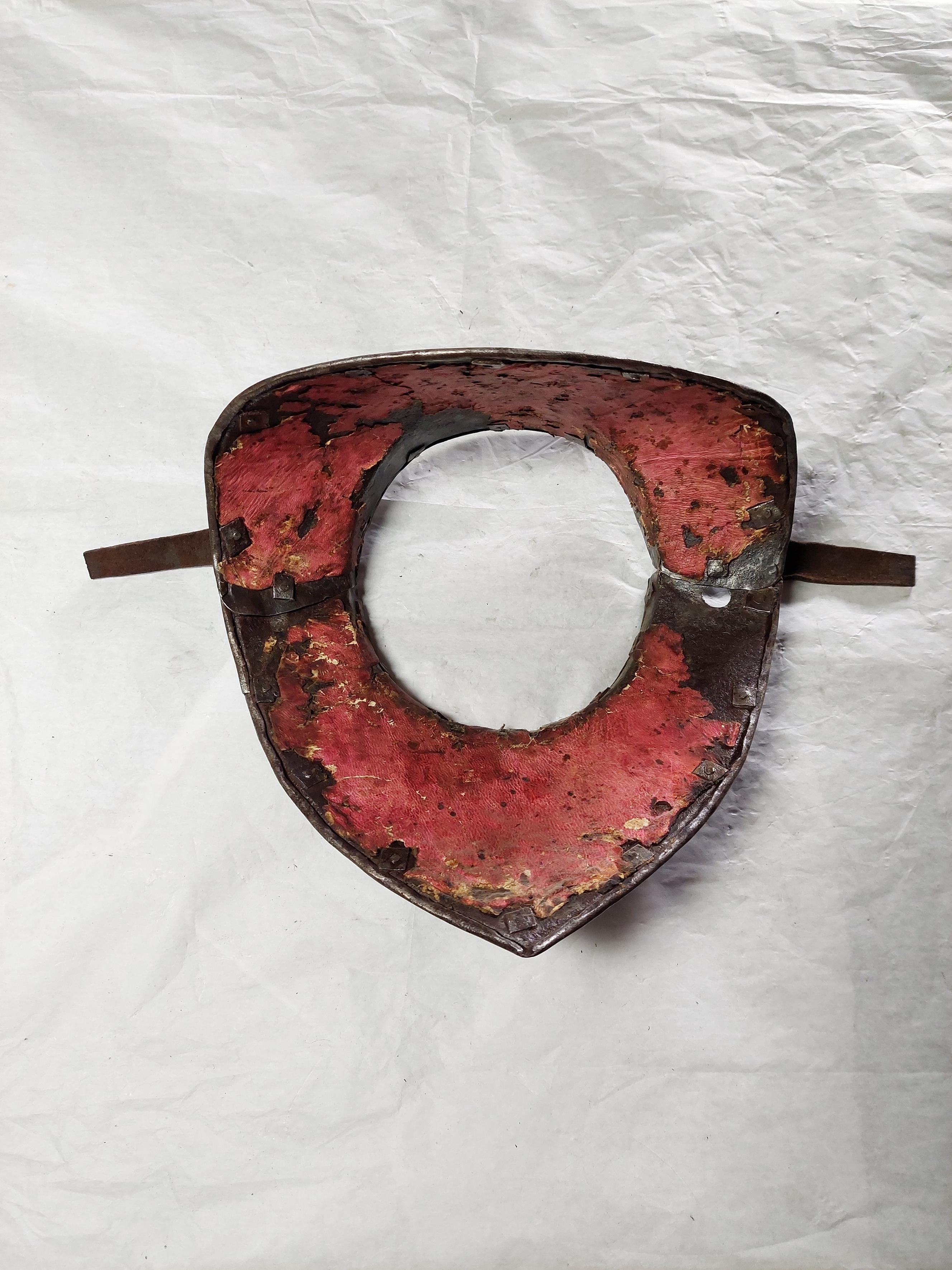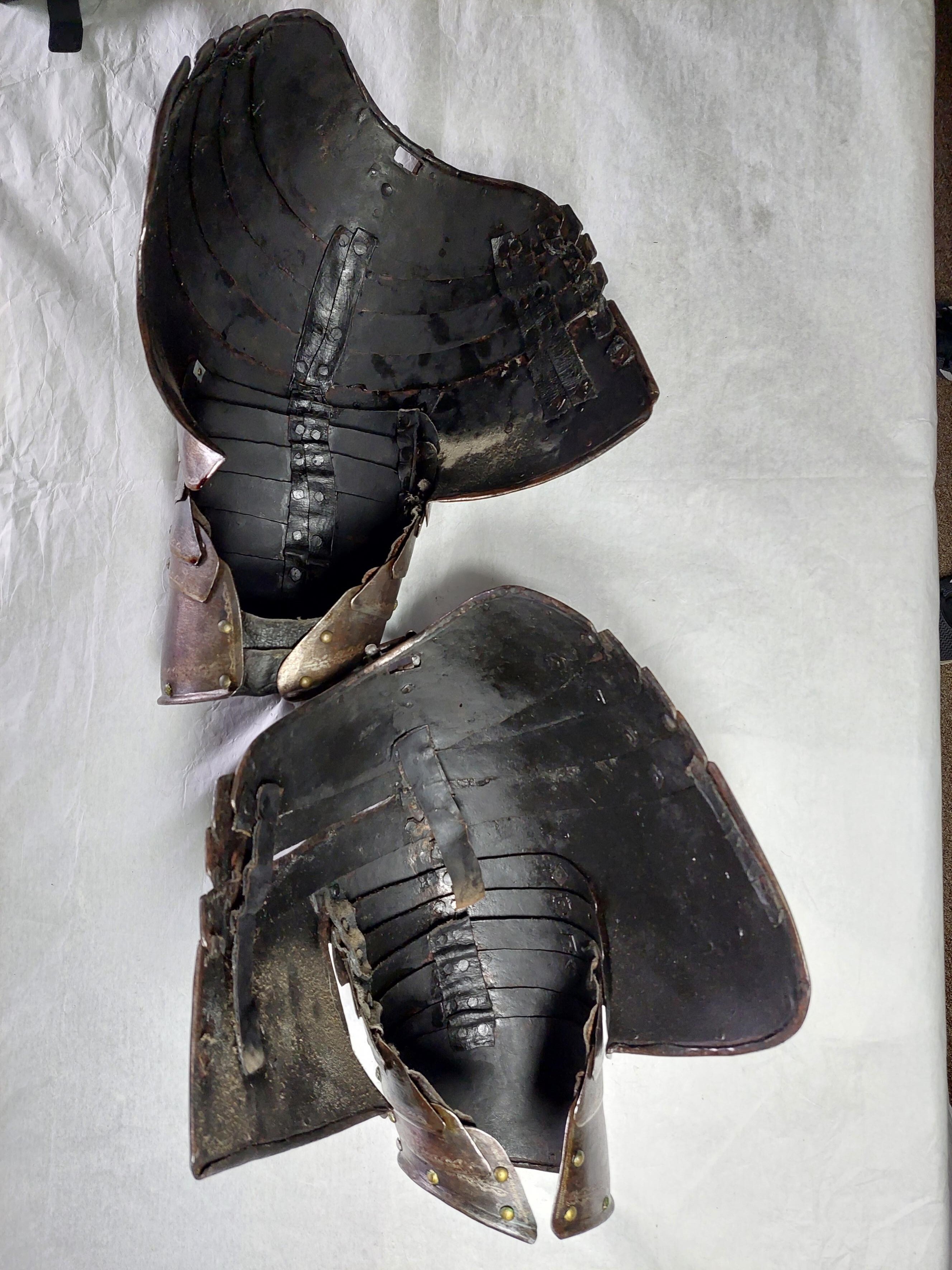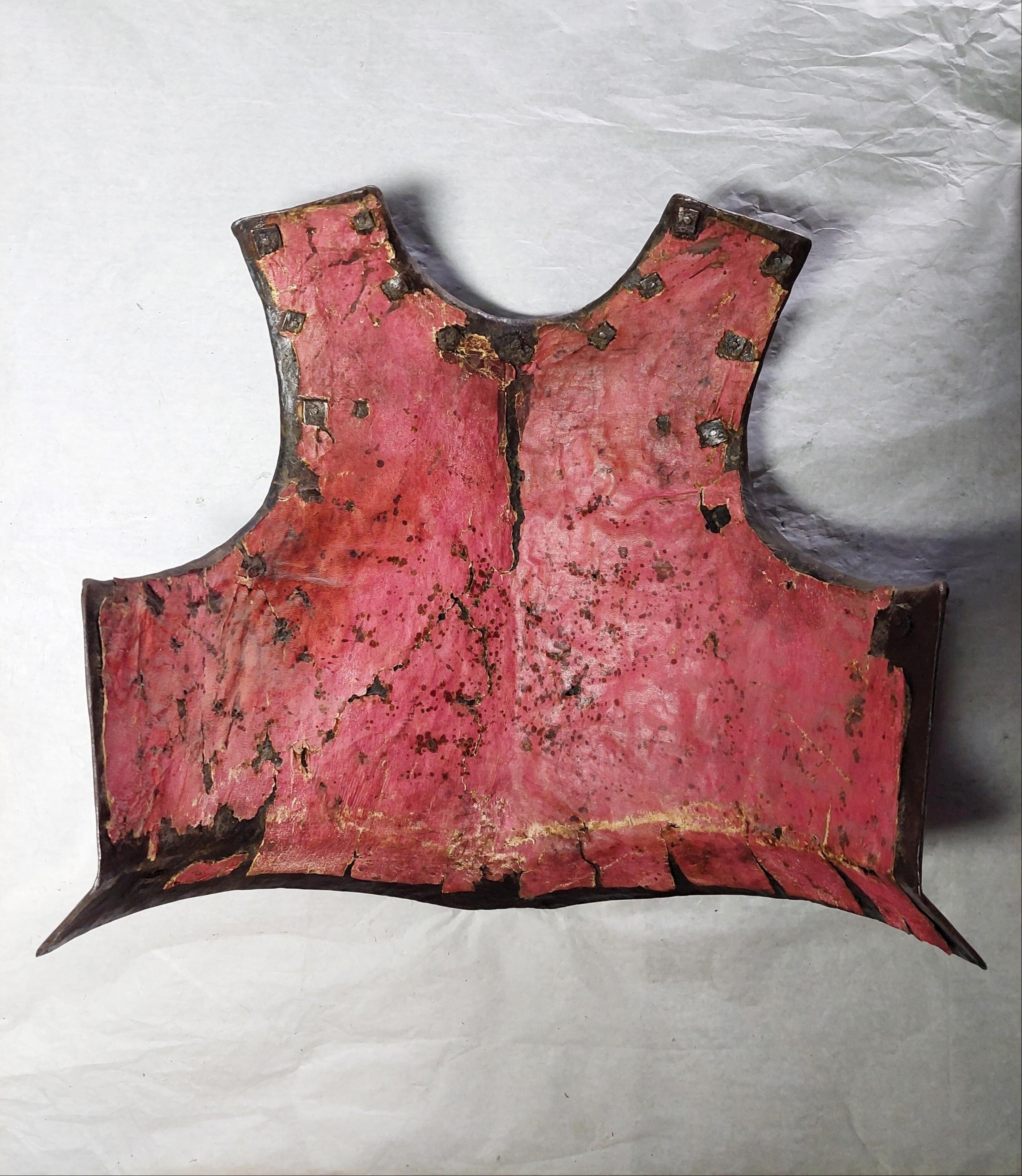 KOMPLETTERANDE BESKRIVNING Fältrustning för kavalleri av bättre kvalité. 6814:1 Bröstharnesk med i hals- och armringning utåt omvikta, rundsmidda kanter. Innanför dessa stålnitar med pålödda mässingsskållor. Dessa har sannolikt hållit läderfodret. Rött fastlimmat läderfoder. Igensatta hål på utviket mitt fram. Bröstplåten torde vara skottfri. 6814:2 Ryggharnesk med i hals- och armringning, samt nederkant som är inåt omvikta och rundsmidda . Innanför dessa (ej vid nederkanten) stålnitar med pålödda mässingsskållor. Insidan med senare svart bemålning. Axellädret är utbytt. Vid detta läder är sannolikt de ursprungliga lädret med plåtar fastnitat. 6814:3 Halskrage med inåt omvikta, rundsmidda ytterkanter. Längs dessa stålnitar med pålödda mässingsskållor. Remmarna vid axlarna är bytta. 6816:4 Ländskört med inåt omvikta, rundsmidda ytterkanter och stålnitar med pålödda mässingsskållor. De två nedersta lamellerna är skarvade mitt på. Insidan senare bemålad med svart färg. Spår av läder. Märkt med "VII". Kroken på vänster sida har inte fått plats vid låsning, därför har man slagit ett spår i åsen för kroken. 6814:5-6 Axelstycken med inåt omvikta, rundsmidda ytterkanter samt stålnitar med pålödda mässingsskållor. Insidan är senare svartmålad och större delen av lädret är bytt under 1900-talet, då maskingjorda nitar har använts. Man har däremot återanvänt äldre nitar också. Höger axelstycke märkt med sex stycken streck och vänster är märkt med "IIV": 6814:7-8 Tassetter med inåt omvikta, rundsmidda ytterkanter. Stålnitar med pålödda mässingsskållor. Lamellerna nitade i varnade i avlånga hål i ytterkant men på remmar i mitten och i innerkant. Delar av lädret bytt. Vänster tassett med vinklat gångjärn och krok. Delarna har senare svart bemålning på insidan.