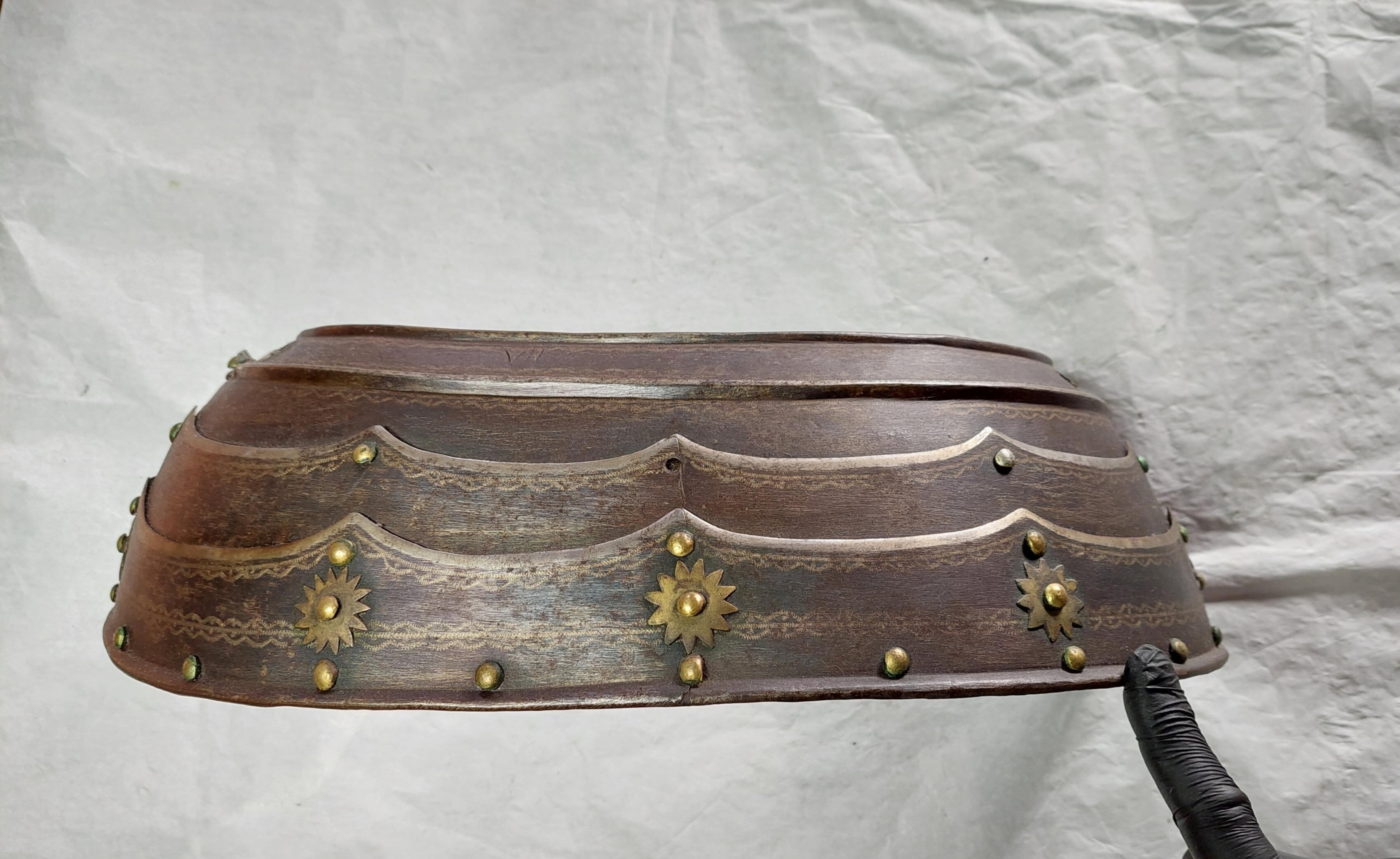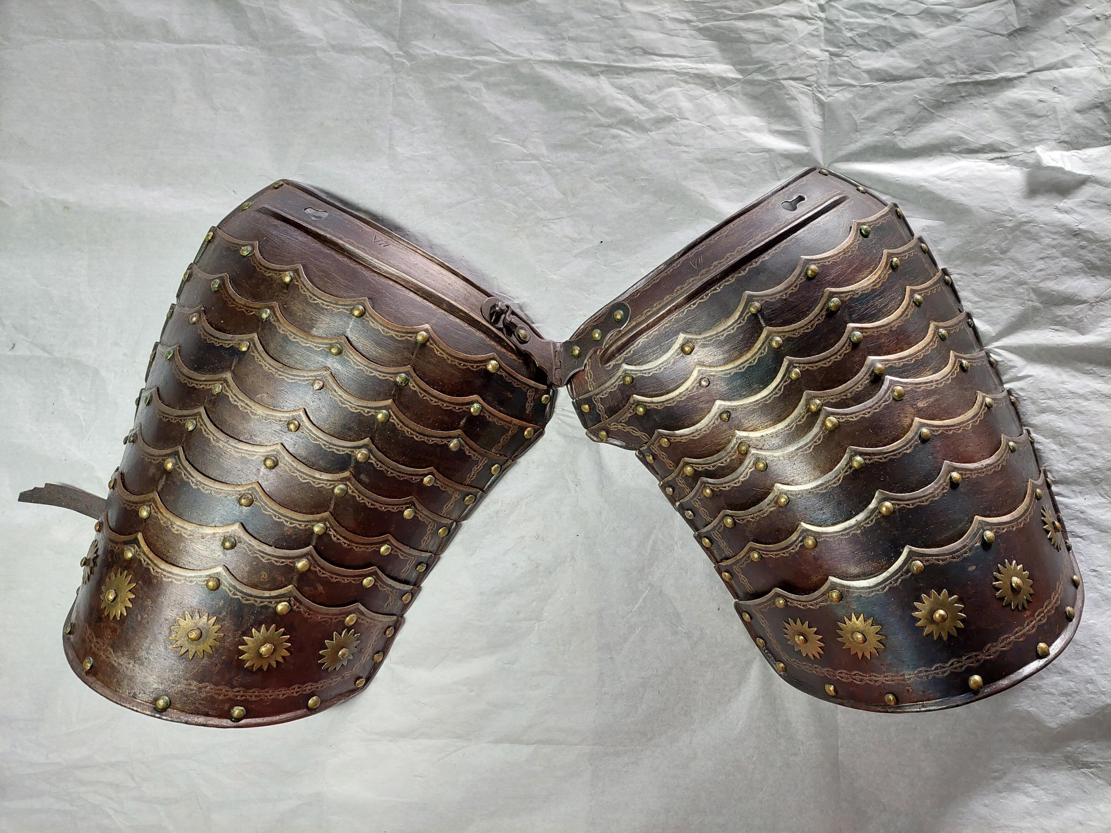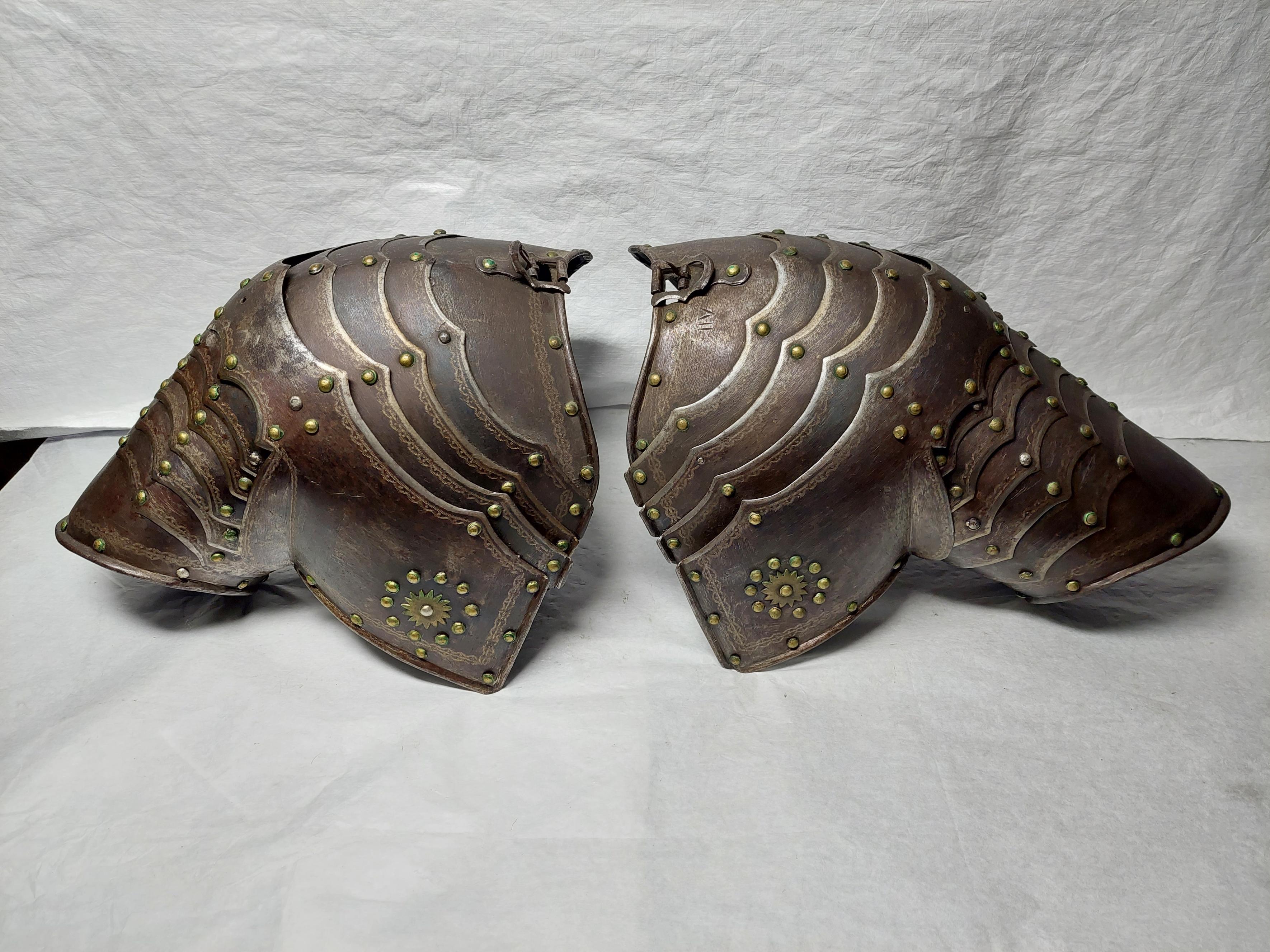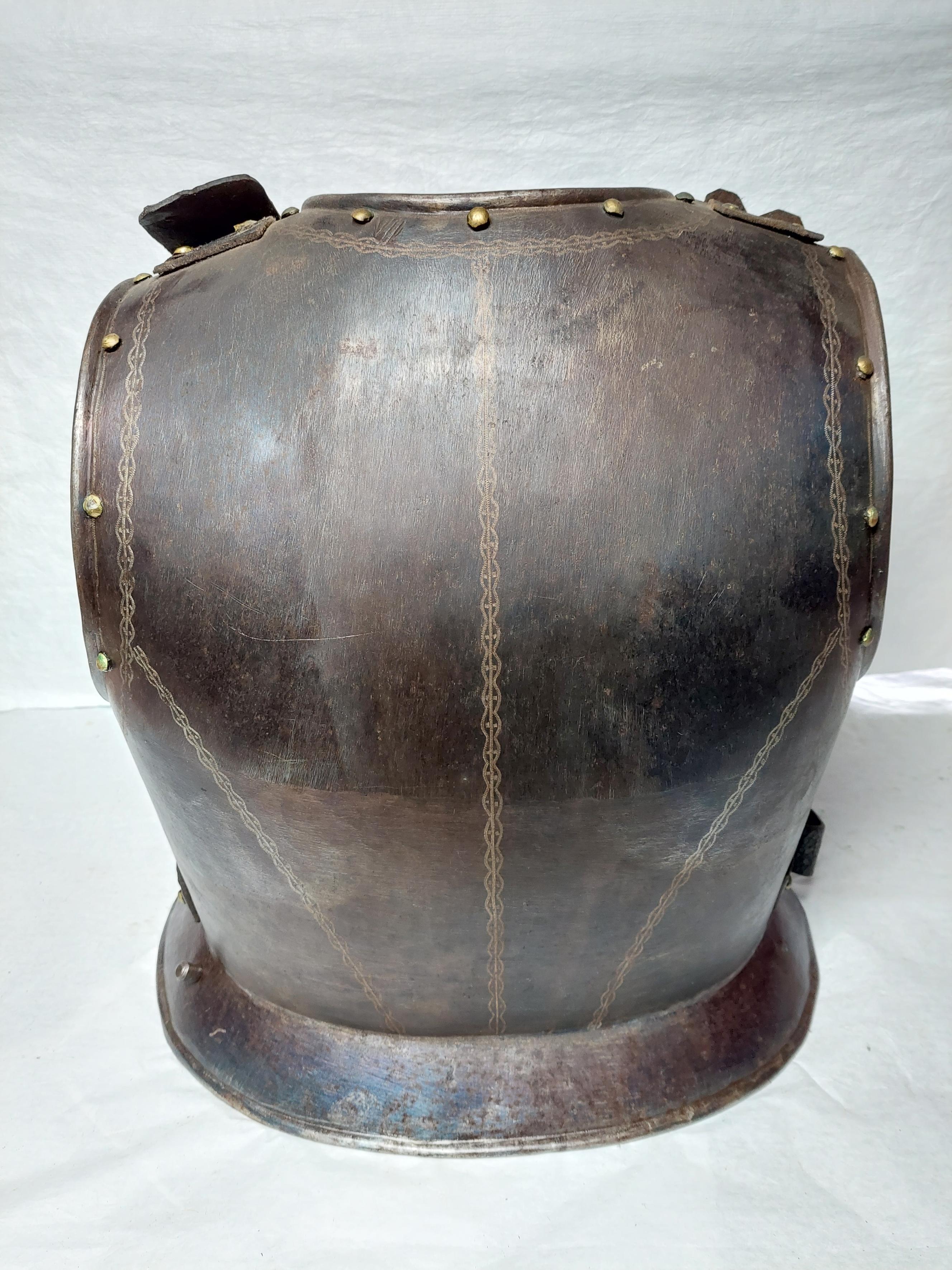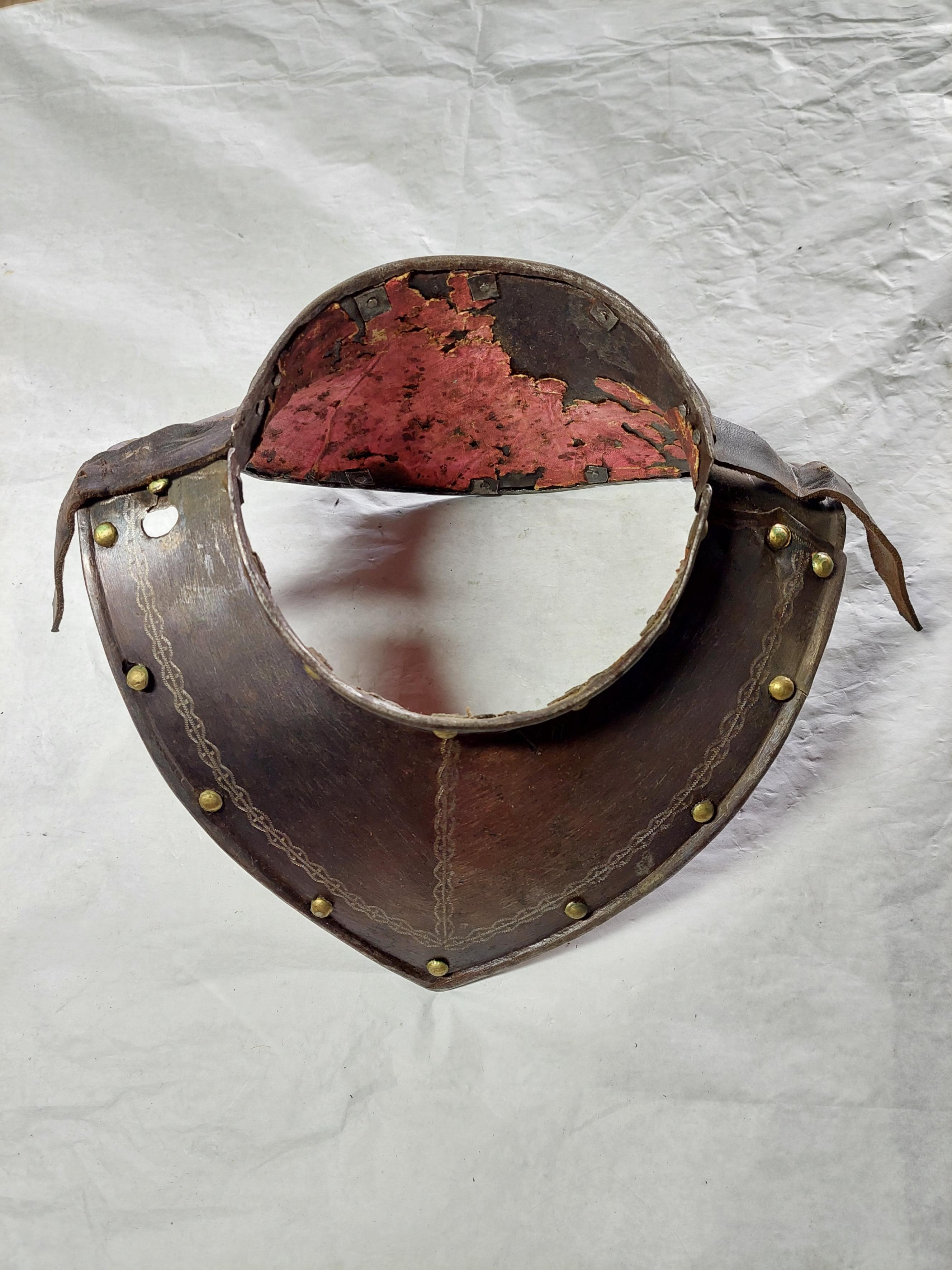 KOMPLETTERANDE BESKRIVNING Fältrustning för kavalleri av bättre kvalité. 6814:1 Bröstharnesk med i hals- och armringning utåt omvikta, rundsmidda kanter. Innanför dessa stålnitar med pålödda mässingsskållor. Dessa har sannolikt hållit läderfodret. Rött fastlimmat läderfoder. Igensatta hål på utviket mitt fram. Bröstplåten torde vara skottfri. 6814:2 Ryggharnesk med i hals- och armringning, samt nederkant som är inåt omvikta och rundsmidda . Innanför dessa (ej vid nederkanten) stålnitar med pålödda mässingsskållor. Insidan med senare svart bemålning. Axellädret är utbytt. Vid detta läder är sannolikt de ursprungliga lädret med plåtar fastnitat. 6814:3 Halskrage med inåt omvikta, rundsmidda ytterkanter. Längs dessa stålnitar med pålödda mässingsskållor. Remmarna vid axlarna är bytta. 6816:4 Ländskört med inåt omvikta, rundsmidda ytterkanter och stålnitar med pålödda mässingsskållor. De två nedersta lamellerna är skarvade mitt på. Insidan senare bemålad med svart färg. Spår av läder. Märkt med "VII". Kroken på vänster sida har inte fått plats vid låsning, därför har man slagit ett spår i åsen för kroken. 6814:5-6 Axelstycken med inåt omvikta, rundsmidda ytterkanter samt stålnitar med pålödda mässingsskållor. Insidan är senare svartmålad och större delen av lädret är bytt under 1900-talet, då maskingjorda nitar har använts. Man har däremot återanvänt äldre nitar också. Höger axelstycke märkt med sex stycken streck och vänster är märkt med "IIV": 6814:7-8 Tassetter med inåt omvikta, rundsmidda ytterkanter. Stålnitar med pålödda mässingsskållor. Lamellerna nitade i varnade i avlånga hål i ytterkant men på remmar i mitten och i innerkant. Delar av lädret bytt. Vänster tassett med vinklat gångjärn och krok. Delarna har senare svart bemålning på insidan.