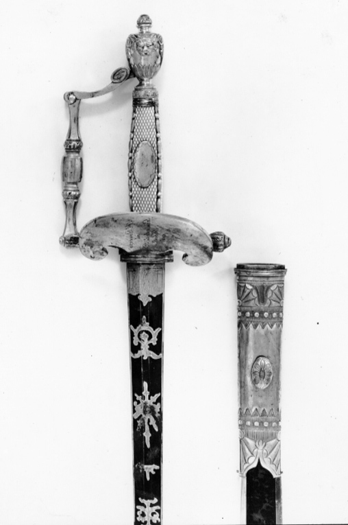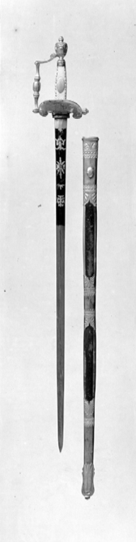Balja överklädd med svartlackerat läder med tre breda, reliefornerade, förgyllda silverbeslag: munbleck, mellanband och doppsko. Ornering i form av snäckornamentik samt spetsuddiga och kulformiga bårder. Oval koppelhake med blomornament. På munbleckets insida graverat i antikvaversaler: "IL MINISTRO RICOGNOSCENTE". De förgyllda silverbeslagen förenade med smala, släta silverskenor utmed baljans kanter. MN protokoll 1875-11-08, gåva av fröken Mariana Vilhelmina af Tibell (1814-1895), gåvobrev av den 6 oktober 1875. Hedersvärjan har tillhört generallöjtnanten, friherre Gustaf Vilhelm Tibell (1772-1832), som enligt inv. 1867 mottog värjan vid utnämningen till kommenderande generaladjutant i fransk tjänst 1803, årsdagen efter slaget vid Marengo. Detta stämmer dock ej med inskriptionen på parerplåten, troligen har Tibell mottagit värjan vid avskedet ur italiensk (och fransk) tjänst 1803.