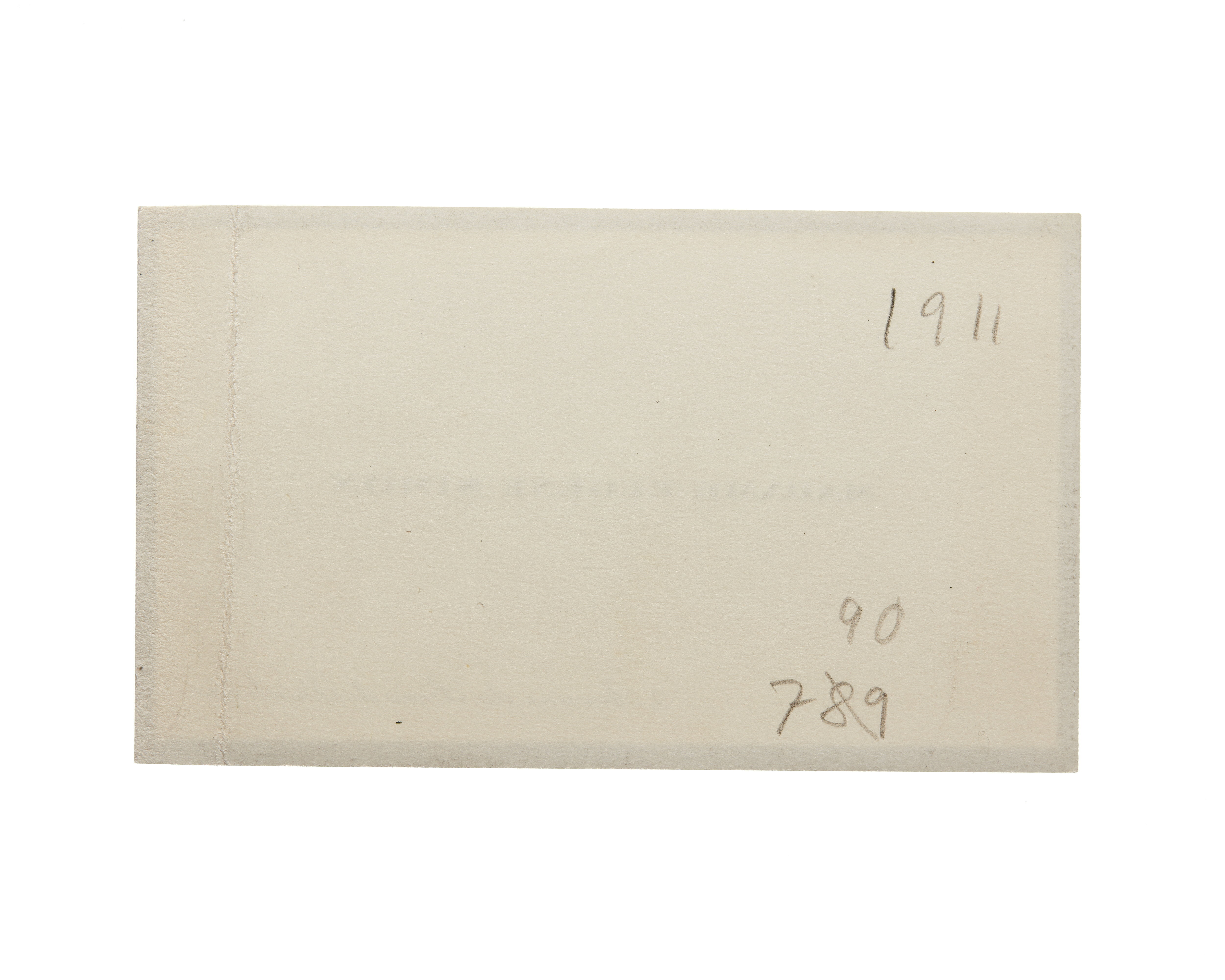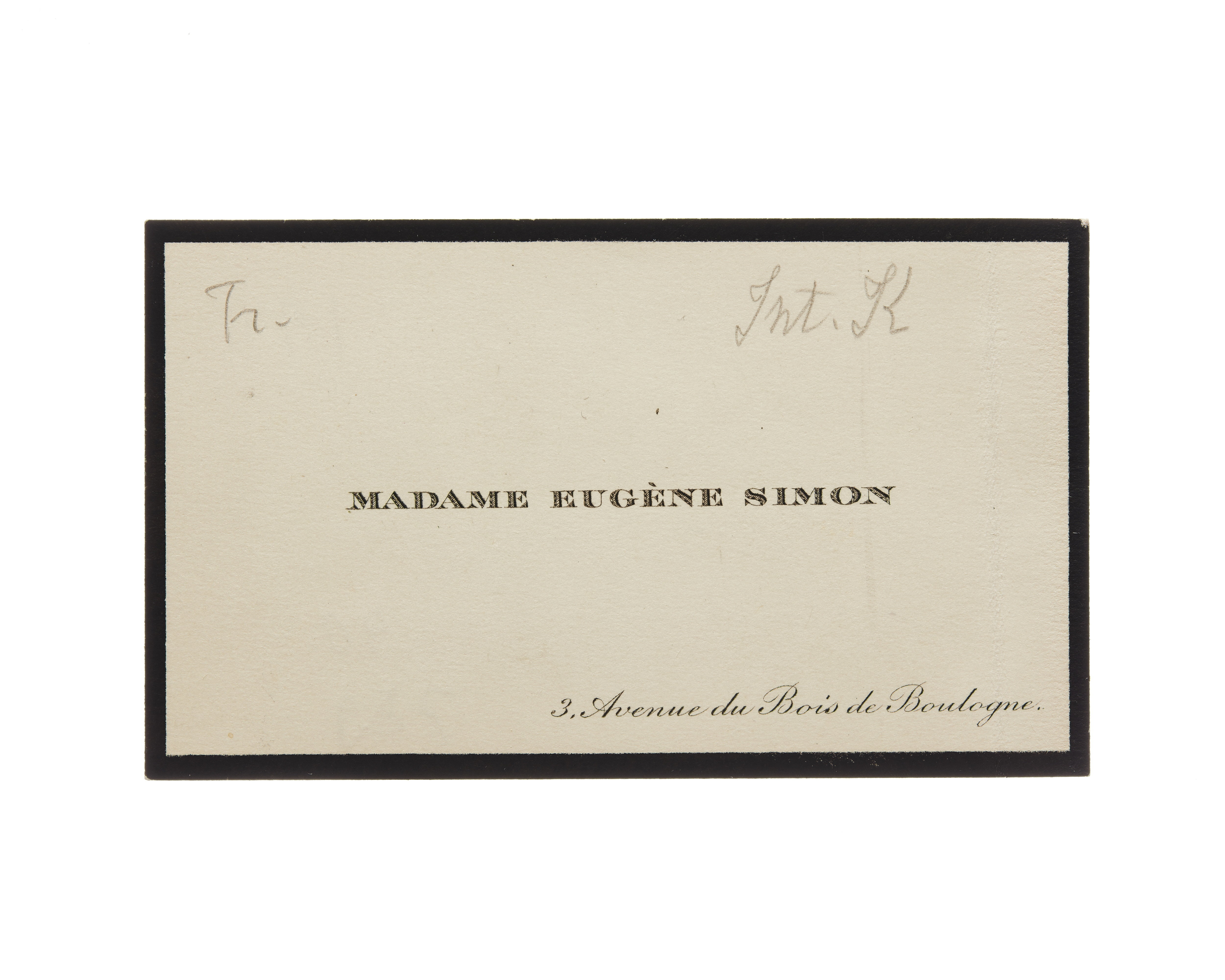 Ett visitkort från Madame Eugène Simon, daterat 1911 samt sorgkant, vikt i högra sidan. Adress (nedre högra hörnet) 3, Avenue du Bois de Boulogne. Överlämnat i samband med Internationella kvinnoförbundets kongress i Stockholm 1911.