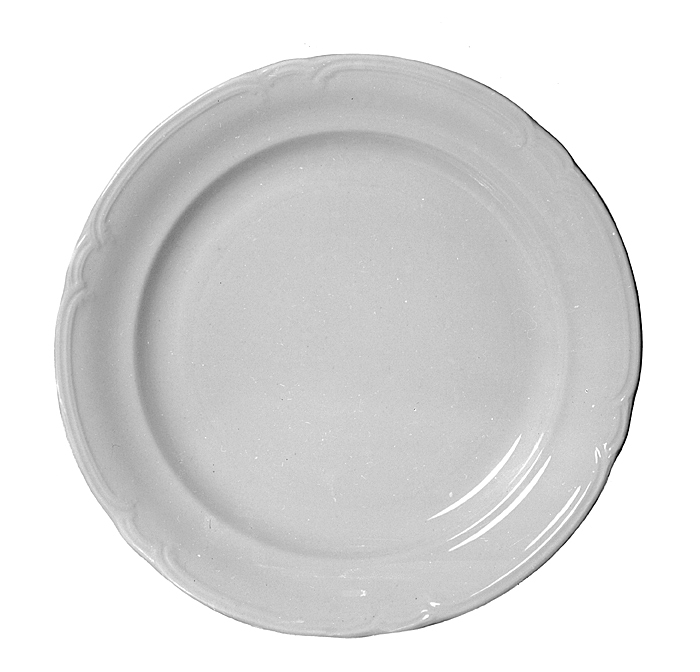 TALLRIKAR, tjugosex stycken av s. k. fin fajans (vitt lergods överdraget med blyglasyr). Runda, flata, med plan botten, kälformig kep och snett utstående kälformigt brätte med konturerad ytterkant samt på låg fotkant. På brättets översida kring ytterkanten i låg relief ett räfflat band, avbrutet på sex ställen, med ändarna vid avbrotten nedböjda och sammanhållna av en kort båge som bandet. Höjd: 2,6 cm.; diameter: omkring 23,7 cm.