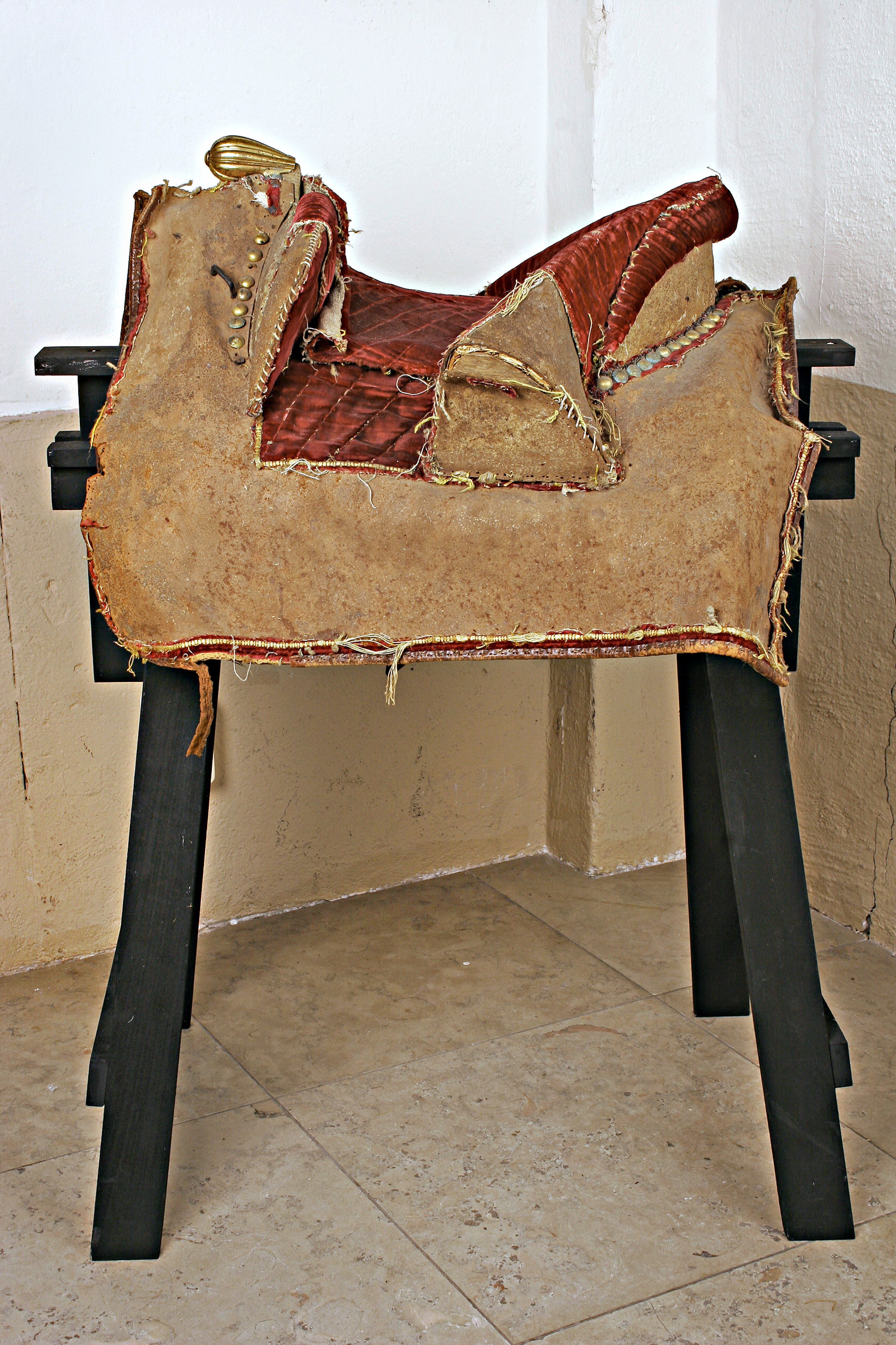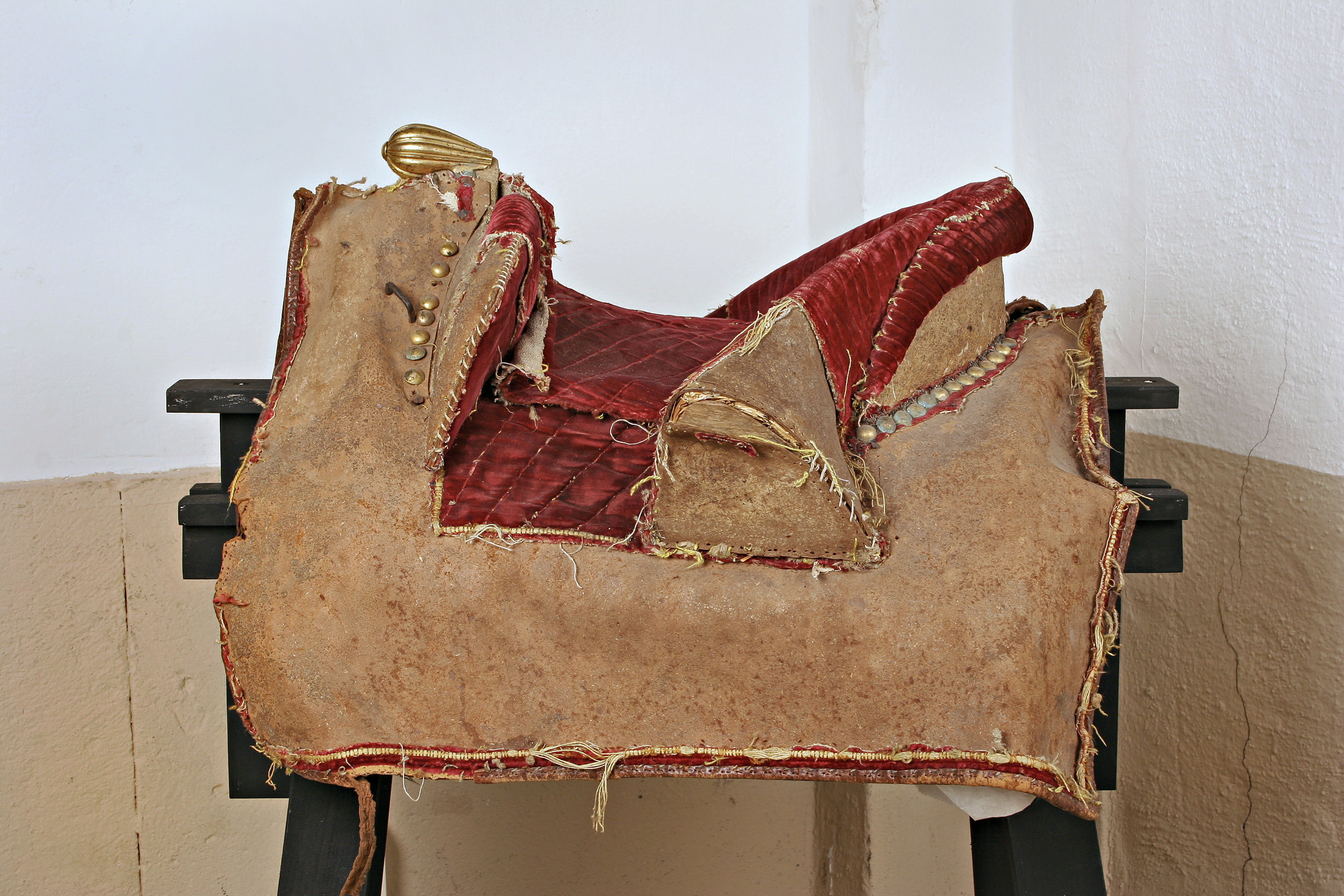 Sadel överklädd med röd sammet. Sammeten på knapparna bortfallen. Rektangulära kappor kantade med läder. Sitsen med parallella stickningar av silvertråd (numera bortnött) Bakbom med stödbommar 550 mm bred 130 mm hög. Delad frambom 450 mm bred, 80 mm hög. Sadelknapp av förgylld mässing, räfflad, framåt utdragen och rundad. Framför främre sadelbommen 7 + 3 förgyllda mässingstännlikor. Bakom bakbommen 12 + 13 förgyllda tännlikor. Två rektangulära byglar för hölster. Fyra stroppar av vitt läder för sadeljord byglar av stål för stigläder. Baktill läderögla för svanskappa. Bossa av naturfärgat linne kantad med vitt skinn. Bom överklädd med väv.