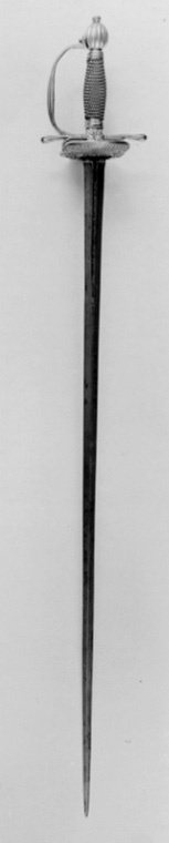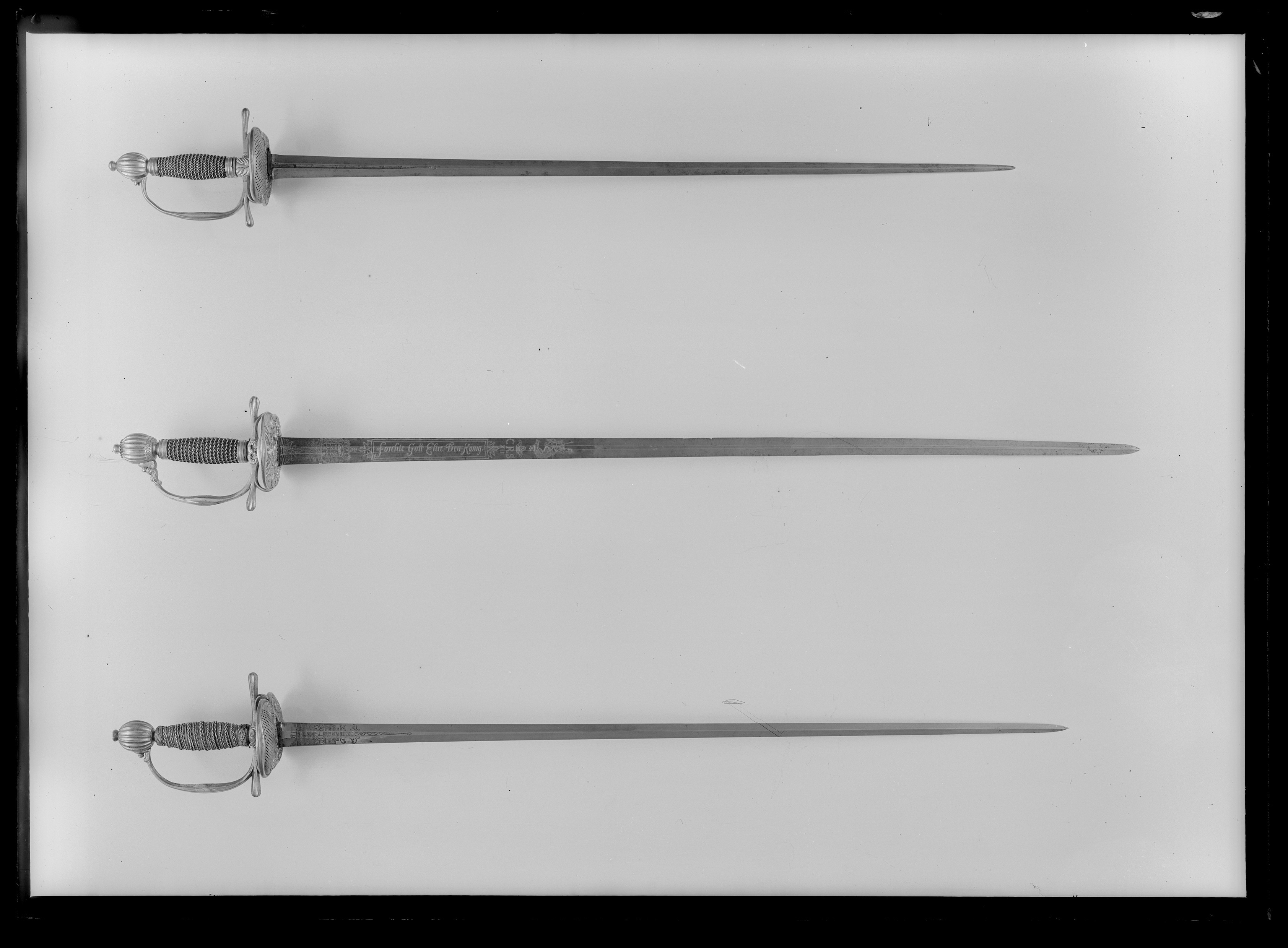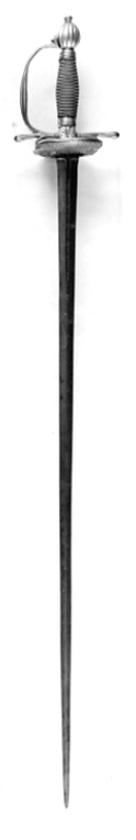 Fäste av reliefornerad förgylld mässing. Av efterkarolinsk typ, återgående på normaltypen för karolinsk kommendervärja. Kavellinding av tvinnad, omväxlande tjock och något mindre tjock silvertråd, upptill och nedtill en förgylld mässingsring, ornerad med längsgående inpassade ränder. Klinga, rak, tvåeggad, slipad med jämnbreda skär utom vid baspartiet som är smalt planslipat längs sidorna och där med en ca 16 mm lång hålkäl, vari en rad inpunsade bokstäver, omväxlande V och O. Ovanför hålkälen inpunsat ett spegelmonogram av C, varöver (sett från klingbasen) ordningssiffran XI.