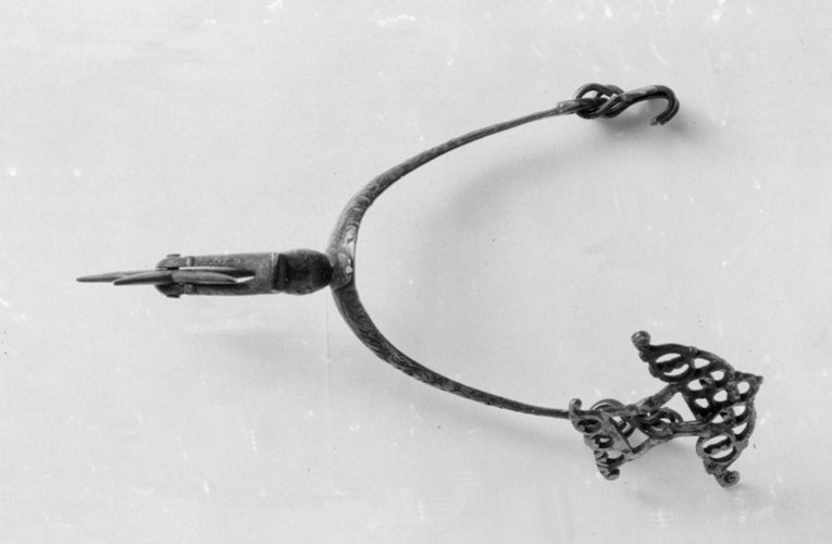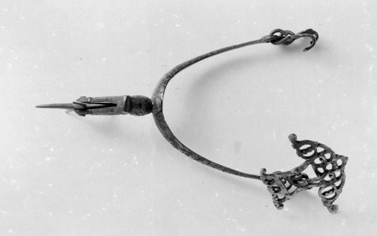Sporre av försilvrat stål, silvret påslaget med yttäckande punsad ornering. U-formade något uppåtböjda skänklar i ändarna med dubbla ringformiga hållare för krokar och remsölja. I ena änden två hakar, i den andra en hake och en stor, genombruten, pilspetsformad remsölja av försilvrad mässing. Hals vinkelformigt nedåtböjd, delen närmast skänklarna äggformad. Klinga stor femuddig.