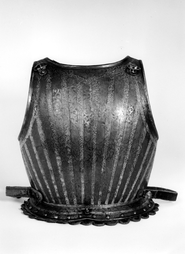bröstharnesk med 2:ne axelsleifer af läder, klädda med rödt sammet och fastsatta med rosettformiga nitar - för lårskenornas fästande finnas 2:ne sleifer med skrifvar och muttrar af jern,