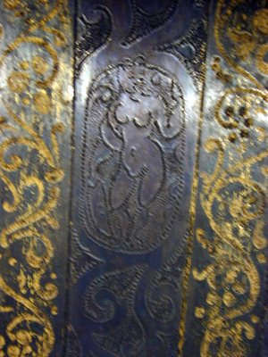 - 1 st Harnesk (på ena handsken felar några fingrar) med utstuckit arbete och förgylte ränder; best. af Cascquette, ringkrage, armskenor, bröst och ryggstycke, lår skenor och ett par handskar. komit ifrån Påhlen.