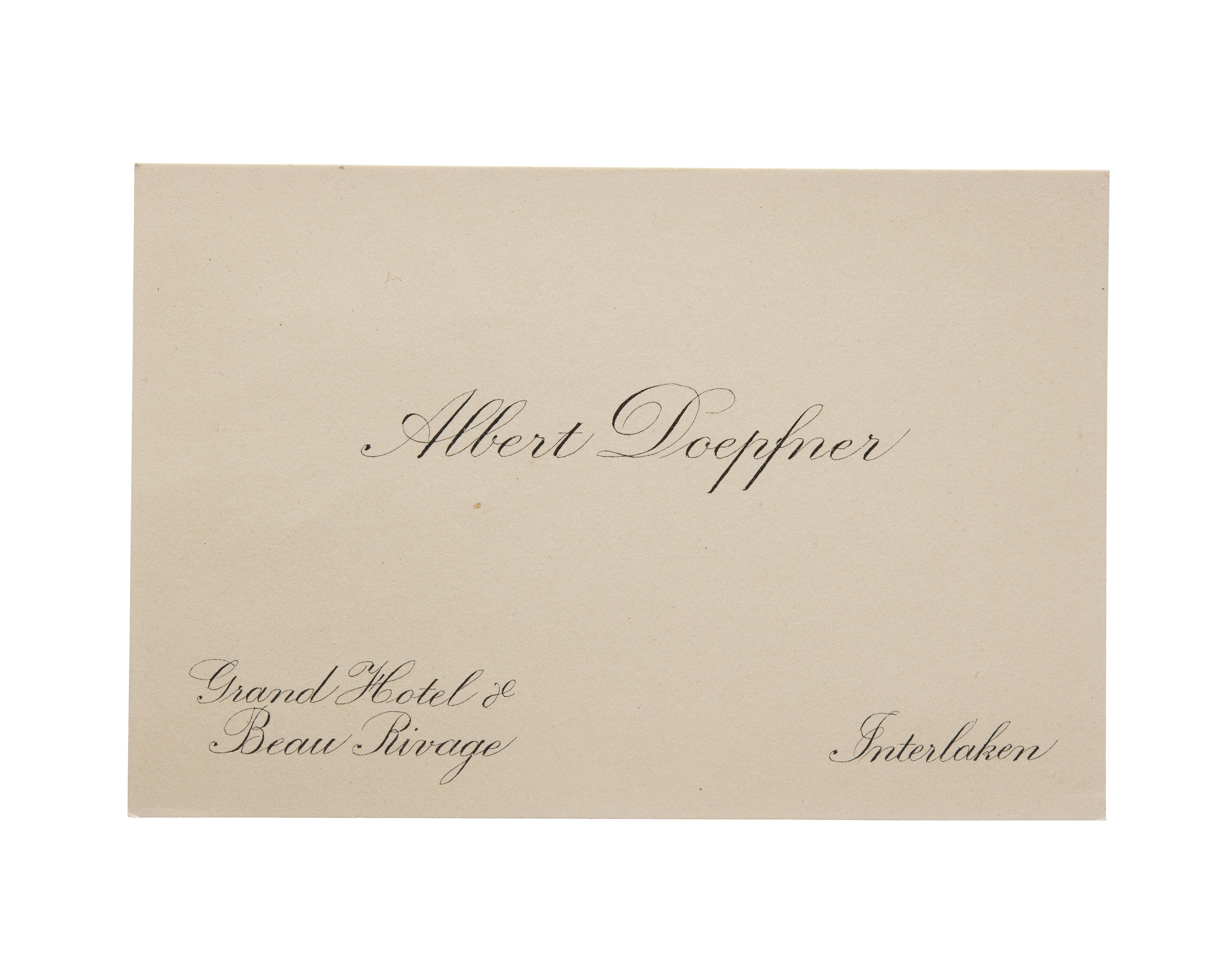 Ett visitkort från Albert Doepfner, daterat 1921. Adress (nedre vänstra hörnet) Grand Hotel & Beau Rivage, (nedre högra hörnet) Interlaken.