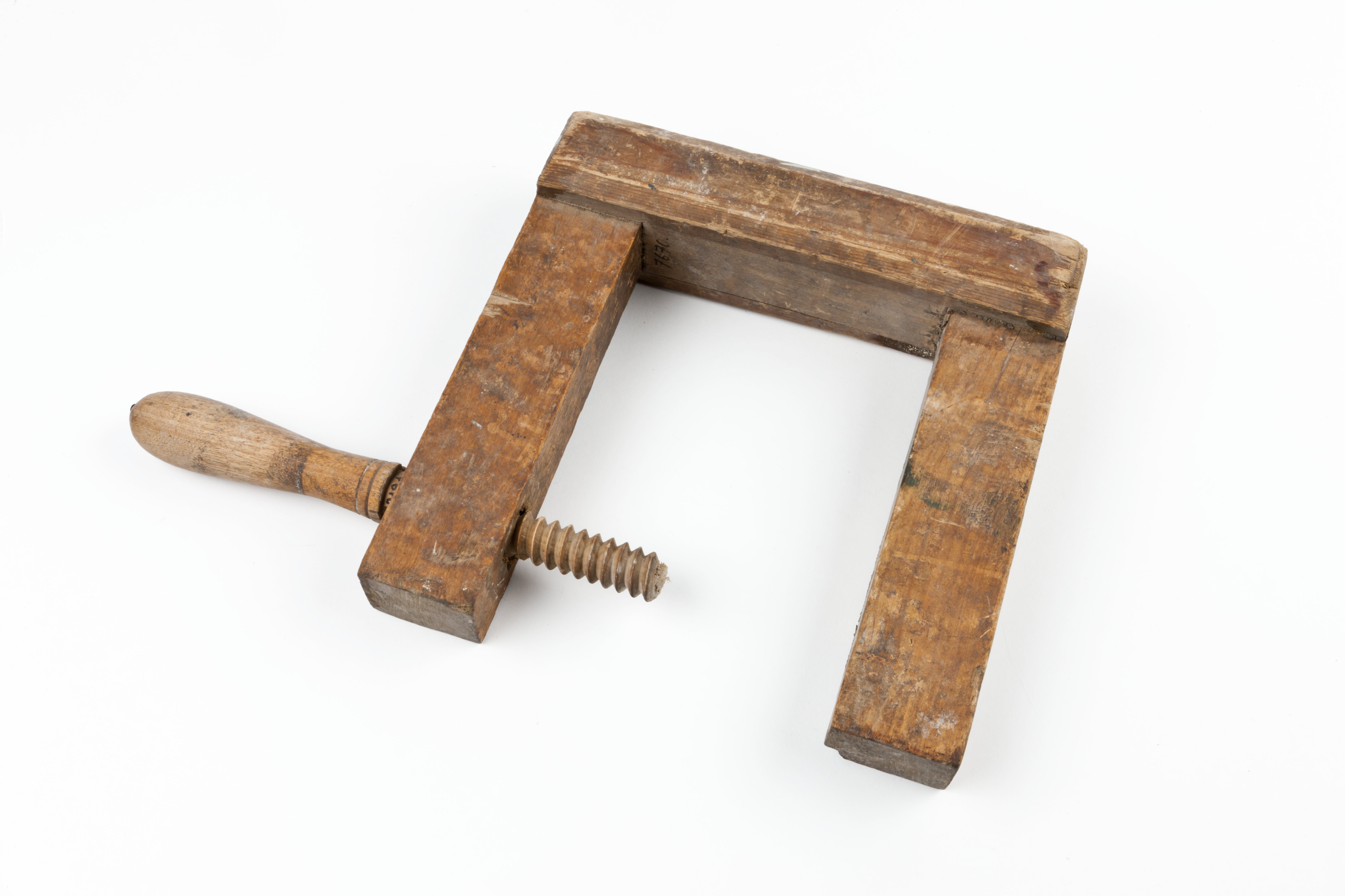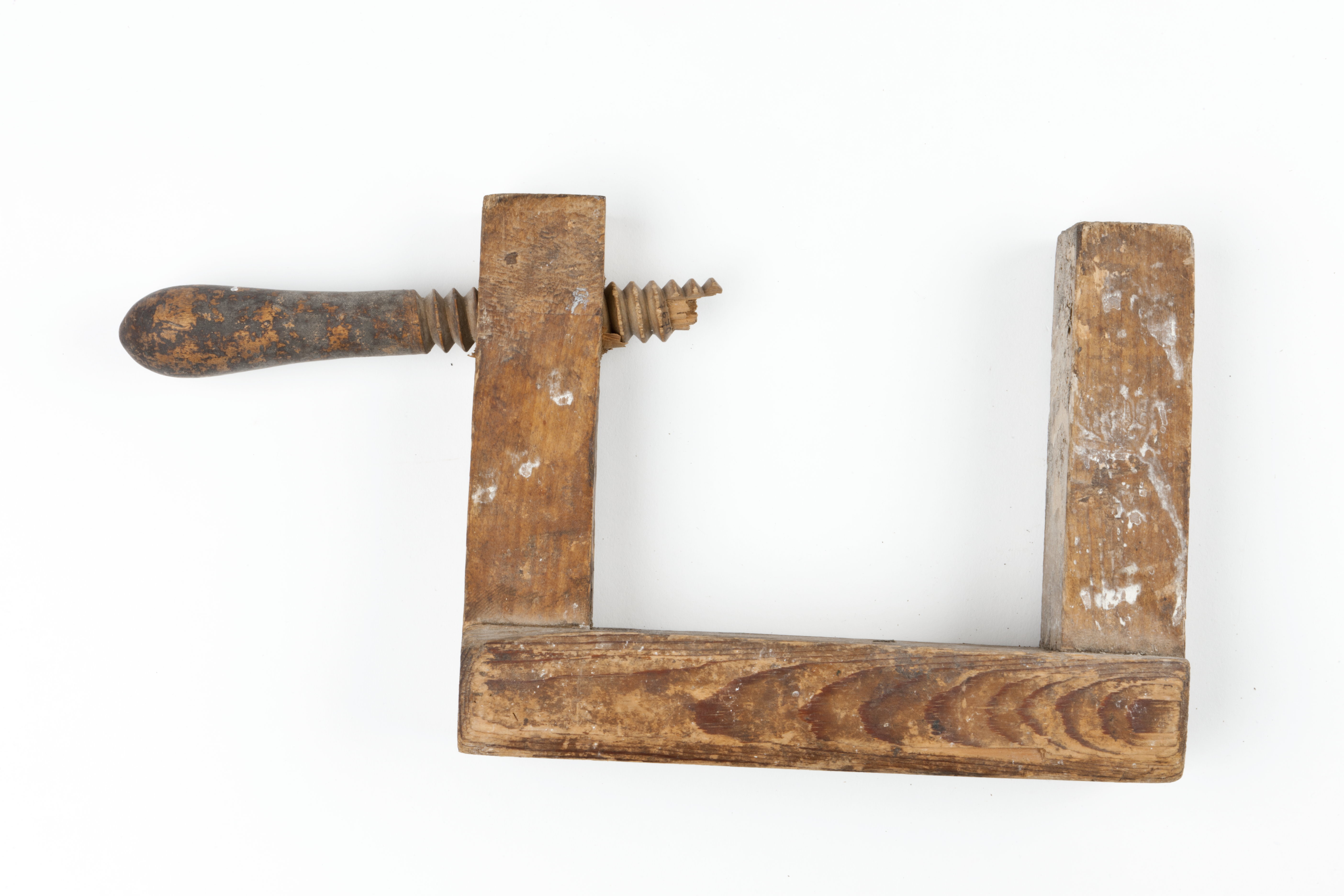 Med furulister limmade på ramens vertikala stycke. Skruv av björk med svarvat skaft.