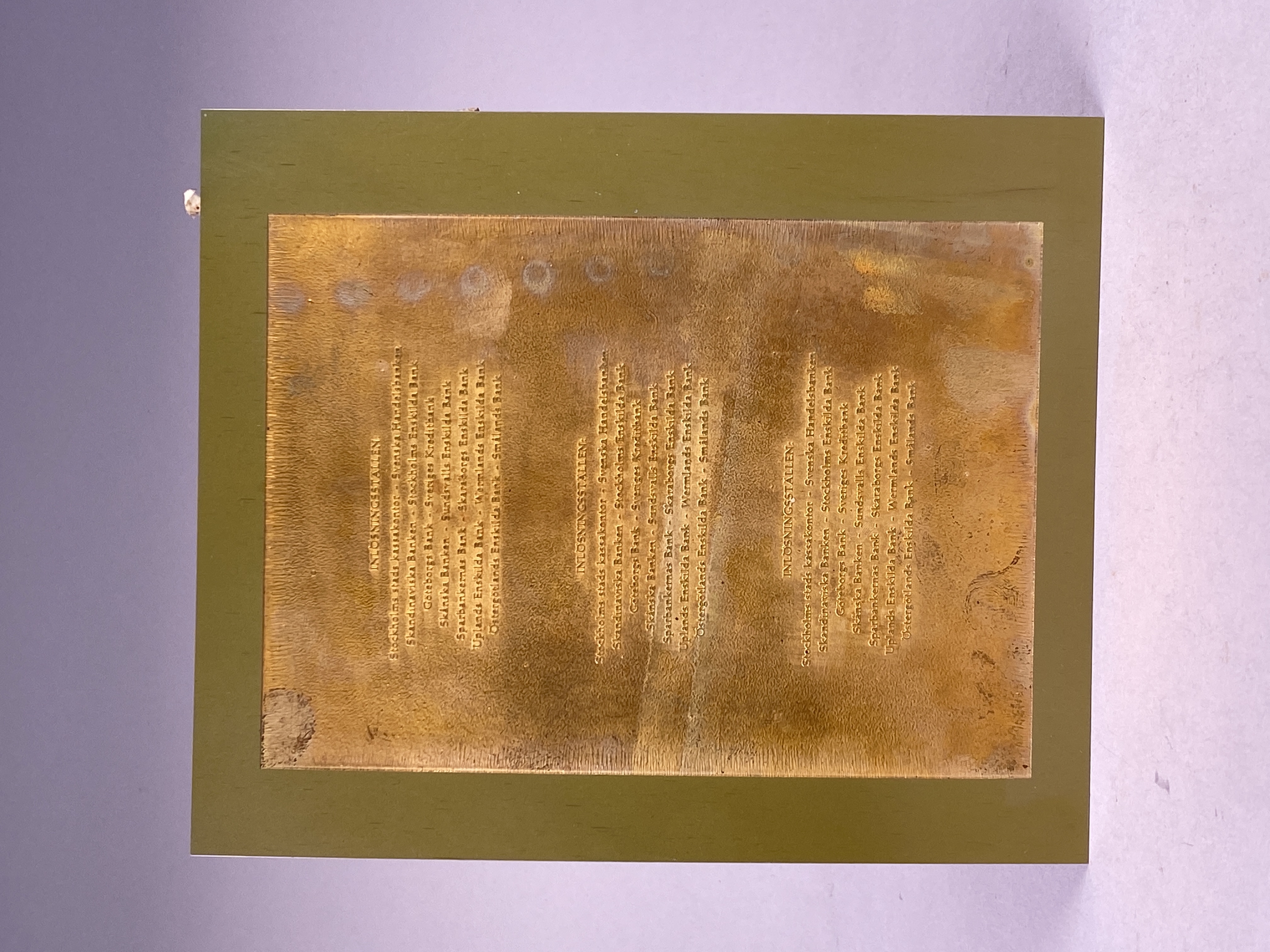 Tryckplåt av okänd funktion. Rektangulär plåt tillverkad i koppar. Framsidan av plåten med text, vilken upprepas tre gånger: "INLÖSNINGSSTÄLLEN: Stockholms stads kassakontor - Svenska Handelsbanken. Skandinaviska Banken - Stockholms Enskilda Bank. Göteborgs Bank - Sveriges Kreditbank. Skånska Banken - Sundsvalls Enskilda Bank. Sparbankernas Bank - Skaraborgs Enskilda Bank. Upplands Enskilda Bank - Wermlands Enskilda Bank. Östergötlands Enskilda Bank - Smålands Bank".