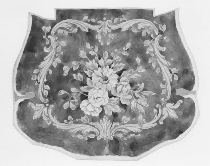 MÖNSTERFÖRLAGA, till möbelklädsel. Utförd i akvarell och gouache på papper, utgörande sits till länstol inv nr Gr VI:II:A.a.8 (för beskrivning se Hallwylska samlingen, Gr VI, text, s. 273 f.f.) Motiv med blomsterbukett och bladranka mot grön botten. Påskrift: "C . Obs. göres 5 cm högre. Stol C väfvd af Frk. Johansson. Grönt" Mått: H 64,6 cm B 77,5 cm Gåva 1943 av arkitekt Gustaf Clason (se protokoll 54 º 4)