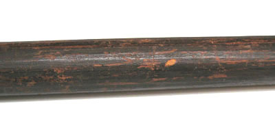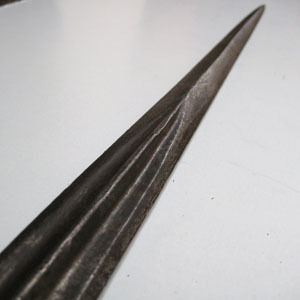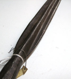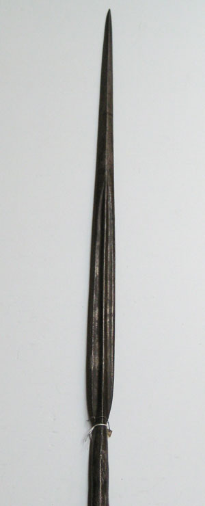 Klingan långsmal, nedre hälften något bredare med tydlig mittås, övre hälften med rombiskt tvärsnitt och skarp spets. Hals och holk i ett långsmalt koniskt stycke med längsgående fog. Fäst i nedre kant med en spik. Direkt under holken en kvast av mörkt vinröd silkestråd med ca 70 mm lång frans. Stång av brunbetsat trä med cirkulärt tvärsnitt, diam 25 mm. Nertill tvärt avsågat.