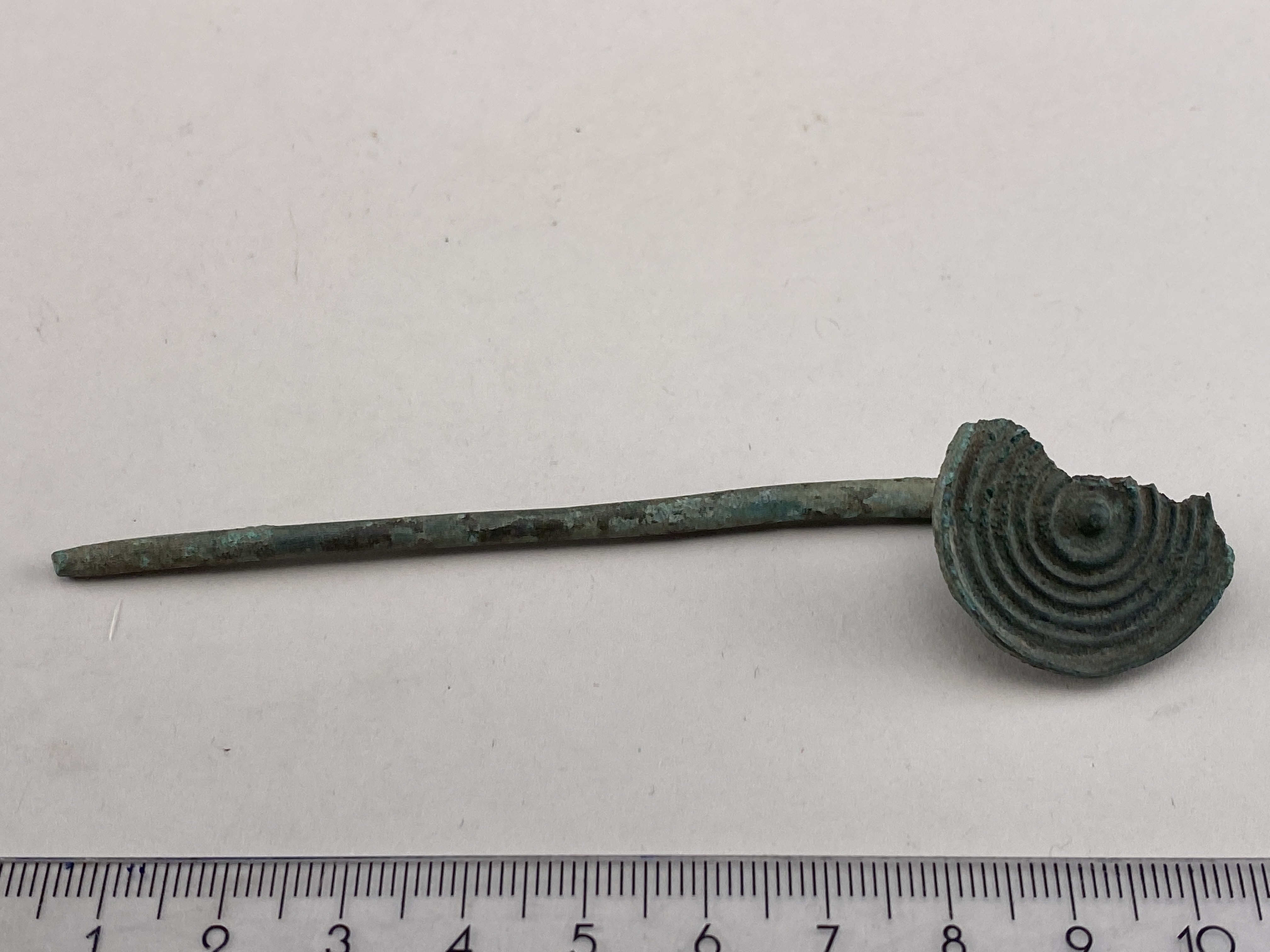 Skivnål av brons med en stor del av huvudet bortbrutet. Kring mittknoppen en tjock uppböjd cirkel och längre ut fyra koncentriska cirklar.