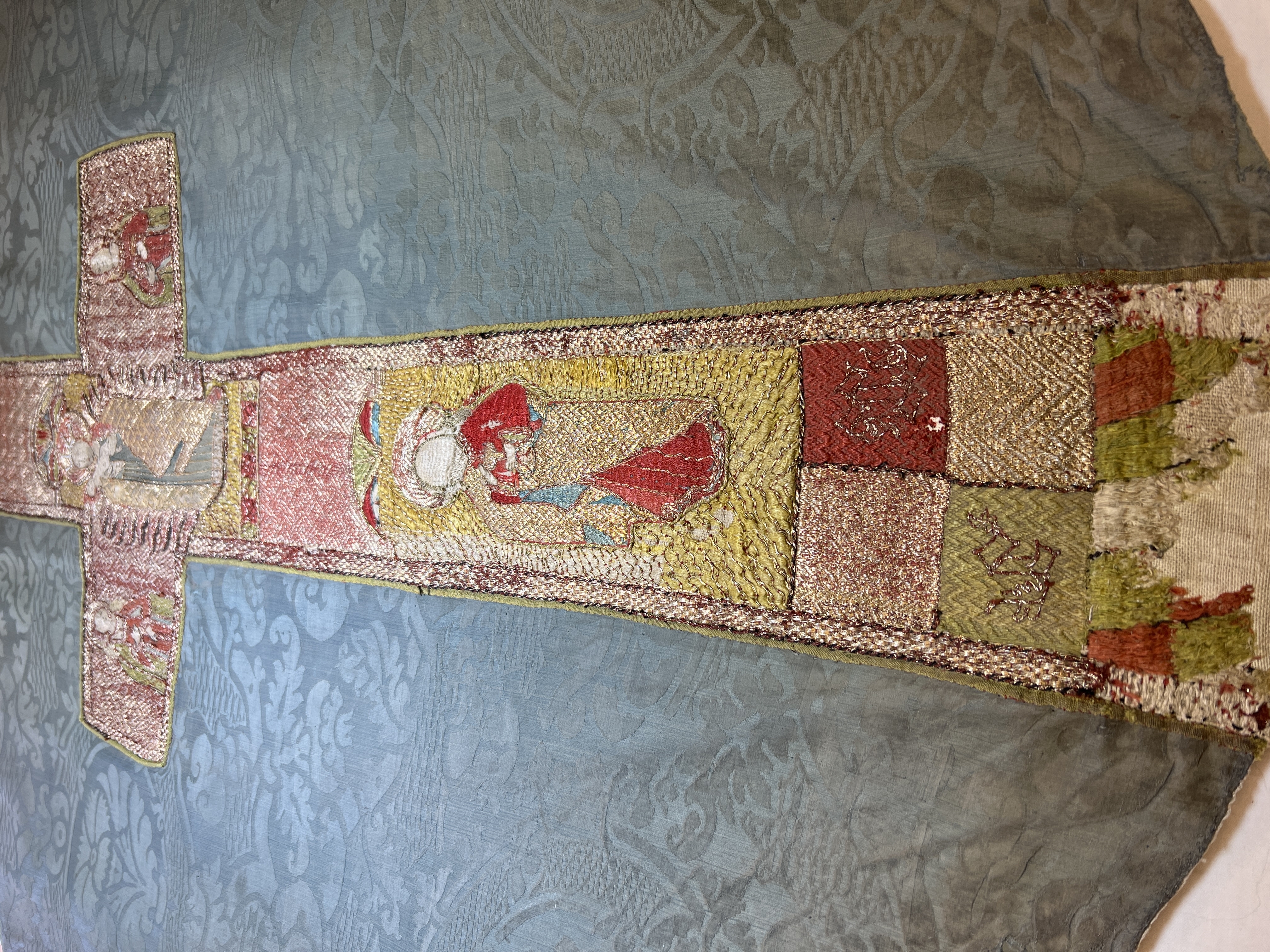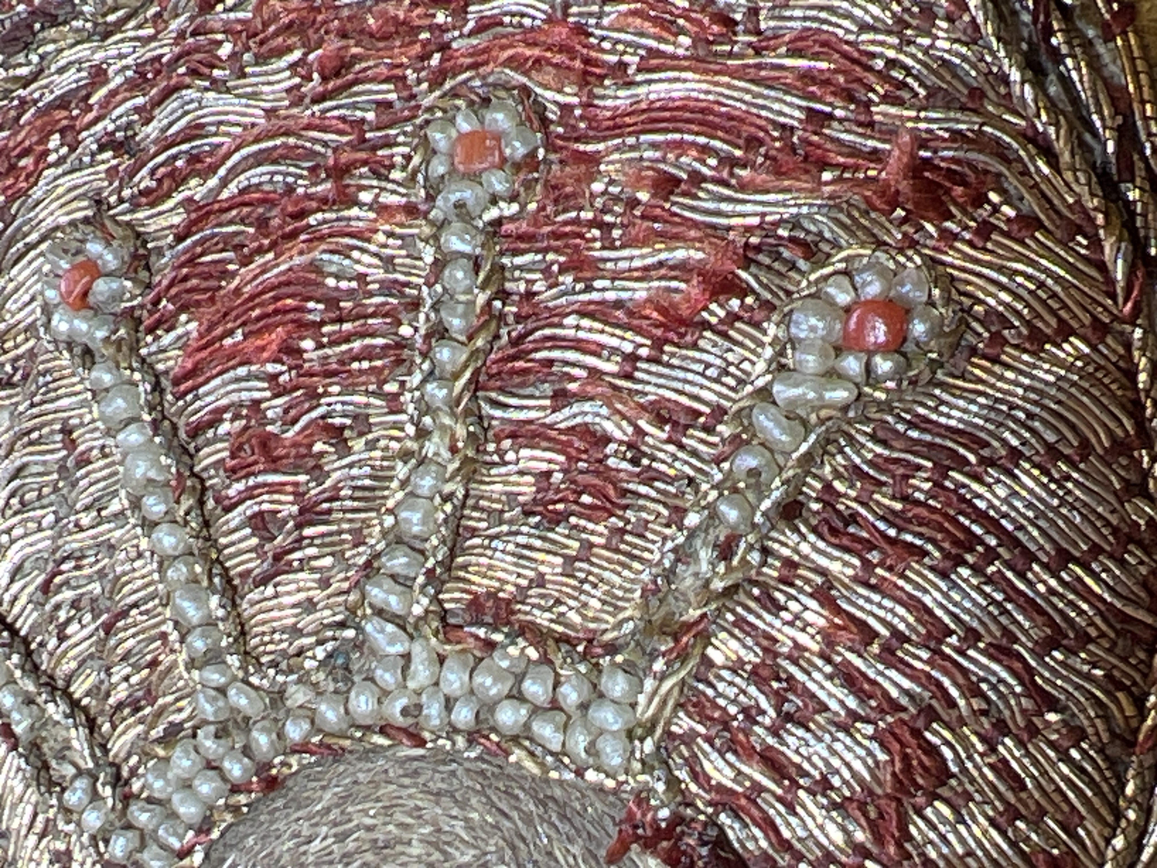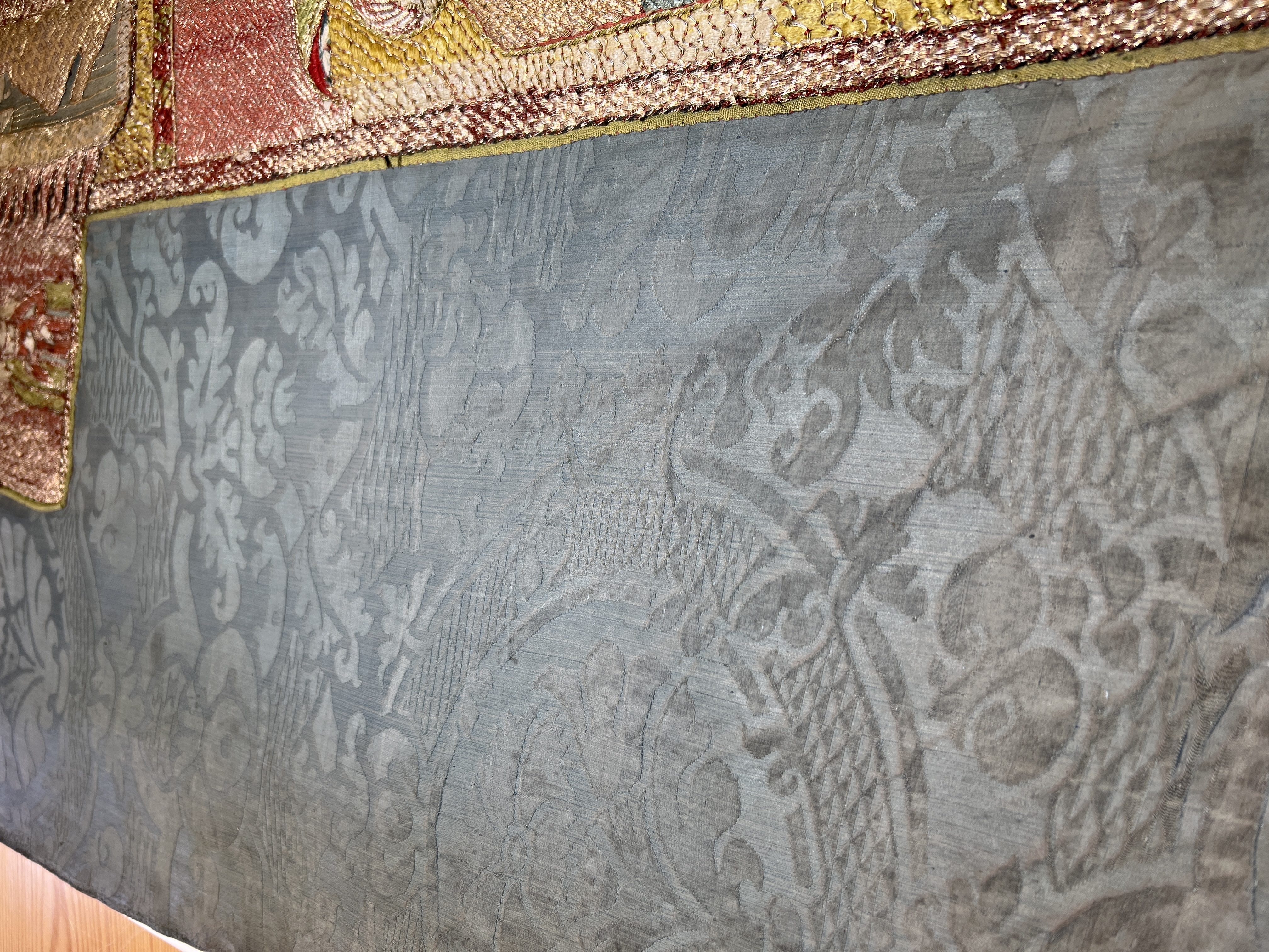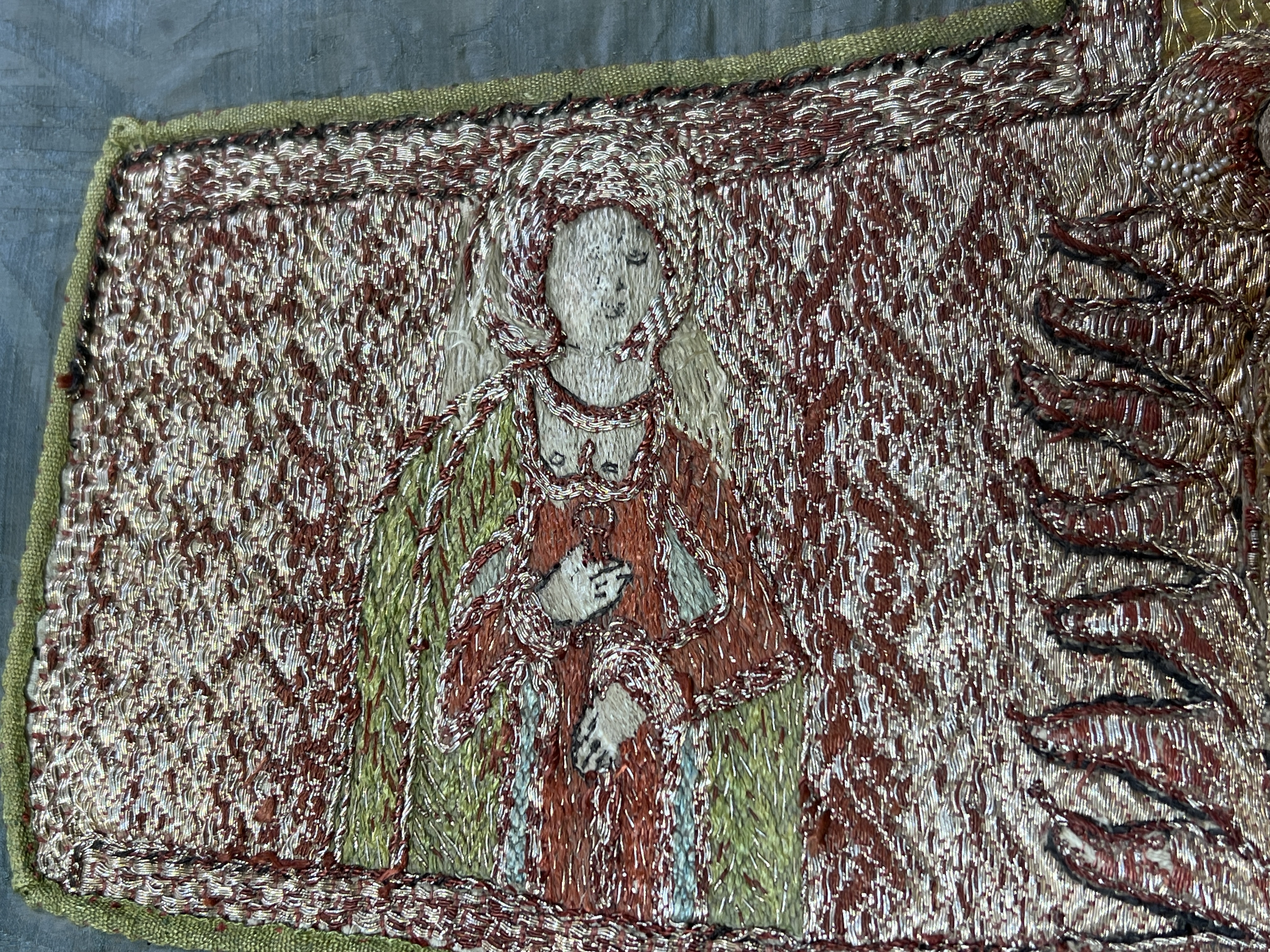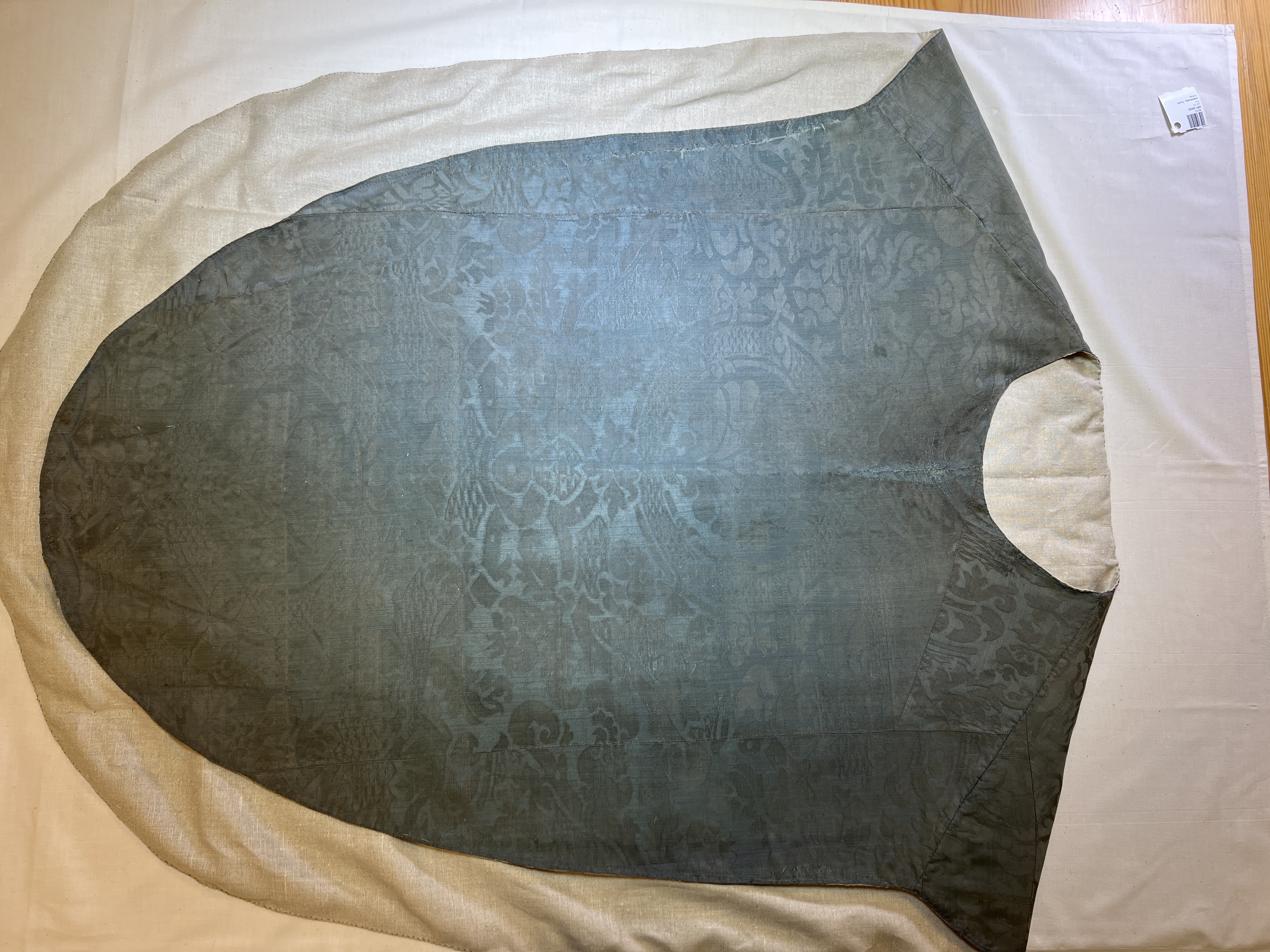 Blå sidendamast, figurbroderi, pärlor, svenskt arbete, svart lärftfoder. Deponerad ?/ SHM Nytt foder isytt vid konserveringen./ MN