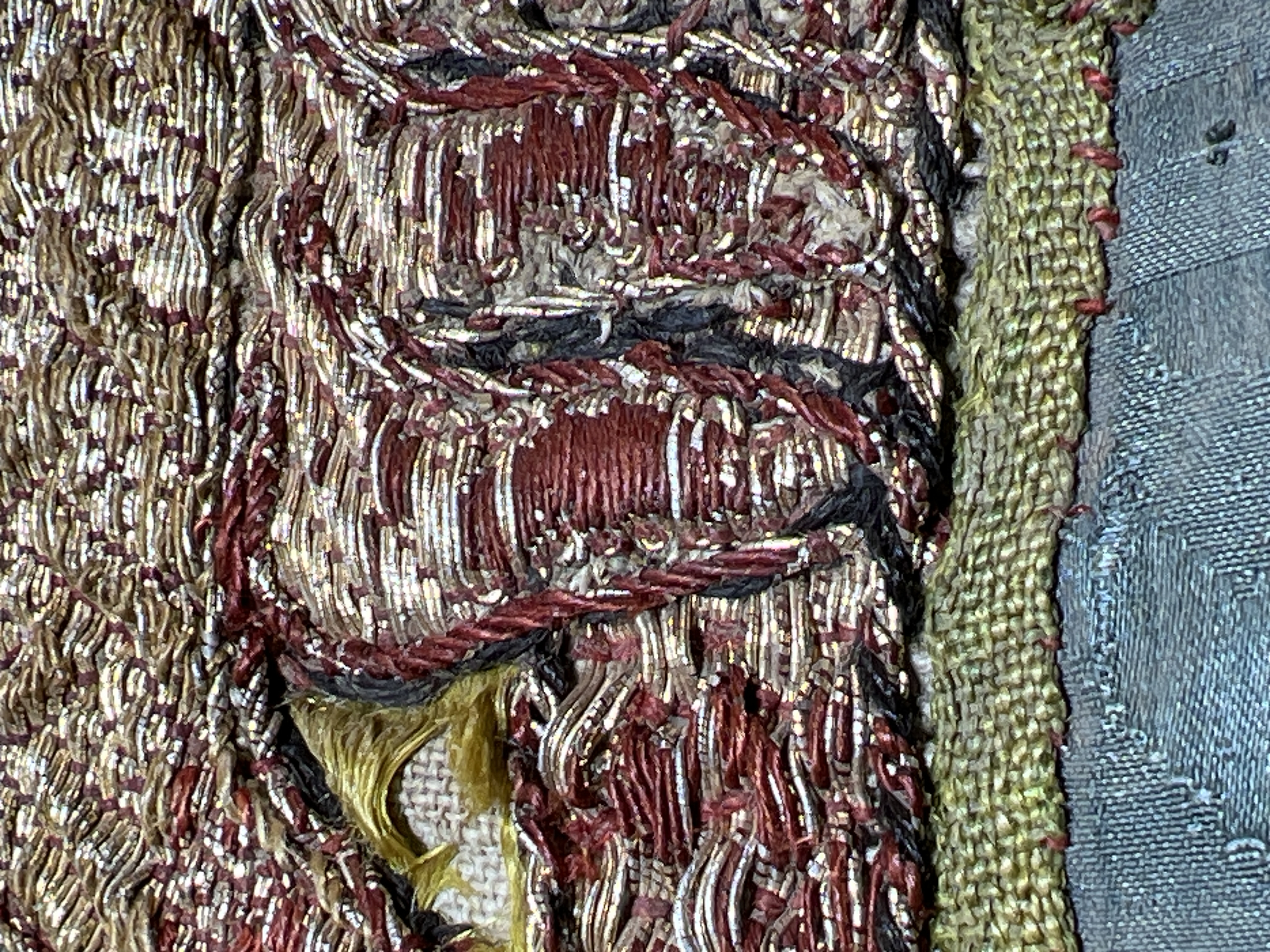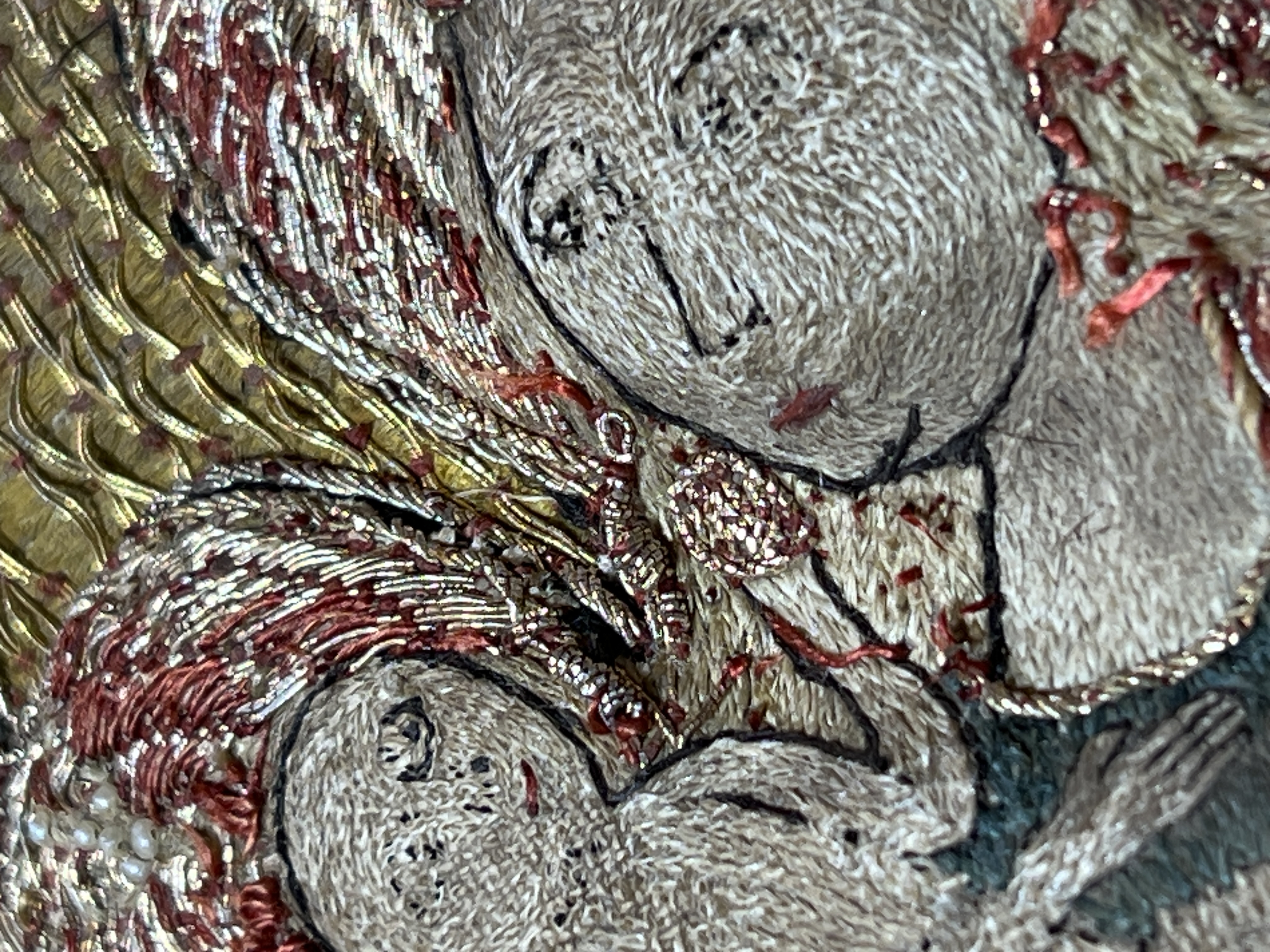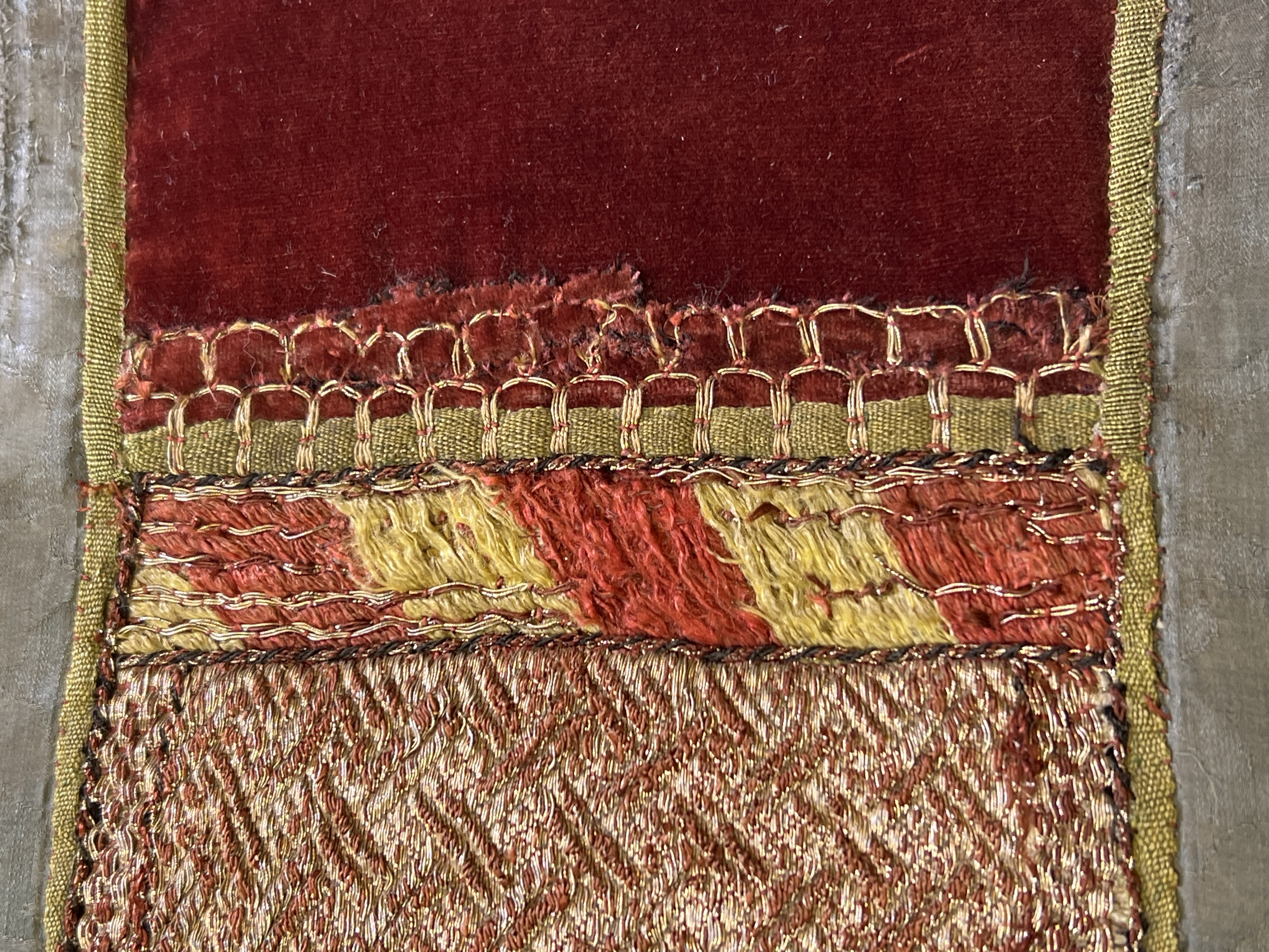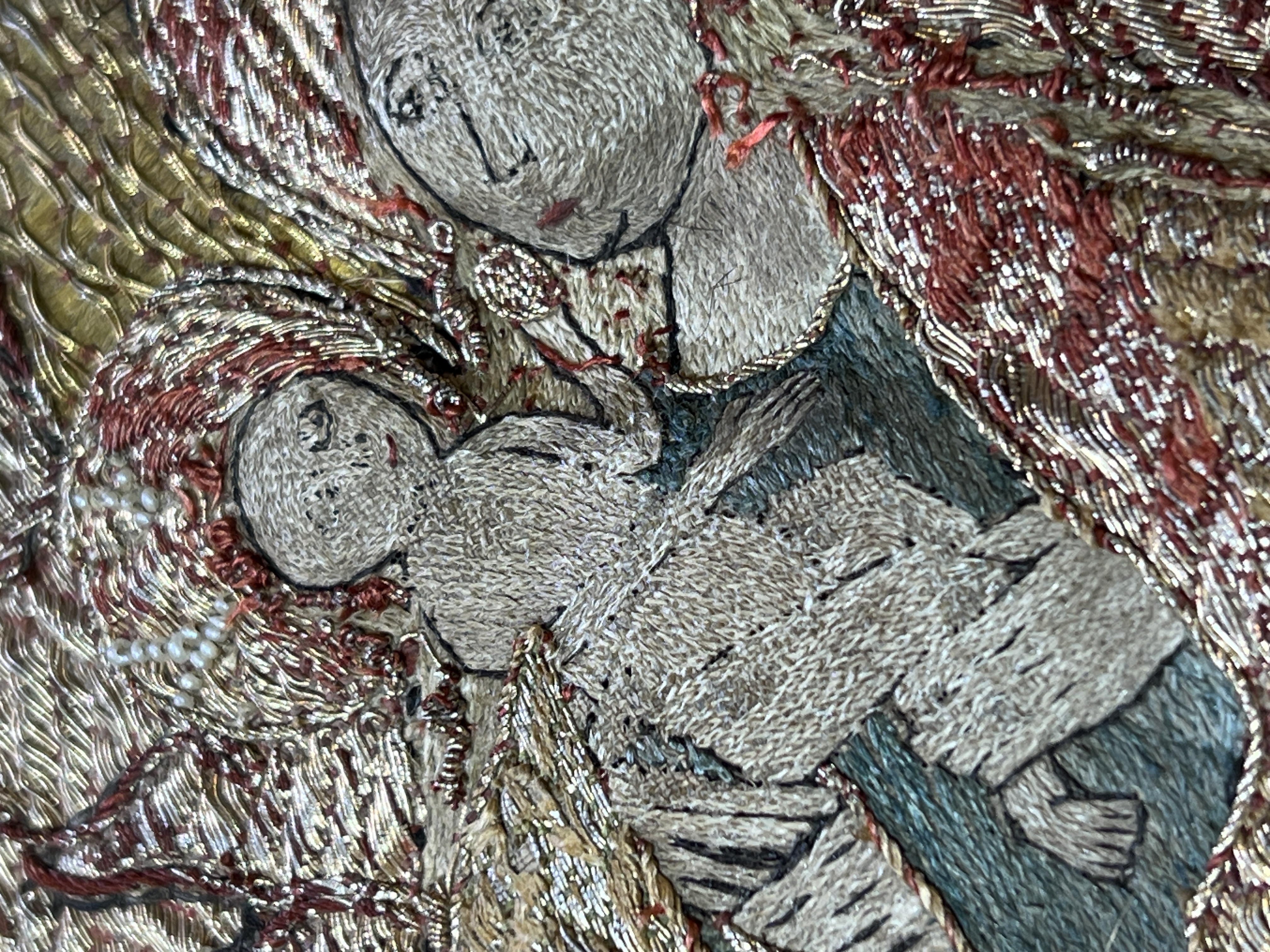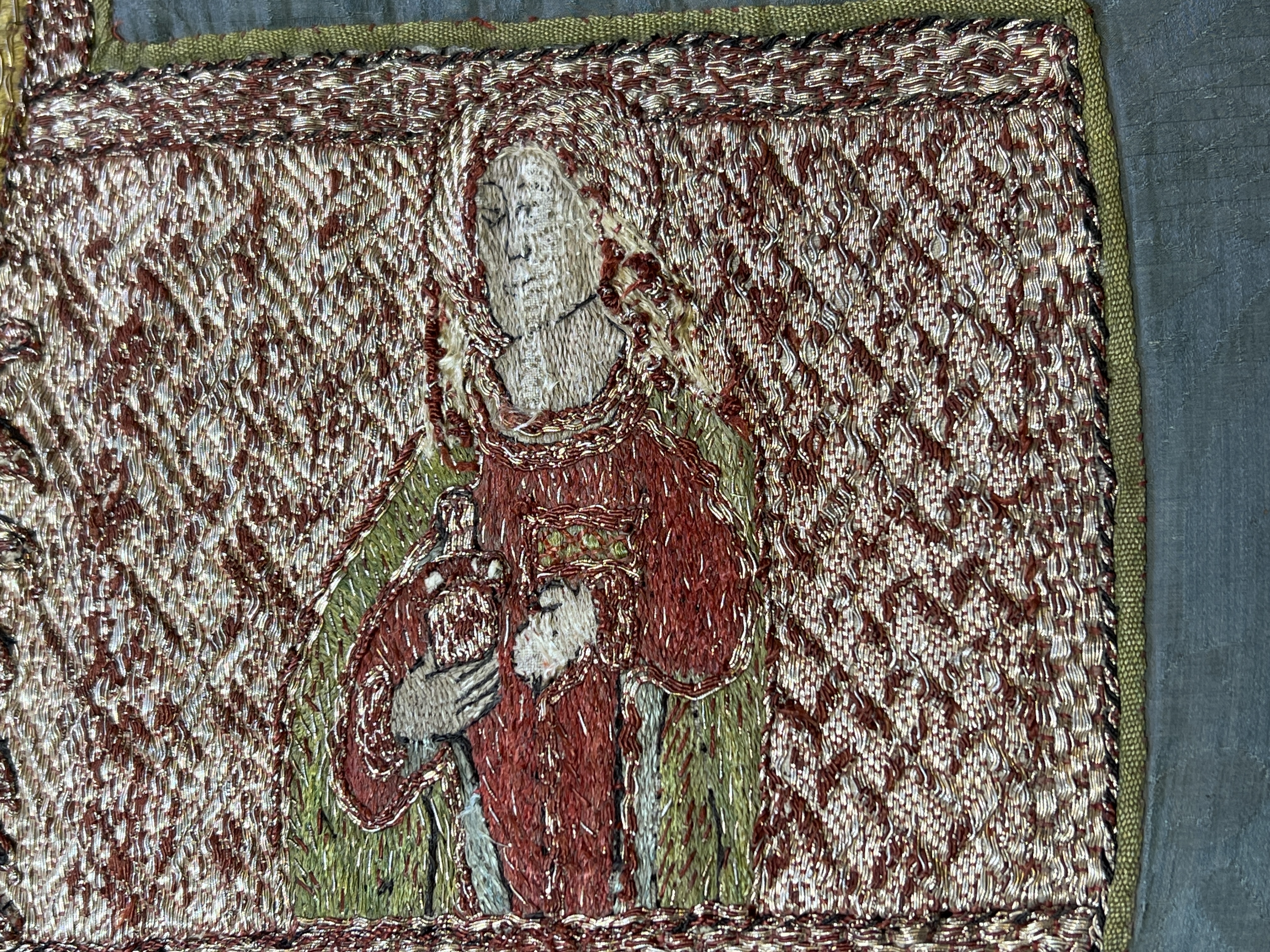 Blå sidendamast, figurbroderi, pärlor, svenskt arbete, svart lärftfoder. Deponerad ?/ SHM Nytt foder isytt vid konserveringen./ MN