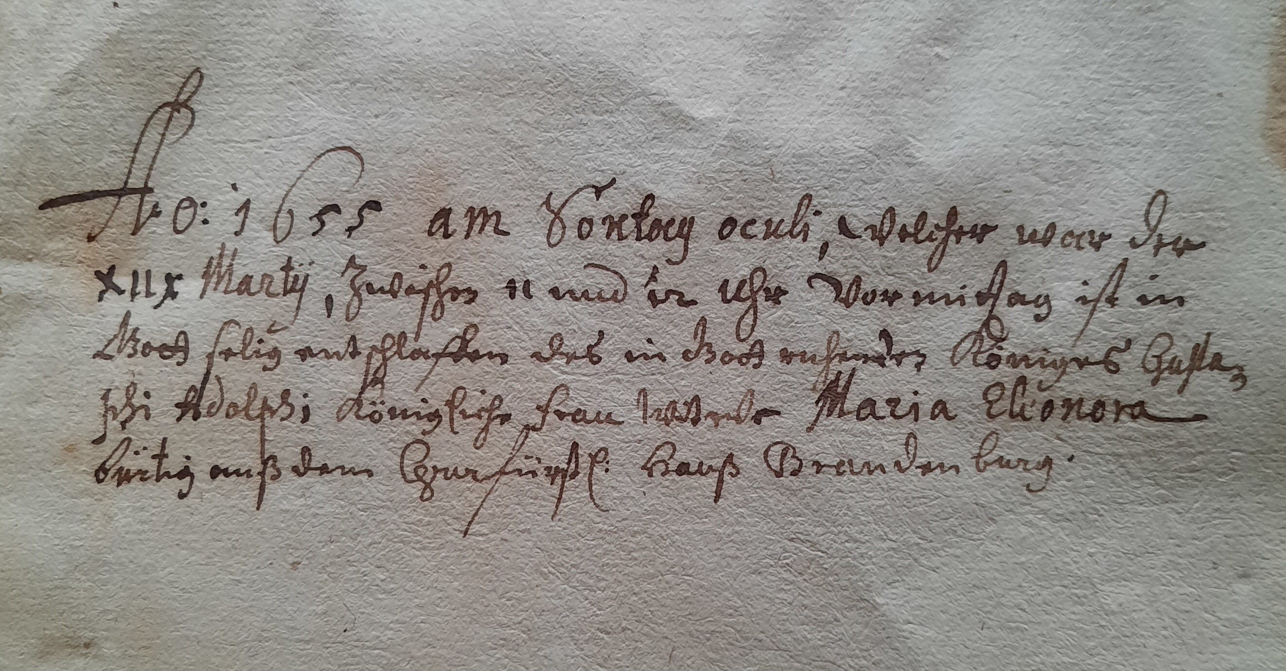 Signatur/Påskrift Insida: "Ao: 1655 am Sontag oculi, welcher war der XIIX Martij, zwischen 11 und 12 Uhr Vormittag ist in Gott selig entschlaffen des in Gott Ruhenden Königes Gustaphi Adolphi königliche Frau Wittwe Maria Eleonora, bürtig auss dem Churfürstl: Haus Brandenburg." ("Anno 1655 på söndag oculi [tredje söndagen i fastan], vilken var den 18:e mars, mellan kl. 11 och 12 på förmiddagen är Maria Eleonora, bördig från det kurfurstliga huset Brandenburg, den hos Gud vilande konung Gustav Adolfs änka, hos Gud saligen insomnad.")