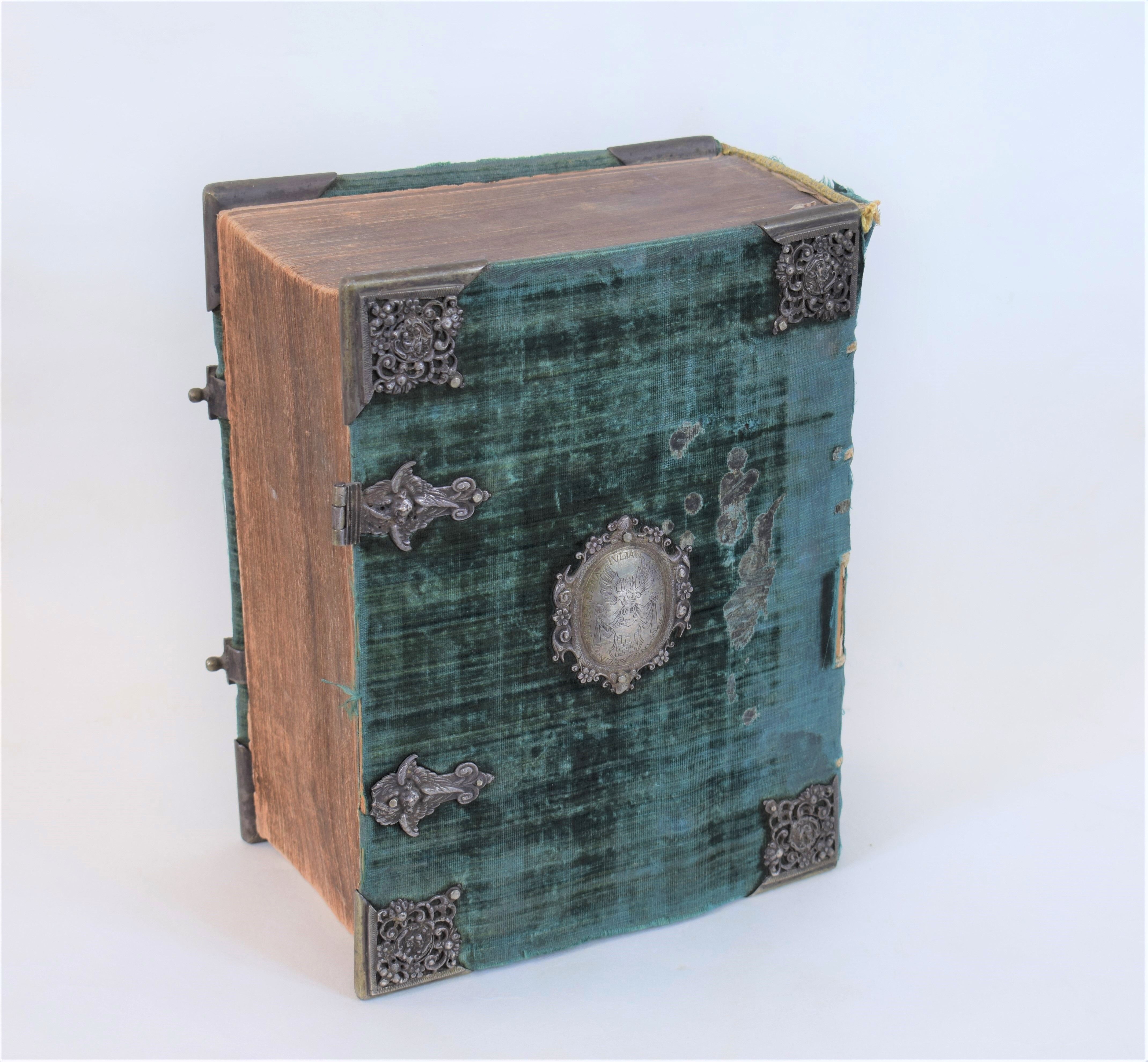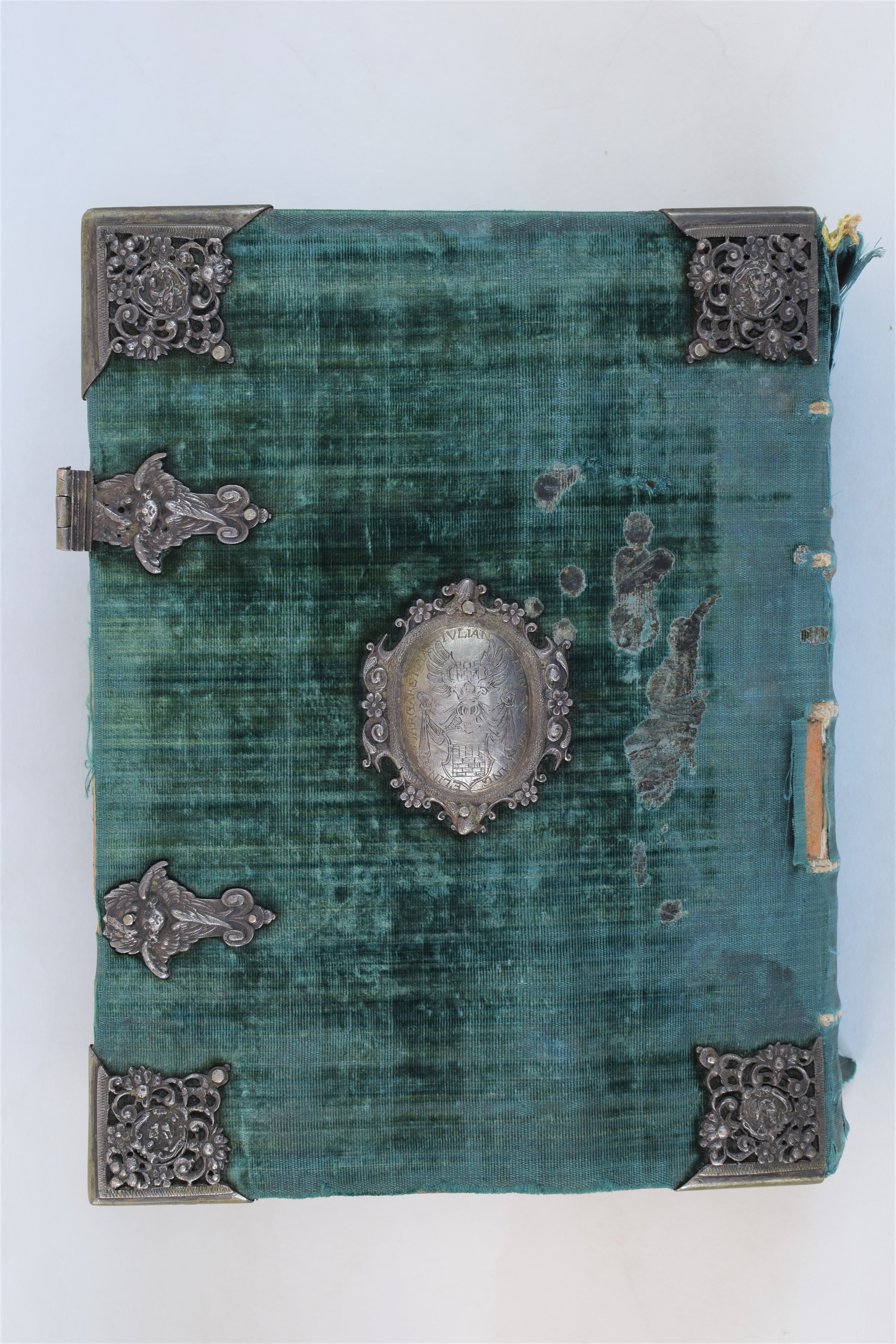 Band av grön sammet med hörnbeslag, mittplattor och spännen. Mittplattan på pärmen är dekorerad med Wrangelvapnet och Brahevapnet sammanflätat samt texten: "Margareta Juliana geborne Wrangelin". På andra främre försättsbladet anteckning (1600-talshand) om drottning Maria Eleonoras död 1655: "Ao: 1655 am Sontag oculi, welcher war der XIIX Martij, zwischen 11 und 12 Uhr Vormittag ist in Gott selig entschlaffen des in Gott Ruhenden Königes Gustaphi Adolphi königliche Frau Wittwe Maria Eleonora, bürtig auss dem Churfürstl: Haus Brandenburg".