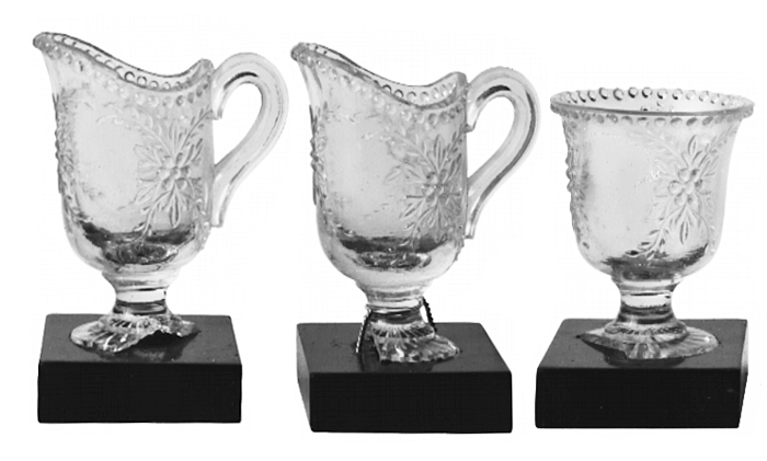 GARNITYR (miniatyr-) av två gräddkannor och en sockerskål. I pressteknik. Dekor: I relief. Gräddkannor: Cylindrisk med rundad nederdel samt på låg fot med skivformigt utstående fotplatta. Grepe med sexkantigt tvärsnitt samt av något uppsvängd bågform. Brädden på den grepen motsatta sidan rundad och förhöjd samt något utsvängd till en nås, brädden vid grepens övre fäste likaledes något förhöjd. På utsidan i relief tre X-formigt korsställda bladrankor med en enkelbladig blomma i mitten omgiven av sex långsträckta treflikiga blad. Runt bräddens utsida en pärlband. På fotplattans utsida en inpressad mångbladig rosett med spetsiga blad. Höjd: 5,9 cm, diameter: 3 cm. Fot, diametr: 2,7 cm.
