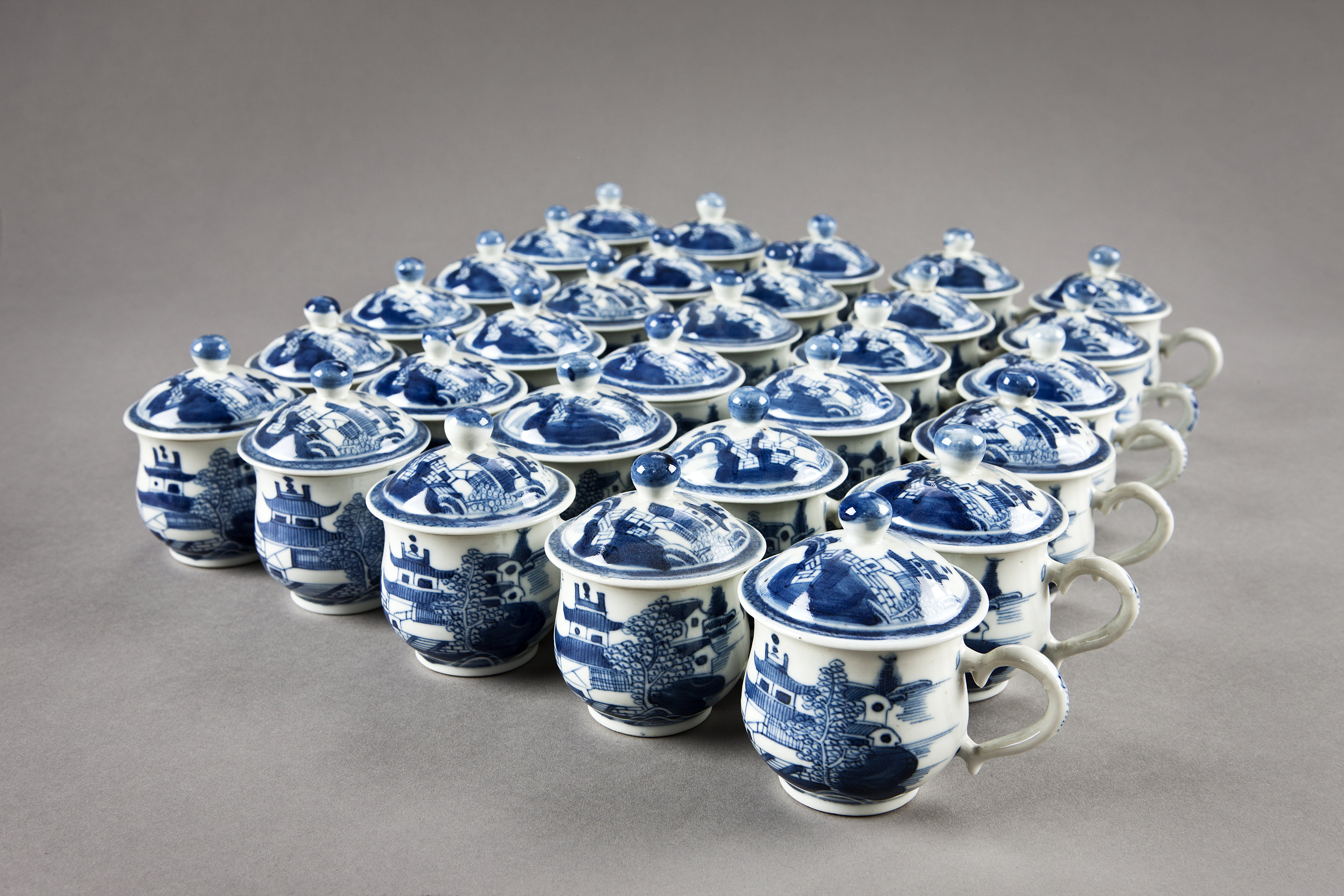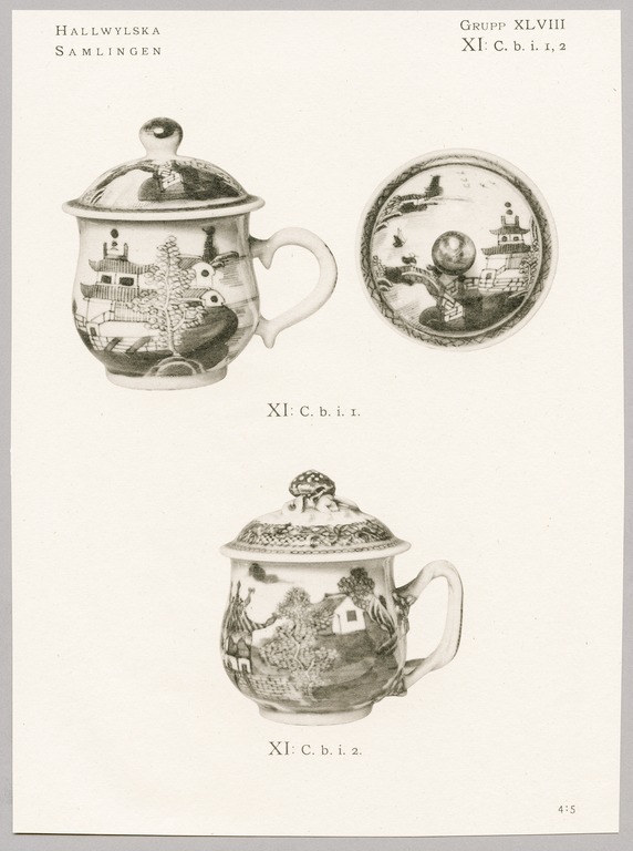 KRÄMKOPP MED LOCK, 30 st. Bukiga med henkel, kupigt lock med rund knopp. Dekor i blått med på utsidan ett flodlandskap med byggnader och människor. Locket med liknande dekor med en bård av rutmönster. Stora uppsättningar av koppar med lock förblir sällan intakta. I det här fallet köptes trettio identiska koppar på Bukowskis 1893 och ytterligare fjorton 1899. Små rundade pytsar av det här slaget fyllde olika funktioner. I England användes de till att servera individuella portioner med vaniljkräm eller grädde till desserten, medan de vid Mariebergsfabriken i Sverige kallades »gelékoppar«. I Frankrike kallades de »pot à jus« och användes till att servera varma juicer eller soppor, såsom buljong eller consommé. Pytsar med handtag var särskilt lämpliga för det senare. Sådana här koppar med lock tillverkades vid fabriker över hela Europa och de kinesiska exportexemplaren var kopior av dessa. Inköpta av Wilhelmina von Hallwyl den 23 februari 1897 hos konsthandlare H Bukowski för 140 kr. Qing dynasty: set of 14 cups c.1760-70: set of 30 cups c.1790-1800 Such large sets of cups with lids do not often survive. In this case, thirty identical cups were bought at Bukowskis in 1893, and a further fourteen in 1899. Small, rounded pots of this type were assigned various functions. In England they contained individual portions of custard or cream during the dessert course, whereas at the Marieberg factory in Sweden they were know as “jelly cups”. In France they were called “pot à jus” and were used to serve hot juices or soups such as bouillon or consommé. Pots with handles would be especially suitable for the latter purpose. Such lidded cups were made at factories all over Europe, and Chinese export examples were copied from them.
