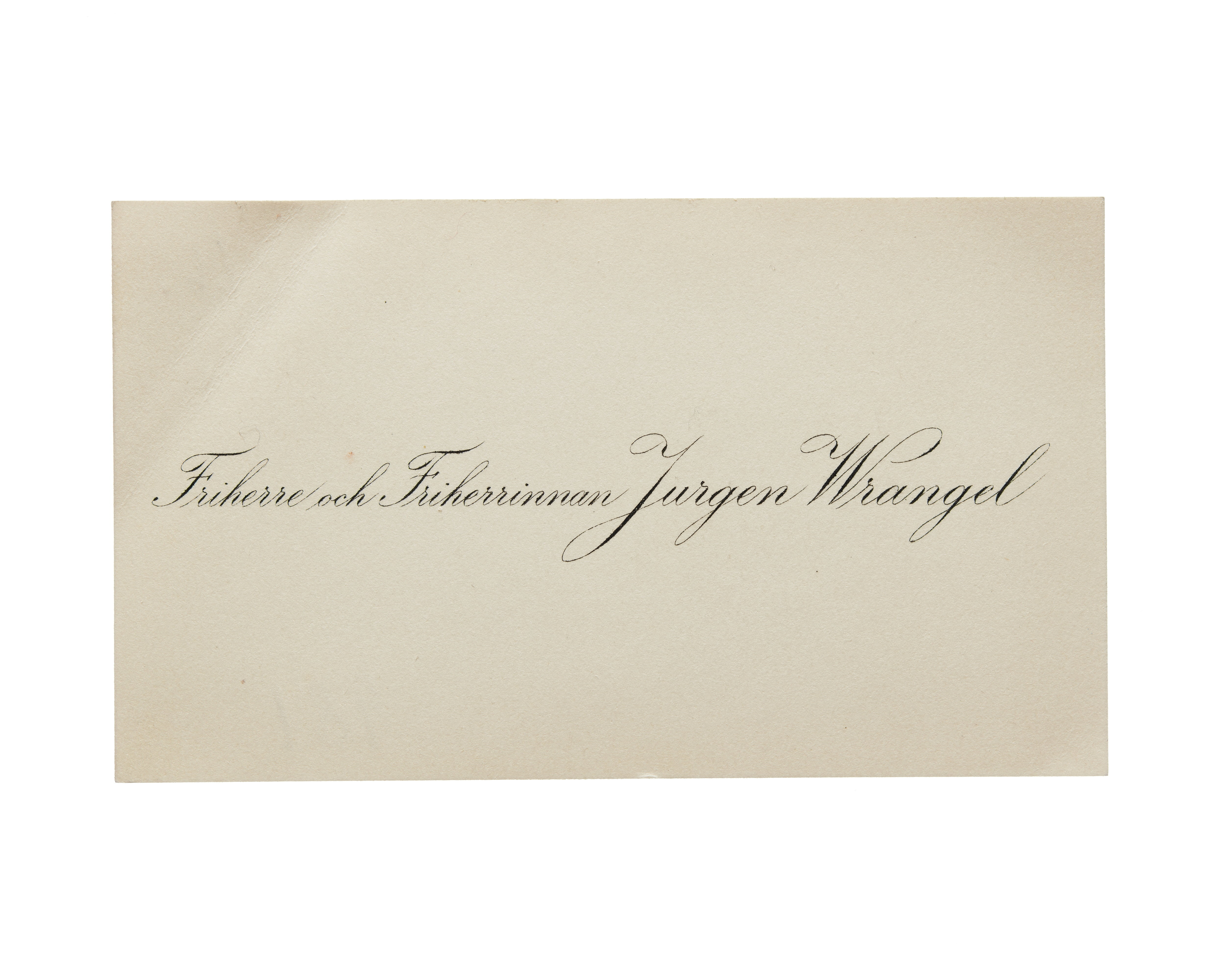 Ett visitkort från Friherre Jurgen Wrangel och Friherrinnan Wrangel, daterat 1916, vikt i övre vänstra hörnet.
