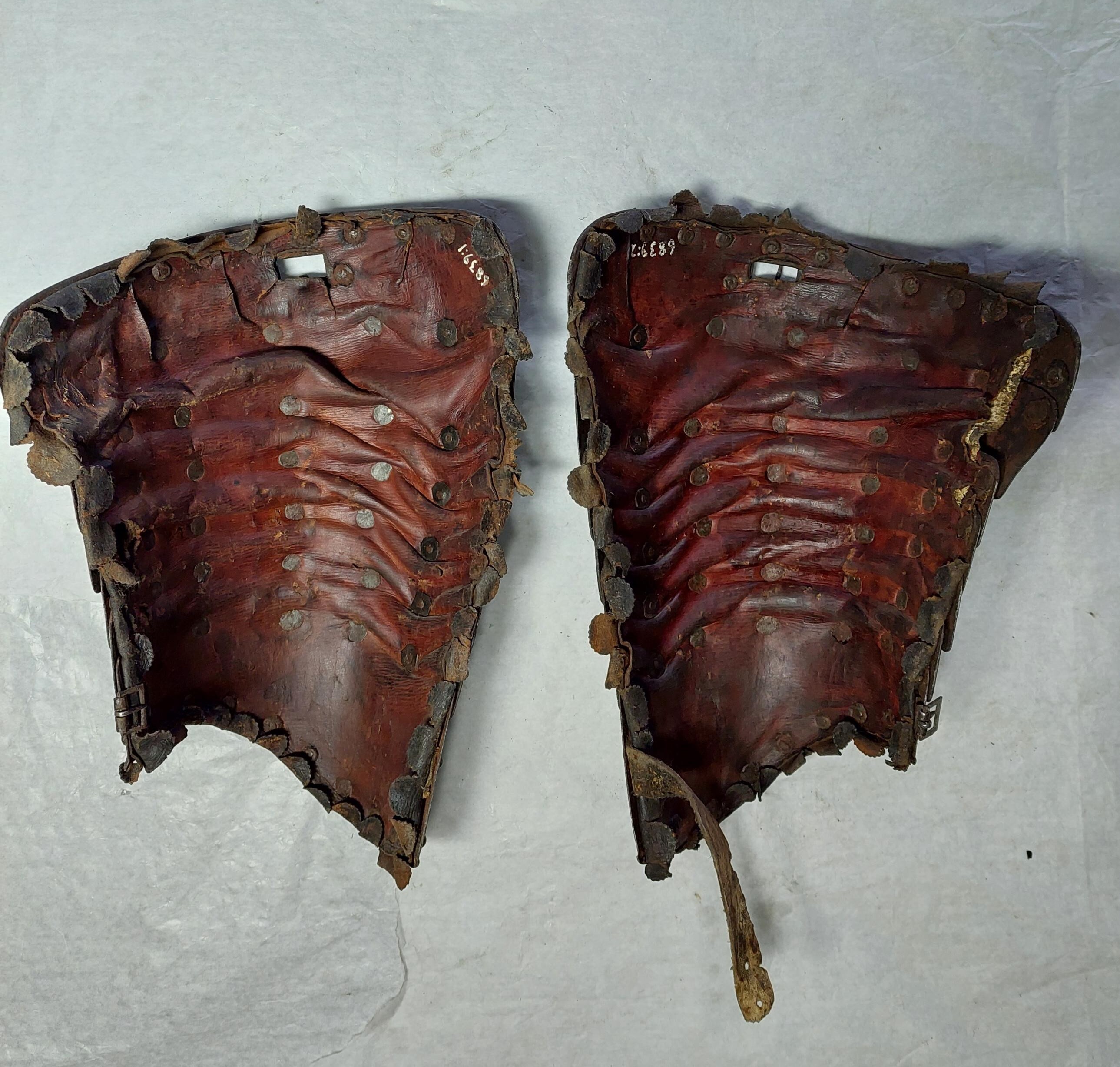 Av svartmålat stål med övermålade nitar. Bestående av sju lameller med graverade kantlinjer. Övre lamellen med spännhål för ringkragens remmar. Nertill spänne och läderrem - för fästande kring armens insida. Foder av brunt läder. Uddbård kring alla kanter. 6839:1 för höger arm. 6839:2 för vänster arm.
