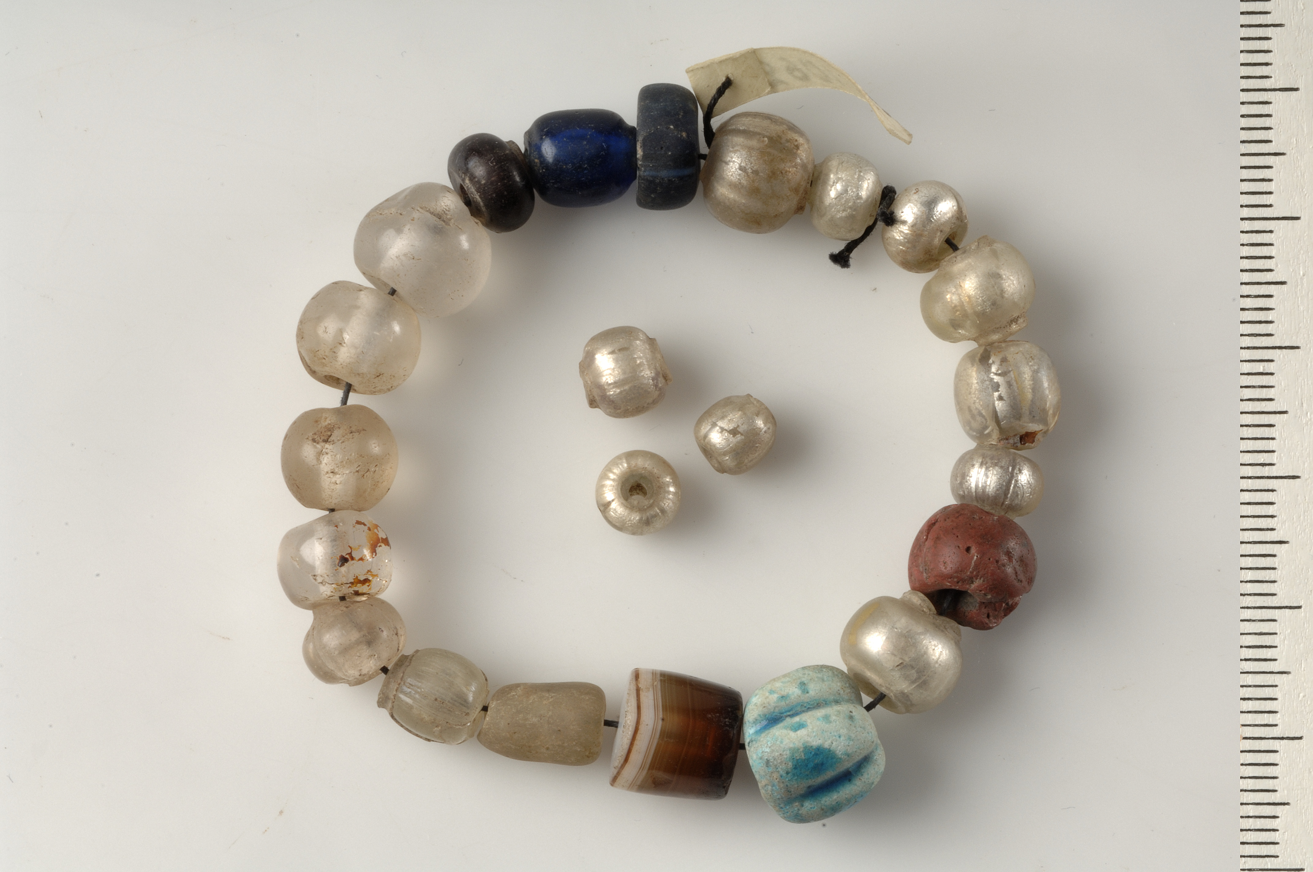23 pärlor - 1 av agat, 5 av bergkristall. Övriga av glas varav 11 silverfolierade.