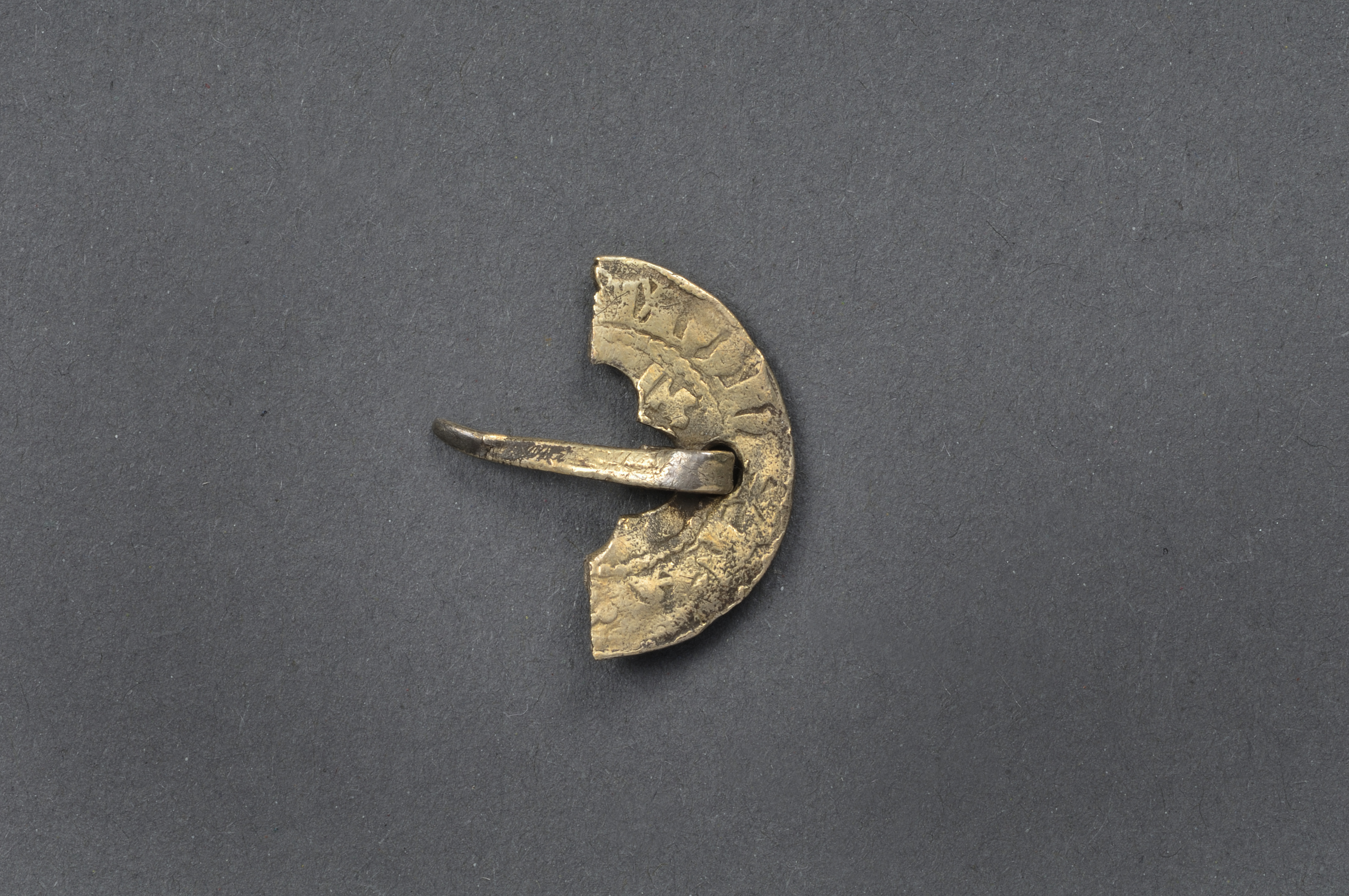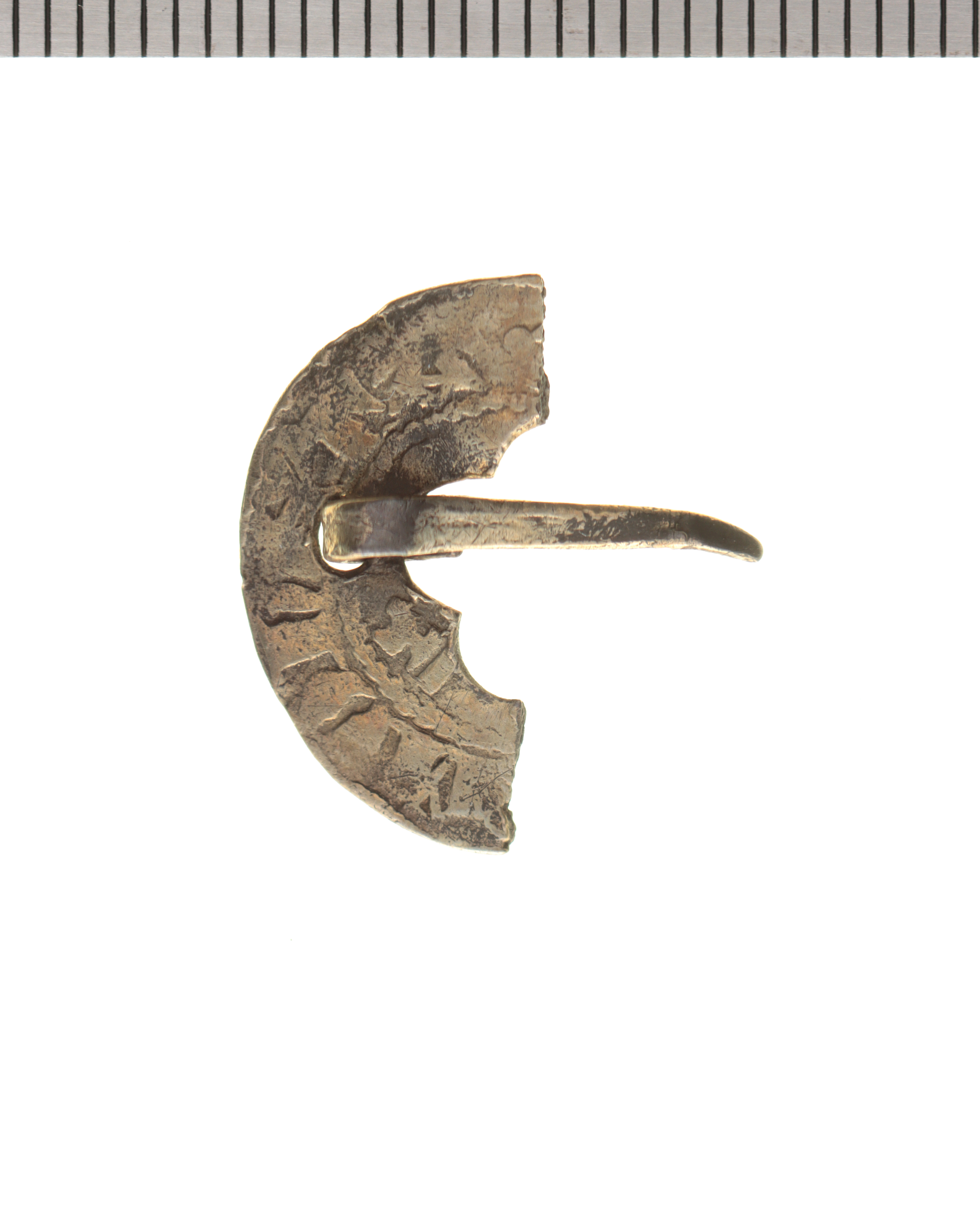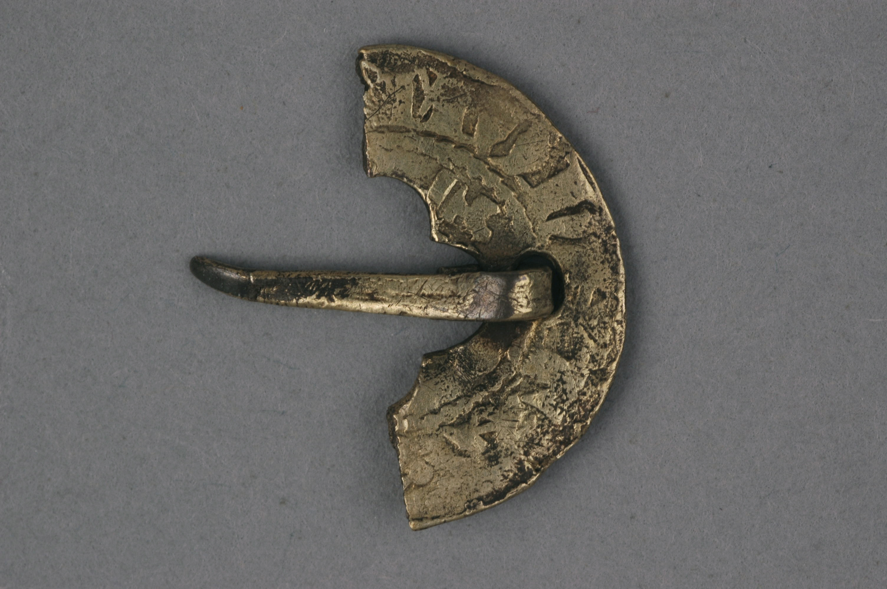 Ringspänne gjort av ett Dorpat-mynt (artig) från 1300-talets mitt, slitet och nu ej närmare bestämbart; myntets centrum fyrpassformigt utsågat; fragmentariskt; fri men fastsittande torne