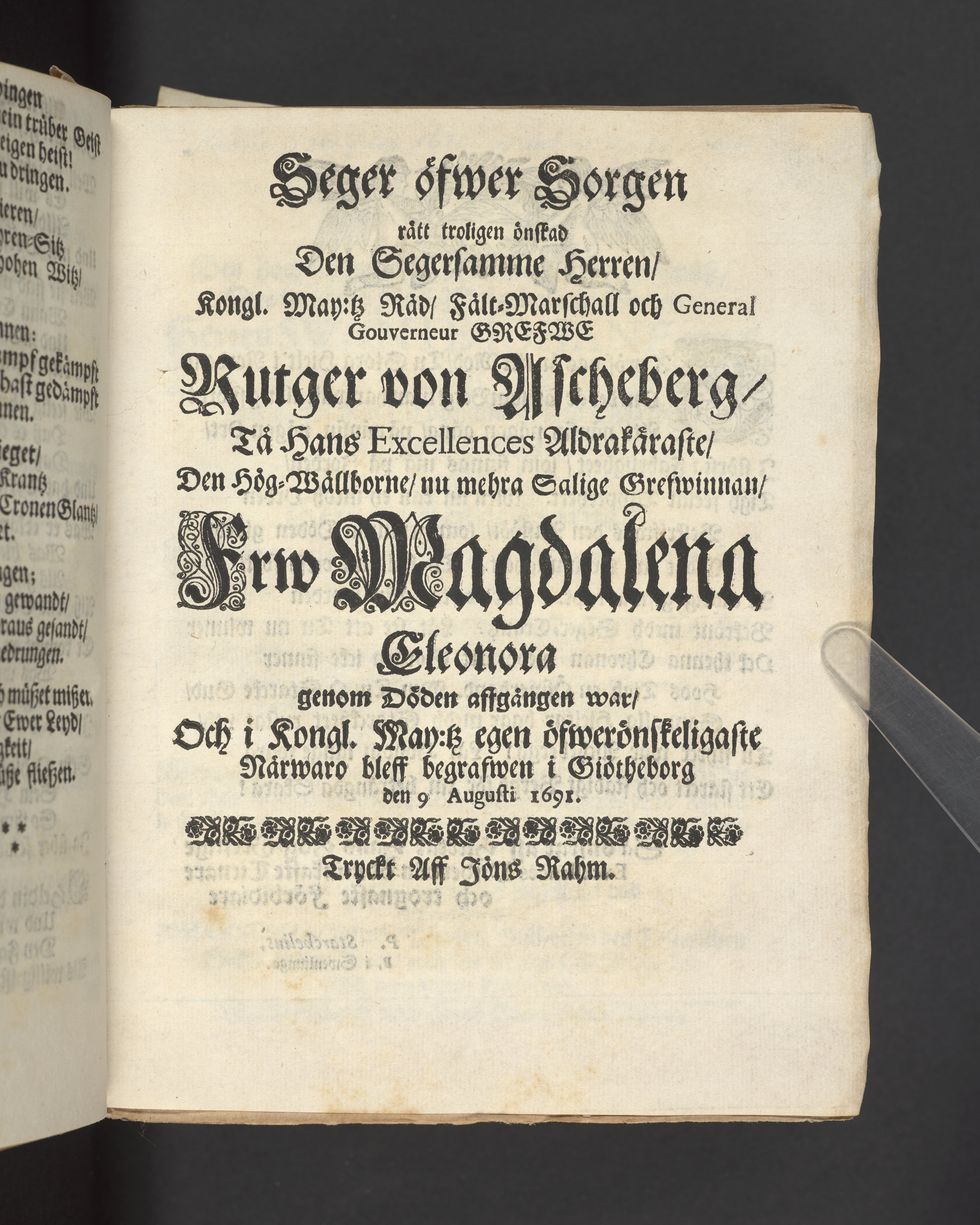 Seger öfwer sorgen rätt troligen önskad den segersamme herren ... grefwe Rutger von Ascheberg, tå hans excellences aldrakäraste, den hög-wällborne, nu mehra salige grefwinnan, frw Magdalena Eleonora genom döden affgången war, och i Kongl. May:tz egen öfwerönskeligaste närwaro bleff begrafwen i Giötheborg den 9 augusti 1691.