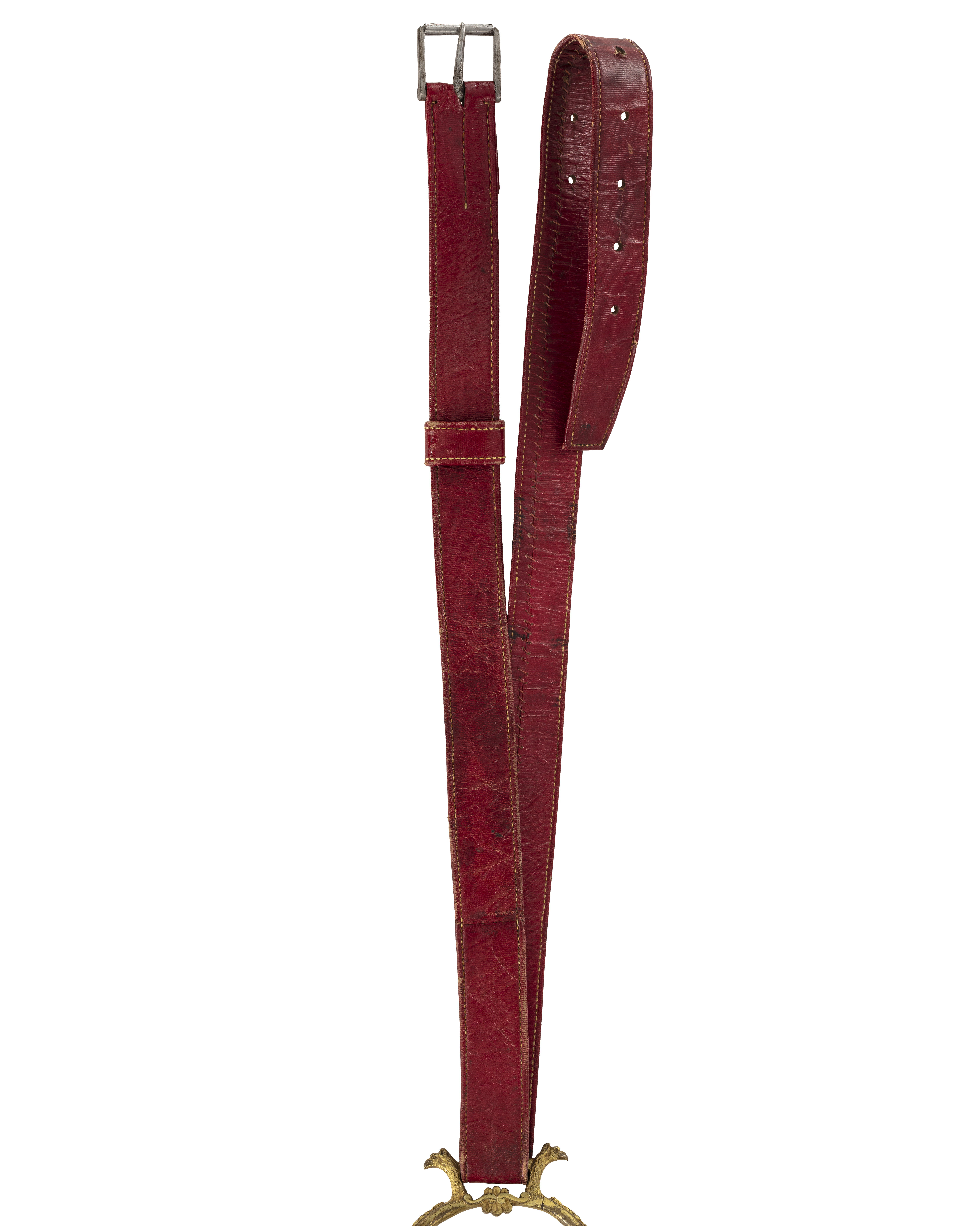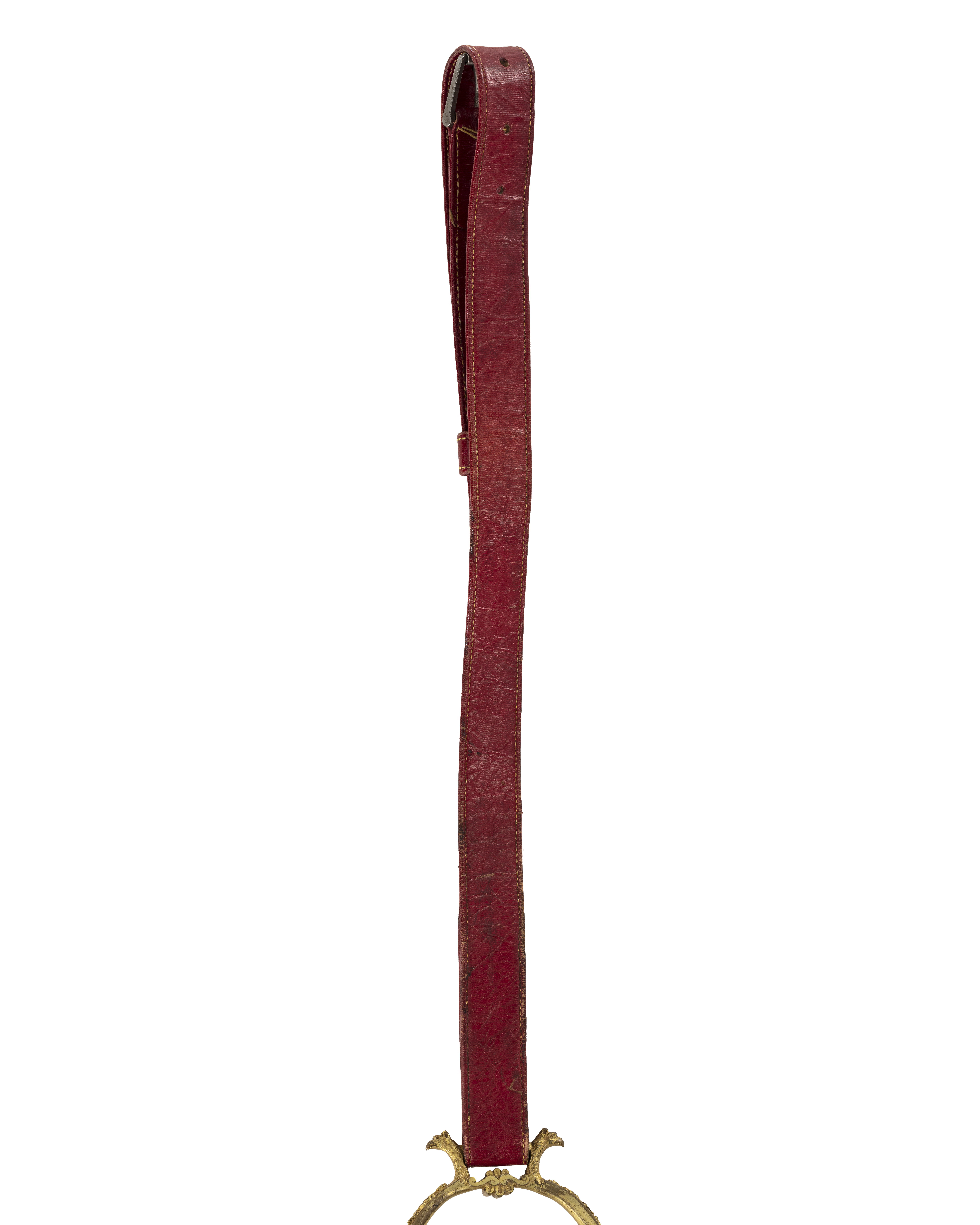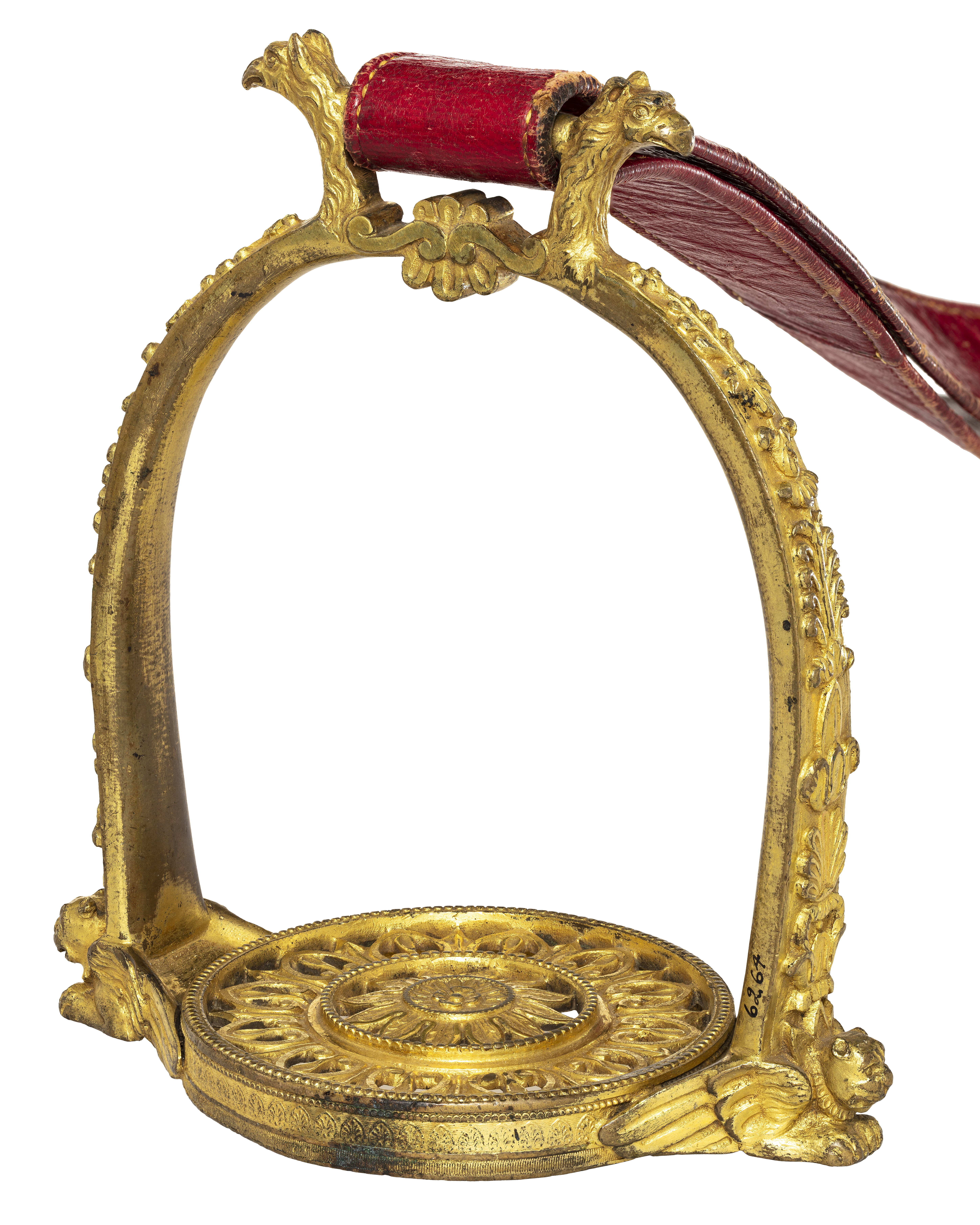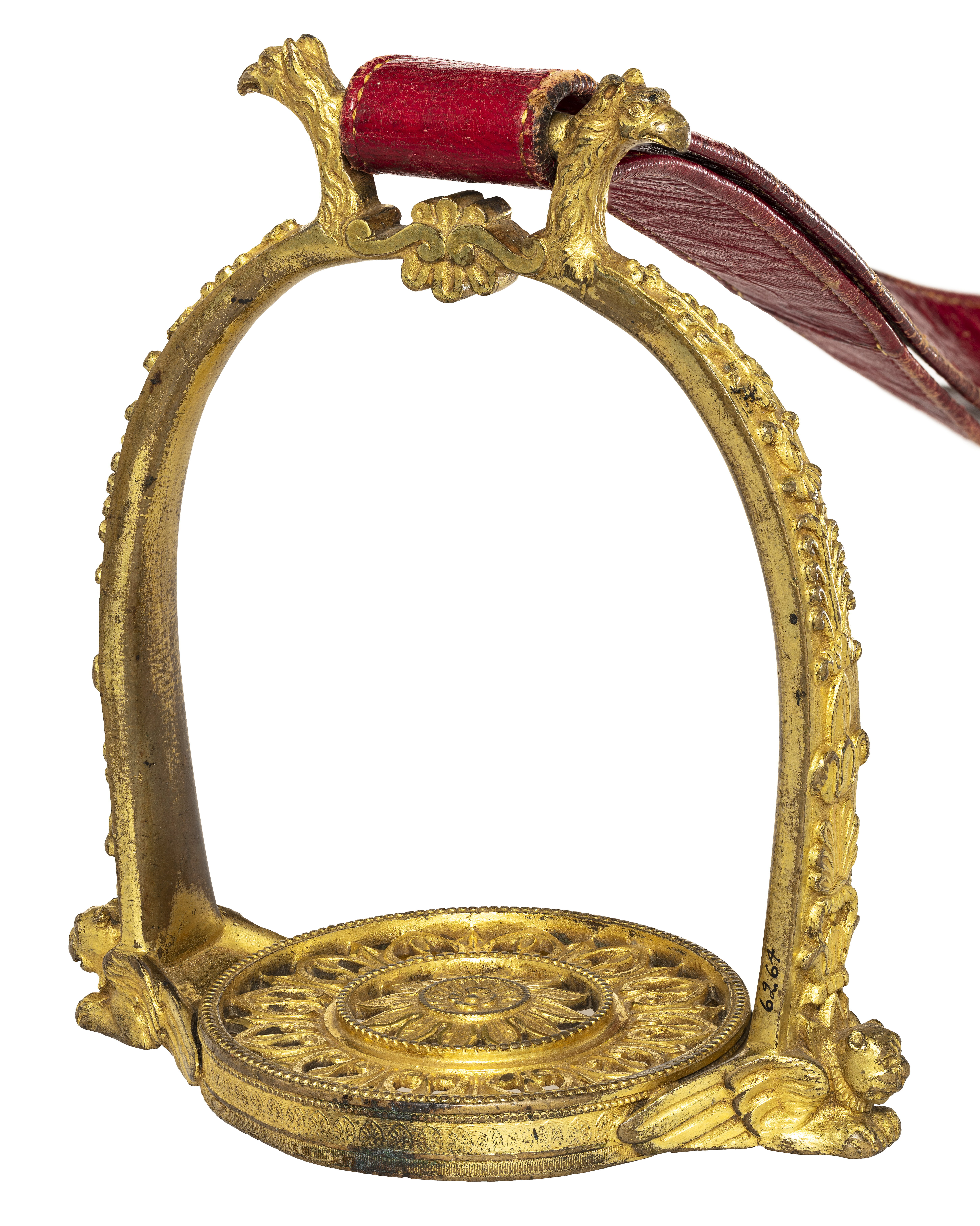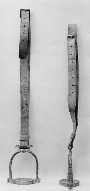 Stigbygel av förgylld, reliefornerad mässing. U-formade skänklar med slät insida, på utsidan blad-och palmettornament. Nedtill vid trampstödet utåtvänt lejonhuvud med vingar. Runt genombrutet trampstöd av två koncentriska cirklar, den inre med blomornament, den yttre med bladornament. Fast, rektangulär remögla med ett utåtvänt örnhuvud. Stigläder av rött läder med rektangulär sölja av stål med löphylsa.