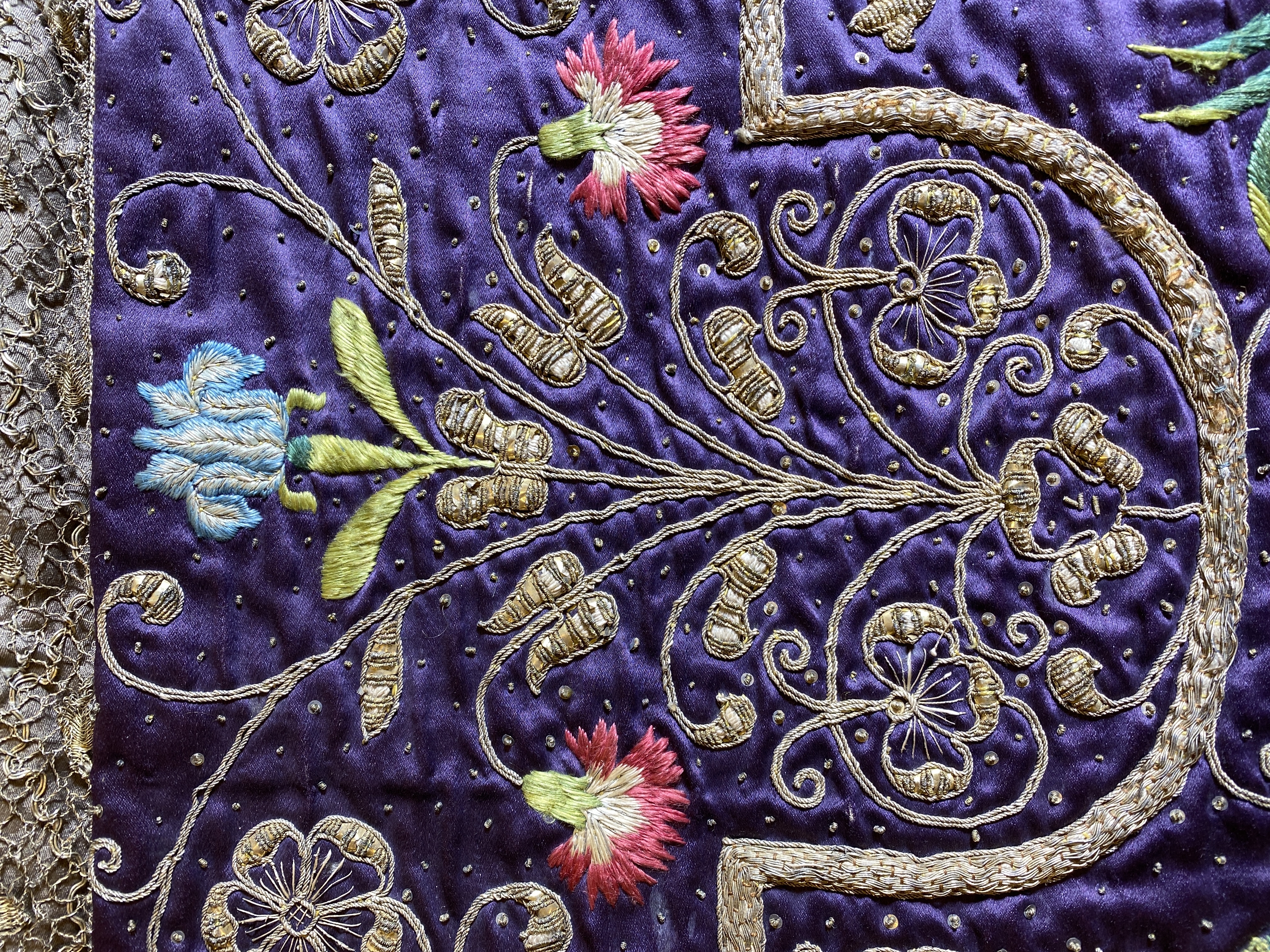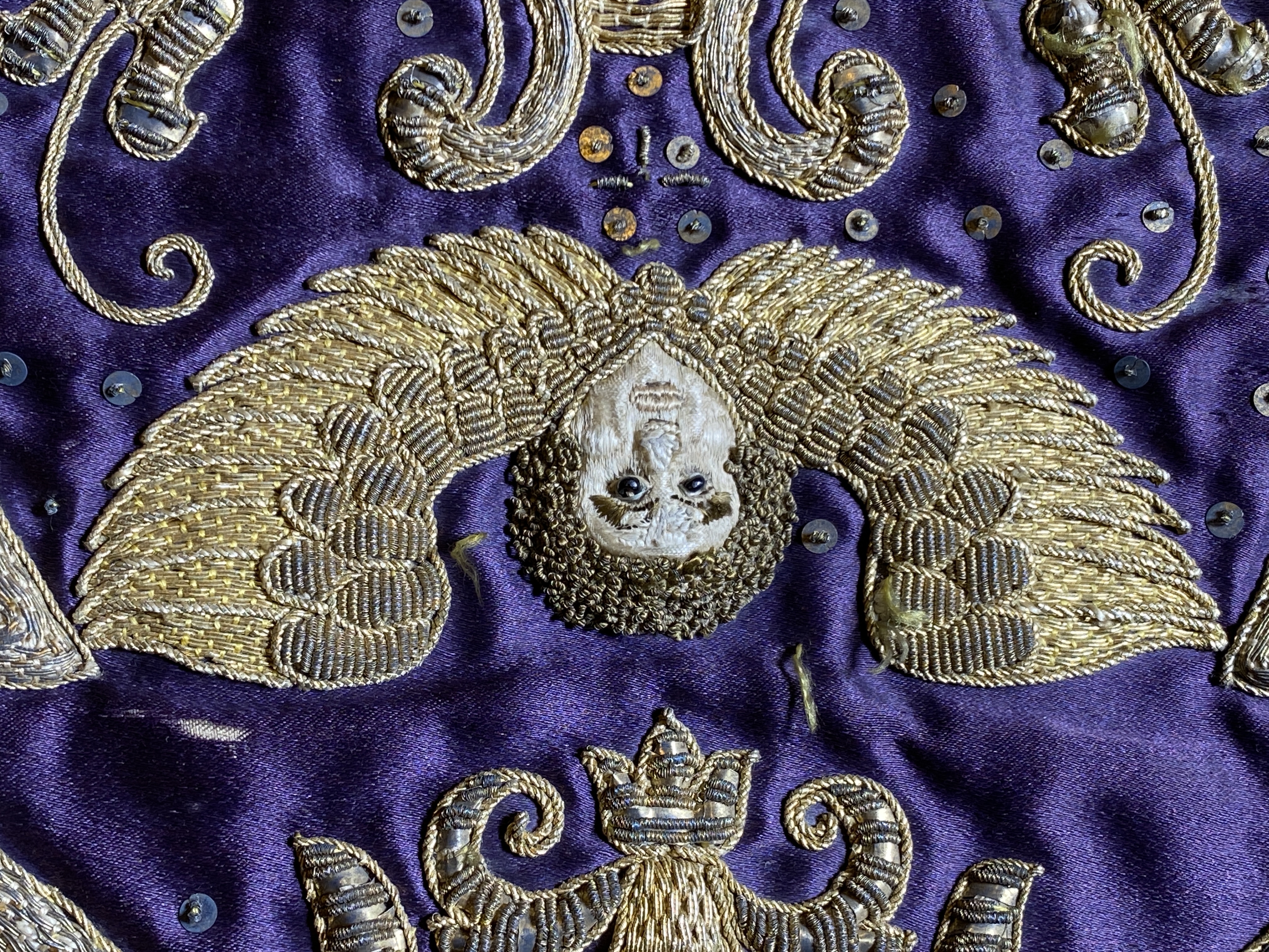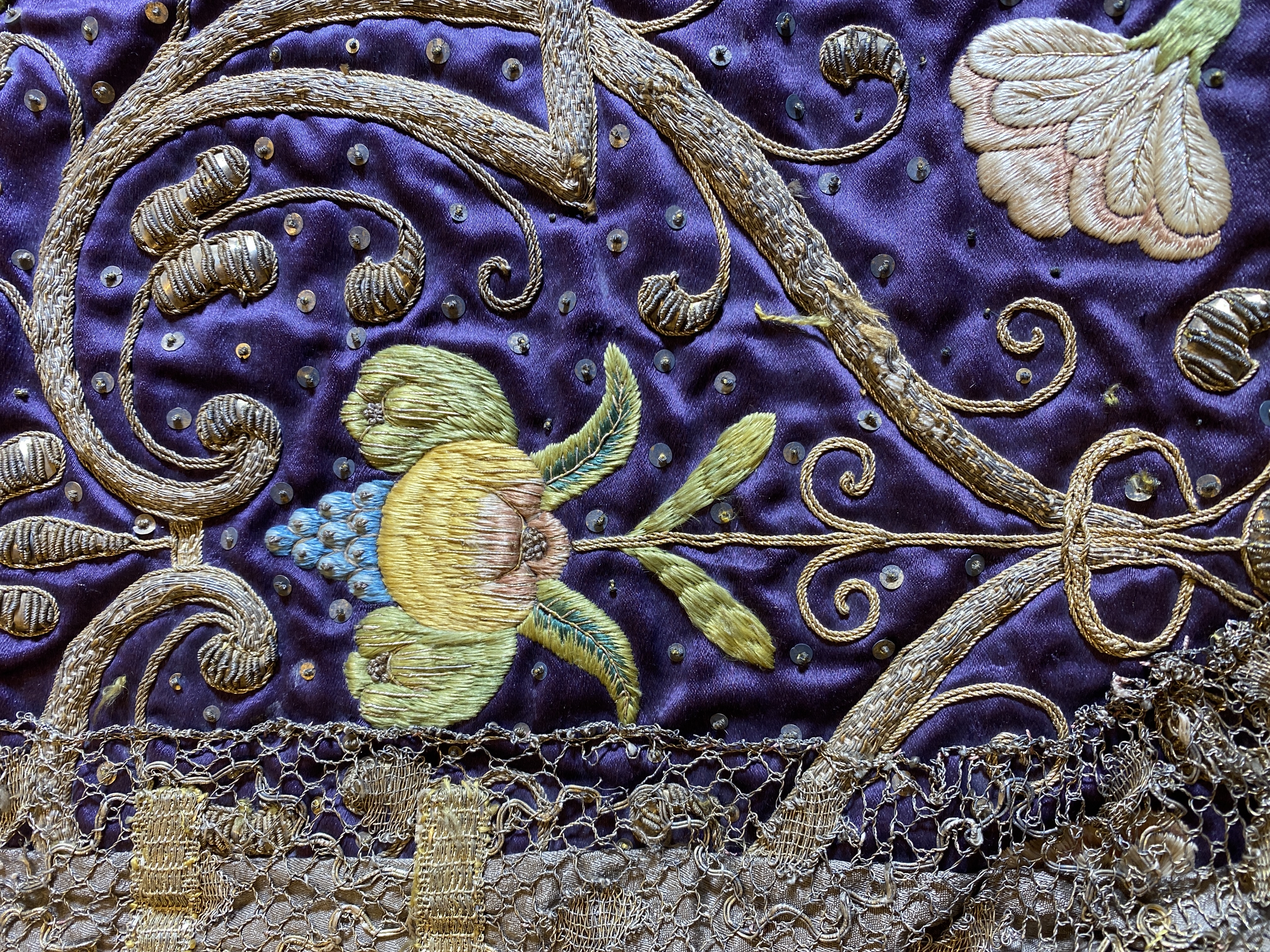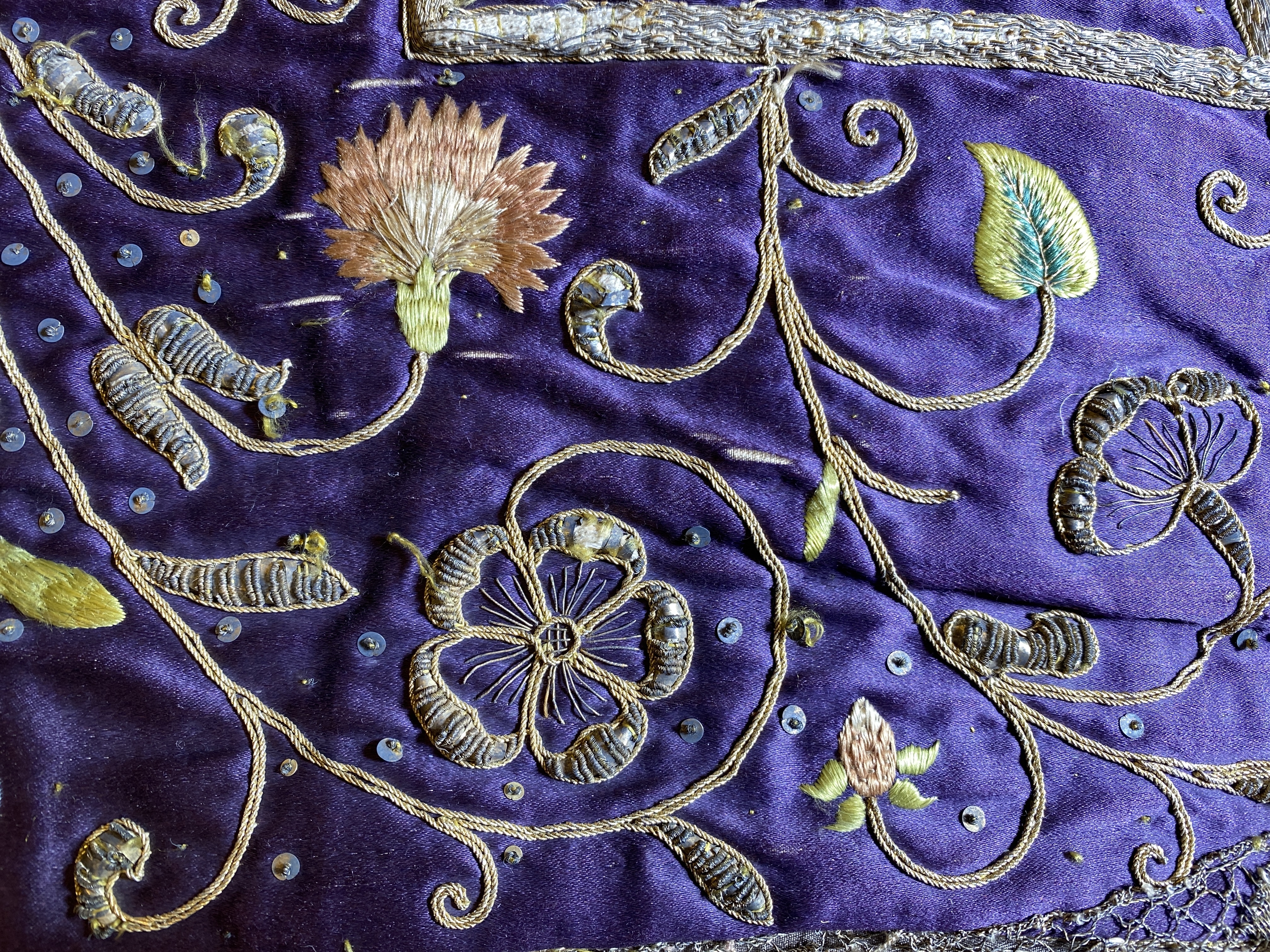 Violett atlas, guld- och silverbroderier, metallspetsar, violett lärftfoder. Gåva 1911.