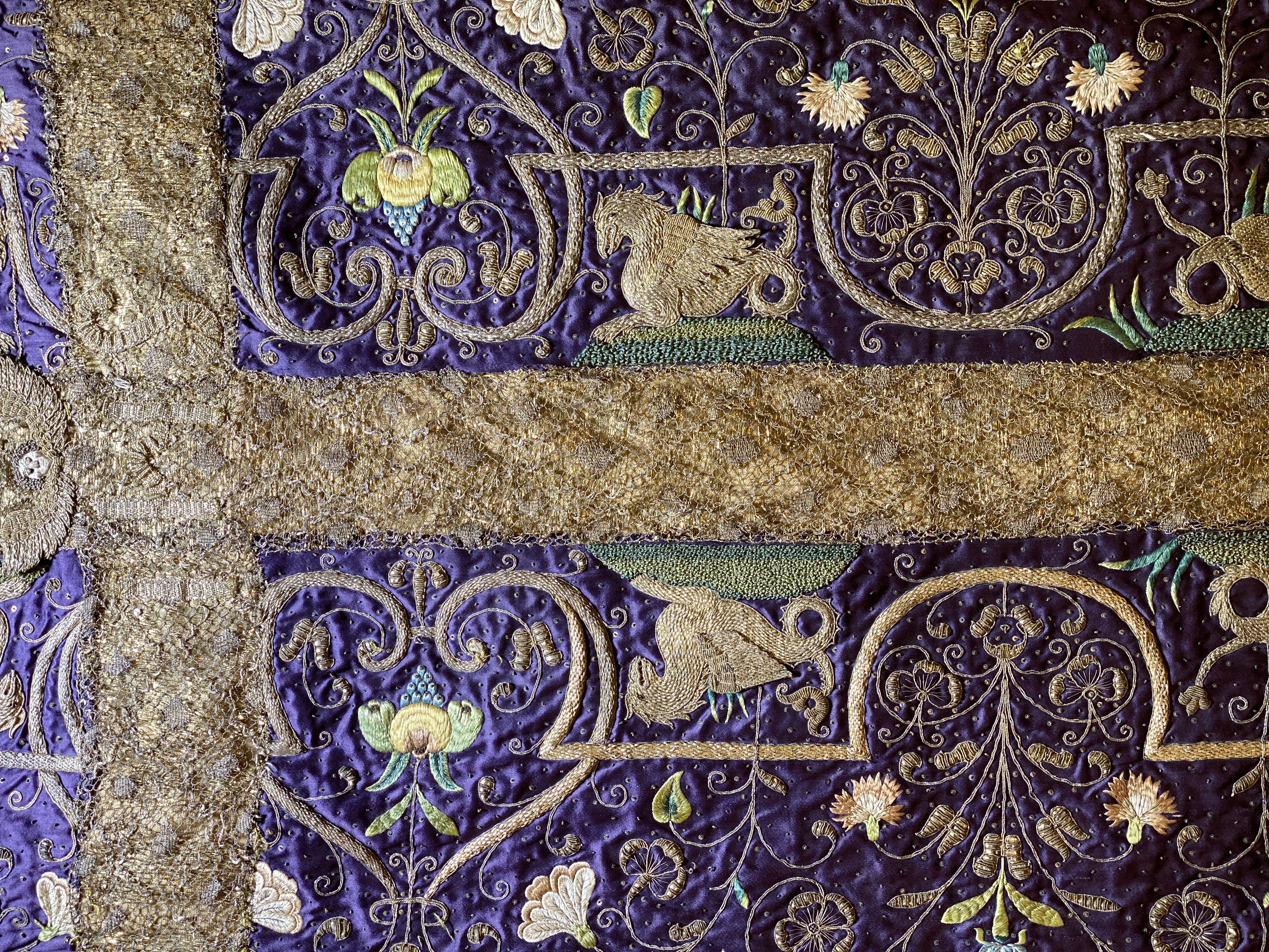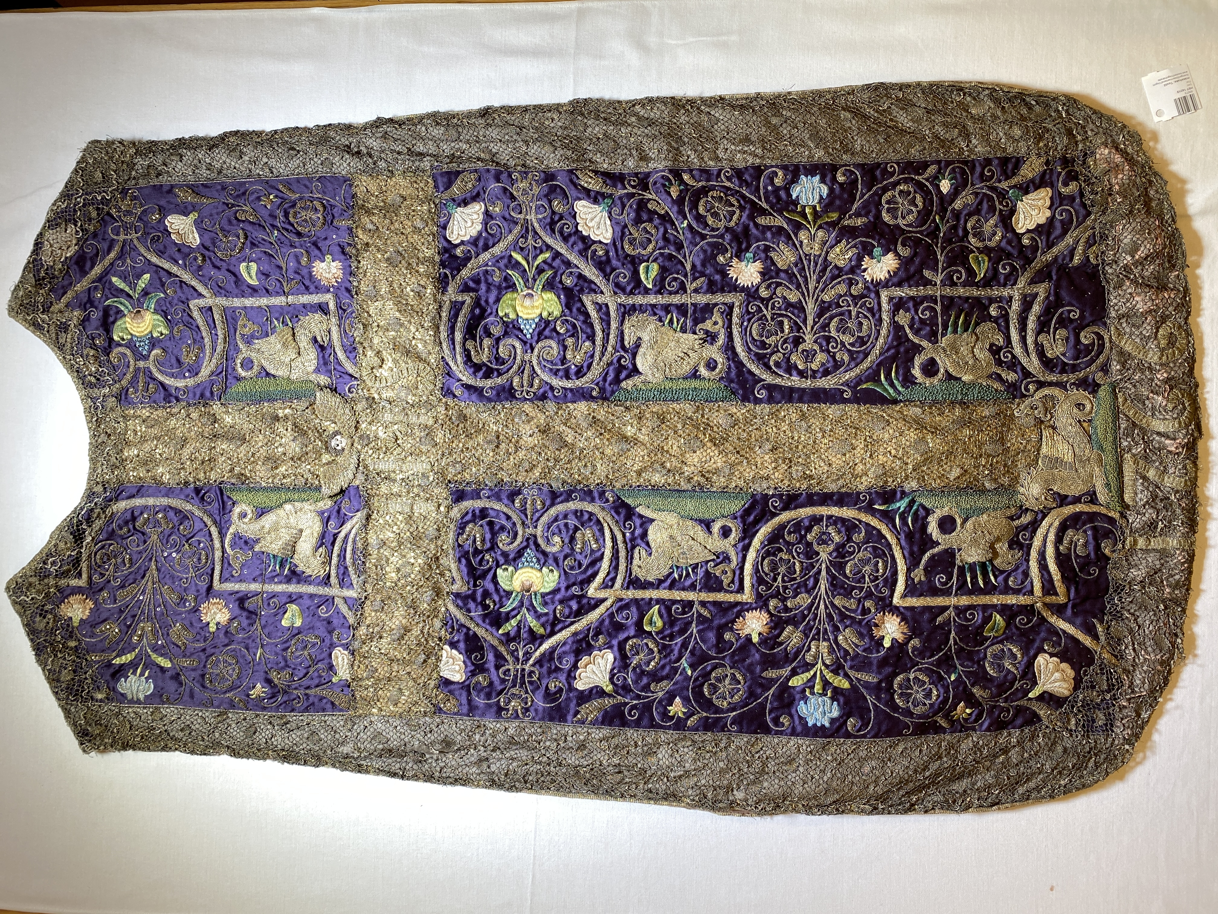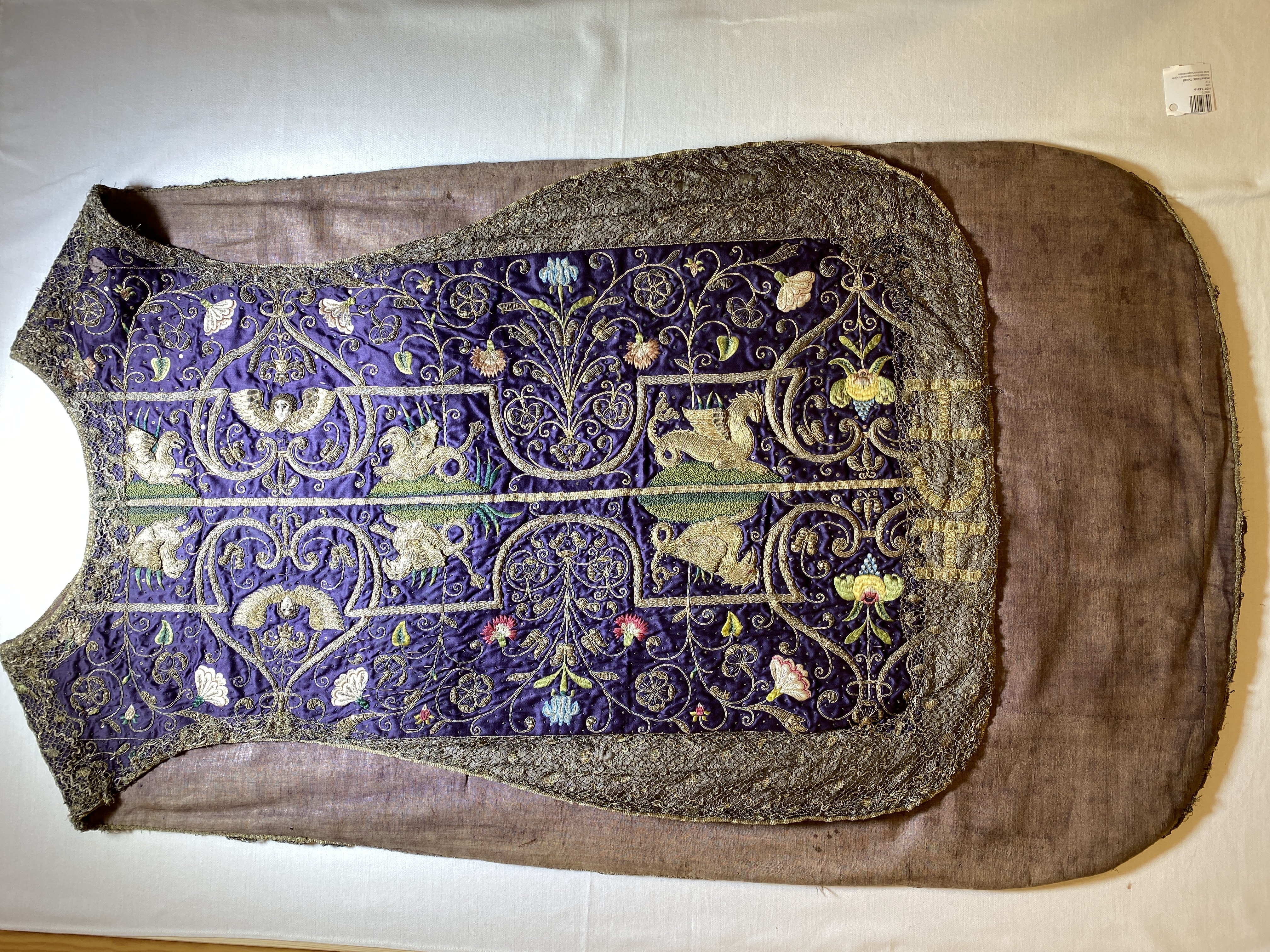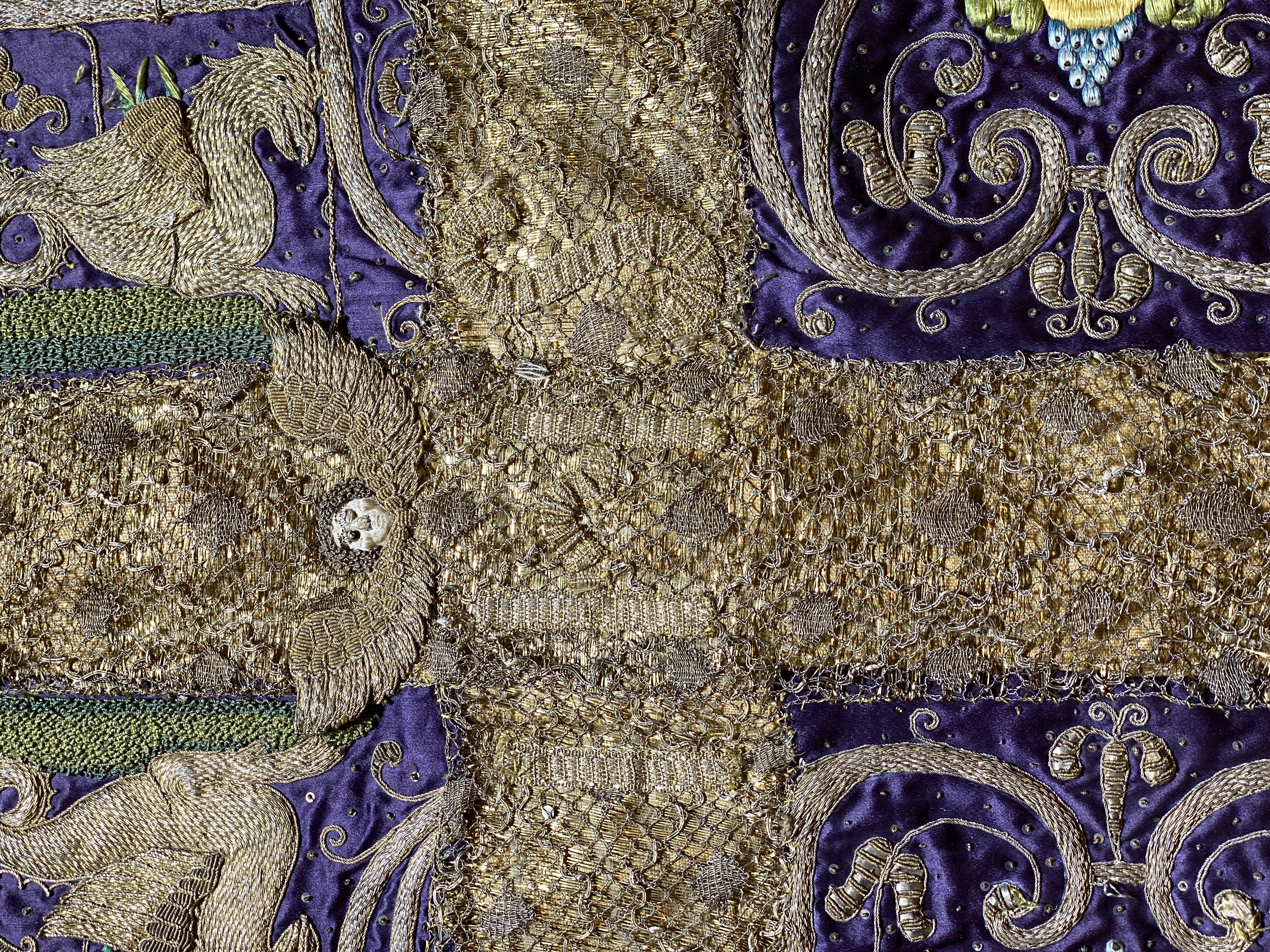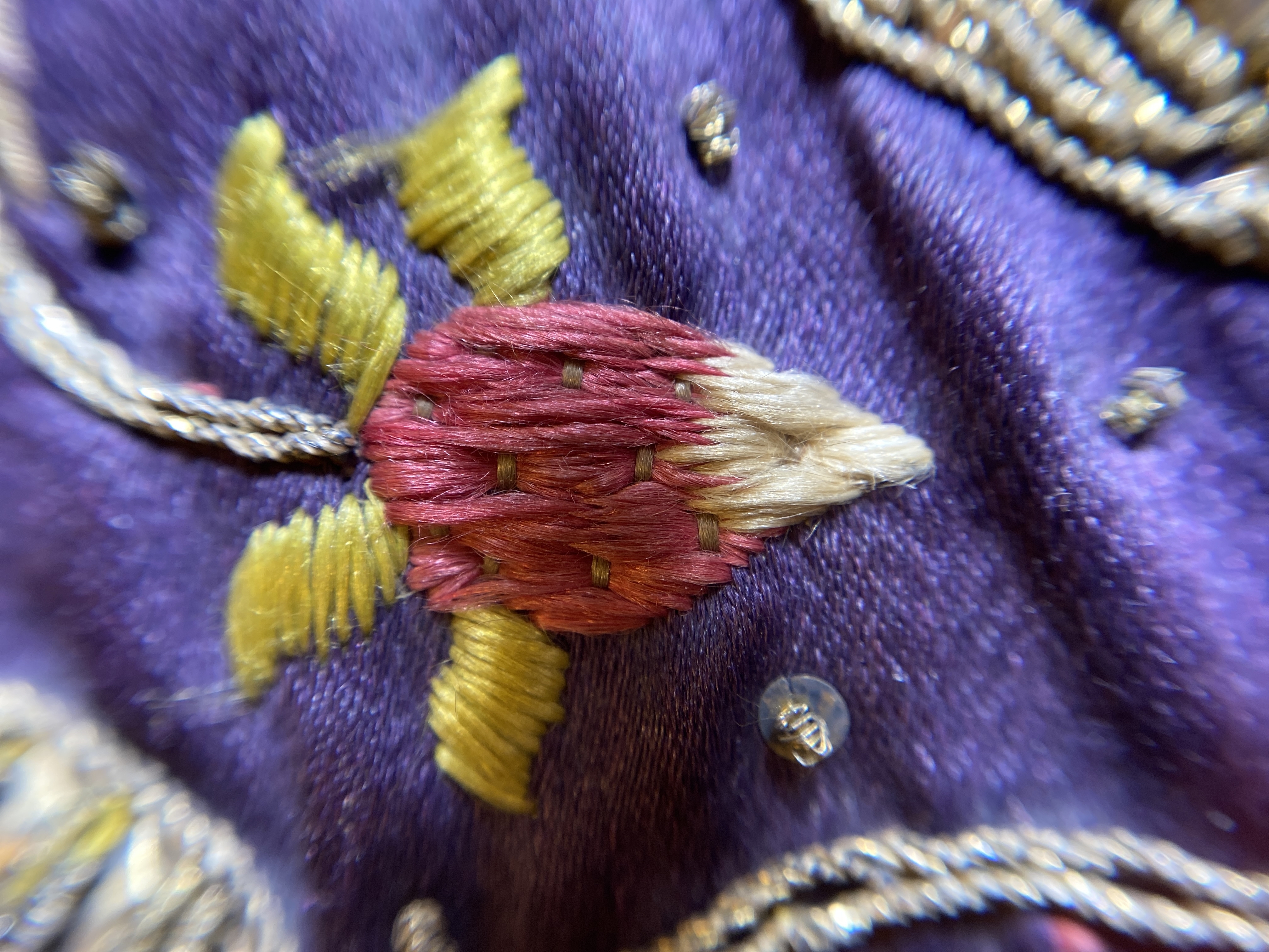 Violett atlas, guld- och silverbroderier, metallspetsar, violett lärftfoder. Gåva 1911.