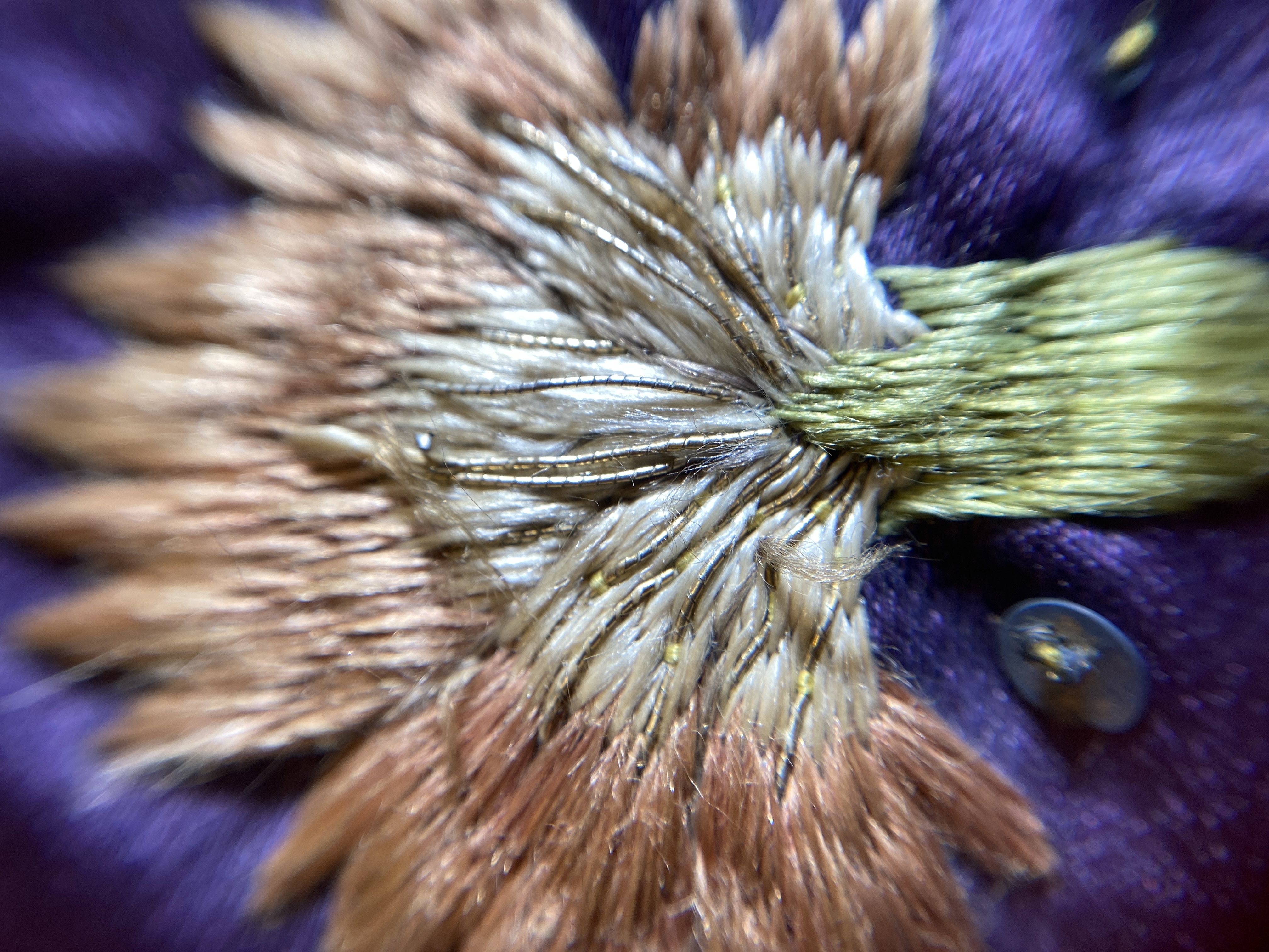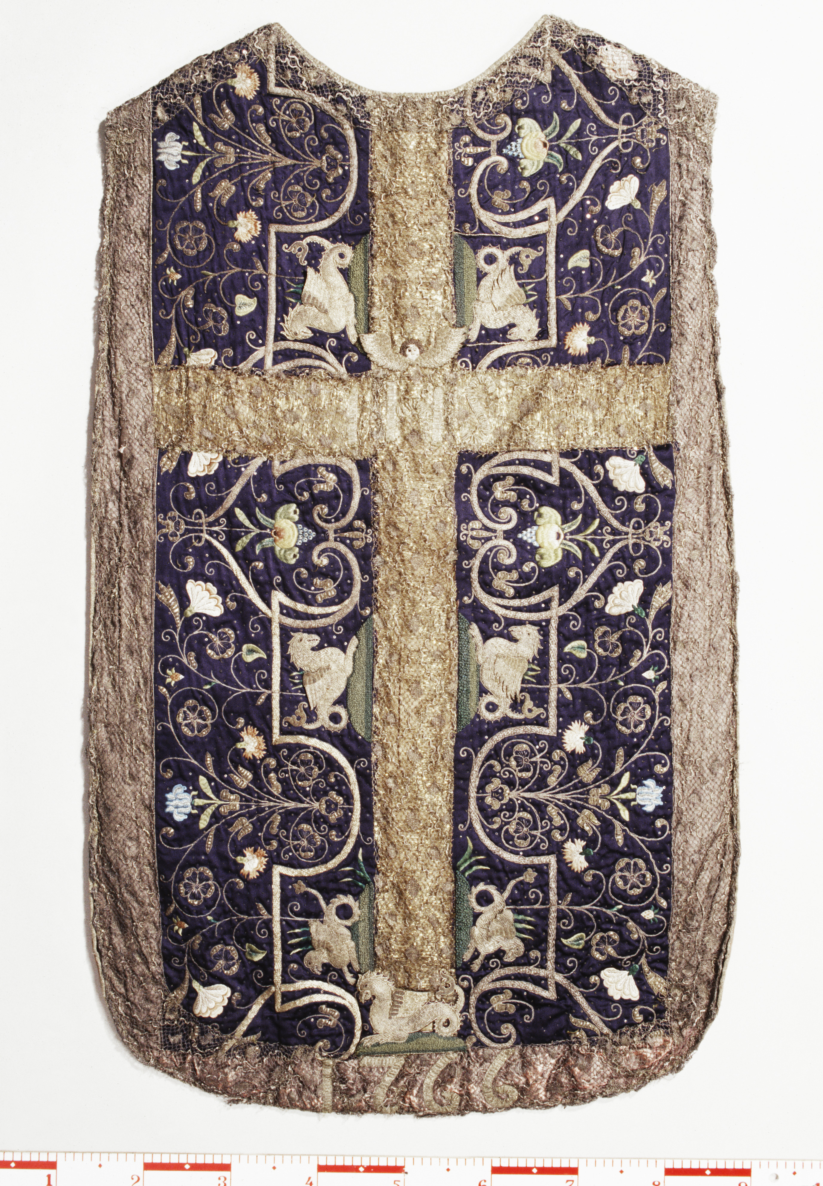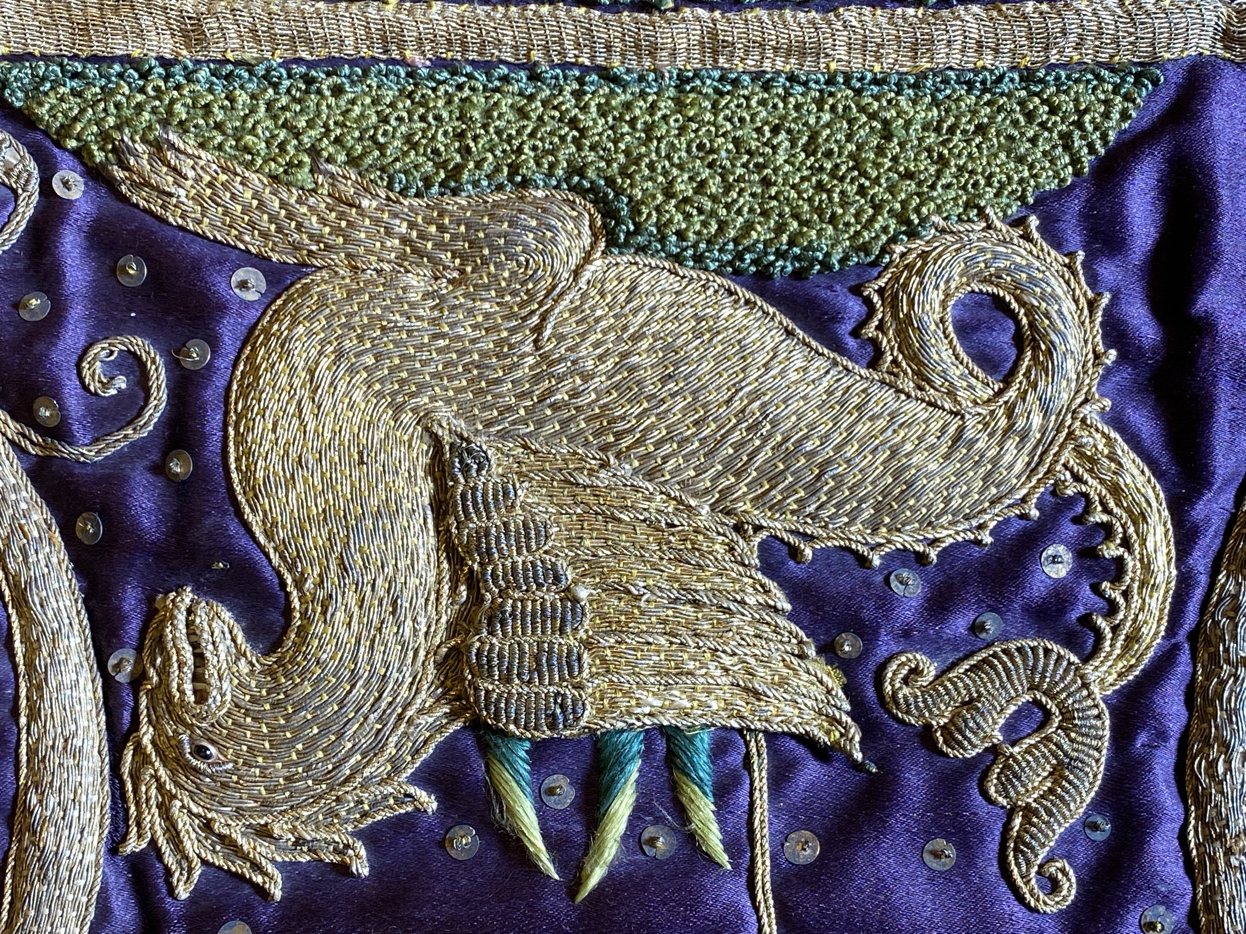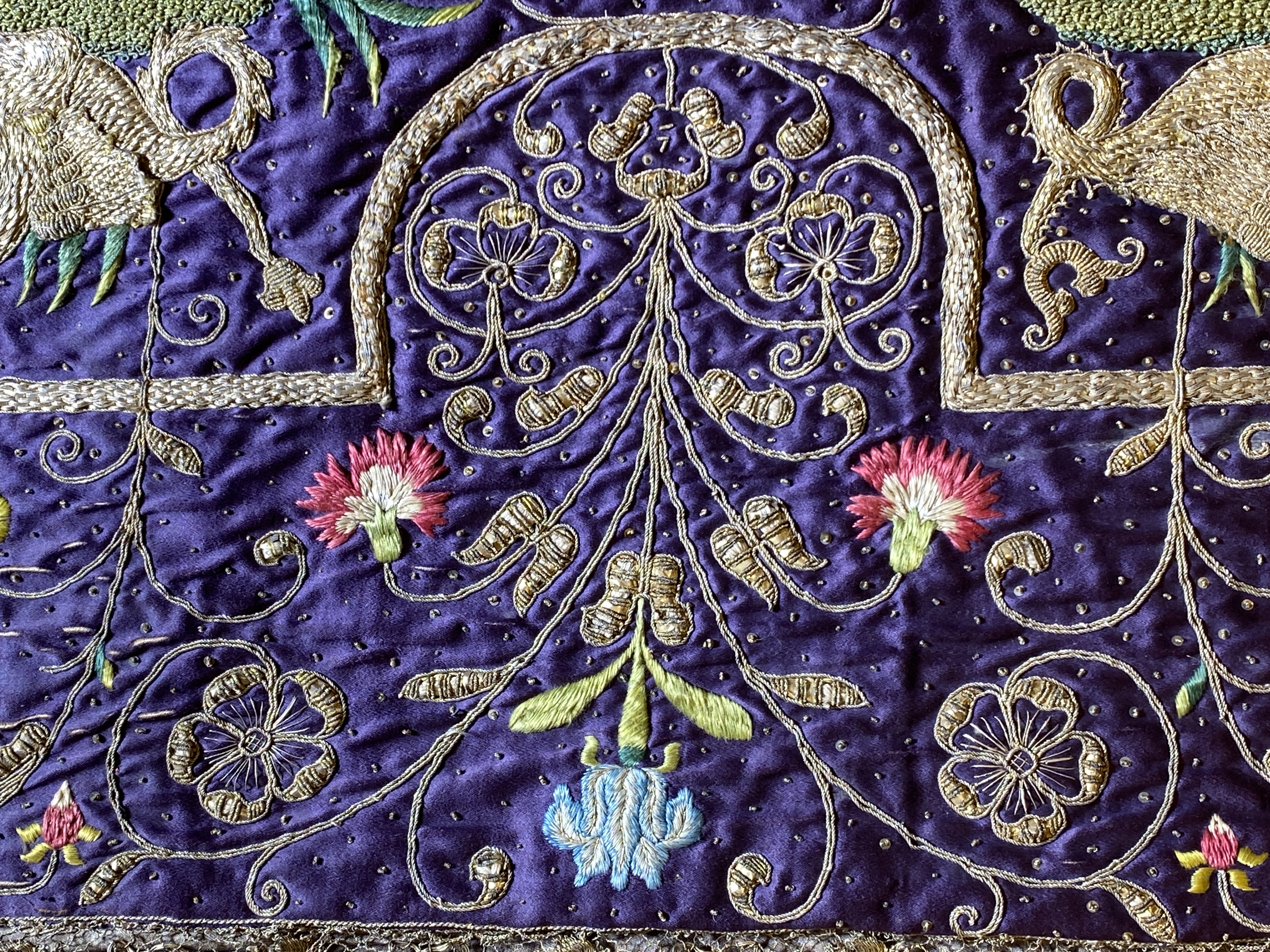 Violett atlas, guld- och silverbroderier, metallspetsar, violett lärftfoder. Gåva 1911.